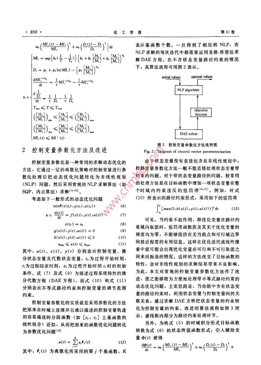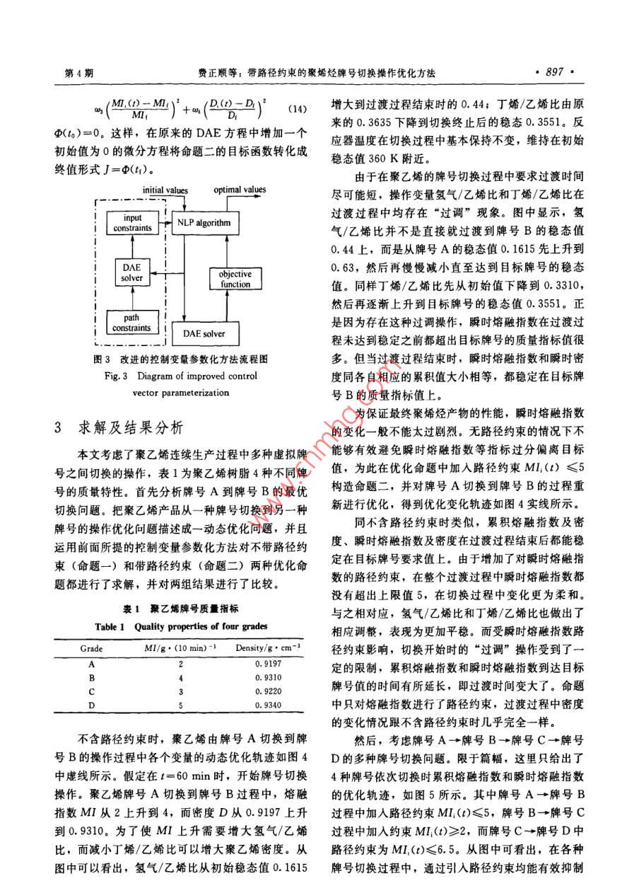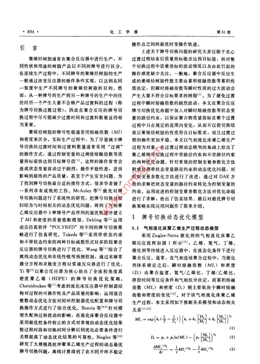第61卷第4期化工學(xué)報(bào)VoL.61 No.42010年4月CIESC JournalApril 2010研究論文貧帶路徑約束的聚烯烴牌號(hào)切換操作優(yōu)化方法9333999939費(fèi)正順,胡斌,葉魯彬,鄭平友,梁軍(浙江大學(xué)工業(yè)控制研究所,工業(yè)控制技術(shù)國(guó)家重點(diǎn)實(shí)驗(yàn)室,浙江杭州310027)摘要:產(chǎn)品多樣化需求使得聚烯烴生產(chǎn)過(guò)程中經(jīng)常需要進(jìn)行牌號(hào)切換操作。以往關(guān)于牌號(hào)切換優(yōu)化的研究大多只關(guān)心切換過(guò)程結(jié)束后聚合物質(zhì)址指標(biāo)是否達(dá)到目標(biāo)牌號(hào)值,對(duì)過(guò)渡過(guò)程中質(zhì)最指標(biāo)及狀態(tài)變量的波動(dòng)情況缺少關(guān)注,而過(guò)程的波動(dòng)會(huì)影響到最終產(chǎn)物的質(zhì)最性質(zhì)和操作平穩(wěn)性。為此,本文以聚乙烯氣相流化床反應(yīng)器為對(duì)象,通過(guò)在牌號(hào)切換優(yōu)化命題中加入關(guān)于熔融指數(shù)等的路徑約束,防止過(guò)渡過(guò)程中的狀態(tài)變量劇烈波動(dòng)影響聚合物樹脂質(zhì)量。為求解此類帶路徑約束的動(dòng)態(tài)優(yōu)化問(wèn)題,對(duì)常規(guī)的控制變最參數(shù)化方法進(jìn)行了改進(jìn),通過(guò)求解微分代數(shù)方程(DAE 方程)將路徑約束轉(zhuǎn)化為控制變量約束。仿真結(jié)果表明,加人路徑約束可以有效避免牌號(hào)切換中變量的劇烈波動(dòng),增強(qiáng)過(guò)程平穩(wěn)性。關(guān)鍵詞:聚合反應(yīng);牌號(hào)切換:控制變量參數(shù)化;路徑約束中團(tuán)分類號(hào): TP 277文獻(xiàn)標(biāo)識(shí)碼: A文章編號(hào): 0438-1157 (2010) 04-0893-08Optimal grade transition of polymerization process with path constraintsFEI Zhengshun, HU Bin, YE Lubin, ZHENG Pingyou, LIANG Jun(State Key Laboralory of Industrial Control Technology. Institute of Industrial Control ,Zhejiang University, Hangzhou 310027,Zhejiang, China)Abstract: To meet a demand for various polymer products, grade transitions are frequently required in thepolymerization process. The recent studies for grade transition optimization mostly focused on adjusting thequality specifications to target values. However, the variations on quality specifications and state variablesduring the grade transition will greatly affect the operation stability of the system and the productqualities. In this study, the authors proposed a simple and effective approach to alleviate the fluctuationsduring grade transition by adding path constraints to the optimization structure of grade transition in a gas-phase fluidized bed reactor for polyethylene. The path constraints were transformed to control variableconstraints by solving the differential algebraic equation, which significantly improves the traditionalcontrol vector parameterization method to solve dynamic optimization problems with path constraints. Thesimulation results confirm the effectiveness of the proposed approach to enhance the operation stbility.Key words: polymerization; grade transition; control vector parameterization; path constraints2009-10-21收到初稿,2009- 12-03收到修改稿。Received date; 2009-10-21.聯(lián)系人:架軍。第一作者:費(fèi)正順(1984-),男,博士研Corresponding antbor: Prof, LIANG Jun, jliang @究生。ipe. zju edu. cn基金項(xiàng)目:國(guó)家自然科學(xué)基金項(xiàng)目(60574047); 國(guó)家高技術(shù)Foundation item: supported by the National Natural Science研究發(fā)展計(jì)劃項(xiàng)目(2007AA04Z168, 2009AA04Z154); 教有部博Foundation of Ching ( 60574047),the High-tech Research and士點(diǎn)基金項(xiàng)目(20050335018)。Development Program of Caina (2007AA04Z168, 2009AA04Z154) andthe Doctorate Foundation of the State Education Ministry of China(20050335018).●894●化工學(xué)報(bào)第61卷操作點(diǎn)之間的最優(yōu)時(shí)變操作軌跡。引| 言上述關(guān)于牌號(hào)切換問(wèn)題的研究大多僅限于關(guān)心聚烯烴樹脂通常在聚合反應(yīng)器中進(jìn)行生產(chǎn),不過(guò)渡過(guò)程結(jié)束后質(zhì)量指標(biāo)能否達(dá)到目標(biāo)值,而對(duì)整同性狀和用途的樹脂產(chǎn)品以不同的牌號(hào)進(jìn)行區(qū)分。個(gè)切換過(guò)程中質(zhì)量指標(biāo)的波動(dòng)情況以及由此引起的在連續(xù)生產(chǎn)過(guò)程中,不同牌號(hào)的聚烯烴樹脂的生產(chǎn)操作難度缺少關(guān)注。一般地,聚合反應(yīng)器中反應(yīng)生一般通過(guò)改變反應(yīng)器的操作條件實(shí)現(xiàn),以達(dá)到在同成的聚烯烴樹脂性能主要由累積熔融指數(shù)等累積性一裝置中生產(chǎn)不同牌號(hào)的聚烯烴樹脂的目的。然質(zhì)決定,但瞬時(shí)熔融指數(shù)等瞬時(shí)性質(zhì)的過(guò)大波動(dòng)會(huì)而,從一種牌號(hào)的生產(chǎn)到另-種牌號(hào)的生產(chǎn)中間往產(chǎn)生大量不符合目標(biāo)要求的樹脂”。為了避免過(guò)渡往經(jīng)歷一個(gè)產(chǎn)生大量不合格產(chǎn)品過(guò)渡料的過(guò)程(稱過(guò)程中瞬時(shí)熔融指數(shù)的劇烈波動(dòng),本文在聚合反應(yīng)為牌號(hào)切換過(guò)渡過(guò)程),因此在聚合反應(yīng)的牌號(hào)切.牌號(hào)切換優(yōu)化命題中加入對(duì)瞬時(shí)熔融指數(shù)等狀態(tài)變換過(guò)程中盡可能減少過(guò)渡時(shí)間和過(guò)渡料數(shù)量顯得相量的路徑約束,以保證聚合物質(zhì)量指標(biāo)在整個(gè)過(guò)渡當(dāng)重要。過(guò)程中只在規(guī)定的范圍內(nèi)變化,從而不僅使切換結(jié)聚烯