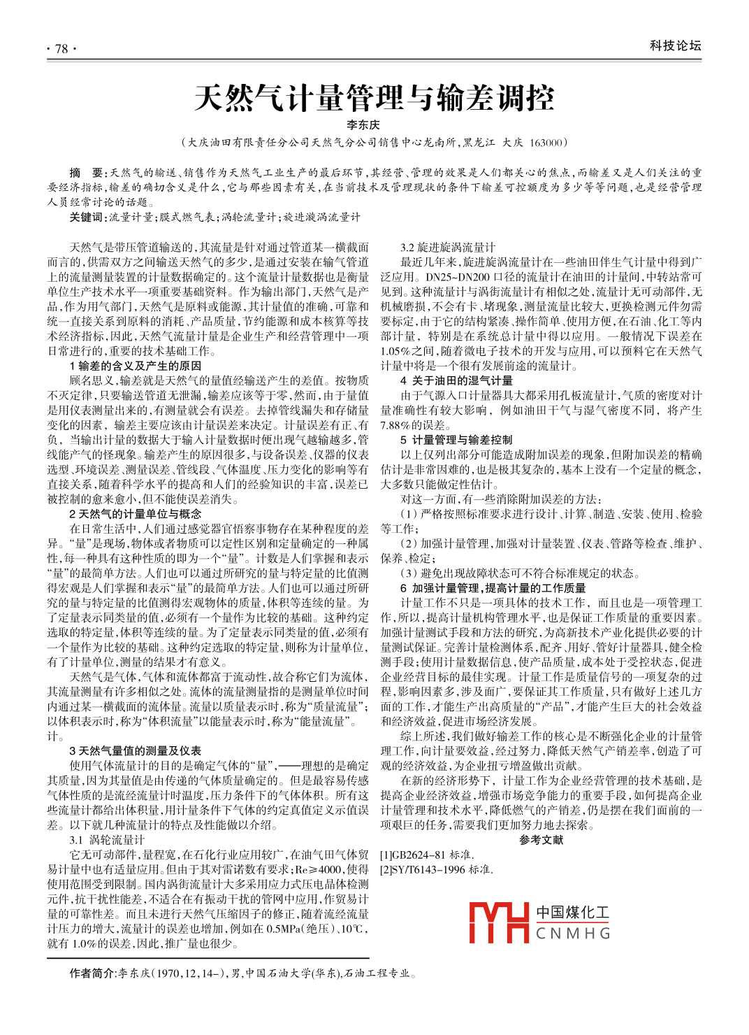 78·科技論壇天然氣計量管理與輸差調(diào)控李東慶(大慶油田有限責任分公司天然氣分公司銷售中心龍南所,黑龍江大慶163000摘要:天然氣的輸送、銷售作為天然氣工業(yè)生產(chǎn)的最后環(huán)節(jié),其經(jīng)營、管理的效果是人們都關心的焦點,而輸差又是人們關注的重要經(jīng)濟指標,輸差的確切含義是什么,它與那些因素有關,在當前技術及管理現(xiàn)狀的條件下輸差可控額度為多少等等問題,也是經(jīng)營管理人員經(jīng)常討論的話題關鍵詞:流量計量;膜式燃氣表;渦輪流量計;旋進漩渦流量計天然氣是帶壓管道輸送的,其流量是針對通過管道某一橫截面3.,2旋進旋渦流量計而言的,供需雙方之間輸送天然氣的多少,是通過安裝在輸氣管道最近幾年來,旋進旋渦流量計在一些油田伴生氣計量中得到廠上的流量測量裝置的計量數(shù)據(jù)確定的。這個流量計量數(shù)據(jù)也是衡量泛應用。DN25-DN200口徑的流量計在油田的計量間,中轉(zhuǎn)站??蓡挝簧a(chǎn)技術水平一項重要基礎資料。作為輸岀部門,天然氣是產(chǎn)見到。這種流量計與渦街流量計有相似之處,流量計無可動部件,無品,作為用氣部門,天然氣是原料或能源,其計量值的準確,可靠和機槭磨損,不會有卡、堵現(xiàn)象,測量流量比較大,更換檢測元件勿需統(tǒng)一直接關系到原料的消耗、產(chǎn)品質(zhì)量,節(jié)約能源和成本核算等技要標定,由于它的結(jié)構緊湊、操作簡單、使用方便,在石油、化工等內(nèi)術經(jīng)濟指標,因此,天然氣流量計量是企業(yè)生產(chǎn)和經(jīng)營管理中一項部計量,特別是在系統(tǒng)總計量中得以應用。一般情況下誤差在日常進行的,重要的技術基礎工作。1.05%之間,隨著微電子技術的開發(fā)與應用,可以預料它在天然氣1輸差的含義及產(chǎn)生的原因計量中將是一個很有發(fā)展前途的流量計顧名思義,輸差就是天然氣的量值經(jīng)輸送產(chǎn)生的差值。按物質(zhì)4關于油田的濕氣計量不滅定律,只要輸送管道無泄漏,輸差應該等于零,然而,由于量值由于氣源入口計量器具大都采用孔板流量計,氣質(zhì)的密度對計是用儀表測量出來的,有測量就會有誤差。去掉管線漏失和存儲量量準確性有較大影響,例如油田干氣與濕氣密度不同,將產(chǎn)生變化的因素,輸差主要應該由計量誤差來決定。計量誤差有正、有7.88%的誤差負,當輸岀計量的數(shù)據(jù)大于輸入計量數(shù)據(jù)時便岀現(xiàn)氣越輸越多,管5計量管理與輸差控制線能產(chǎn)氣的怪現(xiàn)象。輸差產(chǎn)生的原因很多,與設備誤差、儀器的儀表以上僅列出部分可能造成附加誤差的現(xiàn)象,但附加誤差的精確選型、環(huán)境誤差、測量誤差、管線段、氣體溫度、壓力變化的影響等有估計是非常因難的,也是極其復雜的,基本上沒有一個定量的概念,直接關系,隨著科學水平的提高和人們的經(jīng)驗知識的豐富,誤差已大多數(shù)只能做定性估計被控制的愈來愈小,但不能使誤差消失。對這一方面,有一些消除附加誤差的方法:2天然氣的計量單位與概念(1)嚴格按照標準要求進行設計、計算、制造、安裝、使用、檢驗在日常生活中,人們通過感覺器官悟察事物存在某種程度的差等工作異?!傲俊笔乾F(xiàn)場,物體或者物質(zhì)可以定性區(qū)別和定量確定的一種屬(2)加強計量管理,加強對計量裝置、儀表、管路等檢査、維護性,每一種具有這種性質(zhì)的即為一個“量”。計數(shù)是人們掌握和表示保養(yǎng)、檢定;量”的最簡單方法。人們也可以通過所研究的量與特定量的比值測(3)避免出現(xiàn)故障狀態(tài)可不符合標準規(guī)定的狀態(tài)。得宏觀是人們掌握和表示“量”的最簡單方法。人們也可以通過所研6加強計量管理,提高計量的工作質(zhì)量究的量與特定量的比值測得宏觀物體的質(zhì)量,體積等連續(xù)的量。為計量工作不只是一項具體的技術工作,而且也是一項管理工了定量表示同類量的值,必須有一個量作為比較的基礎。這種約定作,所以,提高計量機構管理水平,也是保證工作質(zhì)量的重要因素選取的特定量,體積等連續(xù)的量。為了定量表示同類量的值,必須有加強計量測試手段和方法的研究,為高新技術產(chǎn)業(yè)化提供必要的計一個量作為比較的基礎。這種約定選取的特定量,則稱為計量單位,量測試保證。完善計量檢測體系,配齊、用好、管好計量器具,健全檢有了計量單位,測量的結(jié)果才有意義測手段;使用計量數(shù)據(jù)信息,使產(chǎn)品質(zhì)量,成本處于受控狀態(tài),促進天然氣是氣體,氣體和流體都富于流動性,故合稱它們?yōu)榱黧w,企業(yè)經(jīng)營目標的最佳實現(xiàn)。計量工作是質(zhì)量信號的一項復雜的過其流量測量有許多相似之處。流體的流量測量指的是測量單位時間程,影響因素多,涉及面廣,要保證其工作質(zhì)量,只有做好上述幾方內(nèi)通過某一橫截面的流體量。流量以質(zhì)量表示時,稱為“質(zhì)量流量”;面的工作,才能生產(chǎn)出高質(zhì)量的“產(chǎn)品”,才能產(chǎn)生巨大的社會效益以體積表示時,稱為“體積流量”以能量表示時,稱為“能量流量”。和經(jīng)濟效益,促進市場經(jīng)濟發(fā)展計。綜上所述,我們做好輸差工作的核心是不斷強化企業(yè)的計量管3天然氣量值的測量及儀表理工作,向計量