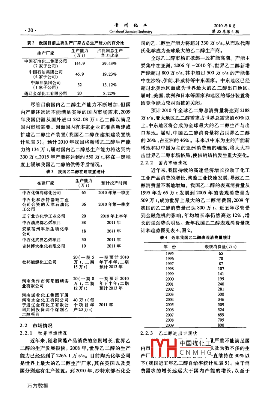10年8月貴州化工第35卷第4期GuizhouChemicallndustry貴州發(fā)展煤制乙二醇項目的研究胡松'胡安旭2容天娟2嚴(yán)勇2(1.貴州赤天化集團有限責(zé)任公司,貴州貴陽550001;2.貴州赤天化股份有限責(zé)任公司,貴州赤水564707)摘要本文介紹了乙二醇目前國內(nèi)生產(chǎn)、技術(shù)和市場現(xiàn)狀,并根據(jù)貴州的能源結(jié)構(gòu)情況、資源優(yōu)勢、區(qū)位優(yōu)勢等閘述了在貴州發(fā)展煤制乙二醇項目的可行性。關(guān)鍵詞煤制乙二醇項目研究中圖分類號TQ014文獻標(biāo)識碼A文章編號1008-9411(2010)04-0029-04吸入中毒表現(xiàn)為反復(fù)發(fā)作性昏厥,并可有眼球震顫淋巴細(xì)胞增多??诜蠹毙灾卸痉秩齻€階段:第乙二醇(EG)是最簡單和最重要的脂肪族二元階段主要為中樞神經(jīng)系統(tǒng)癥狀,輕者似乙醇中毒表醇,也是一種重要的有機化工原料,主要用作生產(chǎn)聚現(xiàn)重者迅速產(chǎn)生昏迷抽搐,最后死亡;第二階段,心酯的單體,進而制造制造聚酯(可進一步生產(chǎn)滌綸、肺癥狀明顯,嚴(yán)重病例可有肺水腫,支氣管肺炎,心飲料瓶、薄膜)、炸藥、乙二醛和聚對苯二甲酸乙二醇力衰竭;第三階段主要表現(xiàn)為不同程度腎功能衰竭。酯(PET)樹脂防凍劑、增塑劑、水力流體和溶劑等人的本品一次口服致死量估計為1.4mL/kg(1.56g高純度乙二醇還可用作過硼酸銨的溶劑和介質(zhì)涂kg)。料、照像顯影液、剎車液以及油墨等行業(yè)。中國乙二醇消費量占世界乙二醇的26%,占亞2國內(nèi)乙二醇生產(chǎn)及市場現(xiàn)狀洲的46%。近三年來,中國國內(nèi)乙二醇表觀消費量2.1乙二醇生產(chǎn)現(xiàn)狀由2007年的659萬t增長到2009年的800萬t,表截止到2009年年底,隨著遼陽石油化工公司、觀消費量年平均增長率為15%,進口乙二醇由2007內(nèi)蒙古通遼金煤化工、南京揚子-巴斯夫有限公司、年的240萬t增長到2009年的582萬t,年平均增長中海殼牌、上海石油化工公司等多套新建或擴建的率為12%,可見隨著國內(nèi)經(jīng)濟的發(fā)展,拉動乙二醇乙二醇專注相繼建成投產(chǎn),我國乙二醇的生產(chǎn)廠家消費持續(xù)增長,落后的生產(chǎn)技術(shù)以及發(fā)展滯后的生達到13家,乙二醇總生產(chǎn)能力大大增加,乙二醇產(chǎn)能力使得國內(nèi)乙二醇供需缺口矛盾長期得不到有量從2005年的110.08萬t增加到2009年的195萬效解決,從而導(dǎo)致進口乙二醇的大幅增長。貴州作t,平均每年增長15%。我國近年乙二醇生產(chǎn)統(tǒng)計為中國南方煤炭資源最豐富的省區(qū),素以“西南煤表趨勢圖以及各生產(chǎn)廠家的生產(chǎn)能力集百分比如?!敝Q,為我國計劃在全國打造七大煤化工產(chǎn)業(yè)區(qū)下表1、圖1、表2所示。之一。結(jié)合目前國內(nèi)已掌握20萬t煤制乙二醇項表1國內(nèi)乙二醇近年生產(chǎn)愉況統(tǒng)計(單位:萬∽a)目的先進技術(shù),增大對貴州煤制乙二醇項目的發(fā)展2005200620072008200研究和投資,具有非常重要的意義產(chǎn)量(萬t)110.08135.4162.3186.81951乙二醇特性25別名:甘醇;分子式:C2HO2;HOCH2CH20H;R150分子量:62.07;熔點:-13.2℃;沸點:197.5℃;閃點:110℃;密度:相對密度(水=1):1.11;相對密度(空氣=1):2.14;外觀與性狀:無色、無臭、有甜味、粘稠液體;蒸汽壓:6.21kPa/20℃;溶解性:與中國煤化工200200水混溶,可混溶于乙醇、醚等。穩(wěn)定性:穩(wěn)定。侵入CN MHG徑:吸入、食入、經(jīng)皮吸收。健康危害:國內(nèi)未見相圖1國內(nèi)乙二醇近年產(chǎn)量趨勢圖品急慢性中毒報道。國外的急性中毒多系因誤報。貴州化三2010年8月Guizhou ChemicalIndustry第35卷第4期表2我國目前主要生產(chǎn)廠家占總生產(chǎn)能力的百分比司的乙二醇生產(chǎn)能力將超過330萬va,從而取代陶生產(chǎn)廠家生產(chǎn)能力占我國總生產(chǎn)氏化學(xué)成為全球最大的乙二醇生產(chǎn)商(萬t)能力比率中國石油化工集團公司全球乙二醇市場正掀起一股擴能高潮。產(chǎn)能主(7家子公司)144.959,43%要集中在亞洲,2006年-2010年,世界乙二醇新增中國石油集團公司(4家子公司)46.99.23%產(chǎn)能超過800萬t/a,其中超過500萬Ua的產(chǎn)能集中海油集團公司(1家子公司)32中在沙特、伊朗、科威特等中東國家。中東地區(qū)已經(jīng)超過北美地區(qū)而成為世界最大的乙二醇出口地區(qū)。通遼金煤化工有限公司8.22%屆時,美國、歐洲和日本等國家和地區(qū)的部分裝置將盡管目前國內(nèi)乙二醇生產(chǎn)能力不斷增加,但國因競爭能力較弱而被迫關(guān)閉。內(nèi)產(chǎn)能還遠(yuǎn)遠(yuǎn)不能滿足實際的國內(nèi)市場需求,2009預(yù)計2010年全球乙二醇總消費量將達到2188年我國仍需從國外進口582.08萬t乙二醇以滿足萬va,亞太地區(qū)乙二醇需求占世界總需求的6%以國內(nèi)市場需要。因而國內(nèi)有多家企業(yè)正準(zhǔn)備新建或上,中東地區(qū)將會成為全球最大的乙二醇生產(chǎn)與出擴建乙二醇生產(chǎn)裝置(我國乙二醇在建擬建裝置統(tǒng)基地。屆時,中國乙二醇消費量將占世界乙二醇計見表3)。預(yù)計2010年我國將新增乙二醇生產(chǎn)能的26%,占亞洲的46%。未來以中東為主的產(chǎn)能新力約134萬t,屆時國內(nèi)乙二醇總生產(chǎn)能力將達到約增地和以中國為主的亞洲消費地的崛起將大大沖330萬t,2015年產(chǎn)能將達到約550萬t,將在一定程擊世界乙二醇市場格局使供銷結(jié)構(gòu)發(f
