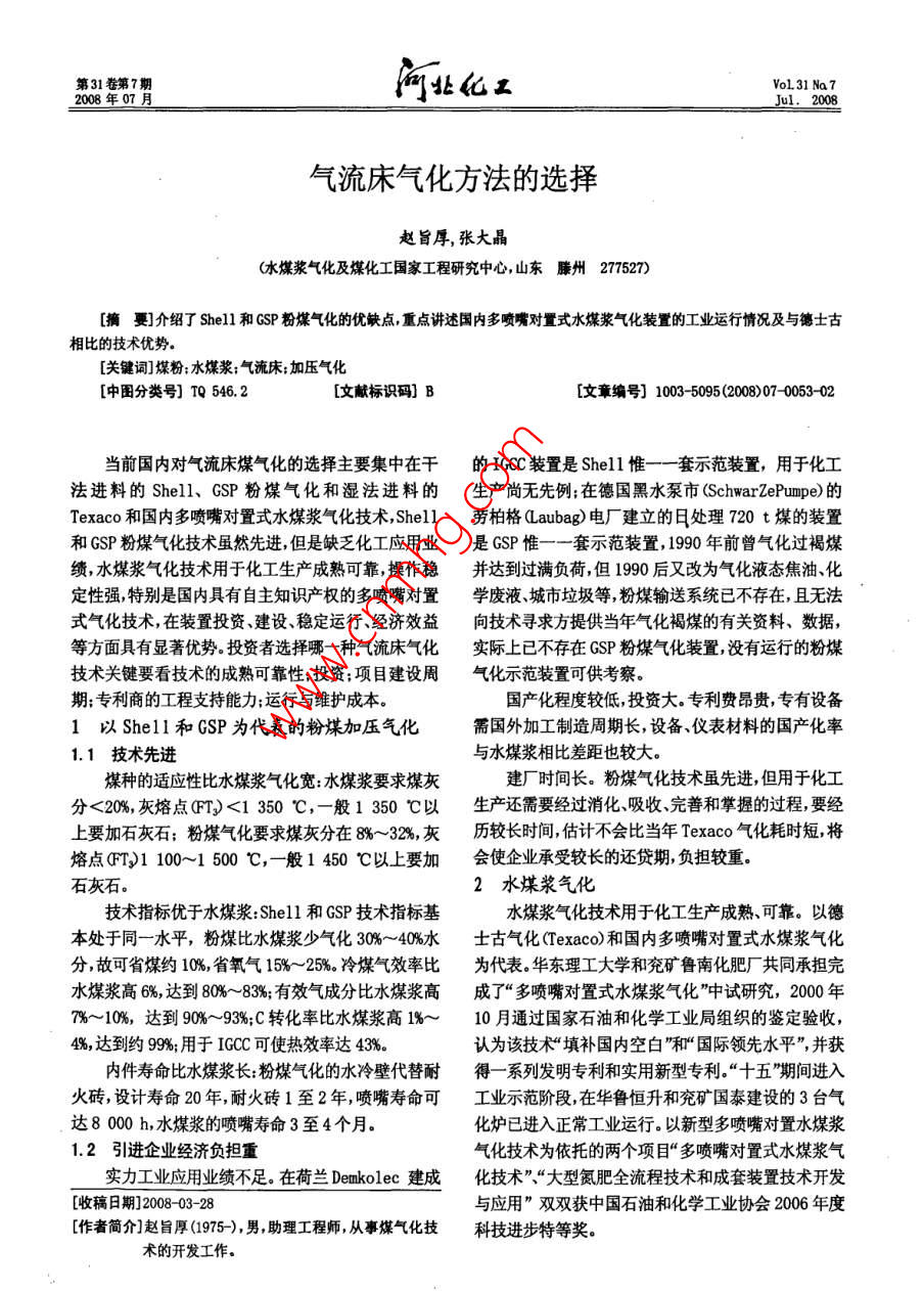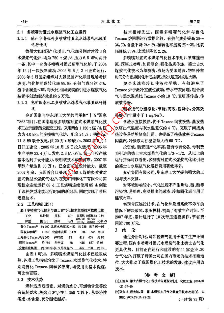 第31卷第7期河北化工VoL31 Na72008年07月Jul. 2008氣流床氣化方法的選擇趙旨厚,張大晶.(水煤漿氣化及煤化工國家工程研究中心,山東滕州277527)[摘要]介紹了Shell和GSP粉煤氣化的優(yōu)缺點(diǎn),重點(diǎn)講述國內(nèi)多噴嘴對(duì)置式水煤漿氣化裝置的工業(yè)運(yùn)行情況及與德士古相比的技術(shù)優(yōu)勢(shì)。[關(guān)鍵詞]煤粉;水煤漿;氣流床加壓氣化[中圖分類號(hào)] TQ 546.2[文獻(xiàn)標(biāo)識(shí)碼] B[文章編號(hào)] 1003-5095(2008)07-0053-02當(dāng)前國內(nèi)對(duì)氣流床煤氣化的選擇主要集中在干的IGCC裝置是Shell惟一一套示范裝置, 用于化工法進(jìn)料的Shell、GSP 粉煤氣化和濕法進(jìn)料的生產(chǎn)尚無先例;在德國黑水泵市(SchwarZePumpe)的Texaco和國內(nèi)多噴嘴對(duì)置式水煤漿氣化技術(shù), Shell勞柏格(Laubag)電廠建立的日處理720 t煤的裝置和GSP粉煤氣化技術(shù)雖然先進(jìn),但是缺乏化工應(yīng)用業(yè)是GSP惟- --套示范裝置,1990年前曾氣化過褐煤績(jī),水煤漿氣化技術(shù)用于化工生產(chǎn)成熟可靠,操作穩(wěn)并達(dá)到過滿負(fù)荷,但1990 后又改為氣化液態(tài)焦油、化定性強(qiáng),特別是國內(nèi)具有自主知識(shí)產(chǎn)權(quán)的多噴嘴對(duì)置學(xué)廢液、城市垃圾等,粉煤輸送系統(tǒng)已不存在,且無法式氣化技術(shù),在裝置投資、建設(shè)、穩(wěn)定運(yùn)行、經(jīng)濟(jì)效益向技術(shù)尋求方提供當(dāng)年氣化褐煤的有關(guān)資料、數(shù)據(jù),等方面具有顯著優(yōu)勢(shì)。投資者選擇哪-一種氣流床氣化實(shí)際上已不存在GSP粉煤氣化裝置,沒有運(yùn)行的粉煤技術(shù)關(guān)鍵要看技術(shù)的成熟可靠性;投資;項(xiàng)目建設(shè)周氣化示范裝置可供考察。期;專利商的工程支持能力;運(yùn)行與維護(hù)成本。國產(chǎn)化程度較低,投資大。專利費(fèi)昂貴,專有設(shè)備1以 She11和CSP為代表的粉煤加壓氣化需國外加工制造周期長(zhǎng),設(shè)備、儀表材料的國產(chǎn)化率1.1 技術(shù)先進(jìn)與水煤漿相比差距也較大。煤種的適應(yīng)性比水煤漿氣化寬:水煤漿要求煤灰建廠時(shí)間長(zhǎng)。粉煤氣化技術(shù)雖先進(jìn),但用于化工分<20%,灰熔點(diǎn)(FT)<1350 C,一般1 350 C以生產(chǎn)還需要經(jīng)過消化、吸收、完善和掌握的過程,要經(jīng)上要加石灰石:粉煤氣化要求煤灰分在8%~ -32%,灰歷較長(zhǎng)時(shí)間,估計(jì)不會(huì)比當(dāng)年Texaco氣化耗時(shí)短,將熔點(diǎn)FT)1 100~1 500 C, -般1450 C以上要加會(huì)使企業(yè)承受較長(zhǎng)的還貸期,負(fù)擔(dān)較重.石灰石。2水煤漿氣化技術(shù)指標(biāo)優(yōu)于水煤漿:Shell和GSP技術(shù)指標(biāo)基水煤漿氣化技術(shù)用于化工生產(chǎn)成熟、可靠。以德本處于同- -水平,粉煤比水煤漿少氣化30%~40%水士古氣化CTexaco)和國內(nèi)多噴嘴對(duì)置式水煤漿氣化分,故可省煤約10%,省氧氣15%~25%。冷煤氣效率比為代表。華東理工大學(xué)和兗礦魯南化肥廠共同承擔(dān)完水煤漿高6%,達(dá)到80%~83%;有效氣成分比水煤漿高成了“多噴嘴對(duì)置式水煤漿氣化”中試研究,2000 年7%~10%,達(dá)到90%~93%;C轉(zhuǎn)化率比水煤漿高1%~ 10 月通過國家石油和化學(xué)工業(yè)局組織的鑒定驗(yàn)收,4%,達(dá)到約99%;用于IGCC可使熱效率達(dá)43%。認(rèn)為該技術(shù)“填補(bǔ)國內(nèi)空白”和“國際領(lǐng)先水平”,并獲內(nèi)件壽命比水煤漿長(zhǎng):粉煤氣化的水冷壁代替耐得一系列發(fā)明專利和實(shí)用新型專利?!笆濉逼陂g進(jìn)入火磚,設(shè)計(jì)壽命20年,耐火磚1至2年,噴嘴壽命可工業(yè)示范階段,在華魯恒升和兗礦國泰建設(shè)的3臺(tái)氣達(dá)8 000 h,水煤漿的噴嘴壽命3至4個(gè)月。化爐已進(jìn)入正常工業(yè)運(yùn)行。以新型多噴嘴對(duì)置水煤漿1.2引進(jìn)企業(yè)經(jīng)濟(jì) 負(fù)擔(dān)重氣化技術(shù)為依托的兩個(gè)項(xiàng)目“多噴嘴對(duì)置式水煤漿氣實(shí)力工業(yè)應(yīng)用業(yè)績(jī)不足。在荷蘭Demkolec建成化技術(shù)”、“大型氮肥全流程技術(shù)和成套裝置技術(shù)開發(fā)[收稿日期]2008-03-28與應(yīng)用”雙雙獲中國石油和化學(xué)工業(yè)協(xié)會(huì)2006年度[作者簡(jiǎn)介]趙旨厚(1975-),男,助理工程師,從事煤氣化技科技進(jìn)步特等獎(jiǎng)。術(shù)的開發(fā)工作?!?4●河北化工第7期2.1多噴嘴對(duì)置式水煤漿 氣化工業(yè)運(yùn)行技術(shù)指標(biāo)先進(jìn)。國泰多噴嘴氣化爐與魯化2.1.1德州華魯恒升多 噴嘴對(duì)置式水煤漿氣化裝置Texaco爐同期運(yùn)行數(shù)據(jù)比較,有效氣成分提高2%~運(yùn)行情況3%,CO2含量下降2%~3%,碳轉(zhuǎn)化率提高2%~3%,比氧德州大氮肥國產(chǎn)化項(xiàng)目,氣化部分同時(shí)建設(shè)3臺(tái)耗降低7. 9%,比煤耗降低2.2%。水煤漿氣化爐,均為750 t煤/d,壓力6.5 MPa,兩開多噴嘴對(duì)置式水煤漿氣化技術(shù)采用四噴嘴撞擊-備,其中一臺(tái)為多噴嘴對(duì)置式新型氣化爐,于2004流、預(yù)膜式噴嘴,加強(qiáng)混合,強(qiáng)化熱質(zhì)傳遞。德士古水年12月一次投料成功,2005年6月2日正式運(yùn)行,煤漿氣化技術(shù)為單噴嘴,流場(chǎng)為受限射流,物料停留2006年3月國家組織對(duì)大氮肥國產(chǎn)化項(xiàng)目現(xiàn)場(chǎng)考核時(shí)間分布寬,碳轉(zhuǎn)化率低,射流以
