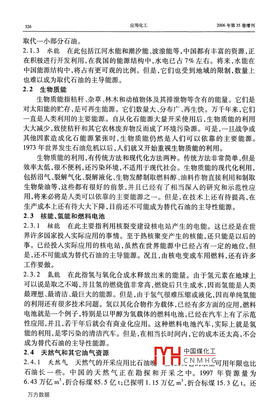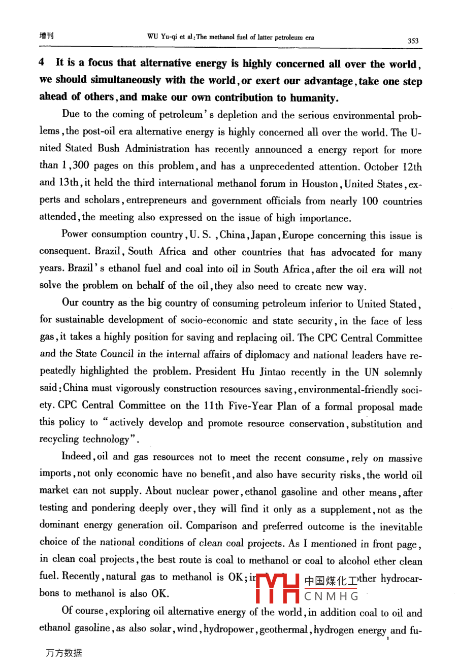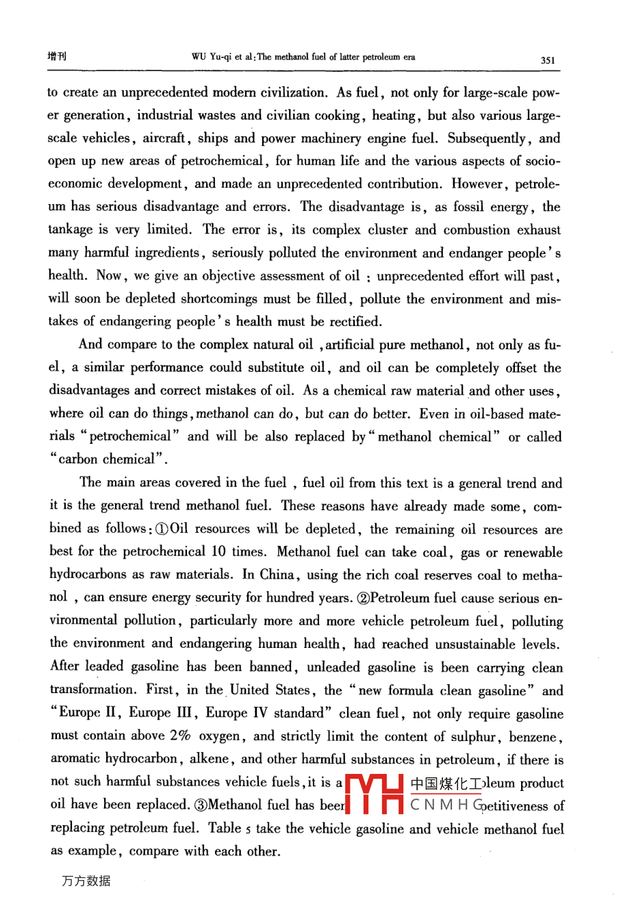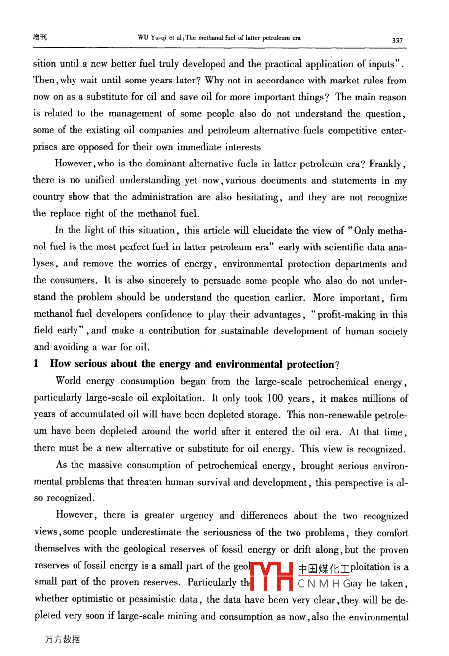 第35卷增刊應(yīng)Vol 352006年10月Applied Chemical IndustryOct.2006后石油時代的甲醇燃料吳城琦,馮向法(中國漯河石化集團控股有限公司,河南漯河462000)摘要:在后石油時代即將來臨和環(huán)境問題日益嚴重的今天,世界科技和能源、環(huán)保各界,乃至聯(lián)合國和各國政府,都在高度關(guān)注替代石油的清潔能源問題,各種替代能源也在競相爭奪取代權(quán)。針對這種情況,通過實事求是地分析,用科學(xué)數(shù)據(jù)說話,毫無隱晦地亮明這個“后石油時代初期惟有甲醇燃料甲天下”的觀點,以解能源、環(huán)保等有關(guān)部門以及廣大消費者關(guān)于代油清潔燃料的憂慮關(guān)鍵詞:石油;甲醇;燃料;替代能源;醇醚燃料中圖分類號:TK01文獻標(biāo)識碼:A在后石油時代即將來臨和環(huán)境問題日益嚴重的今天,世界科技和能源、環(huán)保各界,乃至聯(lián)合國和各國政府,都在高度關(guān)注替代石油的清潔能源問題,各種替代能源也在競相爭奪取代權(quán)。除了科技界比較客觀外,各種替代能源的代言人就是這些能源的擁有者和維護者,競爭非常激烈。其中最有希望的也是遭受攻擊最甚者,例如甲醇燃料,什么動力性問題、毒性問題、腐蝕性問題等,好象這種早已廣泛用作基本化工原料的物質(zhì),用途拓展到燃料領(lǐng)域時,一下子就變成了不能使用的東西了!究競是怎樣的呢?科技界為甲醇作了一些辯護,所有介紹甲醇的書籍和文章都說甲醇除了是最基本的化工原料外,還是典型的清潔燃料。但是,好象也有點躲躲閃閃。例如,大都明說煤、天然氣或其它碳氫化合物都可以制取醇醚清潔燃料,然后繞一個彎,再注明醇醚清潔燃料主要指甲醇和二甲瞇。這種注釋雖然不夠確切,但是畢竟把甲醇作為主角提了出來。其實,醇醚燃料包括甲醇和甲醇的衍生物醚類、酯類等,兩種說法是一回事。好在中國環(huán)境與發(fā)展國際合作委員會的一份報告以及國內(nèi)外一些權(quán)威文章中已經(jīng)明確提出:“若干年后,甲醇燃料將占壓倒其它燃料的主導(dǎo)地位,直到新的更好的燃料真正開發(fā)出來和投入實際應(yīng)用”。那么,為什么要等到若干年后呢?為什么不從現(xiàn)在起就按照市場規(guī)律盡可能取代一些石油而省下石油做更重要的事情呢?主要原因是有關(guān)管理部門的某些人土還不太認識這個問題,現(xiàn)有的一些石油企業(yè)和競爭替代石油燃料的企業(yè),為了自己的眼前利益還在反對。究竟誰是后石油時代的主導(dǎo)性替代燃料呢?說實話,目前還沒有統(tǒng)一認識,我國的各種文件和有關(guān)行政部門的言論表明,他們還在十字路口猶豫,有病亂投醫(yī)的現(xiàn)象顯而易見,更沒有認定甲醇燃料的恥中國煤化工針對這種情況,本文通過實事求是地分機HCNMH毫無隱晦地亮明這個“后石油時代初期惟有甲醇燃料甲天下”的觀點,以解能源、環(huán)保等有關(guān)部門以及廣大消費者關(guān)于代油清潔燃料的憂慮。同時也誠心地勸說一些還不太增刊吳域琦等:后石油時代的甲醇燃料323認識這個問題的人,早日認識這個問題。更主要地是堅定甲醇燃料開發(fā)者的信心,使之發(fā)揮我國自己的優(yōu)勢,早日從這個領(lǐng)域“牟利”,并對人類社會可持續(xù)發(fā)展和避免爭奪石油的戰(zhàn)爭做出貢獻。1能源與環(huán)境問題世界能源的大規(guī)模消耗是從化石能源,特別是石油的大規(guī)模開采應(yīng)用開始的。它僅僅用了一百多年的時間,就使得億萬年的石油積累貯藏即將消耗殆盡。這種不可再生的石油消耗殆盡前后,世界就進入了后石油時代。那時,必須有替代或取代石油的新能源。這個觀點是公認的。由于化石能源的大規(guī)模耗用,帶來了嚴重的環(huán)境問題,威脅著人類的生存和發(fā)展,這個觀點也是公認的。但是,當(dāng)今人們對這兩個公認觀點的認識,在緊迫性和對策上卻有較大差異。一些人輕視這兩個問題的嚴重性,用化石能源的地質(zhì)貯量或者尚能得過且過來安慰自己,用逃離環(huán)境污染重災(zāi)區(qū)來應(yīng)付環(huán)境污染。豈知,化石能源的已探明貯量只是地質(zhì)貯量的一小部分,可采貯量又是已探明貯量的一小部分。特別是石油的已探明可采貯量,不管是樂觀數(shù)據(jù)還是悲觀數(shù)據(jù),都已經(jīng)見底,象現(xiàn)在這樣大規(guī)模開采和消耗下去,很快就要枯竭。又豈知,化石能源造成的環(huán)境污染,已經(jīng)嚴重威脅人類和地球生物的生存。如果個別企業(yè)不顧這些,當(dāng)各國政府執(zhí)行聯(lián)合國的《里約宣言》、《21世紀議程》、《蒙特利爾議定書》和《京都議定書》等文件時,這些企業(yè)將在劫難逃。因為如果不這樣,任憑保護地球的臭氧層破壞、酸雨頻降、疑難病叢生,人類和地球生物都難以生存。在這方面已有先例。在以前的很長時間內(nèi),汽車制造商是反對汽油中加入含氧化合物的,因為他們主要考慮的是腐蝕性問題。但是,1990年美國國會通過了“清潔空氣法修正案”強制推行“新配方清潔汽油”后,全世界紛紛響應(yīng),含氧化合物成了“新配方清潔汽油”必須添加的成分。1.1關(guān)于能源問題全世界的石油資源究競還能維持多少時間呢?全球石油的總貯量,樂觀地估算為6500億t,悲觀地估算為2700億t,實際上已探明的可采貯量比這少得多。在21世紀開始的時候,全