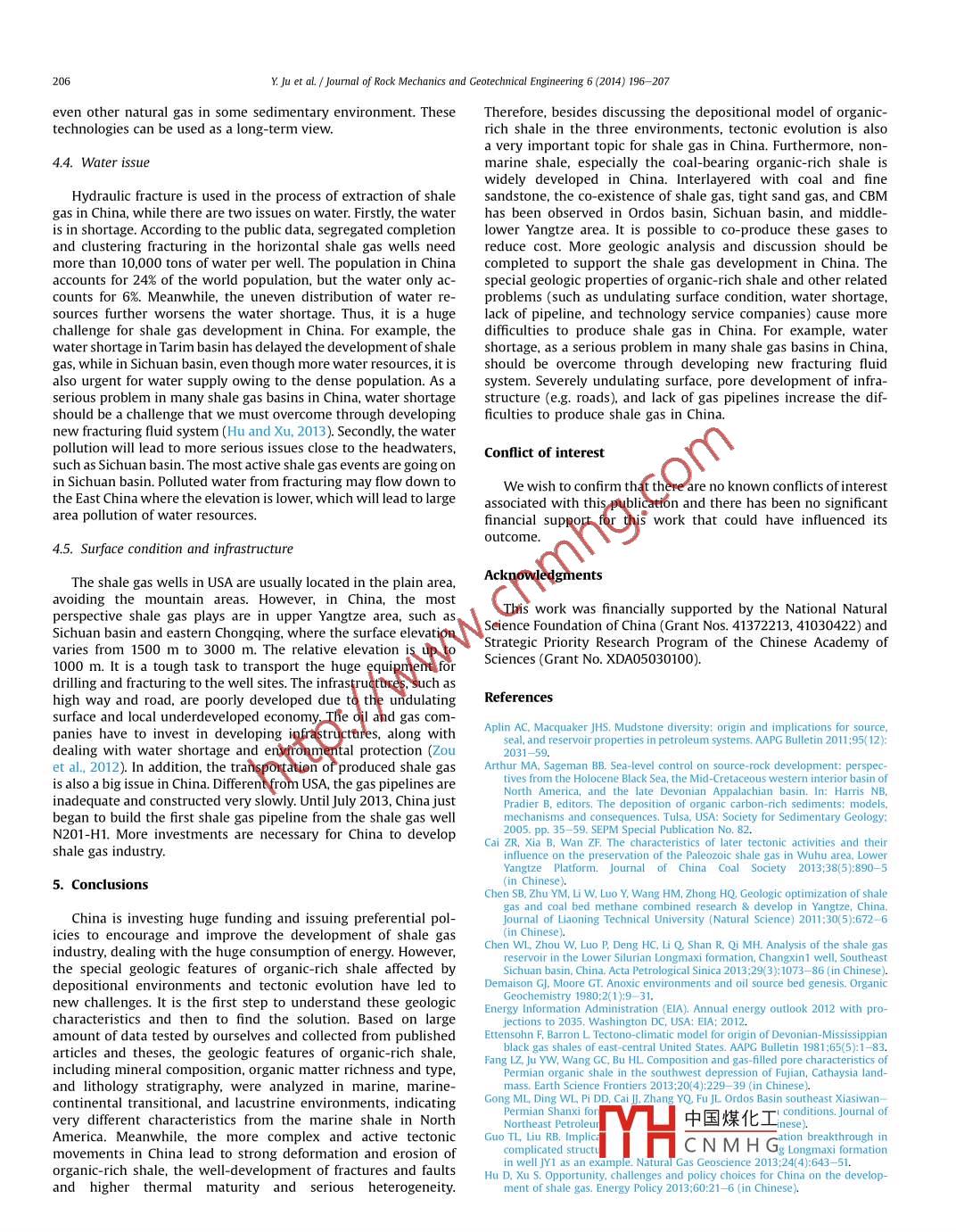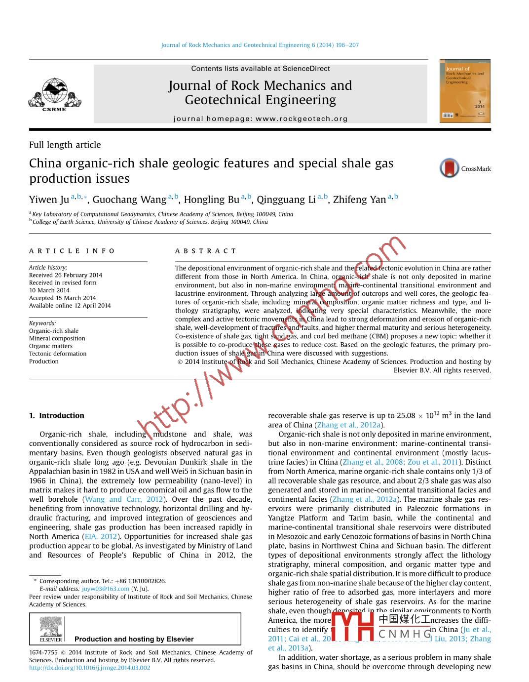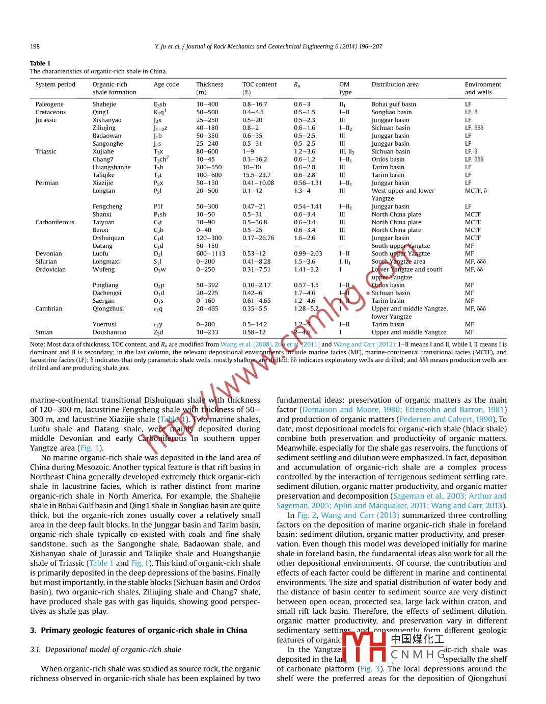 Journal of Rock Mechanics and Geotechnical Engineering 6(2014)196-207Contents lists available at Science DirectJournal of rock mechanics andGeotechnical EngineeringCSRMEjournalhomepagewww.rockgeotech.orgFull length articleChina organic-rich shale geologic features and special shale gasCross Markproduction issuesYiwen Jua,b, Guochang Wang,bHongling Bu, b, Qingguang Li, b, Zhifeng Yan a, ba Key laboratory of Computational Geodynamics, Chinese Academy of sciences, Beijing 100049, Chinab College of Earth Science, University of Chinese Academy of Sciences, Beijing 100049, ChinaARTICLE INFOABSTRACTArticle history:The depositional environment of organic-rich shale and the related tectonic evolution in China are ratherReceived 26 February 2014different from those in North America. In China, organic-rich shale is not only deposited in marineReceived in revised formenvironment but also in non-marine environment: marine-continental transitional environment and10 March 2014cepted 15 March 2014lacustrine environment. Through analyzing large amount of outcrops and well cores, the geologic feaAvailable online 12 April 2014tures of organic-rich shale, including mineral composition, organic matter richness and type, and lithology stratigraphy, were analyzed, indicating very special characterMeanwhile. the morecomplex and active tectonic movements in China lead to strong deformation and erosion of organic-richshale, well-development of fractures and faults, and higher thermal maturity and serious heterogeneity.Co-existence of shale gas, tight sand gas, and coal bed methane( CBM) proposes a new topic: whether itOrganic mattduction issues of shale gas in China were discussed with suggestio. geologic features, the primary pro-is possible to Co-produce these gases to reduce cost BasedProductiono 2014 Institute of Rock and Soil Mechanics, Chinese Academy of Sciences. Production and hosting byElsevier B V. All rights reserved1. Introductionrecoverable shale gas reserve is up to 25. x 102m in the landarea of China(Zhang et al., 2012a)Organic-rich shale, including mudstone and shale, was Organic-rich shale is not only deposited in marine environment,onventionally considered as source rock of hydrocarbon in sedi- but also in non-marine environment: marine-continental transi-mentary basins. Even though geologists observed natural gas in tional environment and continental environment(mostly lacus-organic-rich shale long ago(e.g Devonian Dunkirk shale in the trine facies) in China(Zhang et al., 2008: Zou et al., 2011). DistinctAppalachian basin in 1982 in USA and well Wei5 in Sichuan basin in from North America, marine organic-rich shale contains only 1/3 of1966 in China), the extremely low permeability(nano-level)in all recoverable shale gas resource and about 2 /3 shale gas was alsomatrix makes it hard to produce economical oil and gas flow to the generated and stored in marine-continental transitional facies andwell borehole (Wang and Carr, 2012). Over the past decade, continental facies (Zhang et al, 2012a) The marine shale gas resdraulic fracturing, and improved integration of geosciences and Yangtze platform and Tarim basin, while the continental andengineering, shale gas production has been increased rapidly in marine-continental transitional shale reservoirs were distributedNorth America(EIA, 2012). Opportunities for increased shale gas in Mesozoic and early Cenozoic formations of basins in North Chinaproduction appear to be global As investigated by Ministry of Land plate, basins in Northwest China and Sichuan basin. The differentand Resources of Peoples Republic of China in 2012, the types of depositional environments strongly affect the lithologystratigraphy, mineral composition, and organic matter type andorganic-rich shale spatial distribution. It is more difficult to produceesponding author. Tel :+86 1381000282shale gas from non-marine shale because of the higher clay content,uyw0300163.com(y.Ju)esponsibility of Institute of Rock and Soil Mechanics, Chinesehigher ratio of free to adsorbed gas, more interlayers and moreAcademyserious heterogeneity of shale gas reservoirs. As for the marineshale, even thoughAmerica. the中國煤化工 ncreases the difficulties to identifyProduction and hosting by elsevier2011: Cai et al. 20lCNMH Gn China (u et ald Liu, 2013: Zhang1674-7755 2014 Institute of Rock and Soil Mechanics, Chinese Academy ofet al. 2013a)Sciences. Production and hosting by Elsevier B.V. All rights reserved.In addition, water shortage, as a serious problem in many shaleY Ju et al. Journal of Rock Mechanics and Geotechnical Engineering 6(2014)196-207fracturing fluid system(Hu and Xu, 2013). Severely undulating primarily in the shelf of carbonate platform. Qiongzhusi shale ofsurface, pore development of infrastructure(e.g. roads ), and lack of Lower Cambrian, Wufeng shale of Upper Ordovician, and Longmaxigas pipelines increase the difficulties to produce shale gas in China. shale of Lower Silurian are the most promising shale gas reservoirsIt is significant to understand the geologic characteristics of in South China(table 1). The average thickness of Qiongzhusi shaleorganic-rich shale, their effects on shale gas production, and the is approximately 100 m, covering an area of 30 x 10-50 x 10kmspecial production problems of shale gas in China. Therefore, in this(Zou et al., 2011). The Wufeng-Longmaxi shale, covering most ofpaper, we will analyze the primary features of shale gas reservoirs, the Yangtze area, possesses the thickness up to 120 m. Severalincluding the spatial distribution, depositional environments, horizontal wells targeting Qiongzhusi and Wufeng-Longmaximineral composition, organic matter type, richness, and matura- shales have high initial production rate of shale gas. For example,tion. The special challenges of horizontal well and hydraulic frthe horizontal well Yang201-H2 is up to 43 x 10" m per day at theturing are discussed with suggestionsbeginning In Tarim basin, Yuertusi shale 