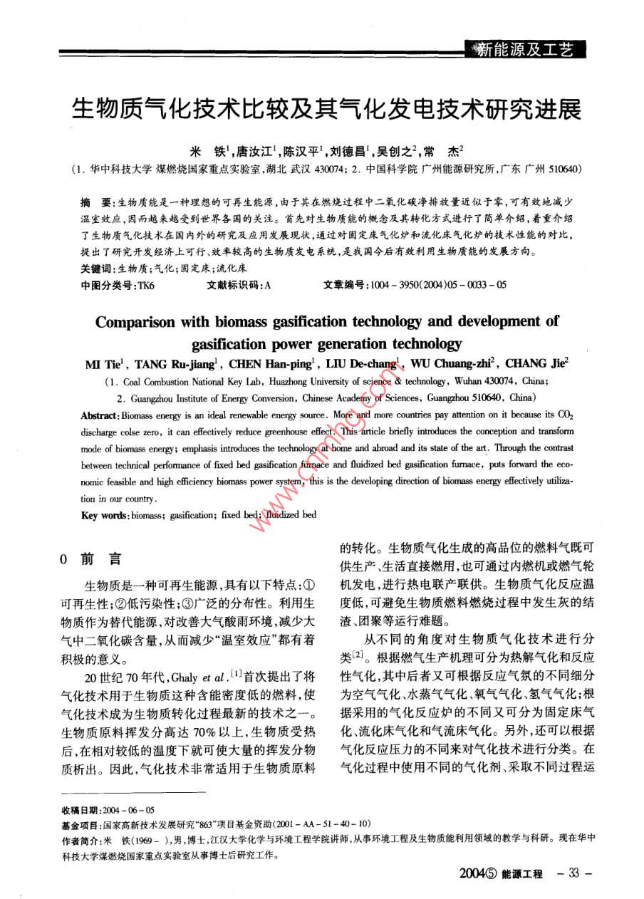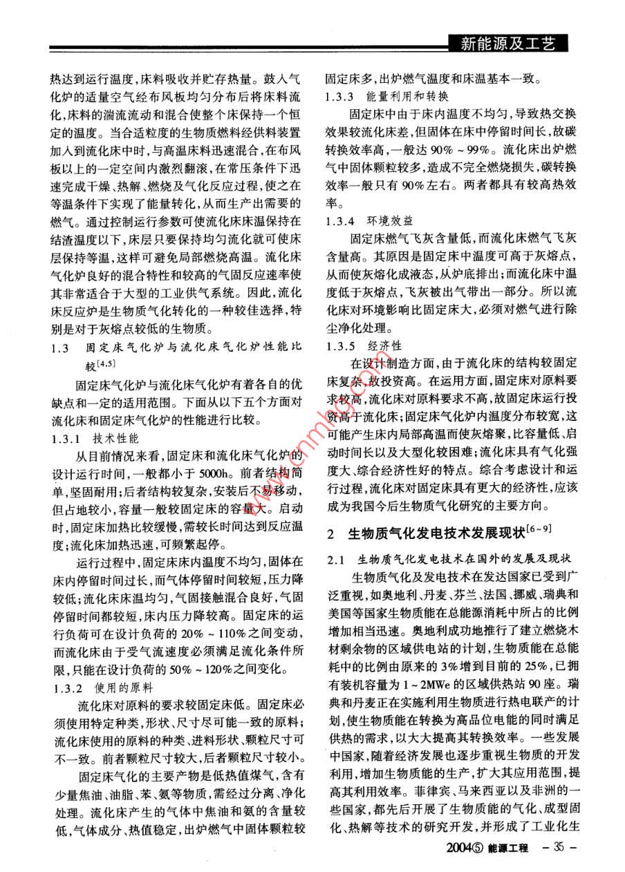新能源及工藝行條件,可以得到三種不同熱值的氣化產(chǎn)品氣:低流接著上升到還原層,將燃燒層生成的CO2還原熱值一-46MJ/m2(使 用空氣和蒸汽/空氣);中等成CO;氣化劑中的水蒸氣被分解,生成H2和CO。熱值12~ 18M]/m2(使用氧氣和蒸汽) ;高熱值這些氣體與氣化劑中未反應(yīng)部分一起繼續(xù)上升,-40MJ/m2(使用氫氣)。加熱上部的原料層,使原料層發(fā)生熱解,脫除揮發(fā)分,生成的焦炭落人還原層。生成的氣體繼續(xù)上1生 物質(zhì)氣化反應(yīng)爐升,將剛?cè)藸t的原料預(yù)熱、干燥后,進(jìn)入氣化爐上生物質(zhì)氣化按照使用的氣化爐類(lèi)型不同分為部,經(jīng)氣化爐氣體出口引出。固定床氣化和流化床氣化兩種。氣流床氣化對(duì)于9r生物質(zhì)人爐顆粒粒度要求細(xì)(一般要求小于0.4mm),對(duì)于生物質(zhì)而言,要滿(mǎn)足氣流床氣化的粒度要求還有許多技術(shù)經(jīng)濟(jì)難題需要解決。.1 生物質(zhì)固定床氣化爐固定床是--種傳統(tǒng)的氣化反應(yīng)爐,其運(yùn)行溫溫度分布去揮發(fā)分度在1000C左右。固定床氣化爐分為逆流式、并燃燒流式,如圖1、2所示。逆流式氣化爐是指氣化原料與氣化介質(zhì)在床中的流動(dòng)方向相反,而并流式氣化爐是指氣化原料與氣化介質(zhì)在床中的流動(dòng)方壓縮向相同。這兩種氣化爐按照氣化介質(zhì)的流動(dòng)方向1400 1000 600 200灰J不同又分別稱(chēng)為上吸式、下吸式氣化爐。下面對(duì)上圖2下吸式固定床生物質(zhì)氣化爐及其床內(nèi)溫度分布吸式固定床生物質(zhì)氣化爐的運(yùn)行工藝作簡(jiǎn)單介紹。1.2 流化床生物質(zhì)氣化爐流化床燃燒是一種先進(jìn)的燃燒技術(shù),應(yīng)用于生物質(zhì)生物質(zhì)燃燒上已獲得了成功[3] ,但用于生物質(zhì)氣化仍是一個(gè)新課題。與固定床相比,流化床沒(méi)有爐柵,一個(gè)簡(jiǎn)單的流化床由燃燒室、布風(fēng)板組成,干燥日焦油及煙氣氣化劑通過(guò)布風(fēng)板進(jìn)人流化床反應(yīng)器中。按氣固流動(dòng)特性不同,將流化床分為鼓泡流化床和循環(huán)流化床,如圖3所示。鼓泡流化床氣化爐中氣流速度相對(duì)較低,幾乎沒(méi)有固體顆粒從流化床中逸出。而循環(huán)流化床氣化爐中流化速度相對(duì)較高,從流化床中攜帶出的顆粒在通過(guò)旋風(fēng)分離器收集后重新送人爐內(nèi)進(jìn)行氣化反應(yīng)。↑燃?xì)獬隹趫D1上吸式固定床生物質(zhì)氣化爐及其床內(nèi)溫度分布.燃?xì)獬隹谠谏衔焦潭ù矚饣癄t中,生物質(zhì)原料從氣化爐上部的加料裝置送人爐內(nèi),整個(gè)料層由爐膛二次風(fēng)下部的爐柵支撐。氣化劑從爐底下部的送風(fēng)口進(jìn)人爐內(nèi),由爐柵縫隙均勻分布、并滲人料層底部區(qū)燃料域的灰渣層,氣化劑和灰渣進(jìn)行熱交換,氣化劑被T預(yù)熱,灰渣被冷卻。氣化劑隨后上升至燃燒層,在流化風(fēng)燃燒層,氣化劑和原料中的炭發(fā)生氧化反應(yīng),放出鼓泡流化床循環(huán)流化床大量的熱量,可使?fàn)t內(nèi)溫度達(dá)到1000C,這-部圖3兩種不同類(lèi) 型的流化床氣化爐分熱量可維持氣化爐內(nèi)的氣化反應(yīng)所需熱量。氣在生物質(zhì)氣化過(guò)程中,流化床首先通過(guò)外加- 34- ENERGY ENGINEERING 2004⑤」新能源及工藝熱達(dá)到運(yùn)行溫度,床料吸收并貯存熱量。鼓入氣固定床多,出爐燃?xì)鉁囟群痛矞鼗?致?;癄t的適量空氣經(jīng)布風(fēng)板均勻分布后將床料流1.3.3 能量利用和轉(zhuǎn)換化,床料的湍流流動(dòng)和混合使整個(gè)床保持--個(gè)恒固定床中由于床內(nèi)溫度不均勻,導(dǎo)致熱交換定的溫度。當(dāng)合適粒度的生物質(zhì)燃料經(jīng)供料裝置效果較流化床差,但固體在床中停留時(shí)間長(zhǎng),故碳加入到流化床中時(shí),與高溫床料迅速混合,在布風(fēng)轉(zhuǎn)換效率高,- -般達(dá)90% ~ 99%。流化床出爐燃板以上的一-定空間內(nèi)激烈翻滾,在常壓條件下迅氣中固體顆粒較多,造成不完全燃燒損失,碳轉(zhuǎn)換速完成干燥、熱解、燃燒及氣化反應(yīng)過(guò)程,使之在效率-般只有90%左右。兩者都具有較高熱效等溫條件下實(shí)現(xiàn)了能量轉(zhuǎn)化,從而生產(chǎn)出需要的率。燃?xì)?。通過(guò)控制運(yùn)行參數(shù)可使流化床床溫保持在1.3.4 環(huán)境效益結(jié)渣溫度以下,床層只要保持均勻流化就可使床固定床燃?xì)怙w灰含量低,而流化床燃?xì)怙w灰層保持等溫,這樣可避免局部燃燒高溫。流化床含量高。其原因是固定床中溫度可高于灰熔點(diǎn), .氣化爐良好的混合特性和較高的氣固反應(yīng)速率使從而使灰熔化成液態(tài),從爐底排出;而流化床中溫其非常適合于大型的工業(yè)供氣系統(tǒng)。因此,流化度低于灰熔點(diǎn),飛灰被出氣帶出一部分。所以流床反應(yīng)爐是生物質(zhì)氣化轉(zhuǎn)化的- - 種較佳選擇,特化床對(duì)環(huán)境影響比固定床大,必須對(duì)燃?xì)膺M(jìn)行除別是對(duì)于灰熔點(diǎn)較低的生物質(zhì)。塵凈化處理。1.3固定床氣化爐與流化床氣化爐性能比1.3.5 經(jīng)濟(jì)性較[4.5]在設(shè)計(jì)制造方面,由于流化床的結(jié)構(gòu)較固定固定床氣化爐與流化床氣化爐有著各自的優(yōu)床復(fù)雜,故投資高。在運(yùn)用方面,固定床對(duì)原料要缺點(diǎn)和一定的適用范圍。下面從以下五個