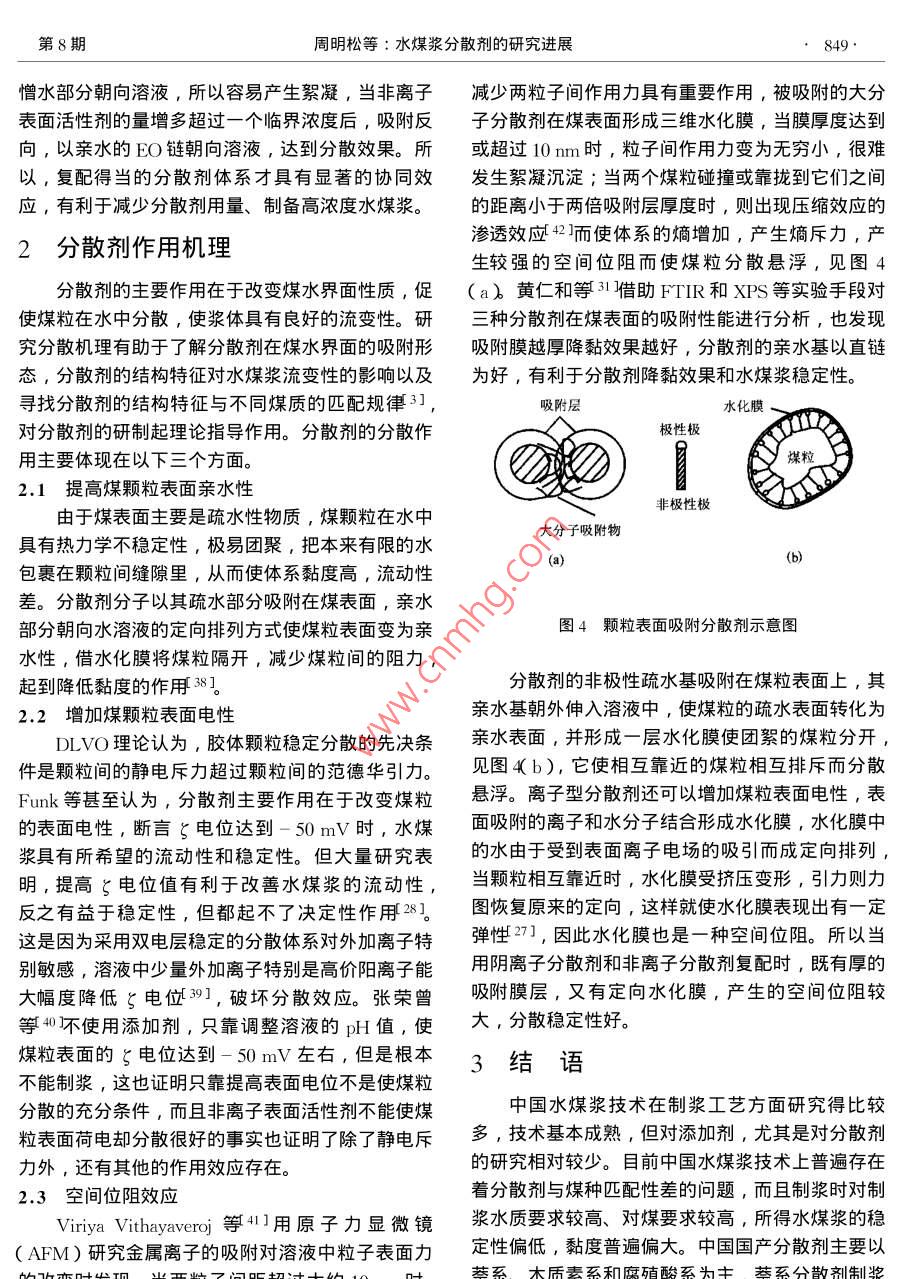 化進展846CHEMICAL INDUSTRY AND ENGINEERING PROGRESS2004年第23卷第8期水煤漿分散劑的研究進展周明松邱學(xué)青王衛(wèi)星華南理工大學(xué)化工學(xué)院,廣州510640)摘要對水煤漿工業(yè)中普遍使用的陰離子和非離子分散劑的種類作了介紹,簡要概括了其分散機理。并對水煤漿分散劑的研究開發(fā)與工業(yè)應(yīng)用前景作了展望。關(guān)鍵詞水煤漿,分散劑,分散機理,木質(zhì)素磺酸鹽中圖分類號TQ423;TQ53文獻標識碼A文章編號1000-6613(2004)8-0846-06中國是個富煤少油的國家,煤炭資源在中國能但是仍然存在著適用煤種范圍窄,成本較高的問源消費中占65%以上η。傳統(tǒng)的使用方法具有灰題。研制出性能價格比更高的新一代水煤漿分散渣多、污染大、運輸困難、燃燒發(fā)熱率不高等缺劑,將是今后一個時期水煤漿分散劑發(fā)展的關(guān)鍵。點,水煤漿技術(shù)則是針對這些缺點對煤炭資源進行深度加工、合理利用的重大改革。水煤漿是一種采1分散劑種類用物理方法將煤液態(tài)化的新型燃料,是由一定粒度分散劑是最重要的添加劑,它吸附在煤水界組成的煤約丌0%)水約30%廂和少量添加劑制面,降低漿的黏度,使之具有良好的流動性和流備而成。它既保持了煤炭原有的物理特征,又具有型6。分散劑種類主要有陰離子型、陽離子型和像石油一樣的流動性和穩(wěn)定性,被稱為液態(tài)煤炭產(chǎn)非離子型,常用的主要有陰離子型和非離子型品。近年來,由于煤炭資源豐富、價格便宜,水煤1.1陰離子型分散劑漿的加工方法又簡單,與煤炭的氣化、液化相比投1.1.1各類取代基萘磺酸鹽縮聚物資少、成本低21,作為代油燃料受到世界各國的各類取代基的萘磺酸鹽聚合物是目前水煤漿添普遍重視。加劑市場上使用最廣泛的產(chǎn)品。此類分散劑分散性具有工業(yè)應(yīng)用價值的水煤漿應(yīng)具有高濃度、低好、減黏作用強、漿流型好,但漿穩(wěn)定性差,容易黏度、良好的流動性及穩(wěn)定性。為達此目的,在煤析水產(chǎn)生硬沉淀,而且價格偏高。研究人員為了利水混合物中需添加適量的化學(xué)添加劑用萘系分散劑分散性好的優(yōu)點,克服其穩(wěn)定性差的制漿用添加劑主要有分散劑、穩(wěn)定劑和其他輔缺點,找出兩種解決思路。助藥劑,其中分散劑起關(guān)鍵作用。目前的水煤漿分(1)與其他類型分散劑或穩(wěn)定劑復(fù)配使用7散劑主要有萘系、腐殖酸系、木質(zhì)素系、聚烯烴例如用萘系分散劑與木質(zhì)磺酸鹽或直接與造紙廢液系、丙烯酸系以及相關(guān)復(fù)配產(chǎn)品。在水煤漿分散劑以一定比例復(fù)配,結(jié)果不但提高了漿的穩(wěn)定性,而的研制上,國外比較突出的有 Nippon油脂公司、且大大降低了成本8。用羧甲基纖維素(CMC)等Kao公司、Lin公哥3等,日本研究人員開發(fā)的一長鏈高分子作為穩(wěn)定劑,也可以提高漿的穩(wěn)定性系列性能優(yōu)良的分散劑如NSK萘磺酸鹽聚合物(2)與其他親水或憎水單體進行縮聚反應(yīng),得PS聚苯乙烯磺酸鹽作為水煤漿專用分散劑已經(jīng)到不同功能取代基的萘磺酸鹽縮聚物。 Tiwari等工業(yè)化生產(chǎn)。國內(nèi)不少企業(yè)和研究機構(gòu)都對水煤漿制得以萘一甲苯為主鏈的分散劑,可以使制漿濃度分散劑的研究做了很多工作,開發(fā)出很多具有競爭達到69%。沈鍵等⑩用萘、苯乙烯、馬來酸酐和力的產(chǎn)品,如迪昆精細化工公司側(cè)重于研究高效的甲醛進行縮聚磺化反應(yīng)制得NDF分散劑,化學(xué)結(jié)水煤漿分散劑,主要品種有CWF-15和wCS-構(gòu)式如圖1所示,制漿分散穩(wěn)定效果均好。AC。南京大學(xué)研究人員4開發(fā)的NDF適用煤種另外,調(diào)節(jié)分散劑的相對分子質(zhì)量也有助于提寬,性能好,占有大量的水煤漿添加劑市場。還有淮南礦業(yè)集團合成材料有限責(zé)任公司開發(fā)的HNF收稿日期2004-02-24;修改稿日期2004-05-09以同時兼顧水煤漿的分散性和穩(wěn)定性5。目前基金項目廣東省科技計劃項目No.2003A3030102作者簡介周明糍1980—),男,博士生。聯(lián)系人邱學(xué)青,教授第8期周明松等:水煤漿分散劑的研究進展847-,++CH CHn-散劑AC1320兒較,在投加量約為0.2%時就能NaOoCCOoNa出現(xiàn)漿黏度的突降,之后出現(xiàn)黏度平臺,見圖2。1.1.3聚羧酸系此類分散劑常用不飽和羧酸單體奴甲基炳烯酸、馬來酸鈉鹽和其他單體接枝共聚而成,例如用丙烯酸與木質(zhì)素磺酸鈉接枝共聚得到的接枝共聚物,對水煤漿具有分散和穩(wěn)定雙重作用151,其他還有丙烯酸與苯乙烯共聚物鈉鹽、丙烯酸與丙烯酰圖1NDF化學(xué)結(jié)構(gòu)式胺共聚物鈉鹽16等。昆迪精細化工公司生產(chǎn)的高水煤漿的成漿性和流動性,戴郁菁等⑩0發(fā)現(xiàn)相WCS-AC水煤漿分散劑是丙烯酸和丙烯腈的共聚對分子質(zhì)量太小的NDF對水煤漿的降黏作用不大物,化學(xué)結(jié)構(gòu)如圖3所示,它是一種高效的水煤漿隨著相對分子質(zhì)量的增大,NDF對水煤漿的降黏分散劑,可與酰胺類穩(wěn)定劑復(fù)配成高濃度、高穩(wěn)定作用逐漸明顯,NDF數(shù)均相對分子質(zhì)量在(1-2)性的水煤漿添加劑。使用結(jié)果顯示,其分散性、潤×10時降黏作用最好,隨著相對分子質(zhì)量的增濕性及動靜態(tài)穩(wěn)定性等性能基本相似于日本產(chǎn)添加大,水煤漿的表觀黏度增大,見表1。劑,某些性能甚至優(yōu)于日本