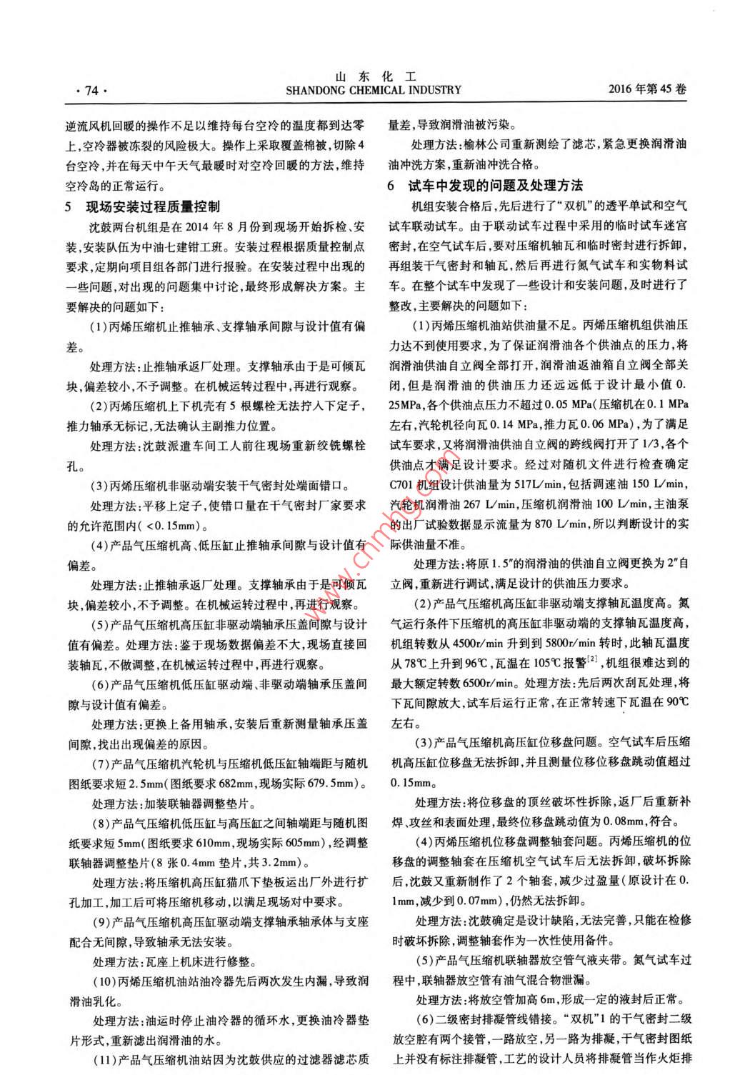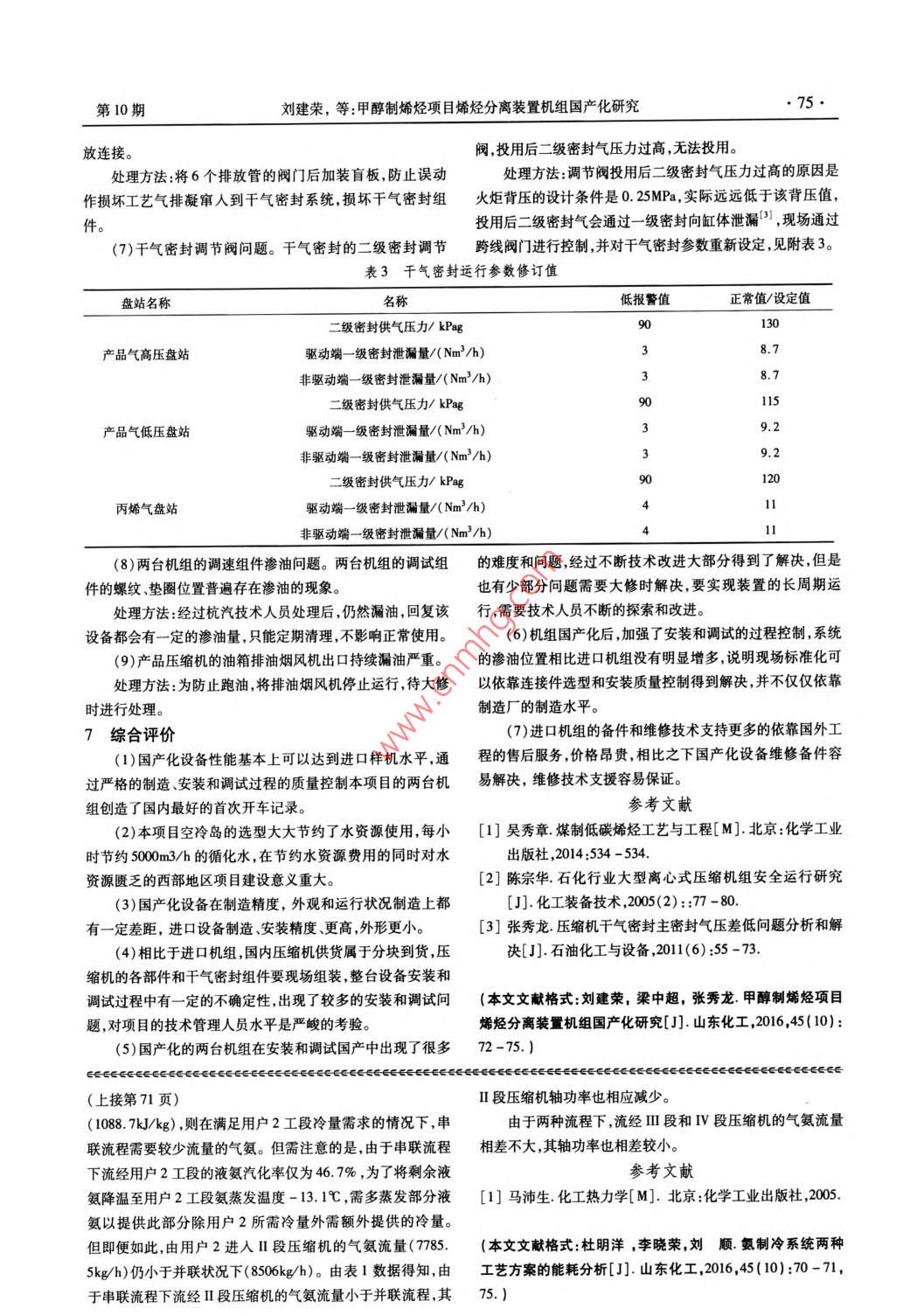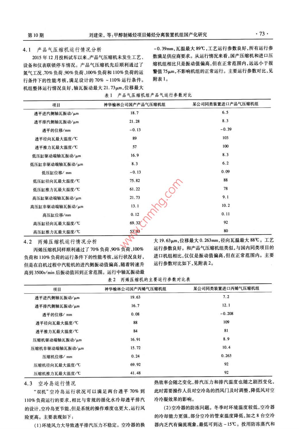 第10期劉建榮,等:甲醇制烯烴項(xiàng)目烯烴分離裝置機(jī)組國(guó)產(chǎn)化研究.●73●4.1 產(chǎn)品氣壓縮機(jī)運(yùn)行情況分析-0. 39mm,瓦溫最大89C ,工藝運(yùn)行參數(shù)良好,所有運(yùn)行參2015 年12月投料試車以來,產(chǎn)品氣壓縮機(jī)未發(fā)生工藝、數(shù)滿足供應(yīng)商要求。從運(yùn)行情況來看,國(guó)產(chǎn)壓縮機(jī)和進(jìn)口壓設(shè)備和儀表聯(lián)鎖停車情況。產(chǎn)品氣壓縮機(jī)先后順利通過了縮機(jī)組相比只是振動(dòng)值偏高,但在正常范圍內(nèi),遠(yuǎn)遠(yuǎn)小于報(bào)氮?dú)夤r、70%負(fù)荷.90%負(fù)荷、100%負(fù)荷和110%負(fù)荷的運(yùn)警值75μm ,不影響機(jī)組的正常運(yùn)行。主要運(yùn)行參數(shù)對(duì)比,見行條件下的性能考核,滿足設(shè)計(jì)的70% ~ 110%運(yùn)行條件。附表1。機(jī)組整體運(yùn)行情況良好,軸瓦振動(dòng)最大21.73μm,位移最大表1產(chǎn)品氣壓縮機(jī)組產(chǎn) 品氣運(yùn)行參數(shù)對(duì)比項(xiàng)目神華榆林公司國(guó)產(chǎn)產(chǎn)品氣壓縮機(jī)組某公司同類裝置進(jìn)口產(chǎn)品氣壓縮機(jī)組透平進(jìn)汽側(cè)軸瓦振動(dòng)/μm18.76.5透平排汽側(cè)軸瓦振動(dòng)/μm21.28.3透平的位移/ mm-0.13 .透平徑向瓦最大溫度/C03透平推力瓦最大溫度/Cs700低壓缸驅(qū)動(dòng)端軸瓦振動(dòng)/ um16.9低壓缸非驅(qū)動(dòng)端軸瓦振動(dòng)/μm8.3.2低壓缸位移/ mm-0.130.09低壓缸徑向瓦最大溫度/C75. 8288低壓缸推力瓦最大溫度/C61.2278高壓缸驅(qū)動(dòng)端軸瓦振動(dòng)/μm21.73.1高壓缸非驅(qū)動(dòng)端軸瓦振動(dòng)/μm13.110.2高壓缸位移/mm0.120.11高壓缸徑向瓦最大溫度/C69.32)2高壓缸推.力瓦最大溫度/心53. 83804.2丙烯壓縮機(jī)運(yùn)行情 況分析大I9.63μm,位移最大0. 263mm,徑向瓦溫最大88C。工藝丙烯壓縮機(jī)同樣順利通過了70%負(fù)荷.90%負(fù)荷、100%運(yùn)行參數(shù)良好。和產(chǎn)品氣壓縮機(jī)組類似,與國(guó)內(nèi)同類項(xiàng)目的負(fù)荷和110%負(fù)荷的運(yùn)行條件下的性能考核,運(yùn)行狀況良好,進(jìn)口機(jī)組相比,僅僅是振動(dòng)值偏高,但在正常范圍內(nèi)。主要但是在啟機(jī)過程中汽輪機(jī)的進(jìn)汽側(cè)振動(dòng)值偏高,隨著轉(zhuǎn)速升運(yùn)行參數(shù)對(duì)比如下,見附表2。高到3500/min后振動(dòng)值回到正常范圍。運(yùn)行中軸瓦振動(dòng)最表2丙烯壓縮機(jī)的主要運(yùn)行參 數(shù)對(duì)比表神華榆林公司國(guó)產(chǎn)丙烯氣壓縮機(jī)組某公司同類裝置進(jìn)口丙烯氣壓縮機(jī)組透平進(jìn)汽側(cè)軸瓦振動(dòng)/ um19.637.216.712. 10.08-0. 20809881壓縮機(jī)驅(qū)動(dòng)端軸瓦振動(dòng)/ um16.913.9壓縮機(jī)非驅(qū)動(dòng)端軸瓦振動(dòng)/μm15.7210.4壓縮機(jī)位移/ mm0.240. 263壓縮機(jī)徑向瓦最大溫度/C69.92 .92壓縮機(jī)推力瓦最大溫度/C41.484.3空冷 島運(yùn)行情況熱效率會(huì)隨之變化,排汽壓力和排汽溫度也隨之劇烈變化,“雙機(jī)”空冷島運(yùn)行狀況可以滿足兩臺(tái)透平70%到此時(shí)需要操作人員對(duì)空冷島的擋風(fēng)門及時(shí)調(diào)整,降低風(fēng)對(duì)空110%負(fù)荷運(yùn)行的要求,相比與常規(guī)的循化水冷卻透平排汽冷冷凝效果的影響。的設(shè)計(jì),空冷島更節(jié)能,但是系統(tǒng)的操作難度也更大,運(yùn)行風(fēng)(2)空冷器的防凍問題。冬季時(shí)環(huán)境溫度較低,空冷器險(xiǎn)更高。主要表現(xiàn)如下:的冷卻能力更強(qiáng),部分空冷的管束溫度降低,加之8臺(tái)空冷(1)環(huán)境風(fēng)力大導(dǎo)致透平排汽壓力不穩(wěn)定??绽淦鞯膿Q器內(nèi)乏汽有偏流現(xiàn)象,最低可到達(dá)- 15C。投用防凍蒸汽和第10期劉建榮,等:甲醇制烯烴項(xiàng)目烯烴分離裝置機(jī)組國(guó)產(chǎn)化研究●75●放連接。閥,投用后二級(jí)密封氣壓力過高,無法投用。處理方法:將6個(gè)排放管的閥門后加裝盲板,防止誤動(dòng)處理方法:調(diào)節(jié)閥投用后二級(jí)密封氣壓力過高的原因是作損壞工藝氣排凝竄人到干氣密封系統(tǒng),損壞干氣密封組火炬背壓的設(shè)計(jì)條件是 0. 25MPa,實(shí)際遠(yuǎn)遠(yuǎn)低于該背壓值,件投用后二級(jí)密封氣會(huì)通過一-級(jí)密封向缸體泄漏'1 ,現(xiàn)場(chǎng)通過(7)干氣密封調(diào)節(jié)閥問題。干氣密封的二級(jí)密封調(diào)節(jié)跨線閥門進(jìn)行控制,并對(duì)干氣密封參數(shù)重 新設(shè)定,見附表3。表3干氣密封運(yùn)行參數(shù)修訂值盤站名稱名低報(bào)警值正常值/設(shè)定值二級(jí)密封供氣壓力/ kPag930產(chǎn)品氣高壓盤站驅(qū)動(dòng)端- -級(jí)密封泄漏量/( Nm?/h)8.7非驅(qū)動(dòng)端- -級(jí)密封泄漏量/( Nm2/h)315產(chǎn)品氣低壓盤站驅(qū)動(dòng)端一級(jí)密封泄漏量/( Nm2/h).2非驅(qū)動(dòng)端一級(jí)密封泄漏量/( Nm2/h)9.29020丙烯氣盤站非驅(qū)動(dòng)端-級(jí)密封泄漏量/( Nm'/h)1(8)兩臺(tái)機(jī)組的調(diào)速組件滲油問題。兩臺(tái)機(jī)組的調(diào)試組的難度 和問題,經(jīng)過不斷技術(shù)改進(jìn)大部分得到了解決,但是件的螺紋、墊圈位置普遍存在滲油的現(xiàn)象。也有少部分問題需要大修時(shí)解決,要實(shí)現(xiàn)裝置的長(zhǎng)周期運(yùn)處理方法:經(jīng)過杭汽技術(shù)人員處理后,仍然漏油,回復(fù)該行,需