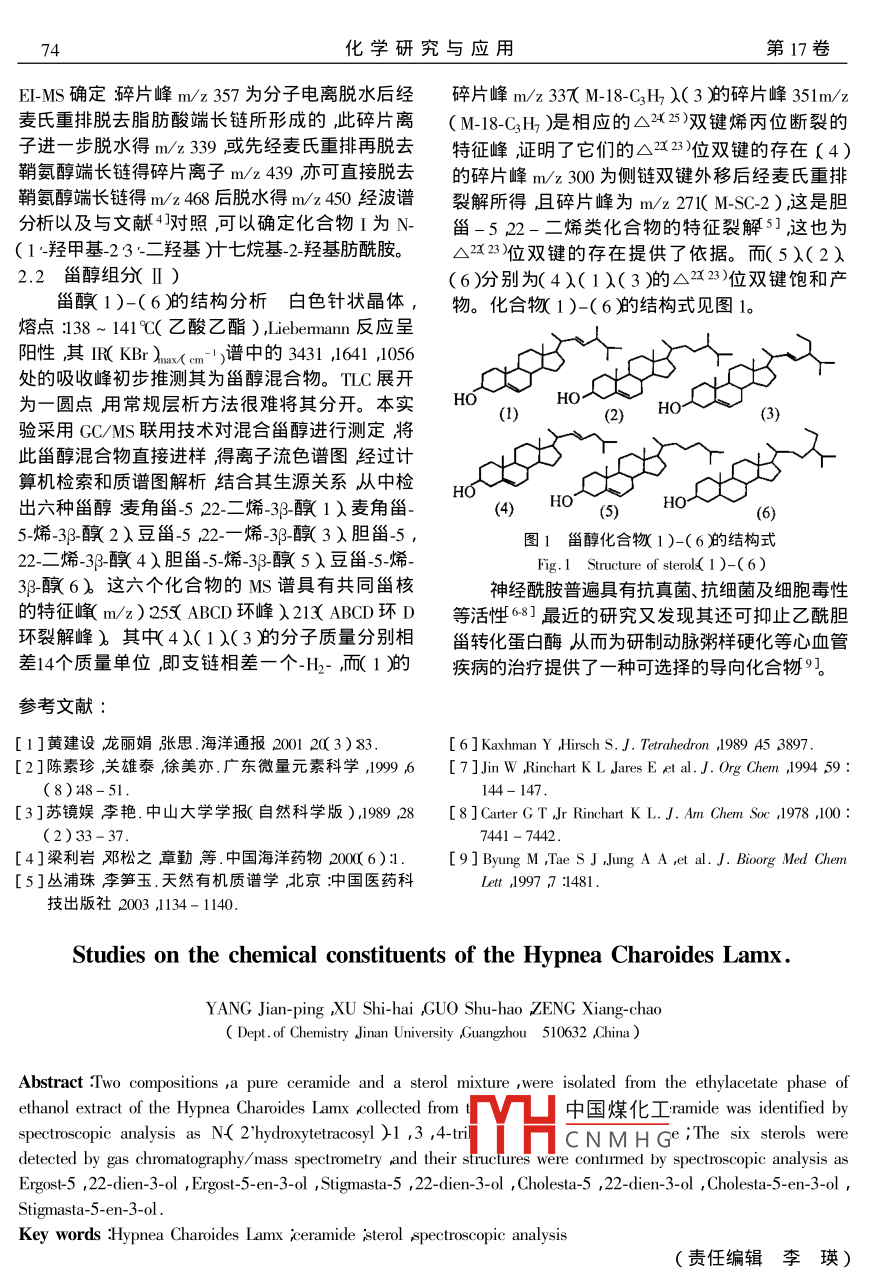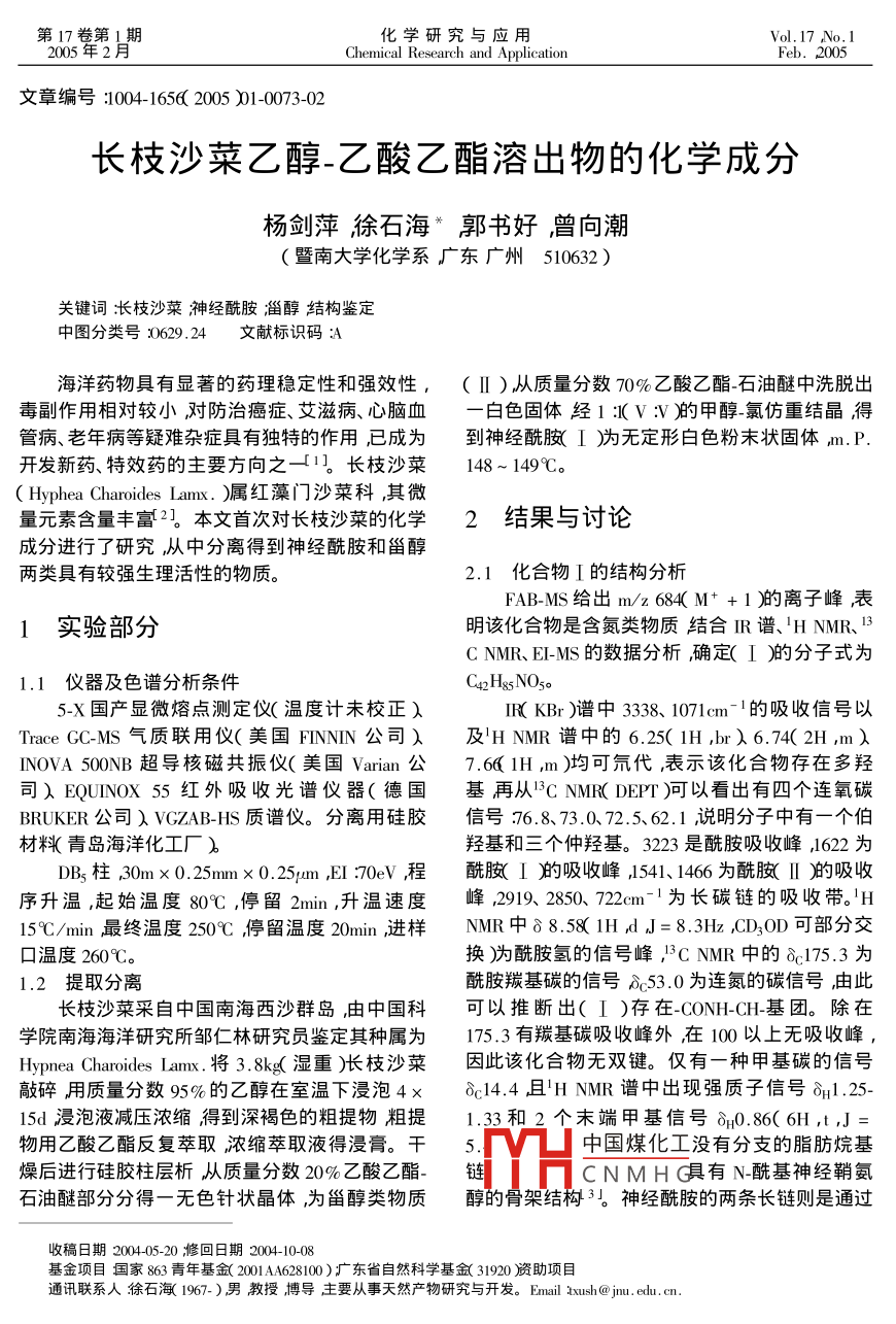 第17卷第1期化學(xué)研究與應(yīng)用Vol. 17 No2005年2Chemical Research and ApplicationFeb.2005文章編號:1004-16562005)10073-02長枝沙菜乙醇-乙酸乙酯溶出物的化學(xué)成分楊劍萍狳石海*郭書好曾向潮(暨南大學(xué)化學(xué)系廣東廣州510632)關(guān)鍵詞:枝沙菜神經(jīng)酰胺淄醇結(jié)構(gòu)鑒定中圖分類號629,24文獻(xiàn)標(biāo)識碼:A海洋藥物具有顯著的藥理穩(wěn)定性和強(qiáng)效性,(Ⅱ)從質(zhì)量分?jǐn)?shù)η0%乙酸乙酯-石油醚中洗脫出毒副作用相對較小對防治癌癥、艾滋病、心腦血一白色固體經(jīng)1:V∶)的甲醇-氯仿重結(jié)晶得管病、老年病等疑難雜癥具有獨(dú)特的作用已成為到神經(jīng)酰(Ⅰ)無定形白色粉末狀固體m.P開發(fā)新藥、特效藥的主要方向之一1長枝沙菜148~149℃。Hyphea Charoides Lam.)屬紅藻門沙菜科,其微量元素含量豐富2本文首次對長枝沙菜的化學(xué)2結(jié)果與討論成分進(jìn)行了研究隊(duì)從中分離得到神經(jīng)酰胺和甾醇兩類具有較強(qiáng)生理活性的物質(zhì)2.1化合物Ⅰ的結(jié)構(gòu)分析FAB-MS給出m/z684M++1)的離子峰表1實(shí)驗(yàn)部分明該化合物是含氮類物質(zhì)結(jié)合IR譜、HNMR、3CNMR、EI-MS的數(shù)據(jù)分析確定(I)的分子式為1.1儀器及色譜分析條件Caz h&s noso5-X國產(chǎn)顯微熔點(diǎn)測定儀(溫度計(jì)未校正)IR( KBr)譜中3381071cm-1的吸收信號以ace GC-Ms氣質(zhì)聯(lián)用儀(美國 FINNIN公司)及HNMR譜中的6.25(1H,br)6.74(2H,m)INOVA500NB超導(dǎo)核磁共振儀(美國 Varian公7.6lHm)均可氘代表示該化合物存在多羥司) EQUINOX5紅外吸收光譜儀器(德國基再從 C NMR( DEI)可以看出有四個(gè)連氧碳BRUKER公司ⅤGZAB-HS質(zhì)譜儀。分離用硅膠信號:76.8、73.072.5、62.1說明分子中有一個(gè)伯材料(青島海洋化工廠)羥基和三個(gè)仲羥基。3223是酰胺吸收峰,1622為〕B3柱30m×0.25m×0.25/m,EI:70eV程酰胺Ⅰ舶吸收峰541、1466為酰胺Ⅱ吸收序升溫,起始溫度80℃,停留2min,升溫速度峰,2919、2850、722cm1為長碳鏈的吸收帶。H15℃/min最終溫度250℃,停留溫度20min,進(jìn)樣NMR中88.1HdJ=8.3HzCD3OD可部分交口溫度260℃C換)酰胺氫的信號峰"CNMR中的?175.3為提取分離酰胺羰基碳的信號δ53.0為連氮的碳信號由此長枝沙菜采自中國南海西沙群島由中國科可以推斷出(Ⅰ)存在 CONH-CH基團(tuán)。除在學(xué)院南海海洋硏究所鄒仁林研究員鑒定其種屬為175.3有羰基碳吸收峰外在10以上無吸收峰Hypnea Charoides Lam將3.8k濕重)枝沙菜因此該化合物無雙鍵。僅有一種甲基碳的信號敲碎用質(zhì)量分?jǐn)?shù)95%的乙醇在室溫下漫泡4×8c14.4且HNMR譜中出現(xiàn)強(qiáng)質(zhì)子信號δ1.255d浸泡液減壓濃縮得到深褐色的粗提物粗提1.33和2個(gè)末端甲基信號?0.86(6H,t,J物用乙酸乙酯反復(fù)萃取濃縮萃取液得漫膏。干5「V凵中國煤化工沒有分支的脂肪烷基燥后進(jìn)行硅膠柱層析從質(zhì)量分?jǐn)?shù)20%乙酸乙酯-鏈CNMH具有N-?;窠?jīng)鞘氨石油醚部分分得一無色針狀晶體,為甾醇類物質(zhì)醇的骨架結(jié)構(gòu)3。神經(jīng)酰胺的兩條長鏈則是通過枚稿日期200405-20修回日期2004-10-08基金項(xiàng)目國家863青年基金100)疒東省自然科學(xué)基金31920資助項(xiàng)目通訊聯(lián)系人狳石海1967-)男教授博導(dǎo)主要從事天然產(chǎn)物研究與開發(fā)。 Email smush@j.edu.cm.74化學(xué)研究與應(yīng)用第17卷E-MS確定碎片峰mz357為分子電離脫水后經(jīng)碎片峰m/z33M-18-CHλ(3舶碎片峰351m/麥?zhǔn)现嘏琶撊ブ舅岫碎L鏈所形成的,此碎片離(M-18-CH)是相應(yīng)的△(25)雙鍵烯丙位斷裂的子進(jìn)一步脫水得m/z39或先經(jīng)麥?zhǔn)现嘏旁倜撊ヌ卣鞣遄C明了它們的△x2位雙鍵的存在(4)鞘氨醇端長鏈得碎片離子m/z439亦可直接脫去的碎片峰m/z300為側(cè)鏈雙鍵外移后經(jīng)麥?zhǔn)现嘏徘拾贝级碎L鏈得m468后脫水得m/z450經(jīng)波譜裂解所得且碎片峰為m/z27I(MsC.2)這是膽分析以及與文獻(xiàn)對照可以確定化合物I為N甾-522-二烯類化合物的特征裂解5]這也為1·羥甲基-2③二羥基汁七烷基-2-羥基肪酰胺?!?3位雙鍵的存在提供了依據(jù)。而(5)(2)2.2甾醇組分Ⅱ)(6)分別為(4)(1)(3)的△223)位雙鍵飽和產(chǎn)甾醭1)-(6舶的結(jié)構(gòu)分析白色針狀晶體,物。化合物1)-(6的結(jié)構(gòu)式見圖1熔點(diǎn):138~141℃(乙酸乙酯) liebermann反應(yīng)呈陽性其IKBr)(m-)譜中的343116411056處的吸收峰初步推測其為甾醇混合物。TC展開為一圓點(diǎn)用常規(guī)層析方法很難將其分開。本實(shí)H0驗(yàn)采用GC/MsS聯(lián)用技術(shù)對混合甾醇進(jìn)行測定將此甾醇混合物直接進(jìn)樣得離子流色譜圖經(jīng)過計(jì)算機(jī)檢索和質(zhì)譜圖解析結(jié)合其生源關(guān)系從中檢出六種甾醇麥角甾-522-二烯3-醇1)麥角甾(4)HO5-烯-38-2)豆甾-52-烯-3暾3)膽甾5,圖1甾醇化合物1)-(6)結(jié)構(gòu)式22-二烯-3-醇4)膽甾5-烯-39-醇5)豆甾5-烯3-6)這六個(gè)化合物的Ms譜具有共同甾核神經(jīng)酰胺普遍具有抗真菌、抗細(xì)菌及細(xì)胞毒性的特征峰m/z)25KABD環(huán)峰λ21孑ABCD環(huán)D等活性68]最近的研究又發(fā)現(xiàn)其還可抑止乙酰膽環(huán)裂解峰)其中4(1)(3的分子質(zhì)量分別相甾轉(zhuǎn)化蛋白酶從而為研制動脈粥樣硬化等心血管差14個(gè)質(zhì)量單位即支鏈相差一個(gè)-H2-而1舶的疾病的治療提供了一種可選擇的導(dǎo)向化合物”參考文獻(xiàn)[Ⅰ]黃建設(shè)龍麗娟漲