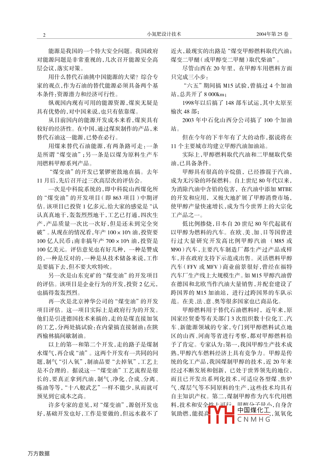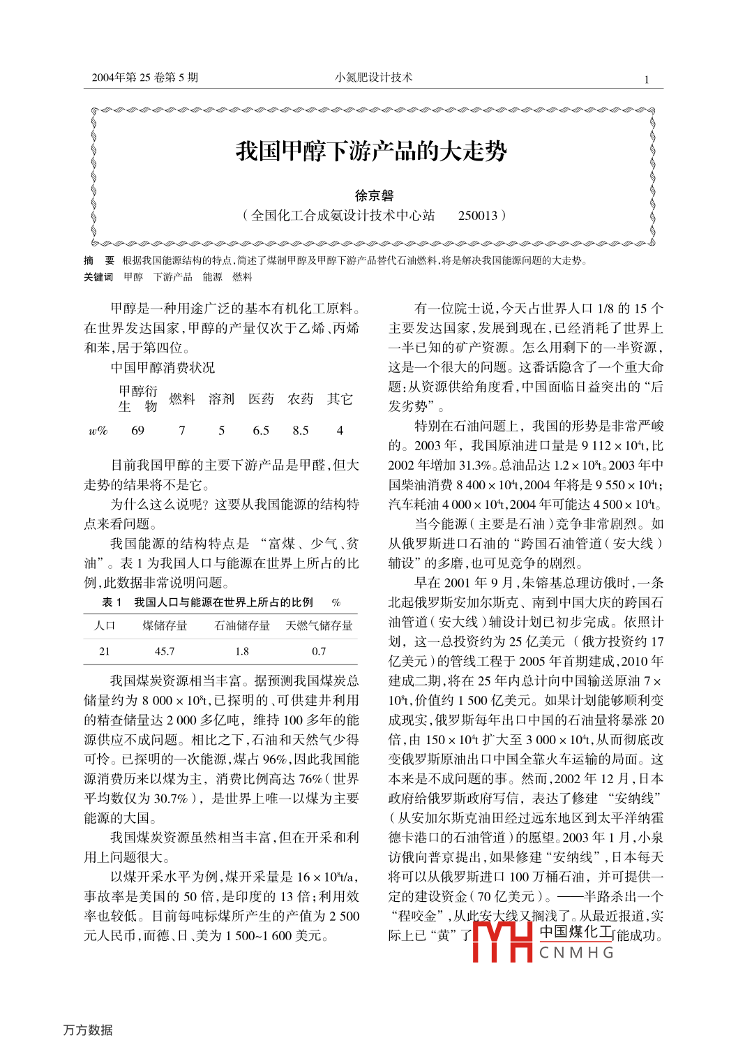 204年第25卷第5期小氮肥設計技術我國甲醇下游產(chǎn)品的大走勢徐京磐(全國化工合成氨設計技術中心站250013)分必、、必小、必必分必分必、小少小必小少少必分必必必辦摘要根據(jù)我國能源結構的特點,簡述了煤制甲醇及甲醇下游產(chǎn)品替代石油燃料,將是解決我國能源問題的大走勢。關鍵詞甲醇下游產(chǎn)品能源燃料甲醇是一種用途廣泛的基本有機化工原料有一位院士說,今天占世界人口1/8的15個在世界發(fā)達國家,甲醇的產(chǎn)量僅次于乙烯、丙烯主要發(fā)達國家,發(fā)展到現(xiàn)在,已經(jīng)消耗了世界上和苯,居于第四位半已知的礦產(chǎn)資源。怎么用剩下的一半資源中國甲醇消費狀況這是一個很大的問題。這番話隱含了一個重大命甲醇份燃料溶劑醫(yī)藥農(nóng)藥其它題:從資源供給角度看,中國面臨日益突出的后生物發(fā)劣勢756.58.5特別在石油問題上,我國的形勢是非常嚴峻的。2003年,我國原油進口量是9112×10t,比目前我國甲醇的主要下游產(chǎn)品是甲醛,但大2002年增加313%??傆推愤_1.2×10%t。2003年中走勢的結果將不是它。國柴油消費8400×10t,2004年將是9550×10t;為什么這么說呢?這要從我國能源的結構特汽車耗油4000×10t,2004年可能達4500×10t。點來看問題。當今能源(主要是石油)競爭非常劇烈。如我國能源的結構特點是“富煤、少氣、貧從俄羅斯進口石油的“跨國石油管道(安大線)油”。表1為我國人口與能源在世界上所占的比輔設”的多磨,也可見競爭的劇烈例,此數(shù)據(jù)非常說明問題。早在2001年9月,朱镕基總理訪俄時,一條表1我國人口與能源在世界上所占的比例%北起俄羅斯安加爾斯克、南到中國大慶的跨國石人口煤儲存量石油儲存量天燃氣儲存量油管道(安大線)輔設計劃已初步完成。依照計劃,這一總投資約為25億美元(俄方投資約1745.70.7億美元)的管線工程于2005年首期建成,2010年我國煤炭資源相當豐富。據(jù)預測我國煤炭總建成二期,將在25年內(nèi)總計向中國輸送原油7×儲量約為8000×10%,已探明的、可供建井利用10%t,價值約1500億美元。如果計劃能夠順利變的精查儲量達2000多億噸,維持100多年的能成現(xiàn)實,俄羅斯每年出口中國的石油量將暴漲20源供應不成問題。相比之下,石油和天然氣少得倍,由150×10t擴大至3000×10t,從而徹底改可憐。已探明的一次能源,煤占%6%,因此我國能變俄羅斯原油出口中國全靠火車運輸?shù)木置?。這源消費歷來以煤為主,消費比例高達76%(世界本來是不成問題的事。然而,2002年12月,日本平均數(shù)僅為30.7%),是世界上唯一以煤為主要政府給俄羅斯政府寫信,表達了修建“安納線”能源的大國。(從安加爾斯克油田經(jīng)過遠東地區(qū)到太平洋納霍我國煤炭資源雖然相當豐富,但在開采和利德卡港口的石油管道)的愿望。2003年1月,小泉用上問題很大訪俄向普京提出,如果修建“安納線”,日本每天以煤開采水平為例,煤開采量是16×10%/a,將可以從俄羅斯進口100萬桶石油,并可提供事故率是美國的50倍,是印度的13倍;利用效定的建設資金(70億美元)。—半路殺出一個率也較低。目前每噸標煤所產(chǎn)生的產(chǎn)值為2500“程咬金”,從此安大線又擱淺了。從最近報道,實元人民幣,而德、日、美為1500~1600美元。際上已“黃”了中國煤化工能成功。CNMHG小氮肥設計技術2004年第25卷能源是我國的一個特大安全問題。我國政府近火,最現(xiàn)實的出路是“煤變甲醇燃料取代汽油;對能源問題是非常重視的,幾次召開能源安全髙煤變二甲醚(或甲醇變二甲醚)取代柴油”層會議,落實對策。盡管山西在20年里,在甲醇車用燃料方面用什么替代石油挑中國能源的大梁?綜合專只完成三小步家的觀點,作為石油的替代能源必須具備兩個基六五”期間搞M15試驗,曾搞過4個加油本條件:資源潛力和經(jīng)濟可行性。站,總共開了8000km;縱觀國內(nèi)現(xiàn)有可用的能源資源,煤炭無疑是1998年以后搞了148部車試運,其中太原至具有優(yōu)勢的,對中國來說,也只有依靠煤榆次48部;從目前國內(nèi)的能源開發(fā)成本來看,煤炭具有2003年中石化山西分公司搞了100個加油較好的經(jīng)濟性。在中國,通過煤炭制作的產(chǎn)品,來站。替代石油這一能源,已勢在必行。但在今年的下半年有了大的動作,據(jù)說將在用煤來替代石油能源,有兩條路可走:一條11個主要城市均建立甲醇汽油加油站。是所謂“煤變油”;另一條是以煤為原料生產(chǎn)車實際上,甲醇燃料取代汽油和二甲醚取代柴用燃料甲醇系列產(chǎn)品。油,已具備條件。煤變油”的開發(fā)已緊鑼密鼓地在搞。去年甲醇具有很高的辛烷值,已經(jīng)摻混于汽油11月后,先后召開過三次高層次的評估會。成為無污染的環(huán)保燃料。自上世紀80年代以來,次是中科院系統(tǒng)的,即中科院山西煤化所為消除汽油中含鉛的危害,在汽油中添加MTBE的“煤變油”的開發(fā)項目(即863項目)中期評的開發(fā)和應用,又極大地擴展了甲醇消費市場,估。該項目已投資1億多元,給大家的感覺是“認使甲醇產(chǎn)量快速增長,成為當今世界上的大宗化認真真地干,轟轟烈烈地干,工藝已打通,四次生工產(chǎn)品之產(chǎn),產(chǎn)品質(zhì)量一次比一次好,但是還未到完全突低比例摻燒,日本自20世紀80年代起就有破”。從現(xiàn)在的情況看,年產(chǎn)100×10油,投資要以甲醇為燃料的汽車。在歐、