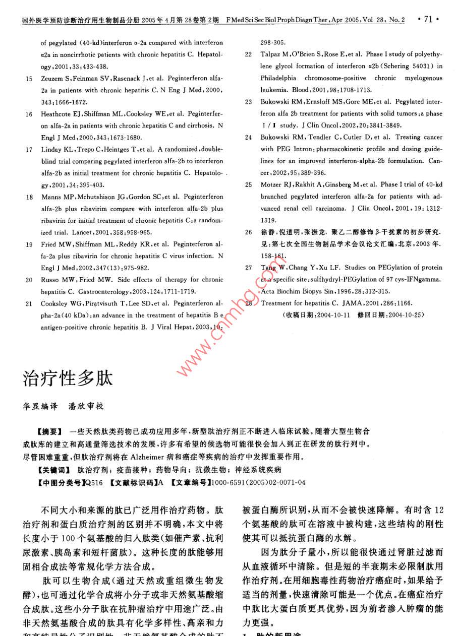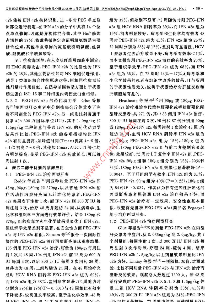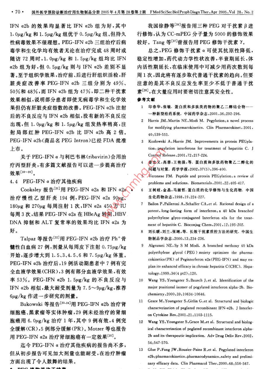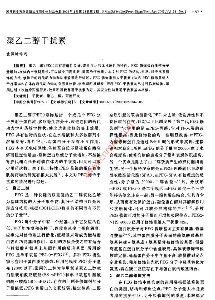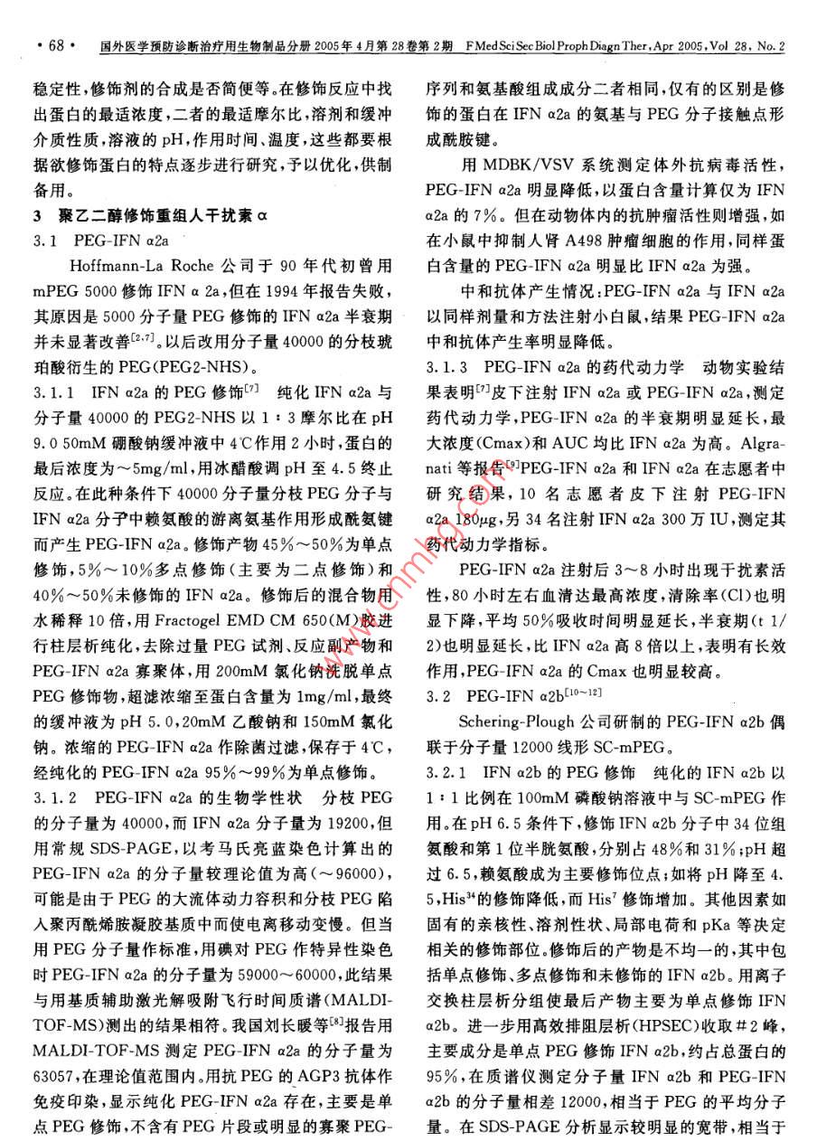 國外醫(yī)學(xué)預(yù)防診斷治療用生物制品分冊2005年4月第28卷第2期 FMed Sci See Biol Proph Diagn Ther.,Apr200vol28,No.2·67·聚乙二醇干擾素童葵塘綜述【摘要】聚乙二醇(PEG)具有溶解性良好、毒性很小和無抗原性的特性。PEG修飾蛋白質(zhì)使分子量增加,在體內(nèi)半衰期延長,可以減少用藥次數(shù),提高治療效果。本文對PEG的結(jié)構(gòu)、性狀、對干擾素修飾的方法、修飾后的藥代動力學(xué)和臨床效果進(jìn)行綜述。PEG修飾重組人干擾素a2a和PEG修飾重組人干擾素a2b在體內(nèi)藥代動力學(xué)均有明顯改善,半衰期明顯延長。兩種PEG干擾素均已進(jìn)行臨床試驗。每周注射1次治療丙型肝炎,效果明顯較普通干擾素為好。其安全性與普通干擾素基本相似?!娟P(guān)鍵詞】干擾素;聚乙二醇;丙型肝炎【中圖分類號R978.7【文獻(xiàn)標(biāo)識碼】A【文章編號】0006591(2005)02-0067-05聚乙二醇(PEG)修飾是指一個或幾個PEG分雜質(zhì)引起的雙功能活化PEG未去除;低選擇性和不子吸附于蛋白質(zhì)、多肽等生物分子,改進(jìn)它們的藥代良反應(yīng)的存在。針對以上問題發(fā)展了第二代PEG修動力學(xué)和藥效學(xué)性狀,使之達(dá)到較好的臨床效果。飾劑34,常用的是mPEG丙醛,它對N-末端的選PEG具有獨特的性狀,它在水溶液和大多數(shù)溶劑中擇性很高,因此修飾物的均一性明顯改善,mPEG-溶解良好,毒性很小,對蛋白分子沒有不良作用。丙醛修飾蛋白是通過 Schiff堿的形式來實現(xiàn),連接PEG本身無免疫原性,能使蛋白質(zhì)不易被蛋白酶降鍵相對穩(wěn)定。所用mPEG的分子量為20000,由于水解而穩(wěn)定性增加,修飾蛋白質(zhì)使分子量增加,不易被合程度高使修飾物的表觀分子量和表觀體積提高。腎臟代謝而延長藥物在體內(nèi)的半衰期,因此可以減另一個優(yōu)點是除去了由二醇雜質(zhì)產(chǎn)生的雙功能團(tuán)衍少用藥次數(shù)。由于以上特性,PEG修飾的蛋白和多生物。另一個值得注意的是mPEG-丙醛轉(zhuǎn)化為琥珀肽類藥物的研究有很大發(fā)展。本文對PEG修飾干酰亞胺酯活化酯(SPA)。 mPEG-SPA有較理想的反擾素的情況進(jìn)行綜述。應(yīng)性,分子量為20000,二醇含量<1%。分枝形1聚乙二醇mPEG或PEG2是二個線形mPEG通過一個三功PEG是一種長鏈的以重復(fù)的乙二醇氧化乙烯能接頭使之連在一起,另一端和蛋白結(jié)合它具有傘為基礎(chǔ)結(jié)構(gòu)的大分子聚合物,其分子結(jié)構(gòu)可以是線形,從而更有效保護(hù)蛋白,避免蛋白酶對其酶解作用形或分枝形,根據(jù)(OCH2CH2)數(shù)目的不同而有不同和接觸抗體,還可以減少異構(gòu)體的產(chǎn)生(5,分枝的分子量]。PEG修飾可增加分子量而不增加吸附位點。PEG2-PEG每個分子中有一個羥基,由于它反應(yīng)活性NHS40000已用于修飾重組人干擾素a2a低,為了能在溫和條件下,以較高速率與蛋白偶聯(lián),蛋白質(zhì)分子與PEG偶聯(lián)基團(tuán)主要有氨基、巰基應(yīng)事先對修飾劑進(jìn)行活化使羥基末端成為能與蛋與羧基~6,其中蛋白質(zhì)分子表面的賴氨酸殘基的白表面功能基團(tuán)作用。常用的方法是使之帶有適合氨基包括a氨基或e氨基是常被修飾的基團(tuán),但游與賴氨酸和氨基末基團(tuán)作用的反應(yīng)基團(tuán),所用的離氨基在蛋白質(zhì)分子中含量較高,具體被修飾部位PEG是單甲氧基PEG(mPEG)1。多種PEG衍生較難定位。巰基蛋白分子中含量不高較易做到定點物已應(yīng)用于蛋白質(zhì)的修飾,所用的線性PEG分子量定量修飾羧基修飾首先把PEG分子中羥基轉(zhuǎn)化為在12000以下,常用的二種為單甲氧基聚乙二醇琥氨基,再在羰二亞胺存在下與蛋白質(zhì)的羧基結(jié)合珀酸琥珀酰亞胺酯( SS-mPEG)和單甲氧基甲酸琥2聚乙二醇修飾方法珀酰亞胺酯(SC-mPEG)。存在的問題是修飾劑的分在PEG修飾中修飾劑的選用要根據(jù)被修飾蛋子量偏低;PEG和蛋白的交聯(lián)較弱穩(wěn)定性差;二醇的類型、結(jié)構(gòu)和修飾位點,PEG分子量大小是要考慮的重要性狀,此外如修飾劑的質(zhì)量、水解穩(wěn)定68·國外醫(yī)學(xué)預(yù)防診斷治療用生物制品分冊200年4月第28卷第2期 FMed Sci Sec Biol Proph Diagn Ther.,Ap200o28,No.2穩(wěn)定性,修飾劑的合成是否簡便等。在修飾反應(yīng)中找序列和氨基酸組成成分二者相同,僅有的區(qū)別是修出蛋白的最適濃度,二者的最適摩爾比,溶劑和緩沖飾的蛋白在IFNa2a的氨基與PEG分子接觸點形介質(zhì)性質(zhì),溶液的pH,作用時間、溫度,這些都要根成酰胺鍵。據(jù)欲修飾蛋白的特點逐步進(jìn)行研究,予以優(yōu)化,供制用MDBK/VSV系統(tǒng)測定體外抗病毒活性,備用。PEG-IFn a2a明顯降低,以蛋白含量計算僅為IFN3聚乙二醇修飾重組人干擾素aa2a的7%。但在動物體內(nèi)的抗腫瘤活性則增強,如3.1 PEG-IFn a2a在小鼠中抑制人腎A498腫瘤細(xì)胞的作用,同樣蛋Hoffmann- La roche公司于90年代初曾用含量的PEG-IFNa2a明顯比IFNa2a為強。mPEG5000修飾IFNa2a,但在194年報告失敗,中和抗體產(chǎn)生情況: PEG-IFn a2a與IFNa2a其原因是5000分子量PEG修飾的IFNa2a半衰期以同樣劑量和方法注射小白鼠,結(jié)果 PEG-IFN a2a并未顯著改善2l。以后改用分子量40000分枝琥中和抗體產(chǎn)生率明顯降低。珀酸衍生的PEG(PEG2-NHS)。3.1.3 PEG-IFN a2a的藥代動力學(xué)動物實驗結(jié)3.1.1IFNa2a的PEG修飾純化IFNa2a與果表明皮下注射IFNa2a或 PEG-IFN a2a,測定分