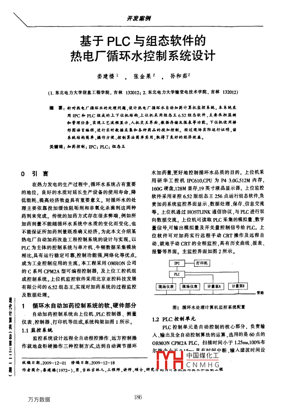 開發(fā)案例基于PLC與組態(tài)軟件的熱電廠循環(huán)水控制系統(tǒng)設(shè)計婁建樓張金果孫和茹(1.東北電力大學(xué)信息工程學(xué)院,吉林13012;2東北電力大學(xué)輸變電技術(shù)學(xué)院吉林132012)要:針對熱電廠循環(huán)水的處理問題設(shè)計熱電廠循壞水自動加藥計算機監(jiān)控系統(tǒng)。本系魷用IPC和PLC組咸的上下位機結(jié)構(gòu)上位機采用組態(tài)王652組態(tài)軟件,主要承擔(dān)監(jiān)測和管理任務(wù),實現(xiàn)工藝流程顯示、人機交互界面、數(shù)據(jù)存儲及報表等功能。下位機使用梯形圖語言編程,進(jìn)行實時數(shù)據(jù)采集和各種藥品的投加控制。經(jīng)過現(xiàn)場實際運行證明,該系魷結(jié)構(gòu)簡單、操作方便、控制算法簡單實用,取得了良好的經(jīng)濟(jì)效益關(guān)鍵詞:加藥控制;IPC;PLC;組態(tài)王0引曹水加藥量更好地控制循環(huán)水品質(zhì)的目的。上位機采在熱力發(fā)電的生產(chǎn)過程中循環(huán)水系統(tǒng)占有重要用研華工控機PC610CPU為P430512M內(nèi)存的地位,良好的水質(zhì)對延長生產(chǎn)設(shè)備的使用壽命降160G硬盤128M顯存,19英寸液晶顯示器。上位監(jiān)控軟件采用亞控652版組態(tài)王256點運行組態(tài)軟件負(fù)低能耗,提高經(jīng)濟(jì)效益具有重要意義。對循環(huán)水的處理主要依靠投加緩蝕阻垢劑和非氧化殺菌劑這兩種責(zé)加藥系統(tǒng)監(jiān)控界面顯示數(shù)據(jù)處理、保存、信息交流藥劑來完成。傳統(tǒng)的加藥方式存在很多弊端,例如所等。上位機通過 HOSTLINK通信協(xié)議,與PLC進(jìn)行雙向數(shù)據(jù)交流。上位機可讀取PC采集的模擬量數(shù)字加藥劑量不能隨循環(huán)水系統(tǒng)中水質(zhì)的變化而變化,也不能保證所加藥劑量既準(zhǔn)確又經(jīng)濟(jì)。為此本文介紹某量信號可輸出模擬量及開關(guān)量控制信號給PC。上熱電廠自動加藥改造工程控制系統(tǒng)的設(shè)計與實現(xiàn)。以位軟件可對加藥實行遠(yuǎn)程手動CRT操作及遠(yuǎn)程自PLC為主體的控制系統(tǒng)與單片機、牛頓數(shù)據(jù)采集模塊動、就地手動CRT的全程監(jiān)控,具有歷史曲線、報表、相比具有運行穩(wěn)定可靠控制功能強網(wǎng)絡(luò)化等優(yōu)點報警等界面。主監(jiān)控界面如圖2所示成為工業(yè)控制應(yīng)用的主流。本工程采用 OMRON公司c][打印機的C系列CPM2A型可編程控制器,及上位工控機組成控制系統(tǒng)。上位機監(jiān)控軟件采用北京亞控科技發(fā)展有限公司的652組態(tài)王,實現(xiàn)對加藥系統(tǒng)的過程監(jiān)控現(xiàn)場儀表]「現(xiàn)場儀計量泵A計量泵B及數(shù)據(jù)處理。管路代1循環(huán)水自動加藥控制系統(tǒng)的軟硬件部分圖1循環(huán)水處理計算機監(jiān)控系統(tǒng)配置自動加藥控制系統(tǒng)由上位機、PC控制器、測量/儀表控制器打印機等組成系統(tǒng)構(gòu)架如圖1所示12PLC控制單元1.1監(jiān)控系統(tǒng)PLC控制單元是自動控制的核心部分,負(fù)責(zé)輸監(jiān)控系統(tǒng)設(shè)計遠(yuǎn)程全自動程控操作遠(yuǎn)方控制操入、輸出及全自動控制算法的運算,選用的是60點的作就地盤柜硬操作三種控制方式達(dá)到自動調(diào)節(jié)循環(huán)ORMON CPM2A PLC,掃描時間小于1.25m6,100%布爾1<目右時聞中斷、輸入濾波時間設(shè)中國煤化工收稿日期:2009-12-01修稿日期:2009-12-18CNMHG期作者簡介:姜嚏樓(172-),男,吉林吉林人,工程師講師,項士研究開發(fā)案例置、過程控制、位置控制等豐富功能多種通信方式(多(1)流量比例控制站總線/現(xiàn)場總線遠(yuǎn)程I0傳感器總線/通信網(wǎng)絡(luò)等)根據(jù)補水量及要求的水中藥劑濃度計算出實際投藥量,再根據(jù)計量泵量程換算成計量泵的運行時間,進(jìn)行連續(xù)投藥。計量泵B的運行時間T可由下式循環(huán)自動加藥系統(tǒng)確定:TB(Iw MCBMe(2)式中,T為補水量累計時間,M為補水量,C為計量泵B所加藥劑質(zhì)量濃度,L4為計量泵B的量程。此方案只考慮了補水量這個主要因素對水藥比的影響,對指標(biāo)要求不高的場合簡便有效(2)流量電導(dǎo)比例控制根據(jù)補水量、補水與循環(huán)水電導(dǎo)率、蒸發(fā)量及濃縮倍數(shù)給出控制算法確定出投藥量,控制計量泵連續(xù)投藥。此方案比方案(1)更趨完善控制指標(biāo)高于前者圖2主監(jiān)控畫面(3)流量電導(dǎo)溫度等多參數(shù)控制2控制方案此方案考慮了多種因素對水質(zhì)的影響綜合了上該系統(tǒng)的控制任務(wù)是針對兩種藥品的投加,采用述兩種方案,同時考慮了循環(huán)水人口和出口溫度及隨季節(jié)變化的蒸發(fā)水量、失水量等因素。根據(jù)這些確定了不同的控制方案對兩個計量泵進(jìn)行控制。兩種藥品的投加量,可通過兩個計量泵的運行時間來確定。因出相應(yīng)的控制算法,而且隨季節(jié)不同可自動修正此算法,使控制指標(biāo)更加精確而該系統(tǒng)主要就是控制計量泵的運行時間。下面將分(4)手動加藥控制別介紹這兩種藥品的控制方案。可根據(jù)實際情況,由人工通過鍵盤或鼠標(biāo)隨時21非氧化殺菌劑投加控制方案非氧化殺菌劑的投加與季節(jié)及環(huán)境溫度的變化啟動加藥泵,控制藥劑的投加時間和投加量。上述4種控制方案可任意切換。密切相關(guān)需依據(jù)不同情況