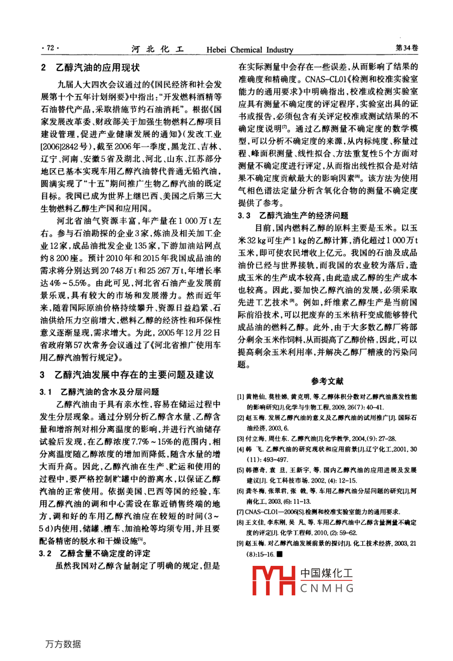 第34卷第3期Vol 34, No. 32011年3月HEBEI HUAGONGMar. 201 1燃料化乙醇汽油的應(yīng)用現(xiàn)狀邢展(河北省產(chǎn)品質(zhì)量監(jiān)督檢驗(yàn)院,河北石家莊050000摘要:介紹了乙醇汽油的定義及主要特征,重點(diǎn)介紹了其應(yīng)用現(xiàn)狀存在的主要問(wèn)題,提出了發(fā)展建議關(guān)鍵詞:乙醇汽油;乙醇;玉米;應(yīng)用;發(fā)展建議中圖分類號(hào):TQ51746文獻(xiàn)標(biāo)識(shí)碼:A文章編號(hào):1003-5095(2011)03-0071-02Alcohol-gasoline Application StatusXING ZhanHebei Province Institution of Supervision and Inspection of Produce Quality, Shijiazhuang 050000, ChinAbstract: To introduce the definition of ethanol-gasoline and main feature, especially its application situation and themain existing problems And to give some suggestions.Key words: ethanol-gasoline; ethanol; com; application situation; suggestion乙醇汽油( Ethanol gasoline)是變性燃料乙醇90號(hào)、93號(hào)、95號(hào)和97號(hào)4個(gè)品種( Denatured Fuel Ethanol)與無(wú)鉛汽油1:9體積比的乙醇汽油辛烷值髙、抗爆性好,乙醇調(diào)入汽油混合物。變性燃料乙醇是以玉米、小麥、薯類、甘可以代替MTBE提高汽油的辛烷值,提高汽油的氧蔗、甜菜等為原料,經(jīng)發(fā)酵、蒸餾、脫水、添加變性劑含量,這可以使汽油燃燒充分,有利于降低汽車尾后變性得到的。其中,玉米因產(chǎn)量大,成為制造乙氣中的cO和碳?xì)浠衔锖?對(duì)于節(jié)約石油資源醇的第一主力品種。乙醇汽油作為一種新型清潔解決我國(guó)能源短缺促進(jìn)農(nóng)業(yè)生產(chǎn)良性循環(huán)解決燃料,可使汽車尾氣污染水平平均降低3%以上,陳糧轉(zhuǎn)化,以及減輕環(huán)境污染等方面具有顯著的減少城市污染。此外,還可以作為增氧劑,替代甲優(yōu)勢(shì)明?;宥』?MTBE)。因此,發(fā)展乙醇汽油在緩解我國(guó)推廣使用乙醇汽油存在一些技術(shù)性問(wèn)石油資源短缺、解決糧食過(guò)剩、調(diào)整農(nóng)業(yè)結(jié)構(gòu)保護(hù)題。例如,乙醇的汽化潛熱大影響了混合氣的形環(huán)境促進(jìn)國(guó)民經(jīng)濟(jì)發(fā)展等方面具有重要的戰(zhàn)略意成及燃燒速度,不利于汽車加速;在燃燒過(guò)程中產(chǎn)義四,具有良好的發(fā)展前景。生的乙酸具有腐蝕作用;易吸水,車用乙醇汽油的1乙醇汽油的定義及主要特性含水量超過(guò)標(biāo)準(zhǔn)指標(biāo)后,容易發(fā)生液相分離,由此國(guó)家標(biāo)準(zhǔn)GB18351-2004中定義乙醇汽油是產(chǎn)生的含水乙醇相就懸浮在汽油相中腐蝕汽化器指在不添加含氧化合物的液體烴類中加入一定量和燃料系統(tǒng)。另外,乙醇汽油的儲(chǔ)運(yùn)周期只有4變性燃料乙醇后用作點(diǎn)燃式內(nèi)燃機(jī)的燃料,加入量5d因此必須改造建設(shè)專供乙醇汽油使用的儲(chǔ)罐、(體積分?jǐn)?shù)為100%±20%。車用乙醇汽油可分為槽車始中國(guó)煤化工CNMHG收稿日期:2010-12-17作者簡(jiǎn)介:邢展(1982-),女,助理工程師從事化工產(chǎn)品質(zhì)量檢驗(yàn)工作,E- mail: xingzhan320@163c0m河北化工 Hebei Chemical Industry第34卷2乙醇汽油的應(yīng)用現(xiàn)狀在實(shí)際測(cè)量中會(huì)存在一些誤差,從而影響了結(jié)果的九屆人大四次會(huì)議通過(guò)的《國(guó)民經(jīng)濟(jì)和社會(huì)發(fā)準(zhǔn)確度和精確度。 CNAS-CL0l《檢測(cè)和校準(zhǔn)實(shí)驗(yàn)室展第十個(gè)五年計(jì)劃綱要》中指出:“開(kāi)發(fā)燃料酒精等能力的通用要求》中明確指出,校準(zhǔn)或檢測(cè)實(shí)驗(yàn)室石油替代產(chǎn)品采取措施節(jié)約石油消耗”。根據(jù)《國(guó)應(yīng)具有測(cè)量不確定度的評(píng)定程序,實(shí)驗(yàn)室出具的證家發(fā)展改革委、財(cái)政部關(guān)于加強(qiáng)生物燃料乙醇項(xiàng)目書或報(bào)告,必須包含有關(guān)評(píng)定校準(zhǔn)或測(cè)試結(jié)果的不建設(shè)管理,促進(jìn)產(chǎn)業(yè)健康發(fā)展的通知》(發(fā)改「業(yè)確定度說(shuō)明。通過(guò)乙醇測(cè)量不確定度的數(shù)學(xué)模2006]2842號(hào)),截至2006年一季度,黑龍江、吉林型,可以分析不確定度的來(lái)源,從內(nèi)標(biāo)純度、稱量過(guò)遼寧河南安徽5省及湖北河北、山東江蘇部分程、峰面積測(cè)量線性擬合方法重復(fù)性5個(gè)方面對(duì)地區(qū)已基本實(shí)現(xiàn)車用乙醇汽油替代普通無(wú)鉛汽油,測(cè)量不確定度進(jìn)行評(píng)定從而指出線性擬合是對(duì)結(jié)圓滿實(shí)現(xiàn)了“十五”期間推廣生物乙醇汽油的既定果不確定度貢獻(xiàn)最大的影響因素。該方法為使用目標(biāo)。我國(guó)已成為世界上繼巴西美國(guó)之后第三大氣相色譜法定量分析含氧化合物的測(cè)量不確定度生物燃料乙醇生產(chǎn)國(guó)和應(yīng)用網(wǎng)。提供了參考。河北省油氣資源豐富,年產(chǎn)量在1000萬(wàn)t左3.3乙醇汽油生產(chǎn)的經(jīng)濟(jì)問(wèn)題目前,國(guó)內(nèi)燃料乙醇的原料主要是玉米。以玉業(yè)12家,成品油批發(fā)企業(yè)135家,下游加油站網(wǎng)點(diǎn)米32kg可生產(chǎn)1kg的乙摩計(jì)算,消化超過(guò)100萬(wàn)t約820座。預(yù)計(jì)2010年和2015年我國(guó)成品油的玉米即可使農(nóng)民增收上億元。我國(guó)的石油及成品需求將分別達(dá)到20748萬(wàn)t和25267萬(wàn)t年增長(zhǎng)率油價(jià)已經(jīng)與世界接軌,而我國(guó)的農(n