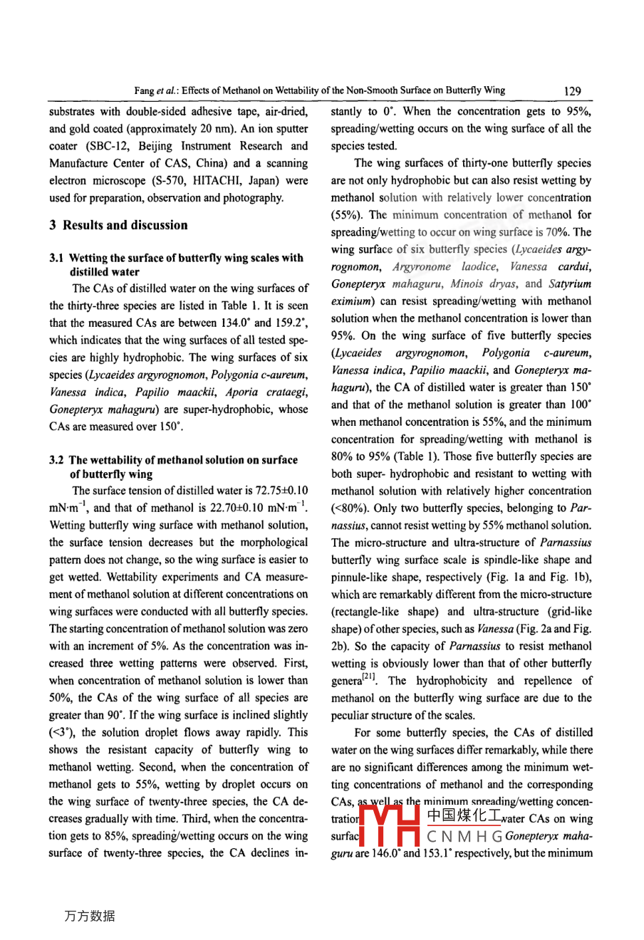 Available online at www.sciencedirect.com中ScienceDirectJournal of Bionic Engineering 5 (2008) 127-133Effects of Methanol on Wettability of the Non-SmoothSurface on Butterfly WingYan Fang'2, Gang Sun'", Qian Cong , Guang-hua Chen', Lu-quan Ren'1. Key Laboratory of Terrain-Machine Bionics Engineering (Ministry of Education, China),Jilin University, Changchun 130022, P R. China2. School of Life Science, Changchun Normal University, Changchun 130032, P. R. ChinaAbstractThe contact angles of dstilled water and methanol solution on the wings of bttrlies were determined by a visual contactangle measuring system. The scale structures of the wings were observed using scanning electron microscopy, The influence ofthe scale micro- and ultra-structure on the wettability was investigaied. Results show that the contact angle of ditilled water onthe wing surfaces varies from 134.0* to 159.2. High hydrophobicity is found in six species with contact angles greater than150*. The wing surfaces of some species are not only hydrophobic but also resist the wetting by methanol solution with 55%concentration. Only two species in Parnassius can not resist the wetting because the micro-structure (spindle-like shape) andultra-structure (pinnule-like shape) of the wing scales are remarkably different fom that of other species. The concentration ofmethanol solution for the occurrence of spreading/wetting on the wing surfaces of different species varies from 70% to 95%.After wetting by methanol solution for 10 min, the ditlld water contact angle on the wing surface increases by 0.8*-2.1",showing the promotion of capacity against wetting by ditilled water.Keywords: non-smooth surface, bttfly wing, scale, wettability, micro/ultra-stuctureCopyright。2008, Jlin University. Published by Science Press and Elsevier Limited. All rights reseved.chemical composition to regulate surface free energy.1 IntroductionTo get larger CA, the surface micro-morphology of theWettability is one of the important properties of amaterial have to be changed!8-10.solid surface, which depends on several factors, such asRecently, many researchers have paid attention tosurface free energy, roughness, morphology, the mannerthe study of bydrophobic materials that can be found inof surface preparation, surface cleanliness, and chemicalbiology. Through evolution and natural selection, manycomposition!" . The hydrophobic (water-epellence),creatures have formed various non-smooth surfaceoil-repellent, and self-cleaning characteristics of a solidstructures to adapt to the environment. When pollutantssurface have found wide applications in industrial, agsuch as dust, rain or snow drop on the surface, it canricultural, domestic and military fields, such as proofingself-clean, while it needs several times of effort to cleanagainst snow, water and fog, pollution guarding,an artificial surface of the same area. The leaf surfaces ofanti-oxidation, aerobat, submarine, radar, etc. The hy- hundreds of different plant species have been studied todrophobicity of a surface can be promoted by increasingsee the effect of roughness on hydrophobicity'".the surface area and surface roughness. Superhydro-Among them are leaves of water-repellent plants such asphobic or superhydrophilic surfaces can be constructedNelumbo nucifera (lotus) and Colocasia esculenta,by using materials of low or high surface free energywhich_ have high CAs with water and show strongrespectivelyS-7. On smooth surfaces, the contact angleself-cI中國(guó)煤化工e“ut-usefcr(CA) can be only increased to 120 by changing Edwir;YC N M H Ge and hysteresis ofCorresponding author: Qian CongE-mail: congqian@jlu.edu.cn128Jourmal of Bionic Engineeing (2008) Vol.5 No.2lotus-effect plant surfaceshs. Wagner et al. examinedexperimental and theoretical basis for fabricating nano-the wing surfaces of ninety-nine insect species by highhydrophobic materials, lubricating and self-cleaningresolution scanning electron microscopy, in order tomaterials.identify the relationship between the wing microstruc-2 Materials and methodstures and wettability with water, and their behavior un-der the influence of contamination!4.2.1 MaterialsRecent studies have been carried out to characterizeButtrfly specimens, belonging to seven families,the leaf surfaces on the micro- and nano-scales whiletwenty-five genera, thirty-three species, were collectedseparating out the effects of the micro- and nanobumps,from June to August 2005 in the suburbs of Changchun,and the wax (crystals that are a mixture of large hydro-Jjilin and Dalian cities, all locating in Northeast China.carbon molecules, measuring about 1 nm in diameter) ofThe specimens were identified by an insect taxonomisthydrophobic leaves on the hydrophobicityl5.bo. Wagnerwith systematic taxonomy23.24. All the reagents were ofet al. made a quantitative assessment of the structuralanalytical reagents (AR) grade and used as receivedbasis of water repellence in natural and technical sur-without further purification. Methanol was purchasedfacesh7. Based on the researches on lotus leaf, Feng et al.from Wulian Chem. Co. (China). The ditilld waterpointed out that self-cleaning is atributed to both mi-used was obtained through a distillation system.cro-structure convex on rough surface and epicuticularwaxesh8. Cong et al., Fang et al, and Chen et al. ex-2.2 Experimental instrument equipment andamined the micro- and ultra-structures of btterfly wingmeasurement methodsscales and drew the conclusion that the high hydropho-A video-based contact angle meter (OCA20,bicity of the butterfly wing (static CA 136.3° to 156.6)DataPhysics Instruments GmbH, Germany) was used tois atrbuted to the co-effects of micro-class scale andconduct wettability experiment and measure the CAssubmicro-class vertical gibbosities on the wing sur(distilled water and methanol) on the discal cell of thefacell 221. By learning from what is found in nature, wewing surfaces of all thity-three species by the sessileca