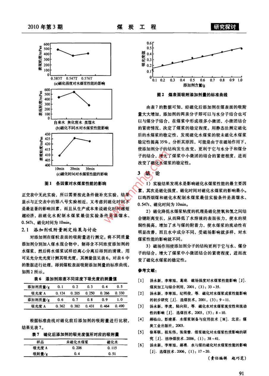 2010年第3期煤炭工程研究探討雞西煙煤制磁化水煤漿性能的研究趙艷紅(黑龍江科技學院資源與環(huán)境工程學院化工系,哈爾濱150027)摘要:為研究水磁化對水煤漿性能的影響,以雞西煙煤、水(蒸餾水、自來水、焦化廢水)配制濃度為60%的磁化水煤漿,采用正交實驗法,考查了水、磁化時間、磁化強度對水煤漿性能的影響,結(jié)論是磁化水是影響水煤漿性能的最主要因素,其次是磁化強度,磁化時間的影響最小,最佳配制條件是蒸餾水、磁化強度0.547、磁化時間為10min關(guān)鍵詞:磁化水;水煤漿;磁化強度;磁化時間中圖分類號:TQ536.9文獻標識碼:A文章編號:1671-0959(2010)03008903水煤漿作為一種潔凈煤技術(shù)在世界和我國發(fā)展具有重1實驗部分要意義,近年來磁化處理技術(shù)在水處理、石化工業(yè)、礦物浮選等領(lǐng)域的應(yīng)用,為磁化處理水煤漿提供了有力的參考,1.1實驗材料特別是研究者們對構(gòu)成水煤漿的煤、添加劑的物理化學性由于要考查磁化水對水煤漿性能的影響,故實驗用水質(zhì)及制備過程的研究投入較多,較少關(guān)注磁化這種物理手和測試水樣選用一次蒸餾水,簡稱蒸餾水;自來水;焦化段對水煤漿性能的影響。本文實驗是以原煤為原料制備濃廢水。三種水的水質(zhì)分析見表1。度為60%水煤漿,并討論了磁化處理對水煤漿性能的影響表1蒸餾水、自來水、焦化廢水的水質(zhì)分析mg/L氯化物總硬度色度pH值H3-N亞硝酸鹽渾濁度總鐵蒸餾水72<0.001自來水055焦化廢水7.50.0012試驗研究煤樣取雞西礦務(wù)局平崗煤礦原煤,煤樣經(jīng)破場強度下,磁化一定時間,然后測定其粘度及穩(wěn)定性碎、篩分和加工制備到200目以下?lián)胶?、縮分成若干份采用NXS-Ⅱ型旋轉(zhuǎn)粘度計,測定水煤漿的表觀粘度。煤樣的工業(yè)分析數(shù)據(jù)如表2所示。實驗采用正交試驗法進行了研究,以100-6的粘度作本實驗制水煤漿時添加劑種類為腐植酸鈉。為性能指標,分析磁化水配制水煤漿影響程度及最佳磁化配表2煤樣的工業(yè)分析比條件。正交實驗表為L934對不同水及磁化強度、磁化時種類W/%A』/%V%F%S』%間對水煤漿性能的影響進行了研究。試驗因素及水平的選取雞西平崗煤1.0627.0929.1642.690.54詳細情況見表3。為了對比另外作了三種水的空白實驗。表3磁化水制水煤漿因素水平表1.2實驗方法水平水的種類A磁場強度B(T)磁化時間C/min在燒杯中將一定量的添加劑和一種水混合,待添加劑0.383溶解后,加入煤樣,攪拌均勻,在攪拌機上攪拌10min,取焦化廢水下靜置5min后測定水煤漿的性質(zhì)。蒸餾水水煤漿的磁化實驗釆用XCQS順控濕法強磁選機,強磁選機產(chǎn)生的磁場是電磁場,磁感應(yīng)強度較強且是均勻的。將制好水煤漿中煤對添加劑吸附量的測定,采用間接法,即的煤漿先裝入自制的磁化盒,再放入高強磁選機中,在一定磁吸附量由最初濃度和最終濃度差值確定。添加劑加入一定收稿日期:2009-06-22作者簡介:趙艷紅(1979-),女,講師,黑龍江科技學院資環(huán)學院化工系教師,現(xiàn)從事煤的綜合利用教學和科研工作。研究探討煤炭工程2010年第3期體積的水中,最初濃度可定,水煤漿用離心機離心分離至分析結(jié)果列入表4中。上層澄清為止,取一定量的上層清液作為待測液由正交試驗的方差分析可以看出,不同水對磁化水配配置一系列標準濃度的添加劑溶液,用分光光度計確制水煤漿的性能有顯著影響,而磁化時間和磁場強度的影定峰位,繪制成標準曲線。對處理過的添加劑溶液用分光響不顯著。而且從方差比來看,磁化時間對水煤漿性能的光度計測定添加劑溶液的吸光度,再在標準曲線上對應(yīng)查影響很小,因此,將磁化時間歸為誤差列,重新對正交試出溶液濃度,并進行含量計算。驗結(jié)果進行方差分析,分析結(jié)果見表5。由這個方差分析可以看出,不同水和磁感應(yīng)強度對磁實驗結(jié)果與討論化水配制水煤漿的性能有顯著影響。同時由方差分析可以2.1正交實驗結(jié)果與討論看出各因素對水煤漿性能的影響如圖1所示。按正交表進行磁化水煤漿實驗,并將每個試樣測定和表4磁化水配制水煤漿的正交試驗表,粘度/mPa378.40581.305980567891Ⅱ皿222333311.57263.471310.681446.771628.25098.07229.17833.91422.52y=419.27皿/k409.53425.57Sa=∑(y-y)2=139498.27極差Dl16.偏差平方和S06718.4920694.51424.35自由度廠方差V53359.2510347.26212.185830.46方差比F.15顯著性2*(0.10)0·(0.25)0*(0.25)衰5方差分析表方差來源平方和S自由度6718.49M2一20694.5110347.261*(0.25)誤差e12509.623021.32總和T139498.27從上圖(a)可分析出,較高的磁化強度雖然有利于水煤磁化對水煤漿粘度降低的影響不同,磁化自來水配制的水漿粘度的降低,但達到一個最低值后,再增加磁化強度效煤漿粘度比磁化工業(yè)廢水配制的水煤漿粘度低,說明水中果不再明顯。不同水質(zhì)磁化后影響水煤漿的性能不同,其的成分在磁場的作用下發(fā)生了變化,水質(zhì)成分多受磁場影中磁化蒸餾水配制水煤漿粘度最小,如圖(b)所示。機理是響情況也多樣,進而對水煤漿粘度影響也產(chǎn)生了多樣性。磁化使氧和氫之間結(jié)合鍵距離變長,從而降低了水溶液的磁化時間對水煤漿性能影響不顯著,為降低成本可在生產(chǎn)表面張力,使水的浸潤性提高,增加了水與煤的附著力,中選擇較短的磁化時間。使水煤漿的流動性有明顯改善,這樣測定水煤漿的粘度由上述結(jié)果