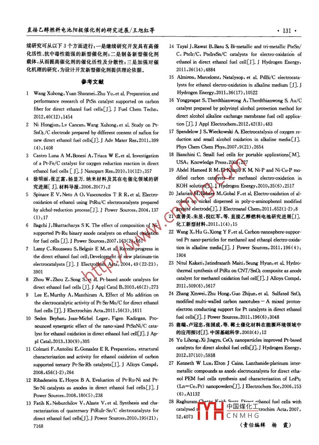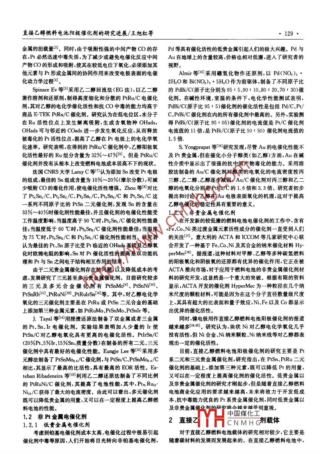 128材料導(dǎo)報(bào)A:綜述篇2013年11月(上)第27卷第11期直接乙醇燃料電池陽極催化劑的研究進(jìn)展王旭紅12,朱慧12,劉飛2,黃金山2,董如林3,倪紅軍2(1常州大學(xué)材料科學(xué)與工程學(xué)院,常州213164;2常熟理工學(xué)院化學(xué)與材料工程學(xué)院常熟215500;3常州大學(xué)石油化工學(xué)院,常州213164)摘要主要綜述了直接乙醇燃料電池陽極電催化劑的電催化機(jī)理,論述了直接醇類燃料電池的陽極催化劑以及催化劑載體的研究現(xiàn)狀,指出陽極催化劑的種類及存在的問題,分析載體對催化劑催化性能的影響,展望了乙醇燃料電池陽極催化劑及擔(dān)載物的發(fā)展。關(guān)鍵詞直接乙醇燃料電池陽極電催化劑催化劑載體中圖分類號:TK91文獻(xiàn)標(biāo)識碼:AResearch Progress on Anode Catalyst for direct Ethanol Fuel CellWANG Xuhong, 2, ZHU Hui,2, LIU Fei, HUANG Jinshan, DONG Rulin, ni hongjun(1 School of Materials Science and Engineering, Changzhou University, Changzhou 213164: 2 School of Chemistry andMaterials Engineering, Changshu Institute of Technology, Changshu 215500; 3 School of PetrochemicalEngineering, Changzhou University, Changzhou 213164)Abstract The electrocatalytic mechanism of anode electro-catalysts in direct ethanol fuel cell is introduced.The anode catalysts of direct ethanol fuel cell and the achievements of catalyst carriers are discussed. Different kinds ofanode catalysts and its problems are pointed out. The effect of support on the catalytic performance is analyzed. Thedevelopments of anode catalysts and catalyst carriers are prospected.Key words direct ethanol fuel cell, anode electro-catalyst, the supporter of catalyst燃料電池以其高轉(zhuǎn)化率、低環(huán)境污染、低噪音污染、安全總反應(yīng):C2H5OHl+3O2→2CO2+3H2O可靠、不隨負(fù)荷大小而變化的發(fā)電效率等優(yōu)點(diǎn)受到越來越多E=1,12V的關(guān)注。在環(huán)境問題日益嚴(yán)重的今天,其對解決經(jīng)濟(jì)發(fā)展與雖然DEFC具有其他燃料電池在質(zhì)量體積、能量密度、能源短缺以及環(huán)境污染之間的矛盾有很大的助益。工作環(huán)境要求等方面不可比擬的優(yōu)勢,但是DEFC的研究尚直接乙醇燃料電池(DEFC)以來源豐富、含氫量高毒性處于起步階段,遇到了一些技術(shù)難題,如貴金屬催化劑的高低的乙醇作為燃料直接將化學(xué)能轉(zhuǎn)化為電能,省去了熱機(jī)擔(dān)載量催化劑的低氧化活性、乙醇在質(zhì)子交換膜中的滲透過程故不受卡諾循環(huán)的限制,大大提高了轉(zhuǎn)化效率是一種中間產(chǎn)物的毒化造成電池效率低下等。因此,開發(fā)對于乙醇高效的清潔能源。因此,DEFC對解決能源短缺和保護(hù)環(huán)境氧化具有高催化活性、低成本和抗CO中毒的新型電催化劑具有重要意義在小型獨(dú)立電源國防通訊、單兵作戰(zhàn)武器電研制抗高溫、不透醇以及對乙醇穩(wěn)定的高性能的電解質(zhì)膜是源以及移動電話、攝像機(jī)和筆記本電腦電源等領(lǐng)域具有廣闊關(guān)鍵技術(shù)。的應(yīng)用前景,被列為未來世界十大科技之首{2。乙醇在電催化劑的作用下發(fā)生電化學(xué)氧化反應(yīng)的過程1直接乙醇燃料電池陽極電催化劑較復(fù)雜涉及到多種化學(xué)吸附態(tài)、CC鍵的斷裂以及多種中1.1Pt系貴金屬電催化劑間產(chǎn)物。DEFC以乙醇水溶液作為燃料,其電極反應(yīng)為:國內(nèi)外研究的DEFC陽極電催化劑主要為Pt/C催化陽極:C2H5OH(m+3H2O→2CO2+12H++12e劑。Pt在電化學(xué)反應(yīng)中,具有過電位低、催化活性高、穩(wěn)定性E=0.087V(1)好的特性;同時(shí),在乙醇燃料電池的酸堿性工作環(huán)境中,Pt都陰極:2O2+2H++2e→H2O能夠穩(wěn)定存在,具有很好的催化活性。雖然Pt/C催化劑活性高性能穩(wěn)定但是鉑金屬價(jià)格十E=1.229V(2)分昂貴特別是鉑金屬資源十分短缺,有必要進(jìn)一步降低鉑*江蘇省自然科學(xué)基金重點(diǎn)資助項(xiàng)目(BK2007704)V凵中國煤化工王旭紅:男1960年生博士,副教授主要研究方向?yàn)橘|(zhì)子交換贗燃料電池固4CNMHG材料Emal:wangxuhongipl@hotmail.com朱慧:女,1989年生,碩士生,主要研究方向?yàn)橹苯右掖既剂想姵仃枠O催化劑Emal:shh1314@126.com直接乙醇燃料電池陽極催化劑的研究進(jìn)展/王旭紅等金屬的擔(dān)載量。同時(shí),由于吸附性強(qiáng)的中間產(chǎn)物CO的存Pd等具有催化活性的低貴金屬引起人們的極大興趣。Pd與在,Pt必然迅速中毒失活,為了減少或避免電催化反應(yīng)中間Au在地球上的含量較高,價(jià)格也相對低廉,進(jìn)入了研究者的產(chǎn)物CO的形成和吸附,使其在較低電位下氧化,必須添加其視野。他元素與Pt形成金屬間的協(xié)同作用來改變電極表面的電催Amir等采用硼氫化物作還原劑,以Pd(NO)2化動力學(xué)過程。2H2O和B(NO)3·5H2O作為前驅(qū)體制備了不同原子比Spinage ev i等采用乙二醇回流法(FG法)以乙二醇的PdB/C(原子比分別為95:5、90:10、80:20、70:30)催兼作溶劑和還原劑,制得高度細(xì)化和分散的PtRu/C電催化化劑。在堿性環(huán)境、室溫的條件下,電化學(xué)性能測試表明,劑,其對乙醇的電化學(xué)催化活性和抗CO中毒的能力均高于PdBi/C(原子比95:5)催化劑的催化活性是包括Pd/C、Pt/商品 E-TEK PtRu/C催化劑。研究認(rèn)為在低電位區(qū),水分子C、PtBC催化劑在內(nèi)的所有催化劑中最高的。另外,實(shí)驗(yàn)測在Ru活性位點(diǎn)上發(fā)生解離吸附,生成含氧物種 OHads,得PdBi/C(原子