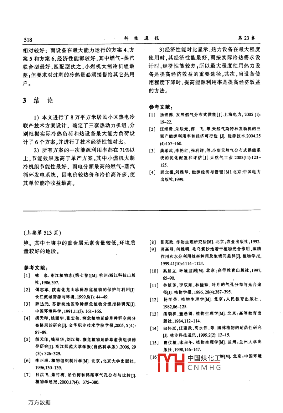 Vol 23 No 4科技通報第23卷第4期july. 2007BULLETIN OF SCIENCE AND TECHNOLOGY2007年7月天然氣熱電冷聯(lián)產(chǎn)方案對比曹望1,蘇磊2(1浙江海洋學(xué)院浙江舟山316004;2.南京工業(yè)大學(xué),南京210009摘要:針對南京某一居民小區(qū),進(jìn)行了天然氣熱電冷聯(lián)產(chǎn)方案設(shè)計,選取了3套熱力設(shè)備,并按實際冷熱需求和燃機(jī)最大能力兩種設(shè)計方法確定了設(shè)計指標(biāo),進(jìn)行了技術(shù)經(jīng)濟(jì)性能的計算和分析,對比不同熱力設(shè)備的技術(shù)經(jīng)濟(jì)性能和各方案的優(yōu)缺點。關(guān)鍵詞:天然氣;熱電冷三聯(lián)供;技術(shù)經(jīng)濟(jì)性能中圖分類號:TKo1文獻(xiàn)標(biāo)識碼:A文章編號:1001-7119(2007)04-0514-05Comparison of Scheme on Cooperation of Heating and Powerand Cooling of Natural GasCAO Wang, SU Lei2(1. Zhejiang Ocean University, Zhoushan 316004, China; 2. Nanjing University of Technology, Nanjing 210009, China)Abstract: The article advanced technology schemes on Cooperation of heating and power and cooling of Natural Gas inone residential area of nanjing, Schemes choose three different equipment unit, and fix on design index base on the ac-tual demand of cold and heat and most capability of gas turbine of two scheme, The article analysis on technical and e-conomic performance, Comparison of technical and economic performance on different equipment unit and differentKey words: natural gas; cooperation heating and power and cooling: technical and economic performance0引言是能滿足此要求的清潔燃料,同時還能提高天然氣在能源市場的競爭力,緩解電網(wǎng)峰時缺電的矛天然氣是一種高熱值,優(yōu)質(zhì)的環(huán)保燃料。隨盾。著天然氣西氣東輸工程的完成,長江中下游地區(qū)居民區(qū)使用天然氣熱電冷三聯(lián)產(chǎn)系統(tǒng),是利使用上了天然氣。但由于天然氣價格較高,其合用天然氣同時向小區(qū)居民提供電能、熱能和冷能理綜合利用技術(shù)成為當(dāng)前重要的研究課題。的聯(lián)供系統(tǒng);發(fā)電提高了天然氣的使用品質(zhì),余以清潔能源為燃料的分布式供能系統(tǒng),在合熱供熱和供冷提高了能源的利用率是一種極有理匹配冷熱電聯(lián)供時,可以有效實現(xiàn)能源的梯級前景中國煤化工利用,能源綜合利用率高達(dá)75%以上叫天然氣正CNMHG米的住宅小區(qū)進(jìn)收稿日期:200601-20作者簡介:曹望(1968-),男,講師碩士;從事管理工程和工業(yè)技術(shù)經(jīng)濟(jì)研究。E-mil:obo938@yahoo.com.cn第4期曹望等天然氣熱電冷聯(lián)產(chǎn)方案對比515行天然氣熱電冷三聯(lián)供系統(tǒng)的方案設(shè)計,通過各機(jī)組所需余熱選取匹配的燃?xì)廨啓C(jī);或以熱負(fù)荷種方案的技術(shù)經(jīng)濟(jì)性能對比,得出不同熱力設(shè)備確定小燃機(jī)型號,制冷時不足余熱可通過制冷機(jī)在技術(shù)經(jīng)濟(jì)性能上的差異和各自的優(yōu)缺點。的補(bǔ)燃設(shè)備來補(bǔ)充。本項目采用3套熱力設(shè)備組合。第一種為小1熱電冷三聯(lián)產(chǎn)技術(shù)方案燃機(jī)加大制冷機(jī)組型,第二種為燃機(jī)與制冷機(jī)組匹配型,第三種為燃機(jī)、余熱鍋爐、背壓蒸汽機(jī)加1.1熱動力設(shè)備的確定制冷機(jī)組的聯(lián)合發(fā)電熱電冷聯(lián)產(chǎn)系統(tǒng),此系統(tǒng)可根據(jù)住宅建筑設(shè)計規(guī)范(JG96-86)和南京用于小熱負(fù)荷時增加發(fā)電分額來提高設(shè)備利用地區(qū)氣候條件,冬季采暖期為7d,夏季制冷期程度和能源利用率的情況。為90d,春秋季非采暖制冷期為196d,每天按20套熱動力設(shè)備的組成、型號和性能如表2h滿負(fù)荷運(yùn)行,冬季采暖期合計1540h,夏季制12設(shè)計方案的確定冷期1540h,春秋季過渡期為3960h,年設(shè)備運(yùn)本項目考慮兩種設(shè)計方法,第一種:根據(jù)小行7300h。區(qū)實際冷熱負(fù)荷的需求和設(shè)備使用的最低程度表1為南京地區(qū)住宅采暖制冷和用電負(fù)荷來確定實際電量第二種保證燃?xì)廨啓C(jī)滿負(fù)荷指標(biāo)。運(yùn)行,余熱全部用于供暖、制冷和生活用水岡表1南京地區(qū)熱電冷負(fù)荷指標(biāo)實際冷熱負(fù)荷的確定,是根據(jù)冬夏季氣溫的Table 1 Load of heat and cool power in nanjing area變化,取項目最大冷熱負(fù)荷的733%為設(shè)計負(fù)負(fù)荷電荷,春秋季熱負(fù)荷以小燃機(jī)提供的熱負(fù)荷確定。冷負(fù)荷指標(biāo)(W/m2)因此,設(shè)備1的燃機(jī)全年都可滿負(fù)荷運(yùn)行,但冬項目負(fù)荷(kW)56003200-40005600~7200夏季需要補(bǔ)燃;而設(shè)備2和3不需補(bǔ)燃,但燃機(jī)在冬季和春秋季不能滿負(fù)荷運(yùn)行系統(tǒng)采用兩種組合方式,一種為:燃?xì)廨啓C(jī)+按設(shè)備最大能力設(shè)計時:三套設(shè)備中燃機(jī)都余熱直燃溴化鋰制冷機(jī)組組成,另一種為:燃?xì)馐菨M負(fù)荷運(yùn)行,但設(shè)備1在冬夏季需要補(bǔ)燃,補(bǔ)輪機(jī)+余熱鍋爐+蒸汽輪機(jī)+余熱直燃溴化鋰制燃量較按實際冷熱需求設(shè)計時大較多。具體負(fù)荷冷機(jī)組組成。情況如表3:系統(tǒng)采用以熱(冷)定電的原則。首先選取數(shù)據(jù)顯示:按設(shè)備最大能力設(shè)計的冷熱負(fù)荷制冷機(jī),因項目的冷負(fù)荷比熱負(fù)荷大許多,故以分別是按實際需求設(shè)計的123和178倍,分別最大冷負(fù)荷值確定制冷機(jī)組的型號,再根據(jù)制冷多232kW和2284kW。
