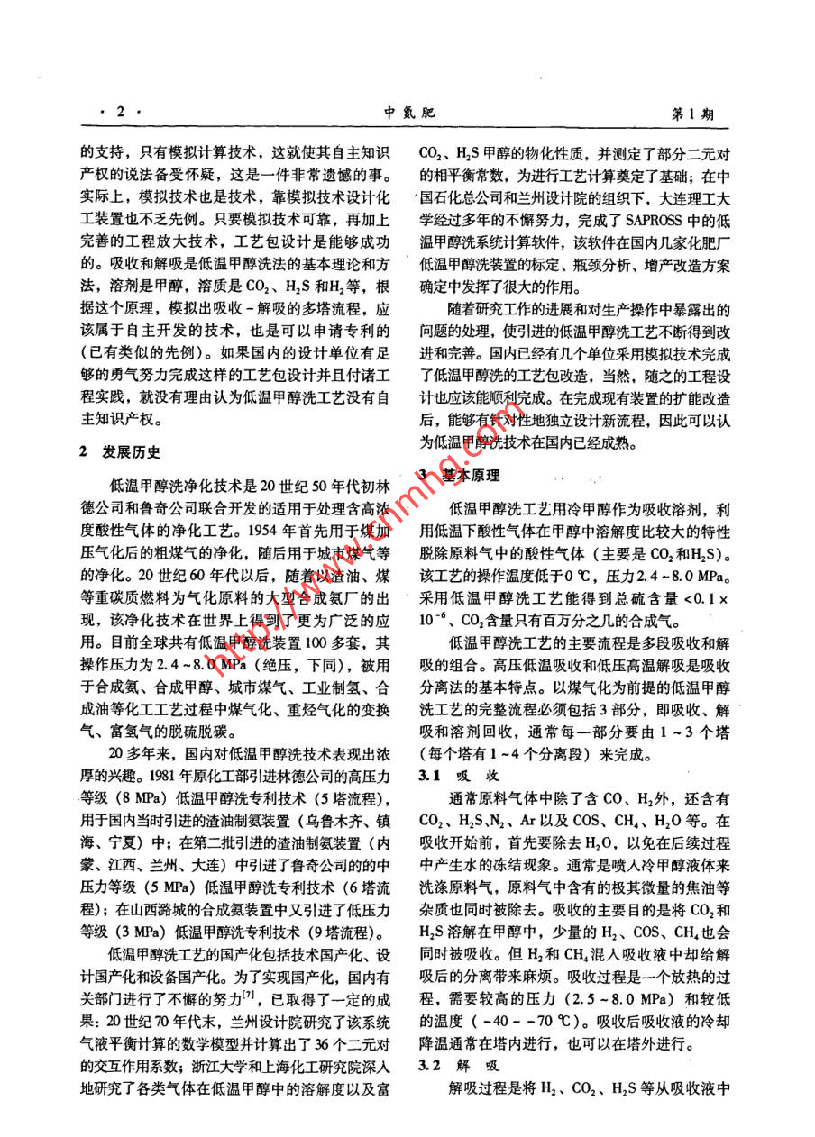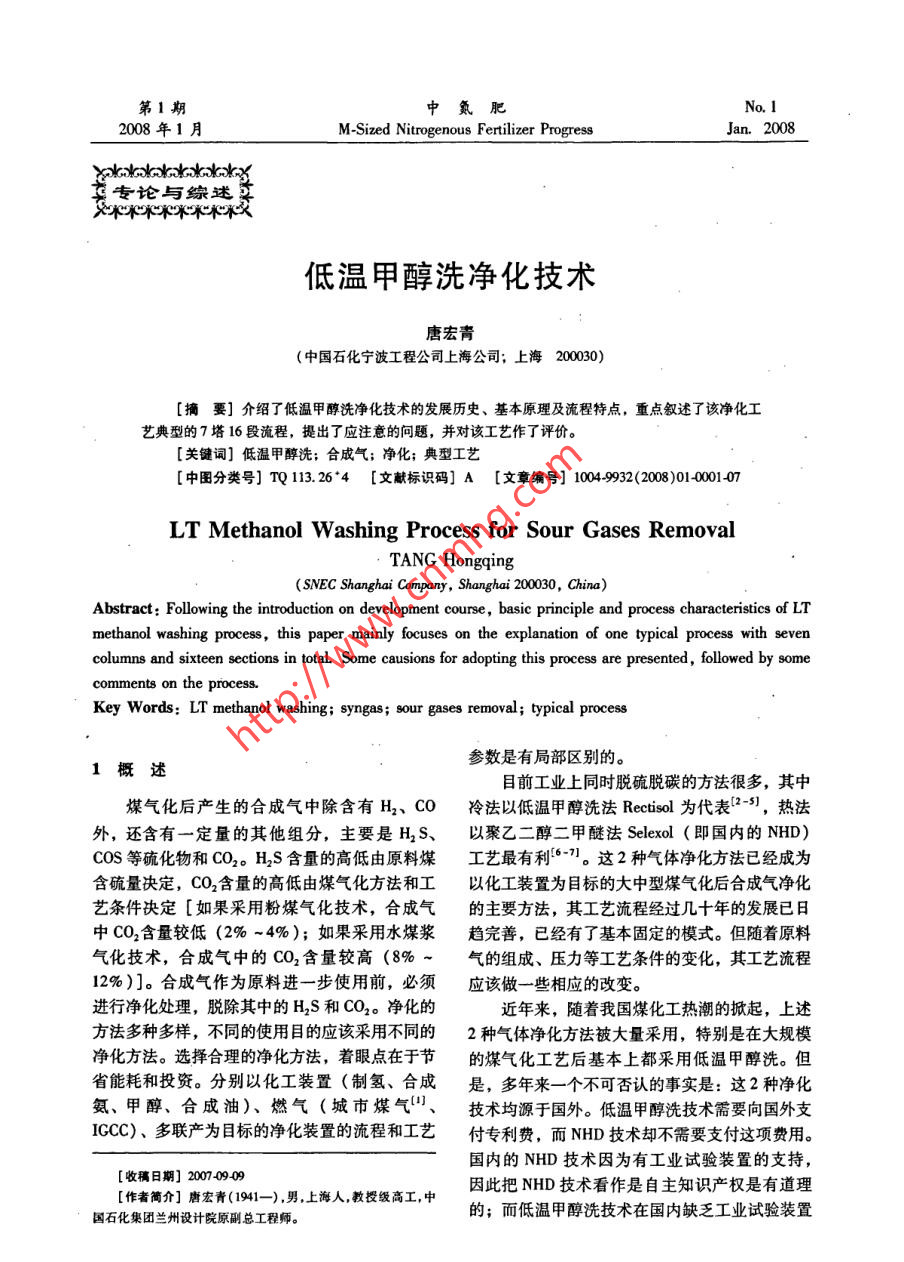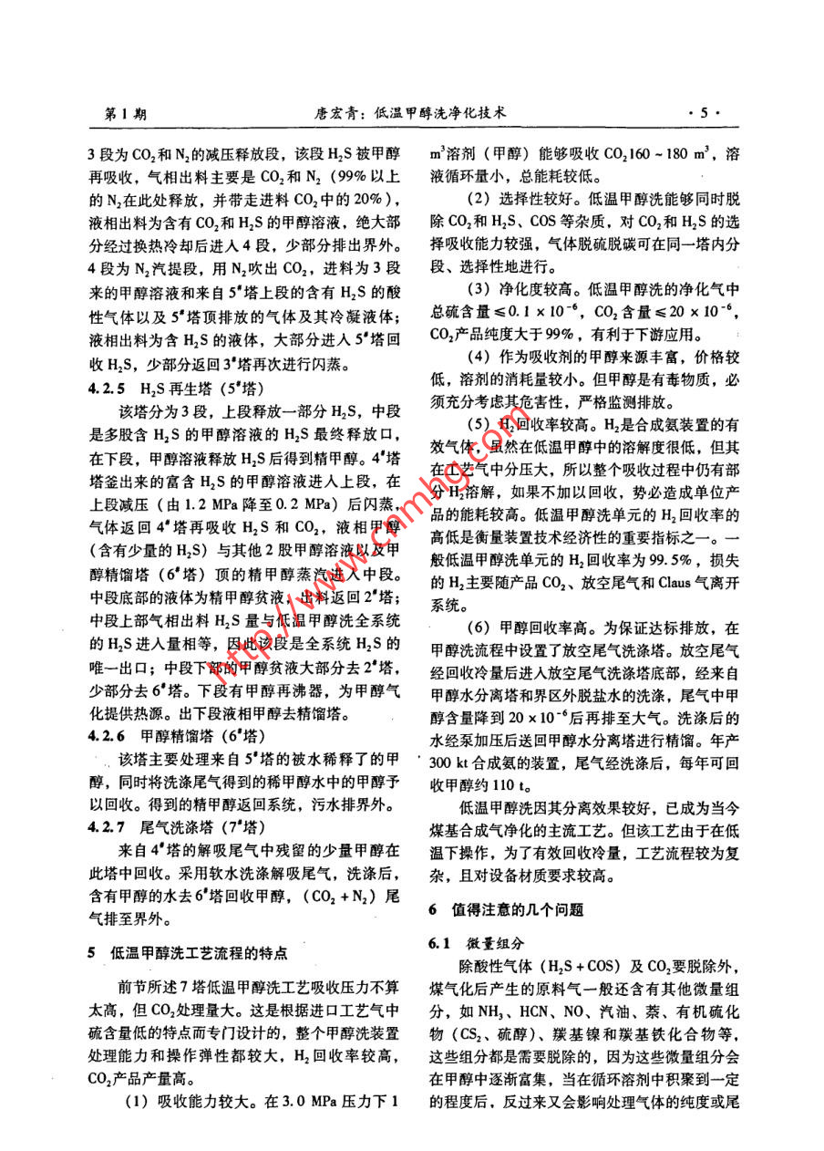 第1期中氮肥No. 12008年1月M-Sized Nitrogenous Fertilizer ProgressJan.2008類(lèi)專(zhuān)論與綜述美低溫甲醇洗凈化技術(shù)唐宏青(中國(guó)石化寧波工程公司上海公司;上海200030)[摘要] 介紹了低溫甲醇洗凈化技術(shù)的發(fā)展歷史、基本原理及流程特點(diǎn),重點(diǎn)敘述了該凈化工藝典型的7塔16段流程,提出了應(yīng)注意的問(wèn)題,并對(duì)該工藝作了評(píng)價(jià)。.[關(guān)鍵詞]低溫甲醇洗;合成氣;凈化;典型工藝[中圖分類(lèi)號(hào)] TQ113.26*4 [文獻(xiàn)標(biāo)識(shí)碼] A [文章編號(hào)] 0099200801000101LT Methanol Washing Process for Sour Gases RemovalTANG Hongqing(SNEC Shanghai Company, Shanghai 200030, China)Abstract: Following the introduction on development course, basic principle and process characteristics of LTmethanol washing process, this paper mainly focuses on the explanation of one typical process with sevencolumns and sixteen sections in total Some causions for adopting this process are presented, followed by somecomments on the process.Key Words: LT methanol washing; syngas; sour gases removal; typical process參數(shù)是有局部區(qū)別的。1概述目前工業(yè)上同時(shí)脫硫脫碳的方法很多,其中煤氣化后產(chǎn)生的合成氣中除含有H2、CO .冷法以低溫甲醇洗法Rectisol 為代表[2-59],熱法外,還含有一定量的其他組分,主要是H2S、以聚乙二醇二甲醚法Selexol(即國(guó)內(nèi)的NHD)COS等硫化物和CO2。H2S含量的高低由原料煤工藝最有利(6-7]。這2種氣體凈化方法已經(jīng)成為含硫量決定,CO2含量的高低由煤氣化方法和工以化工裝置為目標(biāo)的大中型煤氣化后合成氣凈化藝條件決定[如果采用粉煤氣化技術(shù),合成氣的主要方法,其工藝流程經(jīng)過(guò)幾十年的發(fā)展已日中CO2含量較低(2% ~4%);如果采用水煤漿趨完善,已經(jīng)有了基本固定的模式。但隨著原料氣化技術(shù),合成氣中的CO2含量較高(8% ~氣的組成、壓力等工藝條件的變化,其工藝流程12%)]。合成氣作為原料進(jìn)-步使用前,必須應(yīng)該做- -些相應(yīng)的改變。進(jìn)行凈化處理,脫除其中的H2S和CO2。凈化的近年來(lái),隨著我國(guó)煤化工熱潮的掀起,上述方法多種多樣,不同的使用目的應(yīng)該采用不同的2種氣體凈化方法被大量采用,特別是在大規(guī)模凈化方法。選擇合理的凈化方法,著眼點(diǎn)在于節(jié)的煤氣化工藝后基本上都采用低溫甲醇洗。但省能耗和投資。分別以化工裝置(制氫、合成是,多年來(lái)一個(gè)不可否認(rèn)的事實(shí)是:這2種凈化氨、甲醇、合成油)、燃?xì)?城市煤氣氣、技術(shù)均源于國(guó)外。低溫甲醇洗技術(shù)需要向國(guó)外支ICCC)、多聯(lián)產(chǎn)為目標(biāo)的凈化裝置的流程和工藝付專(zhuān)利費(fèi),而NHD技術(shù)卻不需要支付這項(xiàng)費(fèi)用。國(guó)內(nèi)的NHD技術(shù)因?yàn)橛泄I(yè)試驗(yàn)裝置的支持,[收稿日期] 2007.0909[作者簡(jiǎn)介]唐宏青(1941-),男,上海人,教授級(jí)高工,中因此把NHD技術(shù)看作是自主知識(shí)產(chǎn)權(quán)是有道理的;而低溫甲醇洗技術(shù)在國(guó)內(nèi)缺乏工業(yè)試驗(yàn)裝置國(guó)石化集團(tuán)蘭州設(shè)計(jì)院原副總工程師。中氮肥第1期的支持,只有模擬計(jì)算技術(shù),這就使其自主知識(shí)CO2、H,S甲醇的物化性質(zhì),并測(cè)定了部分二元對(duì)產(chǎn)權(quán)的說(shuō)法備受懷疑,這是一-件非常遺憾的事。的相平衡常數(shù),為進(jìn)行工藝計(jì)算奠定了基礎(chǔ);在中實(shí)際上,模擬技術(shù)也是技術(shù),靠模擬技術(shù)設(shè)計(jì)化國(guó)石化總公司和蘭州設(shè)計(jì)院的組織下,大連理工大工裝置也不乏先例。只要模擬技術(shù)可靠,再加上學(xué)經(jīng)過(guò)多年的不懈努力,完成了SAPROSS中的低完善的工程放大技術(shù),工藝包設(shè)計(jì)是能夠成功溫甲醇洗系統(tǒng)計(jì)算軟件,該軟件在國(guó)內(nèi)幾家化肥廠的。吸收和解吸是低溫甲醇洗法的基本理論和方低溫甲醇洗裝置的標(biāo)定、瓶頸分析、增產(chǎn)改造方案法,溶劑是甲醇,溶質(zhì)是CO2、HS和H2等,根確定中發(fā)揮了很大的作用。據(jù)這個(gè)原理,模擬出吸收-解吸的多塔流程,應(yīng)隨著研究工作的進(jìn)展和對(duì)生產(chǎn)操作中暴露出的該屬于自主開(kāi)發(fā)的技術(shù),也是可以申請(qǐng)專(zhuān)利的問(wèn)題的處理,使引進(jìn)的低溫甲醇洗工藝不斷得到改(已有類(lèi)似的先例)。如果國(guó)內(nèi)的設(shè)計(jì)單位有足進(jìn)和完善。國(guó)內(nèi)已經(jīng)有幾個(gè)單位采用模擬技術(shù)完成夠的勇氣努力完成這樣的工藝包設(shè)計(jì)并且付諸工了低溫甲醇洗的工藝包改造,當(dāng)然,隨之的工程設(shè)程實(shí)踐,就沒(méi)有理由認(rèn)為低溫甲醇洗工藝沒(méi)有自計(jì)也應(yīng)該能順利完成。在完成現(xiàn)有裝置的擴(kuò)能改造主知識(shí)產(chǎn)權(quán)。后,能夠有針對(duì)性地獨(dú)立設(shè)計(jì)新流程,因此可以認(rèn)為低溫甲醇洗技術(shù)在國(guó)內(nèi)已經(jīng)成熟。2發(fā)展歷史低溫甲醇洗凈化技術(shù)是20世紀(jì)50年代初林3基本原理德公司和魯奇公司聯(lián)合開(kāi)發(fā)的適用于處理含高濃低溫甲醇洗工藝用冷甲醇作為吸收溶劑,利度酸性氣體的凈化工藝。1954 年首先用于煤加用低溫下酸性氣體在甲醇中溶解度比較大的特性壓氣化后的