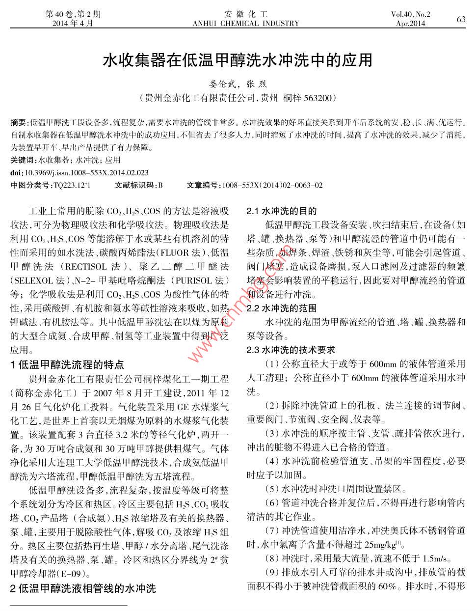 第40卷,第2期安徽化工Vol 40. No. 22014年4月ANHUI CHEMICAL INDUSTRYApr 201463水收集器在低溫甲醇洗水沖洗中的應(yīng)用婁倫武,張烈(貴州金赤化工有限責(zé)任公司,貴州桐梓563200摘要:低溫甲醇洗工段設(shè)備多,流程復(fù)雜,需要水沖洗的管線非常多。水沖洗效果的好壞直接關(guān)系到開車后系統(tǒng)的安、穩(wěn)、長、滿、優(yōu)運行。自制水收集器在低溫甲醇洗水沖洗中的成功應(yīng)用,不但省去了很多人力,同時縮短了水沖洗的時間,提高了水沖洗的效果,減少了消耗為裝置早開車、早出產(chǎn)品提供了有力保障。關(guān)鍵詞:水收集器;水沖洗;應(yīng)用doi:10.3969/isn.1008-553X.2014.02023中圖分類號:TQ223.121文獻標(biāo)識碼:B文章編號:1008-553X(2014)02-0063-02工業(yè)上常用的脫除CO2、HS、COS的方法是溶液吸2.1水沖洗的目的收法,可分為物理吸收法和化學(xué)吸收法。物理吸收法是低溫甲醇洗工段設(shè)備安裝、吹掃結(jié)束后,在設(shè)備(如利用CO3、H♂S、COsS等能溶解于水或某些有杋溶劑的特塔、罐、換熱器、泵等)和甲醇流經(jīng)的管道中仍可能有性而采用的如水洗法、碳酸丙烯酯法( FLUOR法)、低溫些雜質(zhì),如焊條、焊渣、鐵銹和灰塵等,可能會引起管道甲醇洗法( RECTISOL法)、聚♂二醇二甲醚法閥門堵塞,造成設(shè)備磨損,泵入口濾網(wǎng)及過濾器的頻繁( SELEXOL法)、N-2-甲基吡咯烷酮法( PURISOL法)堵塞會影響裝置的平穩(wěn)運行,因此要對甲醇流經(jīng)的管道等;化學(xué)吸收法是利用CO2、H2S、COS為酸性氣體的特和設(shè)備進行沖洗。性,采用碳酸鉀、有機胺和氨水等堿性溶液來吸收,如熱2.2水沖洗的范圍鉀堿法、有機胺法等。其中低溫甲醇洗法在以煤為原料水沖洗的范圍為甲醇流經(jīng)的管道、塔、罐、換熱器和的大型合成氨、合成甲醇、制氫等工業(yè)裝置中得到廣泛泵等設(shè)備。應(yīng)用23水沖洗的技術(shù)要求1低溫甲醇洗流程的特點(1)公稱直徑大于或等于600mm的液體管道采用貴州金赤化工有限責(zé)任公司桐梓煤化工一期工程人工清理;公稱直徑小于600m的液體管道采用水沖(簡稱金赤化工)于2007年8月開工建設(shè),2011年12洗。月26日氣化爐化工投料。氣化裝置采用GE水煤漿氣(2)拆除沖洗管道上的孔板、法蘭連接的調(diào)節(jié)閥、化工藝,是世界上首套以無煙煤為原料的水煤漿氣化裝重要閥門、節(jié)流閥、安全閥、儀表等置。該裝置配套3臺直徑3.2米的等徑氣化爐,兩開(3)水沖洗的順序按主管、支管、疏排管依次進行,備,為30萬噸合成氨和30萬噸甲醇提供粗煤氣。氣體沖出的臟物不得進入已合格的管道。凈化采用大連理工大學(xué)低溫甲醇洗技術(shù),合成氨低溫甲(4)水沖洗前檢驗管道支、吊架的牢固程度,必要醇洗為六塔流程,甲醇低溫甲醇洗為五塔流程時應(yīng)予以加固。低溫甲醇洗設(shè)備多,流程復(fù)雜,按溫度等級可將整(5)水沖洗時沖洗口周圍設(shè)置禁區(qū)個系統(tǒng)劃分為冷區(qū)和熱區(qū)。冷區(qū)主要包括HS、CO2吸收(6)管道沖洗合格并復(fù)位后,不得再進行影響管內(nèi)塔、CO2產(chǎn)品塔(合成氨)、HS濃縮塔及有關(guān)的換熱器、清潔的其它作業(yè)。泵、罐,主要用于脫除酸性氣體,解吸CO2及濃縮HS組(⑦)沖洗管道使用潔凈水,沖洗奧氏體不銹鋼管道分。熱區(qū)主要包括熱再生塔、甲醇/水分離塔、尾氣洗滌時,水中氯離子含量不得超過25mg/kg塔及有關(guān)的換熱器、泵、罐。冷區(qū)和熱區(qū)分界線為2貧(8)沖洗時,采用最大流量,流速不低于1.5m/s甲醇冷卻器(E-09)(9)排放水引入可靠的排水井或溝中,排放管的截2低溫甲醇洗液相管線的水沖洗面積不得小于被沖洗管截面積的60%。排水時,不得形總第188期2014年第2期(第40卷)安徽化工成負壓。沖洗效果,同時也會影響現(xiàn)場施工。(10)管道的排水支管需全部沖洗。3解決方案(11)水沖洗連續(xù)進行,以排出口的水色和透明度為了保證水沖洗工作的順利進行,為化工投料試車與入口水目測一致為合格。掃清障礙,我們就地取材,利用現(xiàn)場的廢舊管子,根據(jù)泵(12)當(dāng)管道經(jīng)水沖洗合格后暫不運行時,將水排入口管道的尺寸制成不同型號的水收集器。水收集器示凈,并及時干燥。意圖見圖1。(13)水沖洗后的復(fù)位工作,注意與設(shè)備連接的管道應(yīng)保持自由對中(14)水沖洗按照流程分段進行,在每個塔、罐、換熱器前段開做水沖洗排放口。每段水沖洗干凈后方可進與泵入口入下一段。嚴(yán)禁雜質(zhì)被帶入下一設(shè)備中,以保證水沖洗封閉相連接質(zhì)量。24水沖洗的難點金赤化工低溫甲醇洗工段水沖洗采用消防水分段沖洗的原則進行,最初的方案是利用消防帶從消防栓引消防水建立塔釜或罐的液位。液位正常后啟動泵,對泵圖1水收集器示意圖出口管道和設(shè)備進行沖洗。沖洗前管道上的孔板、調(diào)節(jié)水收集器一側(cè)封閉,另一側(cè)為臨時法蘭,與泵入口閥、重要閥門、節(jié)流閥、安全閥、儀表等要拆除。管道與設(shè)法蘭相連接,1~6為消防帶接頭,接頭的多少根據(jù)所需備相連接的法蘭脫開作為排放口。沖洗合格后恢復(fù)管道的沖洗水量來確定。水沖洗時,只需將水收集器安裝在與設(shè)備相連接的法蘭,進行后續(xù)管道和設(shè)備的沖洗。泵的入口,打開消防栓閥門,啟動泵即可對管道和設(shè)備由于低溫甲醇洗工段