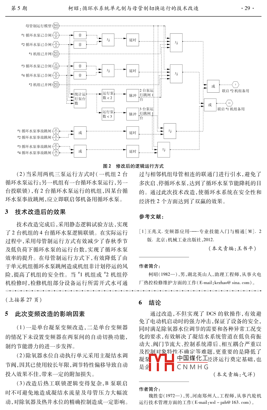 第36卷第5期華電技術VoL 36 N2014年5月Huadian TechnologyMav.2014y循環(huán)水系統(tǒng)單元制與母管制切換運行的技術改造柯昭(湖北西塞山發(fā)電有限公司,湖北黃石435000摘要:湖北西塞山發(fā)電有限公司為達到循環(huán)水泵節(jié)能降耗的目標,通過技術改造手段,加裝了循環(huán)水聯(lián)通門,實現(xiàn)了臺單元機組工頻循環(huán)水泵單元制與母管制切換運行模式,提高了機組經(jīng)濟性及安全性。關鍵詞:單元制;母管制;經(jīng)濟性;安全性中圖分類號:TK223.5+2文獻標志碼:B文章編號:1674-1951(2014)05-0028-021問題的提出對循環(huán)水泵進行改造的同時,湖北西塞山發(fā)電有限公司的技術人員又對DCS組態(tài)方面進行了修改,提湖北西塞山發(fā)電有限公司Ⅰ期2臺330MW單出了循環(huán)水泵單元制/母管制交替運行方式,在保證元機組分別由2臺工頻循環(huán)水泵并列運行,4臺循原有循環(huán)水泵聯(lián)鎖邏輯不變的基礎之上,對其運行環(huán)水泵均為72IKXC-25型,單泵平均流量為5.3模式進行了切換。修改后邏輯運行方式如圖2n3/s,單泵配套功率為1800kW,取水水源為長江黃所示。石段,運行方式為全年大部分時間2臺機組雙泵運"1液動蝶閥行,冬季低溫時段一臺水泵運行,另一臺備用。在兼*1循環(huán)水泵顧機組安全、穩(wěn)定運行的前提下,實現(xiàn)循環(huán)水泵的節(jié)能降耗是湖北西塞山發(fā)電有限公司在節(jié)能降耗方面#2液動蝶閥的重要課題。首先考慮的是將循環(huán)水泵由工頻運行2循環(huán)水泵凵#1機組循環(huán)水母管方式通過變頻改造轉(zhuǎn)變?yōu)樽冾l運行方式,但變頻改造投入較大,而且變頻器對安裝環(huán)境要求苛刻,循環(huán)聯(lián)通門1③#3液動蝶閥水泵房獨立建設于江邊,距主廠房較遠,平時巡檢、*3循環(huán)水泵團聯(lián)通門2⑩檢修維護實現(xiàn)較為困難。在現(xiàn)有條件下,通過局部2機組循改造能否實現(xiàn)循環(huán)水泵的節(jié)能降耗呢?湖北西塞山環(huán)水母管叫4液動蝶閥發(fā)電有限公司有關人員進行了調(diào)查研究和可行性分凵#4循環(huán)水泵析之后,提出了通過加裝循環(huán)水聯(lián)通門方式,以實現(xiàn)循環(huán)水由單元制與母管制切換運行方式的設想。2技術改造方案的實施圖1循環(huán)水泵局部技術改造示意圖當“1,2機組循環(huán)水聯(lián)通門1,2均不在全關若要實現(xiàn)其設想的技術改造方案,其先決條件位置時,可視為"1,"2機組循環(huán)水系統(tǒng)處于母管制是2臺機組的容量及循環(huán)水母管壓力相當,由于2運行方式。當"1,"2機組循環(huán)水聯(lián)通門1,2有任意臺機組的循環(huán)水母管比鄰敷設,施工實現(xiàn)起來較為一個處于全關位時,可視為1,"2機組循環(huán)水系統(tǒng)容易。處于單元制運行方式在“1,"2機組循環(huán)水母管之間搭建一個聯(lián)通系統(tǒng)處干母管制運行方式時,增加以管道,在聯(lián)通管上加裝2個電動門,聯(lián)通門1為兩位下聯(lián)中國煤化工式電動門,聯(lián)通門2為電動調(diào)節(jié)門,2個電動門的控CNMHG方式時(每臺機組各制均在原循環(huán)水泵房遠程站分散控制系統(tǒng)(DCS)中有一臺循環(huán)水泵運行,另一臺循環(huán)水泵投聯(lián)鎖),機實現(xiàn)循環(huán)水泵局部技術改造示意如圖1所示。在組處于并網(wǎng)狀態(tài)。當運行泵停運或事故跳閘后,如果5s內(nèi)本機組備用泵未聯(lián)啟成功,則聯(lián)啟鄰機備收稿日期:2013-06-28;修回日期:2014-02-14用泵第5期柯昭:循環(huán)水系統(tǒng)單元制與母管制切換運行的技術改造母管制運行模型1循環(huán)水泵已合閘2循環(huán)水泵已合閘("1機組已并網(wǎng)3循環(huán)水泵已合閘4循環(huán)水泵已合閘2機組已并網(wǎng)聯(lián)啟#機組備用脈沖行跳閘行泵臺3臺泵運聯(lián)啟葉機組備用運行泵脈沖行跳閘循環(huán)水泵事故跳閘延時2循環(huán)水泵事故跳閘3循環(huán)水泵事故跳閘("4循環(huán)水泵事故跳閘或延時圖2修改后的邏輯運行方式(2)當采用兩機三泵運行方式時(一機組2臺過與相鄰機組母管相連的聯(lián)通門進行引水,避免了循環(huán)水泵運行;另一機組有一臺循環(huán)水泵運行,另一多次啟、停循環(huán)水泵,達到了循環(huán)水泵節(jié)能降耗的目臺投聯(lián)鎖),有2臺循環(huán)水泵運行的機組,因某臺循的。通過此次技術改造,使循環(huán)水系統(tǒng)在安全性和環(huán)水泵事故跳閘,應立即聯(lián)啟鄰機備用循環(huán)水泵。經(jīng)濟性2個方面達到了雙贏的效果。3技術改造后的效果參考文獻技術改造完成后,采用靜態(tài)邏輯試驗方法,實現(xiàn)了2臺機組的4臺循環(huán)水泵邏輯聯(lián)鎖。在實際運行[1王兆義.變頻器應用一專業(yè)技能入門與精通[M].2過程中,采用母管制運行方式有效減少了春秋季節(jié)版.北京:機械工業(yè)出版社,2012.及低負荷下循環(huán)水泵的運行臺數(shù),實現(xiàn)了循環(huán)水泵(本文責編:王書平)效率的提升。在母管制運行方式下,有效降低了由于單元機組循環(huán)水泵跳閘造成機組非計劃停運的風作者簡介險,提高了機組的安全性。當"1機組或“2機組??抡?1982—),男,湖北英山人,助理工程師,從事火電機檢修時,檢修機組部分設備運行所需開式水可通廠熱控檢修維護方面的工作(E-mail:kezhao@sina.com)心心·心·心·心·心心·心·心·心·心·心·心心·心·心·心·