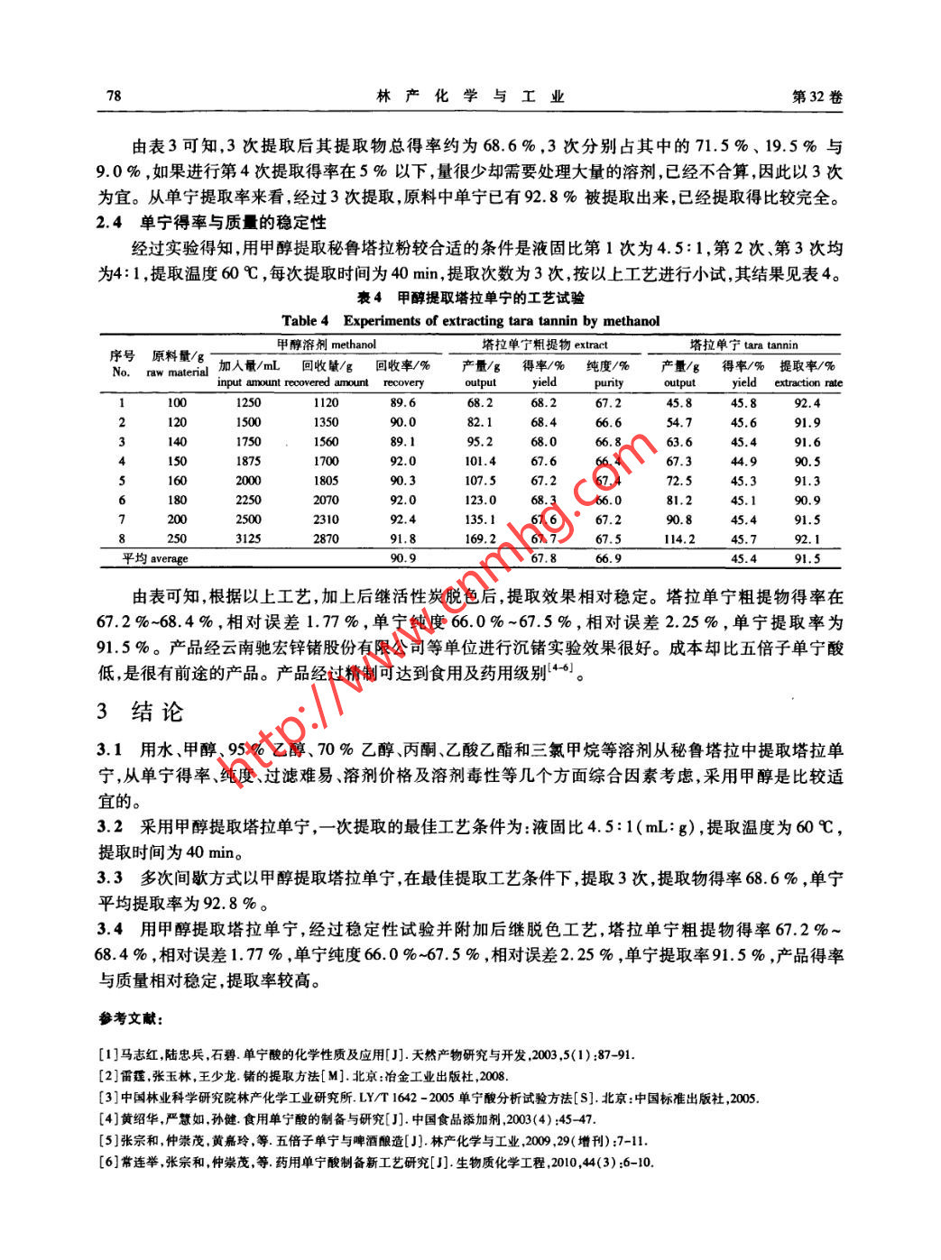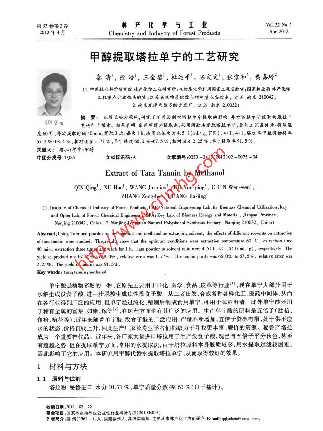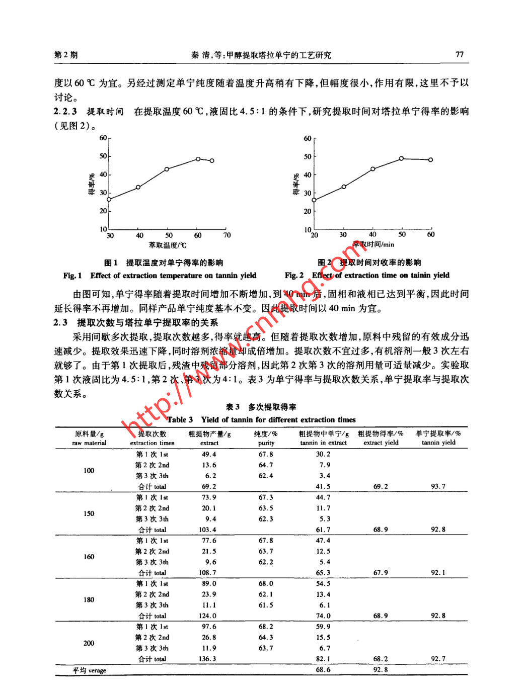 第32卷第2期林產(chǎn)化學(xué)與工業(yè)Vol. 32 No.22012年4月Chemistry and Industry of Forest ProductsApr. 2012甲醇提取塔拉單寧的工藝研究秦清',徐浩',王金鍪”,杜運(yùn)平',陳文文',張宗和”,黃嘉玲3(1.中國(guó)林業(yè)科學(xué)研究院林產(chǎn)化學(xué)工業(yè)研究所;生物質(zhì)化學(xué)利用國(guó)家工程實(shí)驗(yàn)室;國(guó)家林業(yè)局林產(chǎn)化學(xué)工程重點(diǎn)開放性實(shí)驗(yàn)室;江蘇省生物質(zhì)能源與材料重點(diǎn)實(shí)驗(yàn)室,江蘇南京210042;2.南京龍?jiān)刺烊欢喾雍铣蓮S,江蘇南京210032)摘要:以塔拉粉為原料,研究了不同溶劑對(duì)塔拉單寧提取的影響,并對(duì)塔拉單寧提取的最佳工QIN Qing藝進(jìn)行了探索。結(jié)果表明,采用甲醇為提取劑,采用間歇法提取塔拉單寧,最佳工藝條件為:提取溫度60C,每次提取時(shí)間40 min,提取3次,每次1 h,液固比依次為4.5:1(mL:g,下同)、4:1、4:1,塔拉單寧粗提物得率67.2%-68.4% ,相對(duì)誤差1.77%,單寧純度66.0%-67.5% ,相對(duì)誤差2.25%,單寧提取率91.5%。關(guān)鍵詞:塔拉;單寧;甲醇中圖分類號(hào):TQ35文獻(xiàn)標(biāo)識(shí)碼:A文章編號(hào):0253 -2417(2012)02 -0075 -04Extract of Tara Tannin by MethanolQIN Qing', XU Hao',WANG Jin-qiao2 , DU Yun-ping' ,CHEN Wen-wen' ,ZHANG Zong-he' ,HUANG Jia-ling2(1. Institute of Chemical Industry of Forest Products ,CAF ;National Engineering Lab. for Biomass Chemiceal Utilization;Keyand Open Lab. of Forest Chemical Engineering , SFA; Key Lab. of Biomass Energy and Material ,Jiangsu Province,Nanjing 210042 , China; 2. Nanjing Longyuan Natural Polyphenol Synthesis Factory, Nanjing 210032 , China)Abstract: Using Tara pod powder as raw material and methanol as extracting solvent, the effects of different solvents on extractionof tara tannin were studied. The results show that the optimum conditions were extraction temperature 60 C, extraction time40 min, extraction three times and each for 1 h. Tara powder to solvent ratio were4.5:1, 4:1,4:1( mL: g), respectively. Theyield of product was 67.2 % to 68. 4% , relative error was 1. 77% . The tannin purity was 66.0% to 67.5%,relative error was2.25% . The yield of tannin was 91. 5%.Key words: tara; tannin; methanol單寧酸是植物多酚的一種,它原先主要用于 日化、醫(yī)學(xué)、食品、皮革等行業(yè)"1 ,現(xiàn)在單寧大部分用于水解生成沒食子酸,進(jìn)一步 脫羧生成焦性沒食子酸。從二者出發(fā),合成各種各樣化工、醫(yī)藥中間體,從而在各行業(yè)得到廣泛的應(yīng)用,粗單寧經(jīng)過(guò)純化、精制后制成食用單寧,可用于啤酒澄清。此外單寧酸還用于稀有金屬的富集,如鍺、鎵等12],在醫(yī)藥方面也有其廣泛的應(yīng)用。生產(chǎn)單寧酸的原料是五倍子(肚棓、角棓、棓花等) ,近年來(lái)隨著單寧酸、沒食子酸的廣泛應(yīng)用,產(chǎn)量不斷增加,五倍子資源有限,處于供不應(yīng)求的狀態(tài),價(jià)格直線上升,因此生產(chǎn)廠家及專業(yè)學(xué)者們都致力于尋找更豐富、廉價(jià)的資源。秘魯產(chǎn)塔拉成為一-個(gè)重要替代品。近年來(lái),各廠家大量進(jìn)口塔拉用于生產(chǎn)沒食子酸,現(xiàn)已與五倍子平分秋色,甚至有超越之勢(shì),但在提取單寧方面,常用的水提取法,由于塔拉原料本身膠質(zhì)較多,用水提取過(guò)濾較困難,因此影響了它的應(yīng)用。本研究用甲醇代替水提取塔拉單寧,從而取得較好的效果。1材料與方法1.1原料與試劑塔拉粉:秘魯進(jìn)口,水分10.71 % ,單寧質(zhì)量分?jǐn)?shù)49.60 % (以干基計(jì))。明:2012 -02 -22基金項(xiàng)目:國(guó)家林業(yè)局林業(yè)公益性行業(yè)科研專項(xiàng)(201004013)作者簡(jiǎn)介:秦清(1961-),女,福建福州人,高級(jí)實(shí)驗(yàn)師,主要從事林產(chǎn)化工方面研究;E-mail:qqlychem@ sina. com。.76林產(chǎn)化學(xué)與工業(yè)第32卷甲醇、95 %乙醇.乙酸乙酯、丙酮、三氯甲烷均為化學(xué)純。1.2工藝過(guò)程塔拉單寧提取工藝為:100 g塔拉粉,在適當(dāng)溫度下用溶劑提取3次,液固比依次為4.5:1、4:1、4:1,每次1h。合并3次提取液,濃縮,得到塔拉單寧粗提物,粗提物用水溶解,活性炭脫色,經(jīng)干燥得塔拉單寧。1.3 產(chǎn)品成分分析甲醇提取以及脫色精制后產(chǎn)品單寧純度采用LY/T 1642 - 2005單寧酸分析試驗(yàn)方法[3]進(jìn)行分析。2結(jié)果 與討論2.1溶劑的選擇單寧溶于水,可選擇乙酸乙酯、三氯甲烷、丙酮、乙醇、甲醇、水等極性溶劑,由于溫度高對(duì)提取有利,因此均選擇高溫提取(臨近于沸點(diǎn)溫度) ,提取次數(shù)為1次,提取時(shí)間1 h,液固比4:1(mL:g,下同),每次用塔拉原料為100 g,提取溫度由于不同溶劑沸點(diǎn)高低而定,實(shí)驗(yàn)結(jié)果見表1。表1不同溶劑對(duì)塔拉提取的影響Table 1 The effects of different solvents on the extraction of tara溫度/C過(guò)濾情況提取物/g純度/%單寧得率/%solventstemp.filter situationextractpuritytannin yield水water90不易hard40.258.947.7甲醇methanol容易eay48.667.36s.995%乙醇95% ethanol較易not difclut35.364.145.670%乙醇70% ethanol39.661.348.9丙酮acetone容易easy31.261.2乙酸乙酯ethyl acetate28.772.441.9三氯甲烷chloroform19.365.225.6由表1可知,以甲醇為溶劑,塔拉單寧的得率最高(65.9 %),且甲醇最容易過(guò)濾,價(jià)格僅高于水;70 %乙醇次之,48. 9 % ;乙酸乙酯、丙酮與三氯甲烷偏低。而乙酸乙酯提取的塔拉單寧的純度最高,為72.4%,但綜合考慮純度和提取率,還是甲醇最為適宜。由于產(chǎn)品要精制成