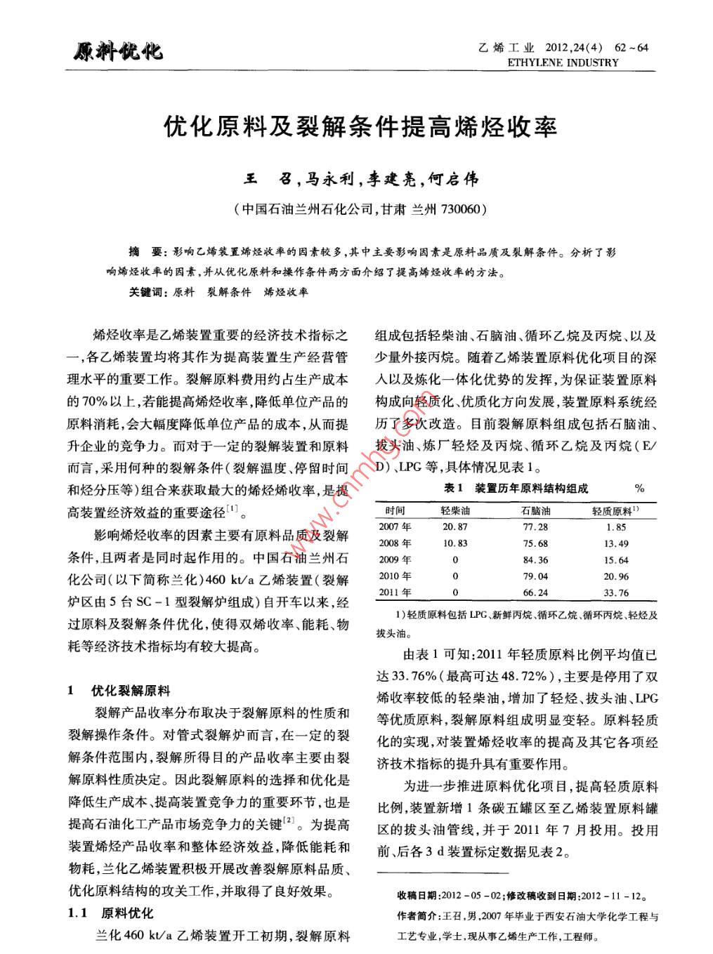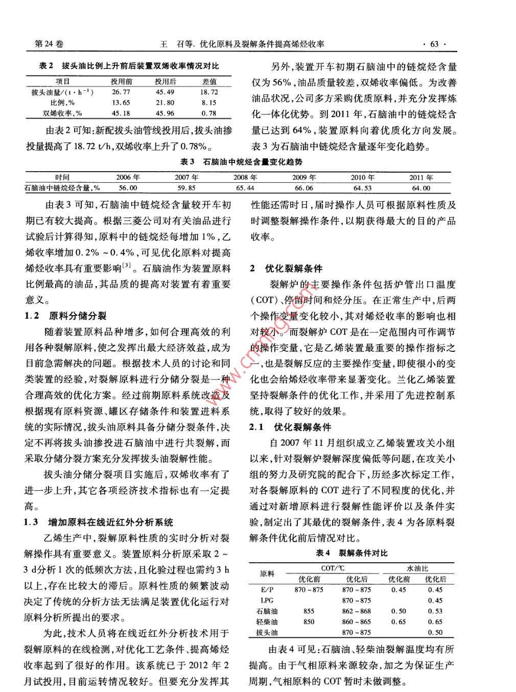 原斜優(yōu)化乙烯工業(yè)2012,24(4) 62 ~64ETHYLENE INDUSTRY優(yōu)化原料及裂解條件提高烯烴收率王召,馬永利,李建亮,何啟偉(中國(guó)石油蘭州石化公司,甘肅蘭州730060)摘要: 影響乙烯裝置烯烴收率的因素較多,其中主要影響因素是原料品質(zhì)及裂解條件。分析了影響烯烴收率的因素,并從優(yōu)化原料和操作條件兩方面介紹了提高烯烴收率的方法。關(guān)鍵詞:原料裂解條件烯烴收率烯烴收率是乙烯裝置重要的經(jīng)濟(jì)技術(shù)指標(biāo)之組成包括輕柴 油、石腦油、循環(huán)乙烷及丙烷、以及-,各乙烯裝置均將其作為提高裝置生產(chǎn)經(jīng)營(yíng)管少量外接丙烷。隨著乙烯裝置原料優(yōu)化項(xiàng)目的深理水平的重要工作。裂解原料費(fèi)用約占生產(chǎn)成本人以及煉化一體化優(yōu)勢(shì)的發(fā)揮,為保證裝置原料的70%以上,若能提高烯烴收率,降低單位產(chǎn)品的構(gòu)成向輕質(zhì)化優(yōu)質(zhì)化方向發(fā)展,裝置原料系統(tǒng)經(jīng)原料消耗,會(huì)大幅度降低單位產(chǎn)品的成本,從而提歷了多次改造。目前裂解原料組成包括石腦油、升企業(yè)的競(jìng)爭(zhēng)力。而對(duì)于-一定的裂解裝置和原料拔頭油、煉廠輕烴及丙烷、循環(huán)乙烷及丙烷(E/而言,采用何種的裂解條件(裂解溫度、停留時(shí)間D)、LPG等,具體情況見(jiàn)表1。和烴分壓等)組合來(lái)獲取最大的烯烴烯收率,是提表1 裝置歷年原料結(jié)構(gòu)組成%高裝置經(jīng)濟(jì)效益的重要途徑"。時(shí)間輕柴油石腦泊輕質(zhì)原料)2007年20. 877.281. 85影響烯烴收率的因素主要有原料品質(zhì)及裂解2008年10. 8375.6813.49條件,且兩者是同時(shí)起作用的。中國(guó)石油蘭州石2009年84.3615.64化公司(以下簡(jiǎn)稱蘭化)460kt/a乙烯裝置(裂解2010年79.0420.962011 年66. 2433.76爐區(qū)由5臺(tái)SC-1型裂解爐組成)自開(kāi)車以來(lái),經(jīng)1)輕質(zhì)原料包括LPG、新鮮丙烷、循環(huán)乙烷、循環(huán)丙烷輕烴及過(guò)原料及裂解條件優(yōu)化,使得雙烯收率、能耗、物拔頭油。耗等經(jīng)濟(jì)技術(shù)指標(biāo)均有較大提高。由表1可知:2011年輕質(zhì)原料比例平均值已達(dá)33. 76%(最高可達(dá)48. 72%),主要是停用了雙1優(yōu)化裂解原料烯收率較低的輕柴油,增加了輕烴、拔頭油、LPG裂解產(chǎn)品收率分布取決于裂解原料的性質(zhì)和等優(yōu)質(zhì)原料,裂解原料組成明顯變輕。原料輕質(zhì)裂解操作條件。對(duì)管式裂解爐而言,在- -定的裂化的實(shí)現(xiàn),對(duì)裝置烯烴收率的提高及其它各項(xiàng)經(jīng)解條件范圍內(nèi),裂解所得目的產(chǎn)品收率主要由裂濟(jì)技術(shù)指標(biāo)的提升具有重要作用。解原料性質(zhì)決定。因此裂解原料的選擇和優(yōu)化是為進(jìn)--步推進(jìn)原料優(yōu)化項(xiàng)目,提高輕質(zhì)原料降低生產(chǎn)成本、提高裝置競(jìng)爭(zhēng)力的重要環(huán)節(jié),也是比例,裝置新增1條碳五罐區(qū)至乙烯裝置原料罐提高石油化工產(chǎn)品市場(chǎng)競(jìng)爭(zhēng)力的關(guān)鍵[]。為提高區(qū)的拔頭油管線,并于2011年7月投用。投用裝置烯烴產(chǎn)品收率和整體經(jīng)濟(jì)效益,降低能耗和前、后各3d裝置標(biāo)定數(shù)據(jù)見(jiàn)表2。物耗,蘭化乙烯裝置積極開(kāi)展改善裂解原料品質(zhì)、優(yōu)化原料結(jié)構(gòu)的攻關(guān)工作,并取得了良好效果。收稿日期:2012 -05 -02;修改稿收到日期:2012-11-12。1.1原料優(yōu)化作者簡(jiǎn)介:王召,男,2007年畢業(yè)于西安石油大學(xué)化學(xué)工程與蘭化460kVa乙烯裝置開(kāi)工初期,裂解原料工藝專業(yè),學(xué)士,現(xiàn)從事乙烯生產(chǎn)工作,工程師。第24卷王召等.優(yōu)化原料及裂解條件提高烯烴收率表2拔頭油比 例上升前后裝置雙烯收率情況對(duì)比另外,裝置開(kāi)車初期石腦油中的鏈烷烴含量項(xiàng)目投用前投用后差值僅為56% ,油品質(zhì)量較差,雙烯收率偏低。為改善拔頭油量/(t.h-I)26.7745.4918. 72比例,%13.6521. 808.15油品狀況,公司多方采購(gòu)優(yōu)質(zhì)原料,并充分發(fā)揮煉雙烯收率,%45. 1845. 960.78化- -體化優(yōu)勢(shì)。到2011年,石腦油中的鏈烷烴含由表2可知:新配拔頭油管線投用后,拔頭油摻已達(dá)到64%,裝置原料向著優(yōu)質(zhì)化方向發(fā)展。投量提高了18.72 Vh,雙烯收率上升了0. 78%。表3為石腦油中鏈烷烴含量逐年變化趨勢(shì)。表3石腦油中烷烴含量變化趨勢(shì)時(shí)間2007年2008年2009年2010年2011年石腦油中鏈烷烴含量,% .56.0059.855.4466.06 .64.5364.00由表3可知,石腦油中鏈烷烴含量較開(kāi)車初性能還需時(shí)日,屆時(shí)操作人員可根據(jù)原料性質(zhì)及期已有較大提高。根據(jù)三菱公司對(duì)有關(guān)油品進(jìn)行時(shí)調(diào)整裂解操作條件,以期獲得最大的目的產(chǎn)品試驗(yàn)后計(jì)算得知,原料中的鏈烷烴每增加1%,乙收率。烯收率增加0.2%~0.4%,可見(jiàn)優(yōu)化原料對(duì)提高烯烴收率具有重要影響{3]。石腦油作為裝置原料2優(yōu)化 裂解條件比例最高的油品,其品質(zhì)的提高對(duì)裝置有著重要裂解爐的主要操作條件包括爐管出口溫度意義。(COT)、停留時(shí)間和烴分壓。在正常生產(chǎn)中,后兩1.2 原料分儲(chǔ)分裂個(gè)操作變量變化較小,其對(duì)烯烴收率的影響也相隨著裝置原料品種增多,