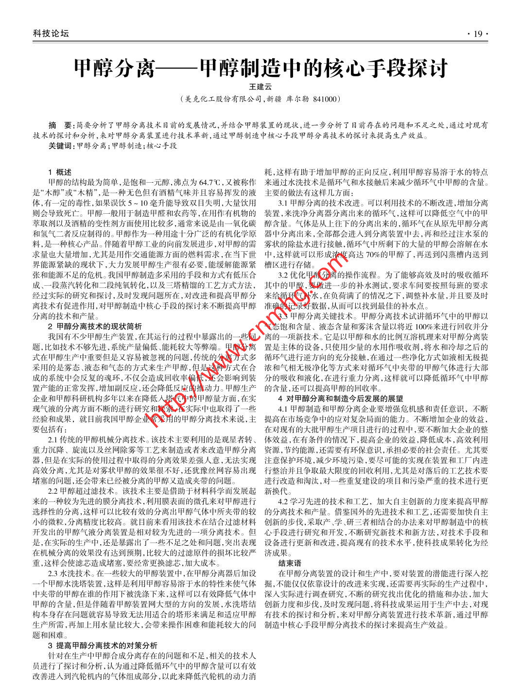 科技論壇甲醇分離-甲醇制造中的核心手段探討王建云(美克化工股份有限公司,新疆庫爾勒841000摘要:簡要分析了 甲醇分離技術(shù)目前的發(fā)展情況,并結(jié)合甲醇裝置的現(xiàn)狀,進(jìn)一步分析了目前存在的問題和不足之處,通過對現(xiàn)有技術(shù)的探討和分析,來對甲醇分離裝置進(jìn)行技術(shù)革新,通過甲醇制造中核心手段甲醇分離技術(shù)的探討來提高生產(chǎn)效益。關(guān)鍵詞:甲醇分離;甲醇制造;核心手段1概述耗,這樣有助于增加甲醇的正向反應(yīng),利用甲醇容易溶于水的特點甲醇的結(jié)構(gòu)最為簡單,是飽和一元醇, 沸點為64.79,又被稱作來通過 水洗技術(shù)是循環(huán)氣和水接觸后來減少循環(huán)氣中甲醇的含量。是“木醇”或“木精”,是-種無色但有酒精氣味并且容易揮發(fā)的液主要 的做法有這樣幾方面:體,有一定的毒性,如果誤飲5~ 10毫升能導(dǎo)致雙目失明,大量飲用3.1甲醇分離的技術(shù)改進(jìn)??梢岳眉夹g(shù)的不斷改進(jìn),增加分離則會導(dǎo)致死亡。甲醇一般用于制造甲醛和農(nóng)藥等,在用作有機物的裝置,來洗凈分離器分離出來的循環(huán)氣,這樣可以降低空氣中的甲萃取劑以及酒精的變性劑方面使用比較多,通常來說是由一-氧化碳醇含量。 氣體是從上往下的分離出來的,循環(huán)氣在從原先甲醇分離和氫氣二者反應(yīng)制得的。甲醇作為一-種用途 十分廣泛的有機化學(xué)原器 中分離出來,全部都會進(jìn)人到分離裝置中去,再和經(jīng)過注水泵的料,是一種核心產(chǎn)品。伴隨著甲醇工業(yè)的向前發(fā)展進(jìn)步,對甲醇的需霧狀的除鹽水進(jìn)行接觸,循環(huán)氣中所剩下的大量的甲醇會溶解在水求量也大量增加,尤其是用作交通能源方面的燃料需求,在當(dāng)下世中,這樣就可以形成濃度高達(dá)70%的甲醇了,再送到閃蒸槽內(nèi)送到界能源緊缺的現(xiàn)狀下,大力發(fā)展甲醇生產(chǎn)很有必要,能緩解能源緊槽區(qū)進(jìn)行存儲。張和能源不,足的危機。我國甲醇制造多采用的手段和方式有低壓合3.2優(yōu)化甲醇分離的操作流程。為了能夠高效及時的吸收循環(huán)成、一-段蒸汽轉(zhuǎn)化和二段純氧轉(zhuǎn)化,以及三塔精餾的工藝方式方法,其中的甲醇 ,要做進(jìn)一步 的補水測試,要求車間要按照每班的要求經(jīng)過實際的研究和探討,及時發(fā)現(xiàn)問題所在,對改進(jìn)和提高甲醇分來給循環(huán)氣補水,在負(fù)荷滿了的情況之下,調(diào)整補水量,并且要及時離技術(shù)有促進(jìn)作用,對甲醇制造中核心手段的探討來不斷提高甲醇準(zhǔn)確的記錄好數(shù)據(jù),從而可以找到最佳的補水點。分離的技術(shù)和產(chǎn)量。3.3 甲醇分離關(guān)鍵技術(shù)。甲醇分離技術(shù)試講循環(huán)氣中的甲醇以2甲醇分離技術(shù)的現(xiàn)狀簡析氣態(tài)飽和含量、液態(tài)含量和霧沫含量以將近100%來進(jìn)行回收并分我國有不少甲醇生產(chǎn)裝置,在其運行的過程中暴露出的一些問離的一項新技術(shù)。它是以甲醇和水的比例互溶機理來對甲醇分離裝題,比如技術(shù)不夠先進(jìn),系統(tǒng)產(chǎn)量偏低能耗較大等弊端。甲醇分離置是主體的設(shè)備,只使用少量的水用作吸收劑,將水和冷卻之后的式在甲醇生產(chǎn)中重要但是又容易被忽視的問題,傳統(tǒng)的分離方式多循環(huán)氣進(jìn)行逆 方向的充分接觸,在通過一些凈化 方式如液相無極提采用的是霧態(tài)、液態(tài)和氣態(tài)的方式來生產(chǎn)甲醇,但是這種方式在合濃和氣相無極凈化等方式來對循環(huán)氣中夾帶的甲醇?xì)怏w進(jìn)行大部成的系統(tǒng)中會反復(fù)的魂環(huán),不僅會造成回收率偏低,還會影響到裝分的吸收和液化,在進(jìn)行重力分離,這樣就可以降低循環(huán)氣中甲醇置產(chǎn)能的正常發(fā)揮,增加副反應(yīng),還會降低反應(yīng)的推動力。甲醇生產(chǎn)的含量,還可以提高甲醇的回收率。企業(yè)和甲醇科研機構(gòu)多年以來在降低入塔氣中的甲醇量方面,在實4對甲醇分離和制造今后發(fā)展的展望現(xiàn)氣液的分離方面不斷的進(jìn)行研究和探索,在實際中也取得了一些4.1甲醇制造和甲醇分離企業(yè)要增強危機感和責(zé)任意識,不斷經(jīng)驗和成果,就目前我國甲醇企業(yè)常采用的甲醇分離技術(shù)來說,主提高在市場競爭中的應(yīng)對復(fù)雜局面的能力。不斷增加企業(yè)的效益,要包括有:在對現(xiàn)有的大批甲醇生產(chǎn)項目進(jìn)行的過程中,要不斷加大企業(yè)的整2.1傳統(tǒng)的甲醇機械分離技術(shù)。該技術(shù)主要利用的是觀星者轉(zhuǎn)、體效益,在有條件的情況下,提高企業(yè)的效益,降低成本,高效利用重力沉降、旋流以及絲網(wǎng)除霧等工藝來制造或者來改造甲醇分離資源, 節(jié)約能源,還需要有環(huán)保意識,承擔(dān)必要的社會責(zé)任。尤其要器,但是在實際的使用過程中取得的分離效果差強人意,無法實現(xiàn)注意保護(hù)環(huán)境,減少環(huán)境污染,要盡可能的實現(xiàn)在裝置和工廠內(nèi)進(jìn)高效分離,尤其是對霧狀甲醇的效果很不好,還猶豫絲網(wǎng)容易出現(xiàn)行整治并 且爭取最大限度的回收利用,尤其是對落后的工藝技術(shù)要堵塞的問題,還會帶來已經(jīng)被分離的甲醇又造成夾帶的問題。進(