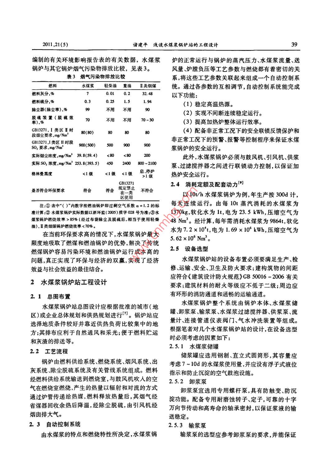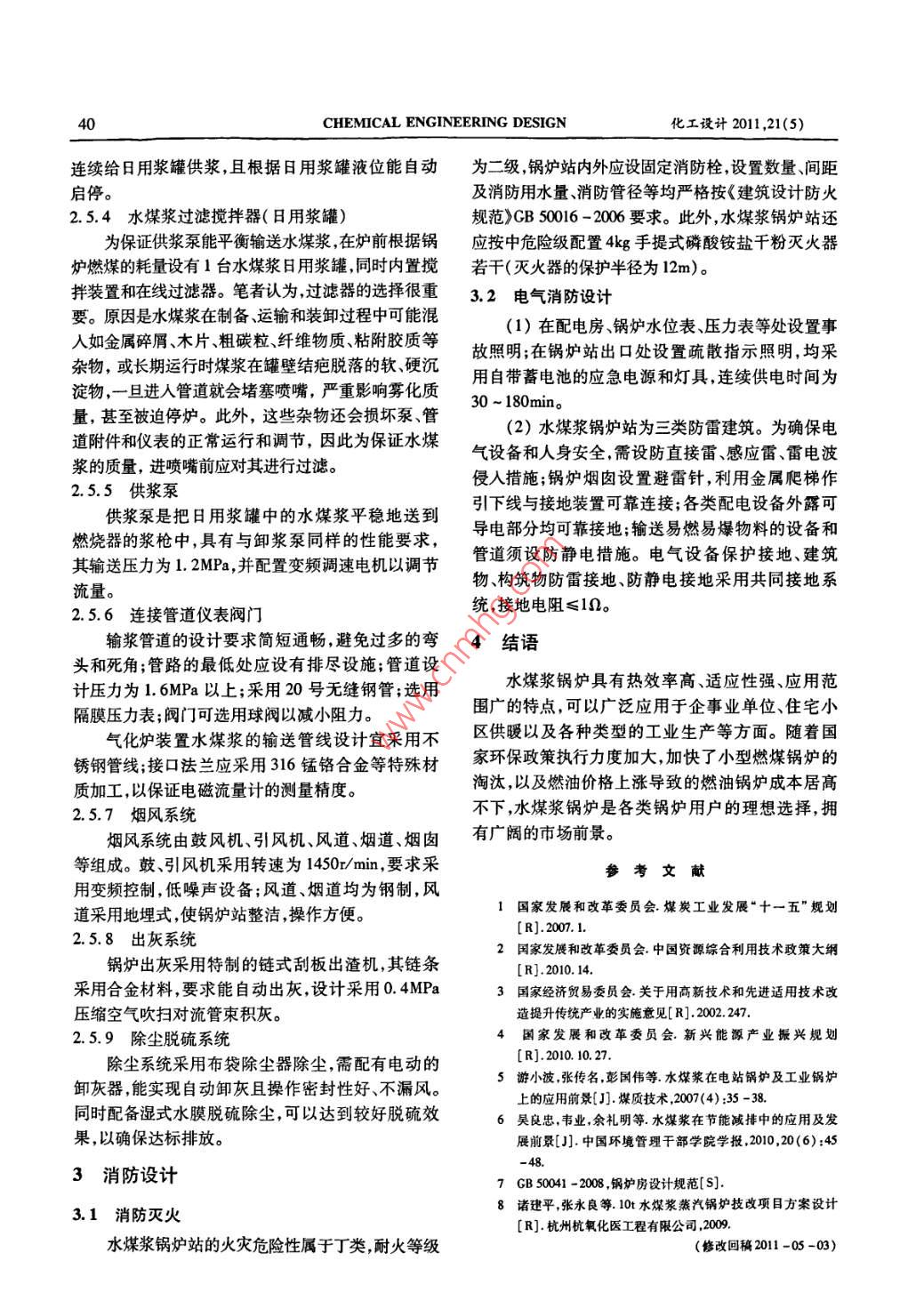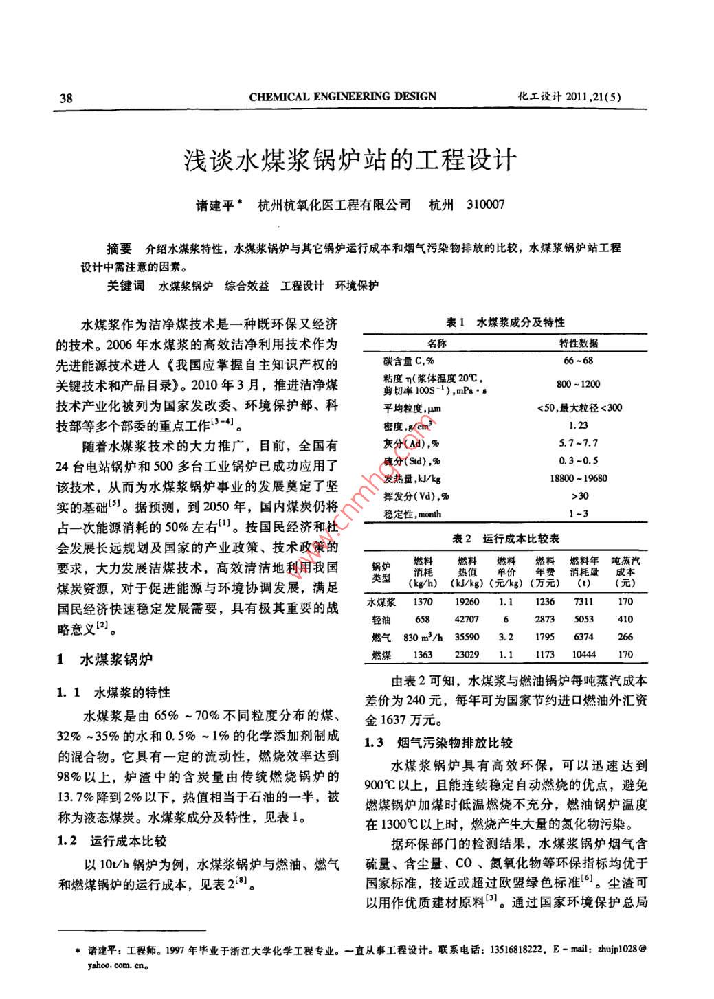 CHEMICAL ENGINEERING DESIGN化工設(shè)計2011,21(5)淺談水煤漿鍋爐站的工程設(shè)計諸建平*杭州杭氧化醫(yī)工程有限公司杭州310007摘要介紹水煤漿特性,水煤漿鍋爐與其它鍋爐運行成本和煙氣污染物排放的比較,水煤漿鍋爐站工程設(shè)計中需注意的因素。關(guān)鍵詞水煤漿鍋爐綜合效益工程設(shè)計環(huán)境保護水煤漿作為潔凈煤技術(shù)是一種既環(huán)保又經(jīng)濟表1水煤漿成分及特性的技術(shù)。2006年水煤漿的高效潔凈利用技術(shù)作為名稱特性數(shù)據(jù)先進能源技術(shù)進入《我國應(yīng)掌握自主知識產(chǎn)權(quán)的碳含量C,%關(guān)鍵技術(shù)和產(chǎn)品目錄》。2010年3月,推進潔凈煤粘度n(漿體溫度20℃,剪切率100s-1),mPa·800~1200技術(shù)產(chǎn)業(yè)化被列為國家發(fā)改委、環(huán)境保護部、科平均粒度,μm<50最大粒徑<300技部等多個部委的重點工作們密度,g/cm3隨著水煤漿技術(shù)的大力推廣,目前,全國有灰分(Ad),%5.77.724臺電站鍋爐和500多臺工業(yè)鍋爐已成功應(yīng)用了硫分(Sd),%0.3~0.5該技術(shù),從而為水煤漿鍋爐事業(yè)的發(fā)展奠定了堅發(fā)熱量,k/kg18800-19680揮發(fā)分(Vd),%實的基礎(chǔ)。據(jù)預(yù)測,到2050年,國內(nèi)煤炭仍將穩(wěn)定性, month占一次能源消耗的50%左右。按國民經(jīng)濟和社會發(fā)展長遠規(guī)劃及國家的產(chǎn)業(yè)政策、技術(shù)政策的衰2運行成本比較表要求,大力發(fā)展?jié)嵜杭夹g(shù),高效清潔地利用我國鍋爐消耗熱值單價年費消耗量成本煤炭資源,對于促進能源與環(huán)境協(xié)調(diào)發(fā)展,滿足國民經(jīng)濟快速穩(wěn)定發(fā)展需要,具有極其重要的戰(zhàn)水煤漿1370192601.112367311170略意義2)輕油65842707628735053燃氣830m3/h355903.2179563741水煤漿鍋爐燃煤13230291.1117310444由表2可知,水煤漿與燃油鍋爐每噸蒸汽成本1.1水煤漿的特性差價為240元,每年可為國家節(jié)約進口燃油外匯資水煤漿是由65%-70%不同粒度分布的煤、金1637萬元。32%~35%的水和0.5%~1%的化學(xué)添加劑制成1.3煙氣污染物排放比較的混合物。它具有一定的流動性,燃燒效率達到水煤漿鍋爐具有高效環(huán)保,可以迅速達到98%以上,爐渣中的含炭量由傳統(tǒng)燃燒鍋爐的900℃以上,且能連續(xù)穩(wěn)定自動燃燒的優(yōu)點,避免13.7%降到2%以下,熱值相當于石油的一半,被燃煤鍋爐加煤時低溫燃燒不充分,燃油鍋爐溫度稱為液態(tài)煤炭。水煤漿成分及特性,見表1。在1300℃以上時,燃燒產(chǎn)生大量的氮化物污染。1,2運行成本比較據(jù)環(huán)保部門的檢測結(jié)果,水煤漿鍋爐煙氣含以10υh鍋爐為例,水煤漿鍋爐與燃油、燃氣硫量、含塵量、CO、氮氧化物等環(huán)保指標均優(yōu)于和燃煤鍋爐的運行成本,見表21。國家標準,接近或超過歐盟綠色標準6。塵渣可以用作優(yōu)質(zhì)建材原料。通過國家環(huán)境保護總局諸建平:工程師。1997年畢業(yè)于浙江大學(xué)化學(xué)工程專業(yè)。一直從事工程設(shè)計。聯(lián)系電話:135168182,E-mil: zhuji028@ahoo. com. cno011,21(5)諸建平淺談水煤漿蝸爐站的工程設(shè)計編制的有關(guān)環(huán)境影響報告表的有關(guān)數(shù)據(jù),水煤漿爐的正常運行與鍋爐的蒸汽壓力水煤漿流量、送鍋爐與其它鍋爐煙氣污染物排放比較,見表3。風(fēng)量、爐膛負壓等工藝參數(shù)與燃燒都有著密切的關(guān)表3煙氣污染物排放比較系,將這些工藝參數(shù)關(guān)聯(lián)起來組成一個自動控制系水煤漿輕柴油重油Ⅱ類煙煤統(tǒng)。通過各參數(shù)的互相調(diào)節(jié),自動控制系統(tǒng)能完成燃料灰分,%0.010.232.48以下功能:燃料硫分,%0.251.5(1)穩(wěn)定髙溫熱源。除塵器(除塵率),%不用不用脫硫裝置(脫硫效0(2)實現(xiàn)不間斷連續(xù)穩(wěn)定運行率),%不用不用70-30(3)提高加熱爐整體運行效率。CB13271,I類區(qū)Ⅱ時段煙塵要求,ng/Nm2(4)配備非正常工況下的安全聯(lián)鎖反饋保護和GB371,I類區(qū)Ⅱ時段9(500)500非正常工況下的預(yù)警、報警等控制程序來保證水煤SO2要求mg/Nm漿鍋爐的安全運行。實際煙塵濃度,mg/Nm339.8(59.4)<80<80此外,水煤漿鍋爐必須與鼓風(fēng)機、引風(fēng)機、供漿實際SO2濃度,mg/Nm32538(393.5)450泵、過濾攪拌器之間進行聯(lián)鎖動力控制,以保證加格林曼黑度啟熱爐安全運行。B13271符合規(guī)定禁止不符合2.4消耗定額及配套動力是否符合環(huán)保要求符合區(qū)使用以10/h水煤漿鍋爐為例,年生產(chǎn)按300d計,注①表中“()內(nèi)數(shù)字按燃油鍋爐即過??諝庀禂?shù)a=1.2的標每天連續(xù)運行。由每10t蒸汽消耗的水煤漿為準計算:②水煤漿鍋爐實際數(shù)據(jù)以浙環(huán)監(jiān)(200質(zhì)字08號為準:⑤水1370kg,軟化水為It,電為23.5kWh,壓縮空氣為煤漿鍋爐燃燒效率>85%(經(jīng)過布袋除塵及脫硫后,相當于使用輕柴48Nm3。經(jīng)計算,每年需消耗水煤漿為9864,軟化油),Ⅱ類煙煤鍋爐燃燒效率<70%。在當前環(huán)保要求高的情況下,水煤漿鍋爐最大水為72×10′t,電為169×10°kWh,壓縮空氣為限度地吸取了燃煤和燃油鍋爐的優(yōu)勢,解決了傳統(tǒng)5.62×105Nm3。燃煤鍋爐容易污染環(huán)境和燃油鍋爐運行成本高的2.5設(shè)備選型問題,真正實現(xiàn)了環(huán)保與經(jīng)濟的雙贏,實現(xiàn)了經(jīng)濟水煤漿鍋爐站的設(shè)備布置必須要滿足生產(chǎn)、檢效益與社會效益的最佳結(jié)合