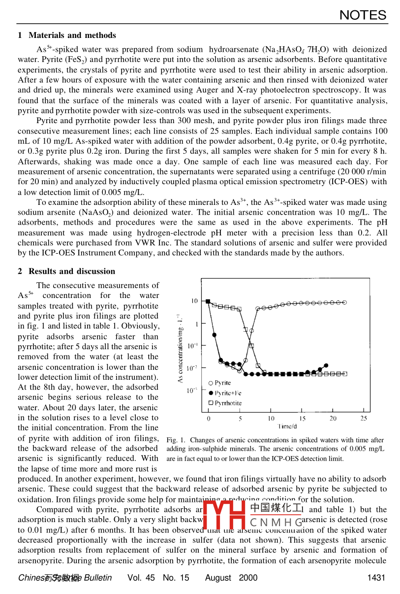 NOTESArsenic removal from water by iron- sulphide mineralsHAN Jingtai1,2 & William S. Fyfe21. Institute of Geology and Geophysics, Chinese Academy of Sciences, Beijing 100029, China;2. Department of Earth Sciences, the University of Westerm Ontario, London, Ontario N6A 5B7, CanadaCorrespondence should be addressed to Han Jingtai (-mail: jhan@ julian. uwo.ca)Abstract In bench-scaled experiments, iron-sulphide minerals, pyrite and pyrrhotite are used asadsorbents for arsenic removal from As-spiked water of As+ and As+ species. The adsorption rate,efficiency,As-adsorption stability and the associated pH conditions have been examined.Observations indicate that these iron-sulphide minerals are very efficient to adsorb arsenic fromwater for both As5+ and As3+ species. Similar to other studies, As3+-adsorption shows a slower ratethan As3+. The stability of the adsorbed arsenic seems closely related to the pH values of thesolution. A lower pH level commonly less than 4.0 is required to protect the adsorbed arsenic fromserious oxidation and backward release. Fining of the mineral powders and shaking of the solutionduring adsorption enhance the adsorption efficiency and adsorption rate. For practical use of themethod presented in this study, the waste produced should be managed with great care to keep itfrom redistribution over water system. A further study of the protection for the waste from oxidationon real water systems will greatly enhance the application of the strong ability of arsenic adsorptionby these minerals, which is observed from this study.Keywords: arsenic contamination, arsenic removal, ironsulphide minerals.Arsenic contamination of drinking water has been reported from many parts of the worldincluding Asia, Europe and America along the belt of low latitudes. It causes a variety of diseasesparticularly skin cancer12. Detailed studies of arsenic contamination of water system and theassociated arsenism in the areas of Xinjiang, China have been carried out for years [3]. Arsenic poisoningin Bengal and western India occurred in recent years, where millions of people are poisoned or in therisk of arsenic poisoning, is claimed as“the worst hydrogeological problem in the world", or“theworld' s biggest environmental health disaster"H. The recent literature is flooded with such reportsl4“8The World Health Organization suggests to lower the limits of 0.05 mg/L arsenic of the old standard tobe less than 0.01 mg/L9, and the US Environmental Protection Agency proposes a further lower limitof 0.002 mg/L5]. The World Bank has recently announced a US$32.4 million, zero-interest loan toBangladesh for work to reduce the problemt 10]. With increase in coal consumption and mining of goldand other metal ores in China, which are the major sources of arsenic pollution, arsenic contaminationof the environment will certainly be a big potential problem, and thus studies of arsenic pollution andtreatment of removal are in great importance for human health and economic development of the entirenation.Numerous studies of arsenic removal from drinking water and waste waters use methodsinvolving chemical precipitation such as alum and iron precipitationl “13), lime softeningl4.15],membranesl16l, colloidal flotationl7), adsorption by activated iron and aluminall3], and ion exchangeresin[16]. However, all the available treatments have some defects either in their efficiency or wastedisposal problems they producedllo, or expensive equipments required, which poses the difficulties fortheir application for areas under poor economic conditions. This study try to search for some geologicmaterials practical in use to remove arsenic from water, which has the potential in large scales oftreatment of arsenic removal from water systems.Arsenic is frequently associated with sulphide minerals and typically forms its own minerals likearsenopyrite (FeAsS)I8), so that arsenic commonly cnpantrntad in mon; tnes of sulphide mineraldeposits with gold. Some extreme examples of pol中國煤化工arelessagemennt ofmine waste as in the Mediterranean[19l. On theC N M H G arsenic with sulphideminerals raises a potential use of sulphide minerals I0r arsenic removal rrom water. In this study, weshow the possibility of these minerals in practice to adsorb arsenic from arsenic-spiked waters throughbench-scaled experiments.1430Chinese Science BulletinVol.45 No. 15August 2000NOTES1 Materials and methodsAs+-spiked water was prepared from sodium hydroarsenate (Na2HAsO4 7H2O) with deionizedwater. Pyrite (FeS2) and pyrhotite were put into the solution as arsenic adsorbents. Before quantitativeexperiments, the crystals of pyrite and pyrrhotite were used to test their ability in arsenic adsorption.After a few hours of exposure with the water containing arsenic and then rinsed with deionized waterand dried up, the minerals were examined using Auger and X-ray photoelectron spectroscopy. It wasfound that the surface of the minerals was coated with a layer of arsenic. For quantitative analysis,pyrite and pyrrhotite powder with size-controls was used in the subsequent experiments.Pyrite and pyrrhotite powder less than 300 mesh, and pyrite powder plus iron filings made threeconsecutive measurement lines; each line consists of 25 samples. Each individual sample contains 100mL of 10 mg/L As-spiked water with addition of the powder adsorbent, 0.4g pyrite, or 0.4g pyrrhotite,or 0.3g pyrite plus 0.2g iron. During the first 5 days, all samples were shaken for 5 min for every 8 h.Afterwards, shaking was made once a day. One sample of each line was measured each day. Formeasurement of arsenic concentration, the supernatants were separated using a centrifuge (20 000 r/minfor 20 min) and analyzed by inductively coupled plasma optical emission spectrometry (ICP-OES) with .a low detection limit of 0.005 mg/L.To examine the adsorption ability of these minerals to As3+, the As 3+-spiked water was made usingsodium arsenite (NaAsO2) and deionized water. The initi