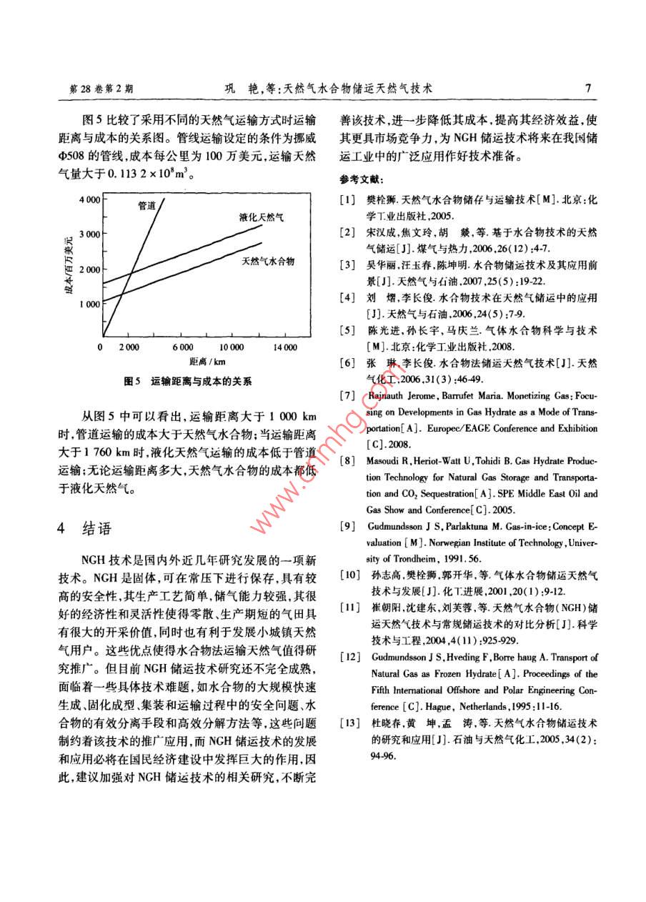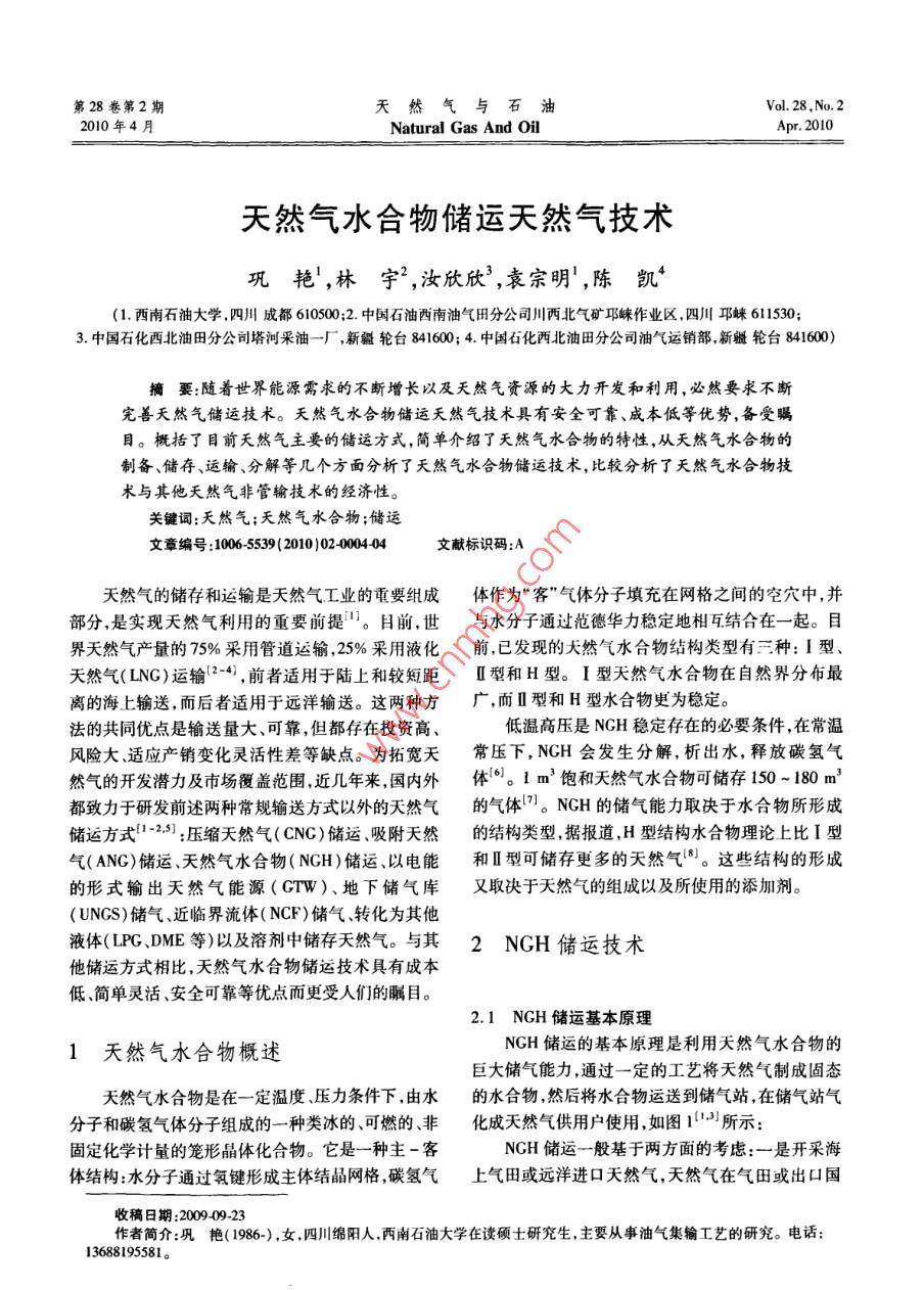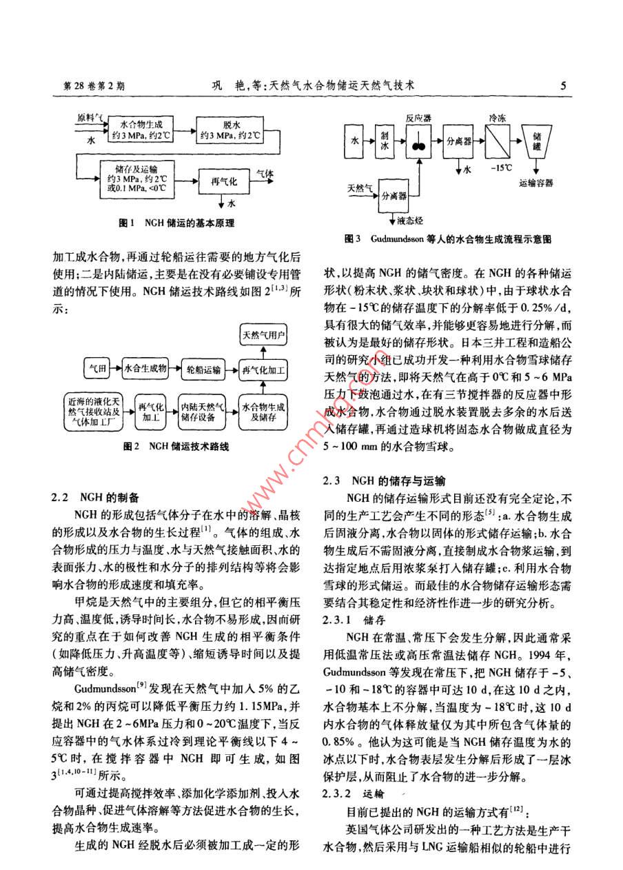 第28卷第2期天然氣與石油Vol 28. No. 22010年4月Natural Gas And Oil2010天然氣水合物儲運天然氣技術(shù)鞏艷!,林宇2,汝欣欣3,袁宗明,陳凱(1.西南石油大學四川成都610500;2.中國石油西南油氣田分公司川兩北氣礦邛崍作業(yè)區(qū),四川邛崍6l530;3中國石化西北油田分公司塔河采油一廠,新疆輪臺841600;4.中國石化西北油田分公司油氣運銷部新疆輪臺841600)摘要:隨著世界能源需求的不斷增長以及天然氣資源的大力開發(fā)和利用,必然要求不斷完善天然氣儲運技術(shù)。天然氣水合物儲運天然氣技術(shù)具有安全可靠、成本低等優(yōu)勢,備受矚目。概括了目前天然氣主要的儲運方式,簡單介紹了天然氣水合物的特性,從天然氣水合物的制備、儲存、運輸、分解等幾個方面分析了天然氣水合物儲運技術(shù),比較分析了天然氣水合物技術(shù)與其他夭然氣非管輸技術(shù)的經(jīng)濟性關(guān)鍵詞:天然氣;天然氣水合物;儲運文章編號:10065539(2010)024000404文獻標識碼:A天然氣的儲存和運輸是天然氣工業(yè)的重要組成體作為“客”氣體分子填充在網(wǎng)格之間的空穴中,并部分,是實現(xiàn)天然氣利用的重要前提。目前,世與水分子通過范德華力穩(wěn)定地相互結(jié)合在一起。目界天然氣產(chǎn)量的75%采用管道運輸,25%采用液化前,已發(fā)現(xiàn)的天然氣水合物結(jié)構(gòu)類型有三種:I型天然氣(LNG)運輸2-4,前者適用于陸上和較短距型和H型。I型天然氣水合物在自然界分布最離的海上輸送,而后者適用于遠洋輸送。這兩種方廣,而Ⅱ型和H型水合物更為穩(wěn)定。法的共同優(yōu)點是輸送量大、可靠,但都存在投資高、低溫高壓是NGH穩(wěn)定存在的必要條件,在常溫風險大適應(yīng)產(chǎn)銷變化靈活性差等缺點。為拓寬天常壓下,NGH會發(fā)生分解,析出水,釋放碳氫氣然氣的開發(fā)潛力及市場覆蓋范圍,近幾年來,國內(nèi)外體。1m3飽和天然氣水合物可儲存150-180m3都致力于研發(fā)前述兩種常規(guī)輸送方式以外的天然氣的氣體。NGH的儲氣能力取決于水合物所形成儲運方式-25:壓縮天然氣(CNG)儲運、吸附天然的結(jié)構(gòu)類型,據(jù)報道H型結(jié)構(gòu)水合物理論上比I型氣(ANG)儲運天然氣水合物(NCH)儲運、以電能和Ⅱ型可儲存更多的天然氣。。這些結(jié)構(gòu)的形成的形式輸出天然氣能源(CrW)、地下儲氣庫又取決于天然氣的組成以及所使用的添加劑。(UNGS)儲氣、近臨界流體(NCF)儲氣、轉(zhuǎn)化為其他液體(LPG、DME等)以及溶劑中儲存天然氣。與其2NGH儲運技術(shù)他儲運方式相比,天然氣水合物儲運技術(shù)具有成本低、簡單靈活、安全可靠等優(yōu)點而更受人們的矚日。2.1NGH儲運基本原理1天然氣水合物概述NGH儲運的基本原理是利用天然氣水合物的巨大儲氣能力通過一定的工藝將天然氣制成固態(tài)天然氣水合物是在一定溫度壓力條件下,由水的水合物然后將水合物運送到儲氣站在儲氣站氣分子和碳氫氣體分子組成的一種類冰的可燃的非化成天然氣供用戶使用如圖1)所示固定化學計量的籠形晶體化合物。它是一種主-客NGH儲運一般基于兩方面的考慮:一是開采海體結(jié)構(gòu):水分子通過氫鍵形成主體結(jié)晶網(wǎng)格,碳氫氣上氣田或遠洋進口天然氣天然氣在氣田或出口國收稿日期:20090923作者簡介:鞏艷(1986-),女四川綿陽人,兩南石油大學在讀碩士研究生,主要從事油氣集輸工藝的研究。電話13688195581。第28卷第2期鞏艷,等:天然氣水合物儲運天然氣技術(shù)物生成a,約2c約3Ma,約2℃分離器↓水-5℃約3MPa,約2℃或01MPa,<0℃再氣化天然氣運輸容器分離器圖1NGH儲運的基本原理ψ液態(tài)烴圖3 Gudmundsson等人的水合物生成流程示意圖加工成水合物,再通過輪船運往需要的地方氣化后使用;二是內(nèi)陸儲運,主要是在沒有必要鋪設(shè)專用管狀,以提高NGH的儲氣密度。在NGH的各種儲運道的情況下使用。NGH儲運技術(shù)路線如圖23所形狀(粉末狀漿狀、塊狀和球狀)中,由于球狀水合物在-15℃的儲存溫度下的分解率低于0.25%/d具有很大的儲氣效率,并能夠更容易地進行分解,而天然氣用戶被認為是最好的儲存形狀。日本三井工程和造船公氣田上水合生成物叫輪船運輸→再氣化加1司的研究小組已成功開發(fā)一種利用水合物雪球儲存天然氣的方法,即將天然氣在高于0℃和5~6MP壓力下鼓泡通過水,在有三節(jié)攪拌器的反應(yīng)器中形然氣接收站及一再氣化內(nèi)陸天然氣小水合物生成成水合物,水合物通過脫水裝置脫去多余的水后送氣體加L廠人儲存罐,再通過造球機將固態(tài)水合物做成直徑為圖2NGH儲運技術(shù)路線5-100mm的水合物雪球。2.3NGH的儲存與運輸22NGH的制備NGH的儲存運輸形式目前還沒有完全定論,不NGH的形成包括氣體分子在水中的溶解、晶核同的生產(chǎn)工藝會產(chǎn)生不同的形態(tài):a.水合物生成的形成以及水合物的生長過程。氣體的組成水后固液分離水合物以固體的形式儲存運輸;b.水合合物形成的壓力與溫度、水與天然氣接觸面積、水的物生成后不需固液分離直接制成水合物漿運輸,到表面張力、水的極性和水分子的排列結(jié)構(gòu)等將會影達指定地點后用濃漿泉打入儲存罐;c.利用水合物響水合物的形成速度和填充率。雪球的形式儲運。而最佳的水合物儲存運輸形態(tài)需甲烷是天然氣中的主要組分,但它的相平衡壓要結(jié)合其穩(wěn