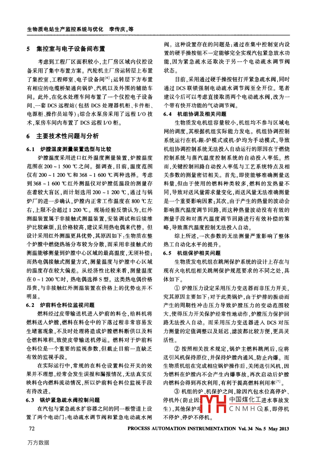 生物質(zhì)電站生產(chǎn)監(jiān)控系統(tǒng)與優(yōu)化李傳慶,等生物質(zhì)電站生產(chǎn)監(jiān)控系統(tǒng)與優(yōu)化Production Monitoring System in Biomass Power Station and Its Optimization李傳慶胡善云馬玉敏(國核電力規(guī)劃設(shè)計研究院電氣與儀控部,北京100095)摘要:根據(jù)依托項目介紹了生物質(zhì)電站的廠區(qū)物項關(guān)系、工藝子系統(tǒng)及其劃分。系統(tǒng)地闡述了生產(chǎn)監(jiān)控系統(tǒng)組成方案,并結(jié)合生物質(zhì)電站的特點,對儀控系統(tǒng)的相關(guān)技術(shù)問題進行了分析,問題涉及現(xiàn)場儀表的選型、設(shè)備安裝與調(diào)試、運行維護與管理等方面。最后,對生物質(zhì)電站生產(chǎn)監(jiān)控系統(tǒng)未來有待改進和提升的幾個方面進行了探討關(guān)鍵詞:生物質(zhì)電站監(jiān)控系統(tǒng)儀表與控制DCS智能設(shè)備現(xiàn)場總線中圖分類號:TP271文獻標志碼:AAbstract: In accordance with the specific relying project, the relationships among plant items of biomass power station, technologicalbsystems and their partition are introduced. The composition strategy of the production monitoring system are systematically described, andcombining with the features of the biomass power station, related technical issues of the instrument and control system are analyzed, includingthe model selection of the field instruments, device installation and commissioning, operation, maintenance and management, etc. Finally someof the topics for improving and enhancing the production monitoring system of biomass power station in future are investigatedKeywords: Biomass power station Monitoring system Instrument and control Distributed control system Intelligent device Field bus0引言1.1主機設(shè)備及參數(shù)主機設(shè)備主要包括秸桿鍋爐、汽輪機和發(fā)電機,具21世紀,人類面臨能源短缺和環(huán)境保護兩大核心體介紹如下。問題。大力發(fā)展可再生能源和清潔能源是解決上述①秸稈鍋爐,采用龍基生物發(fā)電工程有限公司產(chǎn)問題的一種重要途徑。生物質(zhì)能作為一種可再生的清品,型式為高溫、高壓參數(shù)自然循環(huán)爐,單鍋筒、單爐潔能源,國內(nèi)已有多家企業(yè)集團投資建設(shè)了多個生物膛、平衡通風(fēng)室外布置、固態(tài)排渣、全鋼構(gòu)架、底部支質(zhì)發(fā)電項目。相對于常規(guī)的燃煤機組,生物質(zhì)發(fā)電站撐結(jié)構(gòu)型鍋爐。鍋爐設(shè)備按燃燒硬質(zhì)秸稈燃料設(shè)計,具有燃料可再生、區(qū)域性收集運輸成本低、對環(huán)境污染并可摻燒≤10%的軟質(zhì)秸稈。小、項目投資少、建設(shè)周期快等一系列優(yōu)點。目前,生②汽輪機,采用青島捷能汽輪機股份有限公司產(chǎn)物質(zhì)能已經(jīng)成為我國分布式能源發(fā)電的一個重要組成品,型式為高溫高壓、單缸、單軸凝汽式汽輪機。部分241③發(fā)電機,采用濟南發(fā)電設(shè)備廠產(chǎn)品,額定功率生物質(zhì)電站生產(chǎn)監(jiān)控系統(tǒng)在整個設(shè)計流程、設(shè)計為30MW額定轉(zhuǎn)速為3000y/min,無刷勵磁系統(tǒng)。程序和設(shè)計管理方面與傳統(tǒng)火電站基本沒有區(qū)別1.2主要工藝系統(tǒng)及特點但在生產(chǎn)監(jiān)控網(wǎng)絡(luò)規(guī)劃與配置、儀控設(shè)備布置、技術(shù)接依托項目的主要工藝系統(tǒng)及特點介紹如下。口實施以及監(jiān)控系統(tǒng)所執(zhí)行的一些具體功能方面,其與傳統(tǒng)火電站有著明顯的不同。①給水系統(tǒng)設(shè)置兩臺150t/h的調(diào)速電動給水泵,一臺運行、一臺備用。1依托項目介紹②凝結(jié)水系統(tǒng)設(shè)置兩臺容量為100%的臥式電動凝結(jié)水泵,一臺運行、一臺備用依托工程主要是新建單元機組,不考慮再擴建工程于2010年9月正式開工,于2011年9月正式并③送風(fēng)系統(tǒng)由一臺為100%容量的送風(fēng)機和空預(yù)網(wǎng)發(fā)電器組成,引風(fēng)系統(tǒng)由一臺為100%容量引風(fēng)機將煙氣吸入布袋除塵器凈化,經(jīng)煙囪排向大氣修改稿收到日期:2012-05-2第一作者李傳慶(1981-),男,2006年畢業(yè)于東北電力大學(xué)控制理論④化學(xué)除V中國煤化工自動調(diào)節(jié)適與控制工程專業(yè),獲碩士學(xué)位,工程師;主要從事AP100核電站的常規(guī)應(yīng)不同工況CNMHG量,化學(xué)除鹽島、大型火電、新能源等電源項目的儀控系統(tǒng)設(shè)計與研究。水亦可直接作為凝汽器啟動補水PROCESS AUTOMATION INSTRUMENTATION VoL 34 No 5 May 2013生物質(zhì)電站生產(chǎn)監(jiān)控系統(tǒng)與優(yōu)化李傳慶,等⑤循環(huán)冷卻水系統(tǒng)是具有冷水塔的二次循環(huán)水的LCD、鍵盤及鼠標等,完成對機組的監(jiān)視、調(diào)整與控系統(tǒng),設(shè)有兩臺50%容量的循環(huán)水泵,用于向凝汽器、制。當(dāng)DCS發(fā)生全局性或重大故障時,按照“故障安冷油器發(fā)電機空冷器等設(shè)備提供循環(huán)冷卻水。全”的原則,通過安裝在操作臺上的少數(shù)獨立于DCS⑥燃料經(jīng)過螺旋給料機由一條上料皮帶機運送的硬接線手操設(shè)備,實現(xiàn)機組的緊急安全停機?;瘜W(xué)至位于爐前的秸稈料倉中,通過取料螺旋,由爐前料倉除鹽水處理系統(tǒng)納入DCS,在輔助車間內(nèi)設(shè)置一臺底取料分配至給料機送入爐膛燃燒。DCS操作員站,用于系統(tǒng)調(diào)試和臨時檢修維護,正常運2廠區(qū)物