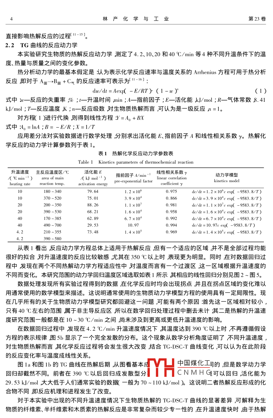 第23卷第4期林產(chǎn)化學(xué)與工業(yè)Vol 23 No2003年12月Chemistry and Industry of Forest ProductsDec.2003生物質(zhì)熱解動力學(xué)的研究蔣劍春,沈兆邦〔中國林業(yè)科學(xué)研究院林產(chǎn)化學(xué)工業(yè)研究所,江蘇南京210042)JIANGJC摘要:對木屑在不同的升溫速度下的熱解反應(yīng)動力學(xué)進行了研究。測試結(jié)果表明不同的升溫速度使生物質(zhì)的熱解反應(yīng)機理和過程發(fā)生了變化。在4.2和40℃/min的升溫速度下兩者反應(yīng)的TG-DSCT曲線有相似之處均岀現(xiàn)明顯的吸熱峰而在390℃以后升溫速度為4.2℃/min時熱解反應(yīng)動力學(xué)模型已經(jīng)不能用傳統(tǒng)的數(shù)學(xué)模型表示其反應(yīng)速率與升溫速度顯示了一個線性關(guān)系。40℃/min升溫速度時在3854φ0℃拐點范圍內(nèi)亦不能用通常使用的數(shù)學(xué)模型公式描述在490~700℃的范圍內(nèi)用數(shù)學(xué)模型可以表示,且線性回歸的相關(guān)性很好。其反應(yīng)活化能為29.53kJ/mol,大大低于人們通常試驗的數(shù)據(jù)(一般為70110 kI/mol)。10和20℃/min的升溫速度時其熱解反應(yīng)TG-DSC-T曲線相近且它們的反應(yīng)動力學(xué)數(shù)學(xué)模型基本符合傳統(tǒng)的表示方法。研究表明不同升溫速度決定了反應(yīng)的過程。研究結(jié)果可以推論快速熱解反應(yīng)的機理將不同于人們通常描述的步騾進行相應(yīng)的反應(yīng)活化能這一重要的物理參數(shù)會發(fā)生很大變化關(guān)鍵詞:生物質(zhì)熱解動力學(xué)中圖分類號Q351.2文獻標識碼文章編號0253-24172003)4-0001-06STUDY ON REACTION KINETICS OF BIOMASS PYROLYSISJIANG Jian-chun, shen Zhao-bangInstitute of Chemical Industry of Forest Products CAF Nanjing 210042 hinaAbstract: This paper deals with the test results of the study on the reaction kinetics of sawdust pyrolysis Under thedition of different temperature rising rate the reaction mechanism and process of biomass pyrolysiFor temperature rising rate of 4. 2 and 40C/min both TG-DSC-T curves are similar in their endothermal peaks. Fortemperature rising rate of 4. 2C/min over 390C chemical reactid by traditionalmathematical model and the reaction rate appears to be in a linear relation with reaction temperature. For heating rateof 40C/min within the scope of turning point( at 385-490C the reaction kinetics also can not be expressed withthe mathematical model formula used usually. However for reaction temperature in the scope of 490-700C the reac-tion kinetics can be expressed by mathematical model with very good correlation of linear regression, The reaction activation energy of E =29. 53 kJ/ mol is greatly lower than the data of the usual trial generally E=70-110 kJ/molFor temperature rising rate of 10 and 20 C/min both TG-DSC-T curves of pyrolysis reaction are similar and theirreaction kinetics mathematical models comform to the traditional expression method basically. These research resultsdicated that different heating rates detere the processhe deduced from test results that themechanism and process of fast pyroleaction are differer中國煤化工 lysis react,andorrespondingly the reaction activation energy an important phyYHCNMHGchange significantlyKey words biomass pyrolysis reaction kinetics*收稿日期2003-06-1作者簡介蔣劍春(1955-)男江蘇溧陽人研究員博士從事林產(chǎn)化學(xué)加工研究。產(chǎn)化學(xué)與工業(yè)生物質(zhì)熱解動力學(xué)是表征生物質(zhì)在熱分解反應(yīng)過程中反應(yīng)溫度、反應(yīng)時間等參數(shù)對物料或反應(yīng)產(chǎn)物轉(zhuǎn)化率的影響的一個十分重要的特性。動力學(xué)特性直接關(guān)系到生物質(zhì)熱化學(xué)利用。通過動力學(xué)分析可深入地了解反應(yīng)過程或機理還可預(yù)測反應(yīng)速率以及反應(yīng)的難易程度。生物質(zhì)是由纖維素、半纖維素和木質(zhì)素組成,它們的熱解過程十分復(fù)雜往往在進行動力學(xué)和熱解機理研究時需要進行一些假設(shè)將復(fù)雜的物理過程用較明了的動力學(xué)模型來表示。國內(nèi)外學(xué)者在生物質(zhì)熱解機理、反應(yīng)動力學(xué)和應(yīng)用技術(shù)方面做了大量的研究工作131Kung等對木材的熱解過程進行了理論研究采用一級反應(yīng)動力學(xué)的假設(shè)實驗計算得出數(shù)學(xué)模型。Klose等對山毛櫸和落葉松木材用鋅、鎂、鈣等金屬乙酸鹽預(yù)處理用熱重儀硏究了其熱解過程催化劑對熱解行為的影響并實驗確定相應(yīng)的動力學(xué)參數(shù)。 Janez等研究了木片在固定床氣化反應(yīng)器中氣化床層高度對氣體中CO和CO2組分的影響因素。 Kulla等研究了木屑的熱解動力學(xué)木屑進行熱化學(xué)分解的溫度為250~450℃反應(yīng)活化能大約在111~68.7kJ/mol。我國在非等溫動力學(xué)的研究方面起步較晚直到1980年前后才出現(xiàn)這方面的綜述文獻報道6]有關(guān)生物質(zhì)熱解和氣化動力學(xué)的研究工作更晚直至20世紀90年代才開始有少量的文獻報道11華南理工大學(xué)對幾種南方典型產(chǎn)品加工剩余物進行了工業(yè)分析和干燥、熱解實驗研究得到不同溫度下隨時間變化的失重曲線圖擬合岀相應(yīng)的干燥、熱解動力學(xué)曲線得到干燥、熱解反應(yīng)動力學(xué)參數(shù)。胡云楚等人3研究了木材熱解動力學(xué)分別研究和測定了在特定的升溫速度下木材的TG曲線并測定計算了熱解動力學(xué)參數(shù)。江叔琴等對4種生物質(zhì)原料的熱解過程進行了實驗研究,認為生物