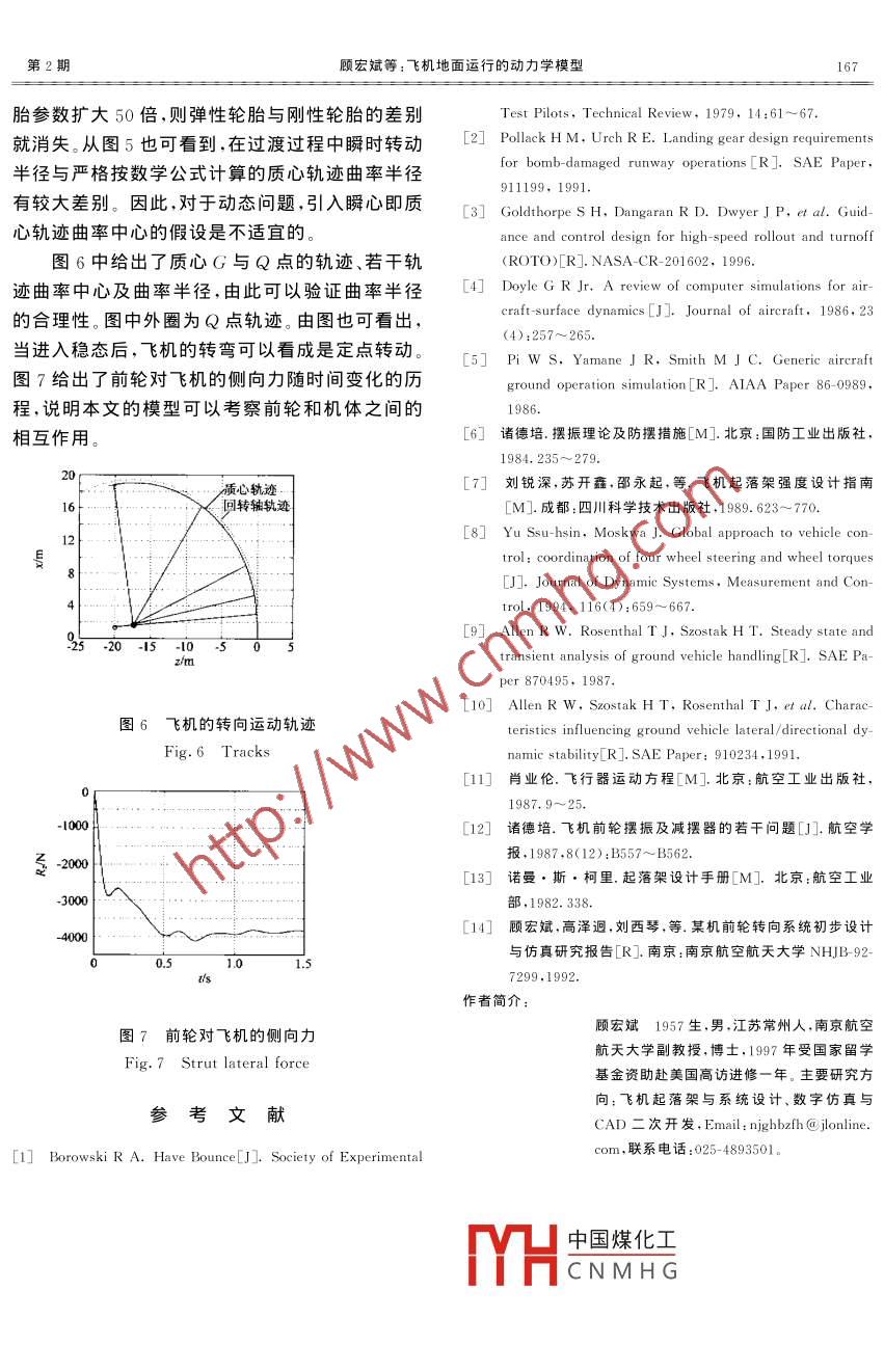 第22卷第2期航空學(xué)報(bào)ol. 22 No. 22001年ACTA AERONAUTICA ET ASTRONAUTICA SINICAMar.2001文章編號(hào):1000-6893(2001)02-016305飛機(jī)地面運(yùn)行的動(dòng)力學(xué)模型顧宏斌(南京航空航天大學(xué)民航學(xué)院,江蘇南京210016)DYNAMIC MODEL OF AIRCRAFT GROUND HANDLINGGU Hong-bin(Civil Aviation College, Nanjing University of Aeronautics & Astronautics, Nanjing 210016. China摘要:建立的飛機(jī)地面運(yùn)動(dòng)數(shù)學(xué)模型是“可操縱的”,機(jī)體有6個(gè)自由度。該模型只要給定操縱信號(hào),就能求岀前輪和飛機(jī)的運(yùn)動(dòng)及萁相互作用。飛機(jī)地面運(yùn)動(dòng)模型采用無(wú)滑動(dòng)輪胎模型,不再引入任何人為的運(yùn)動(dòng)學(xué)假設(shè),不要事先給定前輪轉(zhuǎn)角,不依賴(lài)于需要復(fù)雜測(cè)定旳側(cè)冋力函數(shù),考慮了輪胎的滾動(dòng)特性。對(duì)飛機(jī)的地面運(yùn)動(dòng)一直沿用瞬時(shí)轉(zhuǎn)動(dòng)中心等價(jià)于質(zhì)心軌跡的曲率中心的假設(shè)。研究表明,飛機(jī)的瞬時(shí)轉(zhuǎn)動(dòng)中心與質(zhì)心軌跡的曲率中心只在飛機(jī)穩(wěn)定轉(zhuǎn)彎時(shí)重合關(guān)鍵詞:飛機(jī);地面車(chē)輛;數(shù)學(xué)模型;動(dòng)力學(xué);前輪操縱轉(zhuǎn)向中圖分類(lèi)號(hào):V227+.5文獻(xiàn)標(biāo)識(shí)碼:AAbstract: The model of aircrafts ground motion is"operational", where the airframe has six degrees of free-dom. As long as the pilots command, the paddles displacement, for example, is given, the model can findout the motion of both the airframe and nose-wheel, and the interaction between them. The non-sliding mod-of tires is applied but no assumption of airframe's motion is adopted. The turning angle of the nose-wheelis not given in advance. The functions of tire force versus nose-wheel's turning angle are no longer neededhile the tire rolling coefficients are employed. There are assumptions about aircraft s ground motion; one ofthose widely used is"the center of simultaneous turning of the airframe is the same as the center of curvatureof the mass centers track". The research in this paper reveals that this is true only when the aircraft is in aKey words: aircraft: ground vehicles; mathematical models dynamics; steering以往在飛機(jī)研制過(guò)程中總是很重視飛機(jī)的空的相互耦合更為強(qiáng)烈,尤其需要全面考察飛機(jī)的中運(yùn)動(dòng)特性(即飛行運(yùn)動(dòng)特性)。但是,現(xiàn)代飛機(jī)對(duì)地面運(yùn)動(dòng)地面運(yùn)行特性的要求日益提高,同時(shí)也希望飛機(jī)仔細(xì)分析現(xiàn)有工作可以發(fā)現(xiàn),目前的模型還能在條件更為苛刻的場(chǎng)地運(yùn)行。例如,為了適應(yīng)未存在幾個(gè)方面的不足:①大多數(shù)模型不能同時(shí)考來(lái)戰(zhàn)場(chǎng)條件,軍用飛機(jī)要求能在簡(jiǎn)單修復(fù)或泥土慮6個(gè)自由度8,因此不便于考察各自由度之間道面起降2;為了減少對(duì)跑道的占用,要求現(xiàn)代的耦合、缺乏通用性;②大多數(shù)模型的未知數(shù)個(gè)數(shù)民用飛機(jī)能高速滑離跑道并轉(zhuǎn)入滑行道(High-大于方程個(gè)數(shù),因此只適用于給定運(yùn)動(dòng)求力Speed Rollout and Turnoff,簡(jiǎn)稱(chēng)ROTO)。另—或給定力求運(yùn)動(dòng);③不少模型引入幾何或速度關(guān)方面,不少飛機(jī)在研制和使用過(guò)程中也出現(xiàn)過(guò)地系假設(shè)或根據(jù)機(jī)輪偏角求輪胎側(cè)向力8-1的經(jīng)面運(yùn)行方面的問(wèn)題因此研究飛機(jī)的地面特性已驗(yàn)公式。在假設(shè)的合理性或數(shù)據(jù)的易得性方面尚變得越來(lái)越重要。不能令人滿(mǎn)意;④所有研究都是針對(duì)外部激勵(lì)的?,F(xiàn)有對(duì)飛機(jī)地面特性的研究主要集中在飛機(jī)即使是研究操縱系統(tǒng)設(shè)計(jì)問(wèn)題也是給定機(jī)輪偏的垂直運(yùn)動(dòng)狀態(tài)…(著陸緩沖、滑行減震)和前輪角(把機(jī)輪偏角作為操縱系統(tǒng)輸岀)。實(shí)際擺振穩(wěn)定性、滑跑穩(wěn)定性等方面6·7。而對(duì)飛機(jī)的中國(guó)煤化工機(jī)輪偏角是由機(jī)輪和飛6自由度地面運(yùn)動(dòng),特別是偏航和側(cè)向運(yùn)動(dòng)的研CNMHG操縱前輪,操縱系統(tǒng)的究明顯不足?,F(xiàn)代殲擊機(jī)常采用八字配置的機(jī)身原始輔出是作動(dòng)茼或液馬達(dá)等對(duì)前輪回轉(zhuǎn)體的式起落架。這種布局的飛機(jī)6個(gè)運(yùn)動(dòng)自由度之間驅(qū)動(dòng)力矩,機(jī)輪偏角是由機(jī)輪、驅(qū)動(dòng)力矩和飛機(jī)運(yùn)動(dòng)狀態(tài)共同作用的結(jié)果如果給定一個(gè)操縱信號(hào),收稿日期:2000-05-09;修訂日期:2000-09-01如腳蹬位移,飛機(jī)怎樣運(yùn)動(dòng),現(xiàn)有模型還不能很好文章網(wǎng)址http://www.hkxb.netcn/hkxb/2001/02/016地回答這個(gè)問(wèn)題164航空學(xué)報(bào)第22卷本文試圖建立較為完善的飛機(jī)地面運(yùn)行數(shù)學(xué)∑F:=Fm1+Fm2+Rz模型,并論證其可信度。1基本假設(shè)HR(Fml Fm?)-RzH(10)為考察飛機(jī)地面運(yùn)動(dòng)的基本特性,本文引入如下基本假設(shè):①飛機(jī)可視為剛體;②起落架支柱M,= lm(FmI+ Fm)+的軸向運(yùn)動(dòng)具有線性阻尼,即支柱軸向阻尼力與Mm2(11)支柱伸縮速度成線性函數(shù)關(guān)系。也即支柱相當(dāng)于SM=L,Nn-Lm(Nm+N空氣彈簧加線性阻尼;③起落架支柱為完全剛性,Hg(Qml +Qm2)+H Rz即起落架支柱的