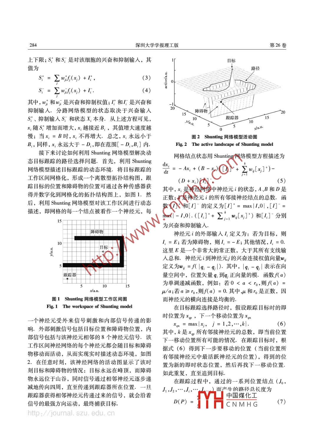 第26卷第3期深圳大學(xué)學(xué)報(bào)理工版Vo. 26 No. 32009年7月JOURNAL OF SHENZHEN UNIVERSITY SCIENCE AND ENGINEERINGJuly2009文章編號(hào):1000-2618(2009)03-0283-06【光電與信息工程】基于神經(jīng)動(dòng)力學(xué)的目標(biāo)跟蹤算法朱安民,明仲(深圳大學(xué)計(jì)算機(jī)與軟件學(xué)院,深圳51800)摘要:通過對(duì)神經(jīng)網(wǎng)絡(luò)模型的研究,將神經(jīng)動(dòng)力學(xué)的 Shunting模型應(yīng)用到目標(biāo)跟蹤系統(tǒng)中.該算法具有模型簡(jiǎn)單、參數(shù)不敏感、網(wǎng)絡(luò)運(yùn)算不易飽和、算法速度快,且不需要預(yù)設(shè)工作環(huán)境等優(yōu)點(diǎn),適用于未知?jiǎng)討B(tài)環(huán)境下的優(yōu)化目標(biāo)跟蹤. Matlab仿真試驗(yàn)表明,該算法可解決動(dòng)態(tài)環(huán)境下的目標(biāo)跟蹤.關(guān)鍵詞:神經(jīng)動(dòng)力學(xué);目標(biāo)跟蹤;路徑選擇;最短路徑;動(dòng)態(tài)環(huán)境中圖分類號(hào):0232文獻(xiàn)標(biāo)識(shí)碼:A目標(biāo)跟蹤技術(shù)在軍事、工業(yè)過程控制、醫(yī)學(xué)研傳統(tǒng)的線性控制理論或基于模型的控制方法,或因究、交通監(jiān)控及機(jī)器人導(dǎo)航等方面有廣泛應(yīng)用,是算法過于復(fù)雜而不適合快速變化的環(huán)境.現(xiàn)實(shí)中目自動(dòng)控制、人工智能、計(jì)算機(jī)應(yīng)用及機(jī)器人學(xué)等領(lǐng)標(biāo)跟蹤系統(tǒng)面對(duì)的是一個(gè)變化多端、動(dòng)態(tài)的未知環(huán)域的重要課題.許多研究小組提出了不同的目標(biāo)跟境.如何找到一種簡(jiǎn)單實(shí)時(shí)不需建立不同模型,就蹤方法',如Zh2提出連通圖搜索法,在整個(gè)工能穩(wěn)定、連貫、平滑地描述環(huán)境,且能適應(yīng)各種動(dòng)作環(huán)境中全面搜索所有可能路徑,并通過連通圖尋態(tài)無規(guī)律變化的環(huán)境,不需要學(xué)習(xí)就能記憶環(huán)境的找最短路徑;OloG3提出適應(yīng)于未知環(huán)境的Hy-算法呢?本文將著力解決這些問題bride模型,釆用模糊邏輯方法建立環(huán)境地圖并通過導(dǎo)航進(jìn)行目標(biāo)跟蹤; Cheng“提出用可變結(jié)構(gòu)的多1目標(biāo)跟蹤算法模型粒子過濾器算法解決局限于公路環(huán)境的目標(biāo)跟蹤; Cevher提出基于聲學(xué)和視屏狀態(tài)空間的粒子目標(biāo)跟蹤系統(tǒng)面對(duì)的是未知變化的動(dòng)態(tài)環(huán)境過濾器算法用以解決目標(biāo)跟蹤問題; zengin6提出基于 Shunting模型神經(jīng)動(dòng)力學(xué)的動(dòng)態(tài)活動(dòng)原理,即基于規(guī)則的智能知道策略用于無人駕駛飛行器在未把神經(jīng)網(wǎng)絡(luò)看作一種非線性動(dòng)力學(xué)系統(tǒng),能實(shí)時(shí)描知環(huán)境下跟蹤移動(dòng)目標(biāo); Helle提出超階趨勢(shì)場(chǎng)述未知的、變化的環(huán)境. Hodgkin和 Huxley-提出結(jié)合高度變換機(jī)制進(jìn)行路徑規(guī)劃和目標(biāo)跟蹤;Par-用電子線路元素實(shí)現(xiàn)生物細(xì)胞隔膜的方法.生物隔ker8提出基于聲學(xué)傳感器網(wǎng)絡(luò)和雙波陣面的路徑膜兩邊的電壓可通過方程(1)得到規(guī)劃進(jìn)行室內(nèi)環(huán)境下的目標(biāo)攔截; Tomono提出將目標(biāo)位置的不確定性用目標(biāo)幾何地圖和網(wǎng)格地圖上Cm=-(E,+Vm)g+(ena的分布可能性來決定;Chen0提出車輛跟蹤算法Vm)gNa -(e+Vm)ge.對(duì)汽車導(dǎo)航,該包括一個(gè)目標(biāo)跟蹤模塊和一個(gè)障礙其中,C為電容;g為電導(dǎo);E為電壓,通過參數(shù)替物規(guī)避模塊; Glasius r提出 Hopfield神經(jīng)網(wǎng)絡(luò)模換,可得分路方程型,在跟蹤目標(biāo)時(shí)可避開障礙物自動(dòng)選擇路徑.也Ax1+(B1-x2)S:(t)有學(xué)者提出通過自組織學(xué)習(xí)產(chǎn)生實(shí)時(shí)路徑的神經(jīng)網(wǎng)絡(luò)模型.但至今大多數(shù)目標(biāo)跟蹤方法都需假定(D+xS,(2環(huán)境的精確數(shù)學(xué)模型已知,并忽略干擾,采用基于其中,x是電壓;A為被動(dòng)衰減率;B;和D是電壓的收稿日期:2008-04-09;修回日期:2009-04-11基金項(xiàng)目:國(guó)家自然科學(xué)基金資助項(xiàng)目(60673122);深圳大學(xué)科研啟動(dòng)基金資助項(xiàng)目(2007作者簡(jiǎn)介:朱安民(1964-),男(漢族),江西省上高縣人,深圳大學(xué)副教授、博土.E-muilYH中國(guó)煤化工CNMHG284深圳大學(xué)學(xué)報(bào)理工版第26卷上下限;S;和S是對(duì)該細(xì)胞的興奮和抑制輸入,其目標(biāo)值為路徑s:=∑f(x)+∫(x)+1(4)其中,v和是興奮和抑制權(quán)值;F和是興奮和抑制輸入.分路網(wǎng)絡(luò)模型的狀態(tài)取決于興奮輸入障礙物S'、抑制輸入S:和狀態(tài)X本身.從上述方程可見跟蹤爺10x;隨S;增加而增大,x;越接近B;,其值增大速度越慢;當(dāng)x=B時(shí),x不再增大.總之,x永遠(yuǎn)小于圖2 Shunting網(wǎng)絡(luò)模型活動(dòng)圖B1,同樣,x1永遠(yuǎn)大于-D1,即在范圍[-D,B1]內(nèi)Fig. 2 The active landscape of Shunting model接下來討論如何利用 Shunting網(wǎng)絡(luò)模型解決動(dòng)網(wǎng)格結(jié)點(diǎn)狀態(tài)用 Shunting網(wǎng)絡(luò)模型方程描述為態(tài)目標(biāo)跟蹤的路徑選擇問題首先,利用 Shunting dx-Ax+(B-x)([+2m]”)網(wǎng)絡(luò)模型描述目標(biāo)跟蹤的動(dòng)態(tài)環(huán)境.將目標(biāo)跟蹤的工作區(qū)間網(wǎng)格化,形成一個(gè)離散型拓?fù)浣Y(jié)構(gòu)圖,跟蹤目