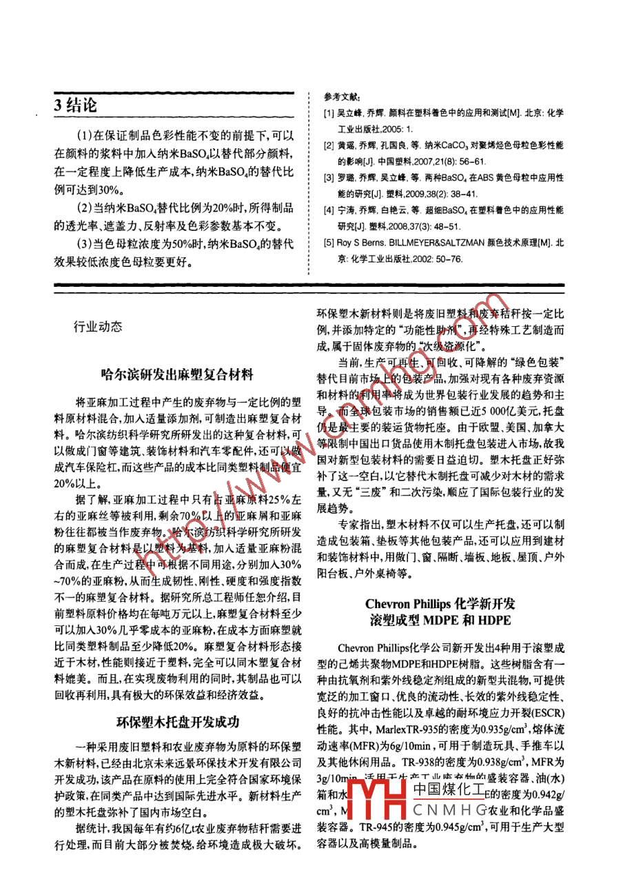 文章編號:1005-3360(2009)11005305納米硫酸鋇對高濃度聚烯烴色母粒色彩性能的影響Effect of Nano-BaSO4 on Color Properties of High ConcentrationPolyolefine masterbatch武鵬郭婷,喬輝,吳立峰劉建勝2 Wu Peng’, Guo Ting, Qiao Hui, Wu Lifeng', Liu Jiansheng2京化工大學(xué)材料科學(xué)與工程lege of Materials Science and Engineenng. Beyrng University of Chemical Technology. Bejing 100029. China2. Shanghai JECO Pigment (Group) Co. Ltd. Shanghal 201209, China將納米Baso加入到額料的漿料中進行充分?jǐn)嚢韪杀?制備成高濃度聚烯烴色母粒。利用測色儀測定色母粒制成的薄膜和樣板制品的著色力和遽力,研究其對色母粒色彩性能的影響。結(jié)果表明:在不改變被著色制品色彩性能的前提下,納米BaSO4可以譬代部分顏料,代最大比例可達到30%。在色母粒濃度為50%時,納米BaSO替代顏料的效果最好。當(dāng)納米BaSO替代比例為20%時,所得制品的色彩性能與純PB15:3藍顧料色母粒最為接近Abstract: The high concentration polyolefine masterbatch was prepared by adding Nano-BaSo into theslurry of pigment, stirring fully and drying. The effect of nano-Basoa on the color properties ofpolyolefine masterbatch was studied through the coloring strength and covering power measuredby color photometer of the membrane and template product made of color masterbatch. Theresults showed that under the prerequisite of constant color properties of colored productswithout affecting the properites of the product, nano- Baso, could be used as a substituteof partial pigment, and the maximum proportion is up to 30%. when the concentration of20%, the color properties were nearly the same as pure polyolefine masterbatch nano-BaSo, wasmasterbatch was 50%, the substitute effect was optimal; and when the dosage of關(guān)鍵詞:聚烯烴;納米硫酸鋇色母粒;分散性中圖分類號:TQ325.1·文獻標(biāo)識碼:Ae Key words: Polyolefine; Nano-BaSO4: Masterbatch; Dispersion色母粒亦稱顏料濃縮物是目前塑料著色最常11原料用的物料。色母粒是將顏料按20%~80%比例經(jīng)研磨或雙螺杄擠岀均勻地分散到樹脂中而制得的顏低密度聚乙烯LDPE),F7B,北京燕化石油色顆粒叫。制備高濃度色母粒時,必須保證顏料具化工股份有限公司有較好的分散性聚丙烯(PP),K1008,北京燕化石油化工股份據(jù)文獻2“報道在顏料為干粉狀態(tài)下混入納米:有限公司BaSO4納米CaCO3制成低濃度色母粒(顏料濃度為;聚乙烯蠟LPE4F],北京化工大學(xué)精細化工廠;20%),納米BaSO4、納米CaCO替代部分顏料后不:納米BaSO,Cmb-600,上海安億納米材料有限會影響被著色制品的色彩性能,并可以提高顏料的:公司分散性。有機藍顏料,CIPB15:3,上海捷虹顏料化工本實驗將納米BaSO加入到漿料狀態(tài)的顏料集團工貿(mào)發(fā)展有限公司中進行混合將該預(yù)混合好的顏料制備成高濃度色1.2主要似凸各母粒硏究了在這種濕法混合工藝下,納米BaSO2對中國煤化工高濃度聚烯烴色母粒色彩性能的影響。CNMHG膠機械廠擠出吹膜機組,PID651,德國 Brabender公司實驗部分注射機,JPH0,廣東泓利機器有限公司;毫悟把070分光光度計,722,上海精密儀器廠測試;并直接用注射樣板在測色儀上進行著色力、積分球式測色儀, Color i5,愛色麗有限公司反射率測試。1.3實驗步驟2結(jié)果與討論首先,將納米BaSO按照色母粒配方(表1)定量加入到顏料的漿料中高速攪拌1h,經(jīng)抽濾干燥后色彩性能是色母粒有別于其他功能母粒最重粉碎,用于制備高濃度聚烯烴色母粒。色母粒的制:要的性能可以通過研究其制品的遮蓋力、反射率備實驗工藝流程如圖1所示。L、a、b‘值及色差等指標(biāo)對色彩性能做出較為全載體樹脂擠出吹膜→遮蓋力面的評價圓料十區(qū)輥造注射樣板→色彩性21納米BaSO對溥膜透光率的影響份散劑▲田1色母粒制備工藝流透光率反映薄膜的透光能力透光率越大薄Fig. 1 The process of preparaton of color masterbatch膜的透光能力越強,薄膜中顏料的遮蓋力就越低。用雙輥塑煉機將含有不同比例納米BaSO的氵薄膜的透光率越小薄膜中顏料的遮蓋力就越好。顏料按配方制備色母粒。雙輥塑煉機溫度保持:圖2為不同比例納米BSO替代顏料制成薄膜的透在105℃左右,首先加入載體樹脂混合2~3min,均光率。勻分散后加入分散劑,混合3min左右,加入顏料,8min左右后收料并用剪刀將物料剪成粒狀制得氵色母粒。其中色母粒中顏料和BaSO的總含量為40%(1)和50%(2)。具體配方如表所示▲豪1制備色母粒實驗配方Tab. 1 The formula of preparation of color masterbatch分散劑顏料Bas050400450500506006070波長/m00000000862080502468(a)1配方00000400004000125(b)2配方1一不加BaSO:2替代10%:3替代20%:4—替代30%▲圖2不同比例納米BaSO管代服料對原透光率的影響注:用納米BaSO分別替代5%、10%、15%、20%、25%、30%的顏料ig. 2 The effect of different ratio nano-Baso, on the hght transmittance將制好的色母粒分別加入到150gPE中吹膜,由圖(a)可以看出,納米BaSO替代比例為使薄膜中顏料和納米BaSO4總含量為1%10%的薄膜透光率略低于純PB15:3藍膜的透光率,將制好的色母粒分別加入到150gPP中注射樣:其他比例均高于PB5:3藍膜的透光率板使樣板中顏料和納米BaSO總含量為04%。中國煤化工比例為30%薄膜透14性能測試光CNMHG率其他替代比例下膜透光率均低十純PB5:3膜的透光率用分光光度計對吹塑薄膜進行透光率、遮蓋率22納米BaSO4對薄膜遮蓋力的影響B(tài)aSO的加入可以有效地改善色母粒中顏料的分:散性,從而使薄膜的透光率下降,光密度值提髙。對制備色母粒而言顏料分散的
