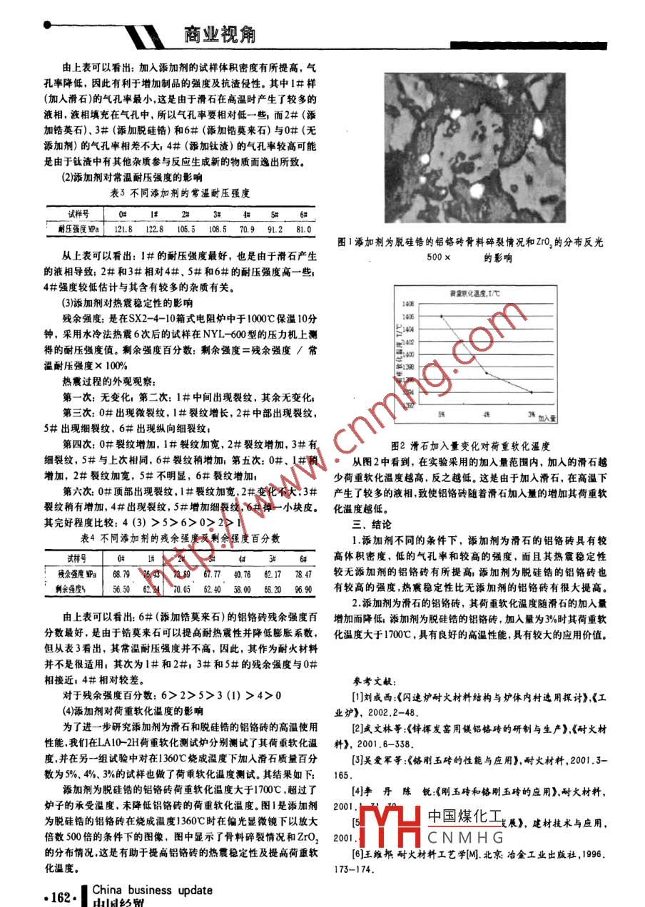 ●商業(yè)視角U添加劑對(duì)鋁鉻磚性能的影響王志蘊(yùn)(天津榮程聯(lián)合鋼鐵集團(tuán)有限公司,天津300352)摘要:本文通過(guò)研究對(duì)鋁鉻磚中加入不同種類和添加量的添加劑對(duì)鋁鉻磚性能的影響,得出了在鋁鉻磚中加入5%的滑石和3%的脫硅鋯.所得到的鋁鉻磚比無(wú)添加劑的鋁鉻磚性能有所提高。其中添加劑為滑石的鋁鉻磚荷重軟化溫度有所降低,添加劑為脫硅鋯的鋁鉻磚荷重軟化溫度未受很大影響。關(guān)鍵詞:鋁鉻磚;添加劑,性能表|試樣的顆粒配比表隨著強(qiáng)化冶煉櫟作的應(yīng)用,有色金屬爐窯對(duì)使用的耐火材料提出了更高的要求。冶煉過(guò)程中,表面組分會(huì)因高溫金屬液蝕侵而進(jìn)入熔融金屬中,影響產(chǎn)品質(zhì)量,特別是生產(chǎn)高純度的金屬或25合金時(shí),尤為突出。顯然,提高耐火材料性能,有助于提高產(chǎn)品的純度及降低成本。對(duì)鋁鉻系耐火材料研究表明Cr,0,在12~3916樓 3.3 2526.6720%間其熱震穩(wěn)定性比剛玉磚有所提高,含Cr20,為10%,爐襯2L.0使用壽命可達(dá)10~15個(gè)月。二.添加劑對(duì)鋁鉻磚性能的影響2.添加劑對(duì)鋁鉻磚性能的影響1.試樣的制備我們主要研究了不同添加劑對(duì)鋁鉻磚體積密度、氣孔辜、常以鋁鉻渣為主要原料,以磷酸為結(jié)合劑,加入不同添加劑。混溫耐壓強(qiáng)度、熱震穩(wěn)定性等性能指標(biāo)的影響。料次序?yàn)橄然祛w粒料,加入部分結(jié)合劑,再將預(yù)先混好的細(xì)粉混(1)添加劑對(duì)體積密度及氣孔率的影響入,加入剩余的結(jié)合劑,充分混勻后于室溫密封放置48小時(shí),將表2不同添加劑試樣的體積密度和氣孔率困好的原料在200噸液壓機(jī)以成型壓力為28MPa制成φ 50四X50四的試樣,在202- -A臺(tái)式干燥箱中于80C烘干48小時(shí),冷卻試樣號(hào)0##23456后稱重,測(cè)定其物理指標(biāo)。再在DCS- -2型高溫實(shí)驗(yàn)爐中于1320體積密度3.203.263.263.253.223.27 3.22C、1360C、1400C、 1440C的燒成溫度下測(cè)定鋁鉻磚的性能。g/cm'0#屬于標(biāo)樣。其配料組成見表1。氣孔奉17.4125 16.0 16.9 18.4 17.6 16.8和難點(diǎn),堅(jiān)持主動(dòng)維權(quán).依法維權(quán).科學(xué)維權(quán),積極參與黨和政2.提高推動(dòng)民主法制的能力。工會(huì)是民主管理的推動(dòng)者,要府主導(dǎo)的維護(hù)群眾權(quán)益機(jī)制建設(shè),推動(dòng)建立和完善利益協(xié)調(diào)機(jī)做民主管理的帶頭人。 工會(huì)事務(wù)要公開透明,接受職工群眾監(jiān)制、訴求表達(dá)機(jī)制、矛盾調(diào)處機(jī)制、權(quán)益保障機(jī)制,協(xié)助黨委和督。同時(shí),工會(huì)要積極投身社會(huì)主義民主政治建設(shè),深化職工民政府抓好勞動(dòng)就業(yè)、收入分配、社會(huì)保障、勞動(dòng)安全衛(wèi)生等方面主管理 ,促進(jìn)企業(yè)事務(wù)公開,真正發(fā)揮職代會(huì)作用,在事關(guān)單位的維權(quán)工作。積極參與和配合各級(jí)人大.政府做好勞動(dòng)法律法規(guī)改革 與發(fā)展的重大問(wèn)題上善于充分表達(dá)職工的意志、愿望和要執(zhí)法檢查工作和和維護(hù)農(nóng)民工合法權(quán)益行動(dòng),進(jìn)- -步擴(kuò)大平等協(xié)求, 確保職工的知情權(quán)、參與權(quán)、評(píng)議權(quán)和監(jiān)督權(quán)。同時(shí),要推商簽訂集體合同工作面,扎實(shí)做好農(nóng)民工維權(quán)工作。深入開展勞動(dòng)工會(huì)I作的法制化,根據(jù)依法治國(guó)的要求,積極參與涉及職工動(dòng)關(guān)系和諧企業(yè)創(chuàng)建活動(dòng),促進(jìn)企業(yè)建加快構(gòu)建社會(huì)主義和諧社和工會(huì) 權(quán)益的立法和政策制定,堅(jiān)持依法維權(quán)、依法治會(huì),進(jìn)-一會(huì)各項(xiàng)任務(wù),為構(gòu)建社會(huì)主義和諧杜會(huì)作出積極貢獻(xiàn)。步把各項(xiàng)工作納入法制化軌道。工會(huì)在開展各項(xiàng)[作和自身建設(shè)三.從提高構(gòu)建和諧社會(huì)的能力出發(fā)加強(qiáng)工會(huì)組織建設(shè)時(shí)一定要把法治建設(shè)貫穿其中,以法律的強(qiáng)有力武器保障和維護(hù)構(gòu)建社會(huì)主義和諧社會(huì),是黨中央提出的新的歷史任務(wù),也社會(huì)和諧。.為工會(huì)工作指明了方向和提供了良好的機(jī)遇,工會(huì)在構(gòu)建和諧社3.提高工會(huì)干部的綜合素質(zhì)能力。工會(huì)在構(gòu)建和諧社會(huì)中的會(huì)的歷史進(jìn)程中要有所作為,必須提高自身的能力水平。地位和作用,在很大程度上取決于工會(huì)干部的能力。有能力才會(huì)1.提高組織領(lǐng)導(dǎo)能力。在工會(huì)組織進(jìn)-步健全完善的同時(shí),有 作為。各級(jí)工會(huì)和工會(huì)F部要適應(yīng)新形勢(shì)新任務(wù)的要求,努力要著重于加強(qiáng)基層工會(huì),配備好工會(huì)干部,加強(qiáng)上會(huì)干部培訓(xùn);學(xué)習(xí),中國(guó)煤化工l繞中心、服務(wù)大局、獨(dú)要下大功夫擴(kuò)大工會(huì)的工作覆蓋面,增強(qiáng)工會(huì)的凝聚力、吸引力立開展價(jià)HCNMH(系群眾的能力獲取信和影響力,讓更多的職工有工會(huì)這-值得依靠的“家”,使工會(huì)息的能 小叫旭協(xié)網(wǎng)的能小處性人民r部力以及應(yīng)對(duì)真正成為黨密切聯(lián)系職工群眾的橋梁和紐帶。復(fù)雜局面