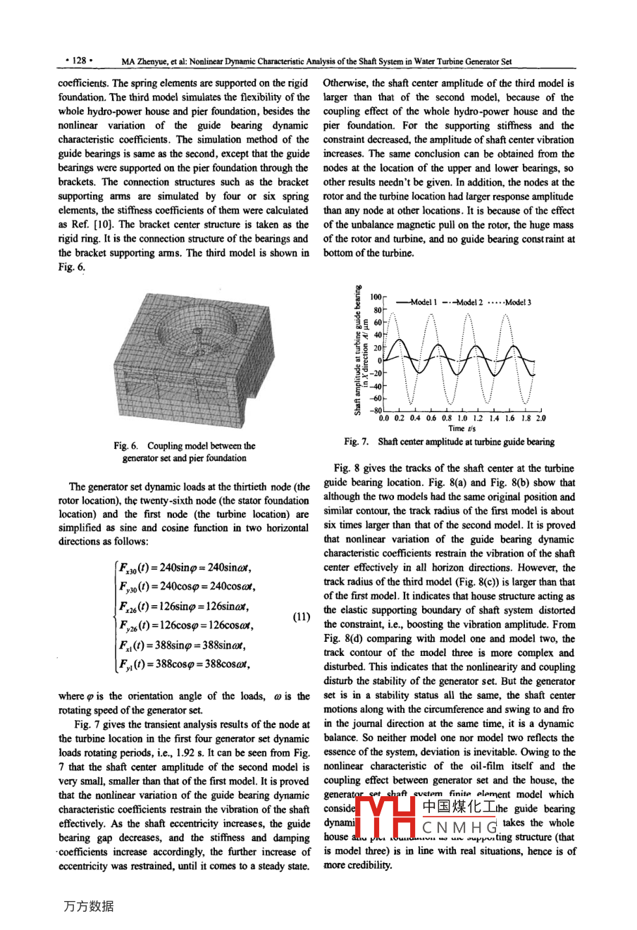 CHINESE JOURNAL OF MECHANICAL ENGINEERING●124●Vol. 22. No. 1, 2009DO: 10.3901/CJME. 2009.01.124, available online at www.jmenet.com; www cjmenet.com.cnNonlinear Dynamic Characteristic Analysis of the Shaft Systemin Water Turbine Generator SetMA Zhenyue and SONG Zhiqiang*School of Civil and Hydraulic Engineering, Dalian University of Technology, Dalian 116023, ChinaReceived May 18, 2008; revised November 13, 2008; accepted November 24, 2008; published elctronically February 20, 2009Abstract: A 3D finite element vibration model of water turbine generator set is constructed considering the coupling with hydropowerhouse foundation. The method of determining guide bearing dynamic characteristic coefficients according to the swing of the shaft isproposed, which can be used for studying the self-vibration characteristic and stability of the water turbine generator set. The methodfully considers the complex supporting boundary and loading conditions; especially the nonlinear variation of guide bearing dynamiccharacteristic cofficients and the coupling efet of the whole power-house foundation. The swing and critical rotating speed of anactual generator set shaft system are calculated. The simulated results of the generator set indicate that the coupling vibration model andcalculation method presented in this paper are suitable for stability analysis of the water turbine generator set.Key words: water turbine generator set, dynamic characteristic cofficients, nonlinerity, coupling vibration, citical speedis operating, under the influence of nonlinear variation of1 Introductionthe loads, the displacement of shaft, the rotating centrifugalforce, and the guide bearing oi-flm distribution changesIn recent years, a number of studies on the vibration ofgetting along with time; hence the dynamic characteristicthe water turbine generator set have been conducted- 4.coefficients of the guide bearings change accordingly.Because of the complexity of this matter, those researchesFurthermore, the natural frequency and the crtical rotatingover simplified the loadings, supporting and boundaryspeed of the shaft system depend on not only the rotatingconditions, etc, which may seriously affect the vibrationspeed but also the constraint conditions of the shaft that isof the shaft system. LIU, et al5], calculated the swing ofathe guide bearing dynamic characteristic coefficients. Fig.1shaft on the basis of finite element method, with lineardescribes a three-guide bearings suspension-type unit shaftapproximate model of the system constructed on thesysteml).premise of the shaft disturb only in a small region near theequilibrium point. Owing to the nonlinear essence of thebeannggenerator set, the linear system was not suitable at allRotorcpwhen the diturbance became larger. QIAO, et al6, tookFmt Magnetic foreinto account the nonlinear characteristic of the oil-film,ower guidecalculated the response of a shaft system, while ignoredthe influence of the whole hydropower house and the pierfoundation. He did not analyze the critical rotating speedor the stability of the generator set further. KANG, et al7),were devoted to the study of foundation effects on the144 Tubpne euidedynamic characteristics of rotor-bearing system. TheirTurbineC- 2simulation and analysis based on the finite elementFig. 1. Sketch of the shaftmethod. They put forward the design criteria of theand guide bearingfoundation for rotating machinery avoiding resonance andsuppressing response.For the vertical water turbine generator set, the guideThe中國煤化工frequencies and thebearings are the force tansmission gears between generatorguide t.2.FromFig.2wecan seeMYHC N M H Gwith the stifnes inset and whole bydro-power house. When the generator setan approximate linearity. The deviation of the first stepnature frequency is about土10% when the deviation of the,Corresponding author. E-maili Shiq200@.126.comstiffness reaches土25% taking 2.0 MN/mm as the referenceThis projeet is supported by National Natural Science Foundation ofCHINESE JOURNAL OF MECHANICAL ENGINEERING●125●point; while 20%,when the deviation of the stiffnessThe geometric sketch of water turbine generator setreaches 土50%. Frequency curves of the second and thirdguide bearing is shown in Fig. 3.steps have a similar trend, which indicates that the journalguide bearing stiffiness heavily influences on the naturefrequency. If the non-linear feature of the siffness couldnot be exactly examined, the correct calculation of thenatural frequency would be impossible, to say nothing of二0critical rotating speed.一First step ---econd step -- Third step20墾15Fig. 3. Guide bearing geometric sketch10.0.5Generally, since the rotating speed of a generator set isitifness K/MN.mmr)quite slow, oil-flm flow field belongs to laminar flow.Fig. 2. Curves of frequency sifnesssIgnoring the effect of the squeeze film, the generalReynolds equation of the steady flow field isIn this research, we have a deep consideration of thequestion how to determine the guide bearing oil-filmdistribution and the sifness coefficients further accordinga(h亞)t a(hp)=6u2h(1)x(μxJf z(μa,ax'to the nonlinear variation of the loads and the shaftdisplacement. Since the supporting structures of the shaftsystem (consisted of bearing pedestal- -bracket-pier-house, whereU= Rw is the linear speed in the circumnferentialetc) and the force ransfomation way were very complex, drection. Let r=Ro, =(L2), the boundary conditions are .the coupling effect of the whole house and pier foundationas fllows:was considered in the numerical simulation calculation.The simulation and analysis in this paper are based on finiteelement method. The guide bearing dynamic characteristich=t1,h=h/c,p= p(e/R) /uo.y=(D/l).coefficients’nonlinear variation with the shaft centerposition (eccentricity and orientation angle) is considered;meanwhile, we also take the coupling efet of the whole Where p is a symbol for the oil-fIm pessure; c representshouse and pie