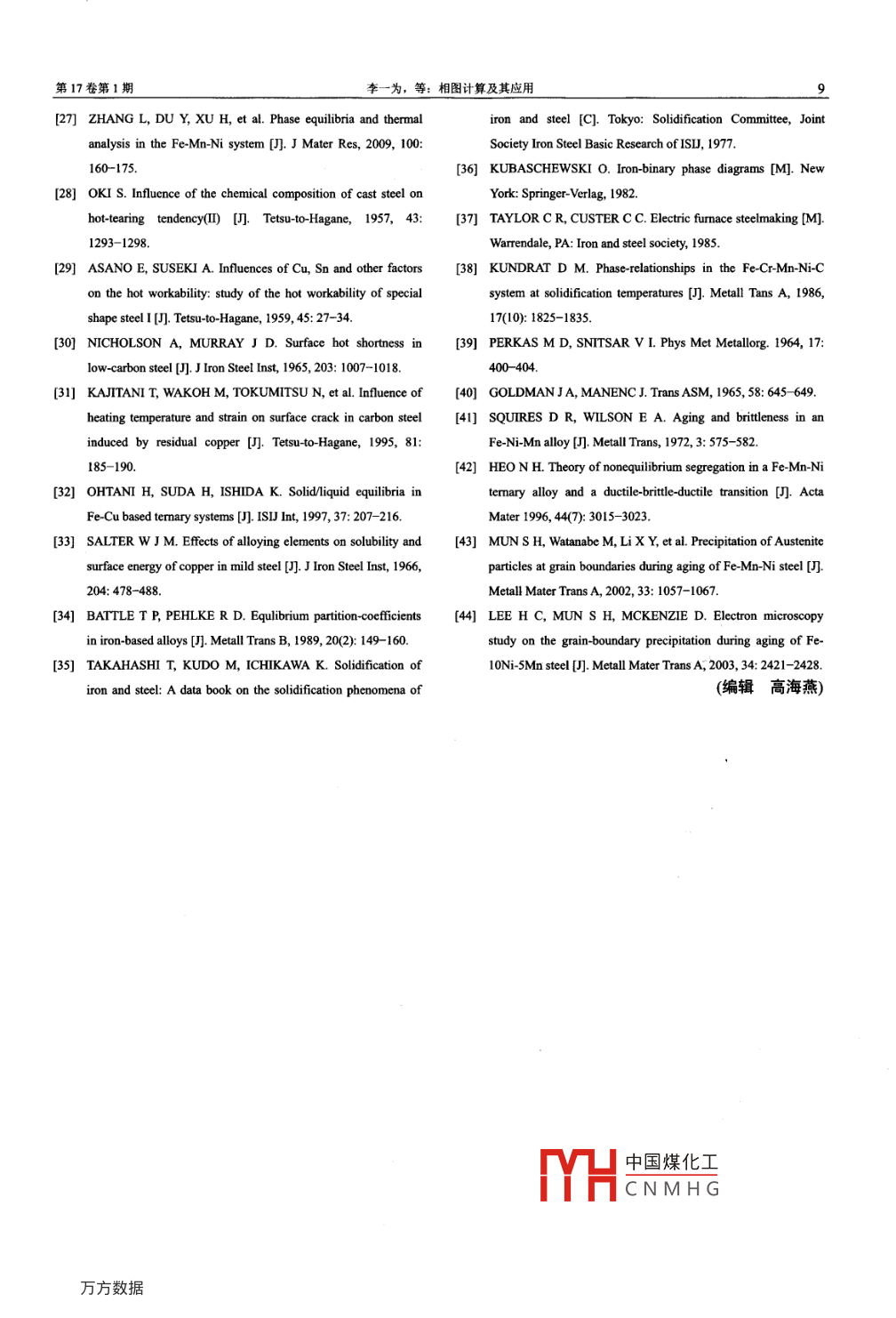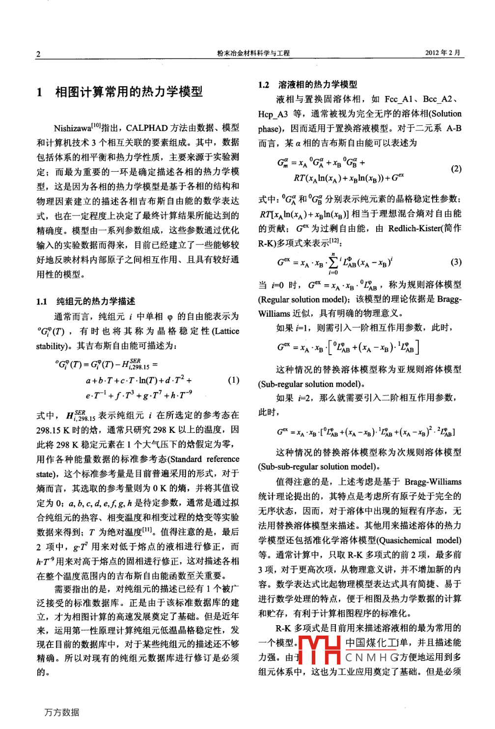 第17卷第1期粉末冶金材料科學(xué)與工程2012年2月Vol 17 No. 1Materials Science and Engineering of Powder MetallurgyFcb.2012相圖計算及其應(yīng)用李一為,??煽?王培生,胡標(biāo),張利軍,劉樹紅,杜勇(中南大學(xué),粉末冶金國家重點實驗室,長沙410083)摘要:綜述相圖計算方法的發(fā)展現(xiàn)狀、相圖熱力學(xué)計算常用的相描述模型及常用的熱力學(xué)計算軟件,并以Cu-Fe-Mn和 Fe-MI-Ni體系為例重點介紹相圖熱力學(xué)計算在材料設(shè)計及制備中的應(yīng)用。關(guān)鍵詞:相圖計算;模型;應(yīng)用中圖分類號:TG1396文獻標(biāo)識碼:A文章編號:1673-0224(2012)1-001-09Calculation of phase diagram and its applicationLI Yi-wei, CHANG Ke-ke, WANG Pei-sheng, HU Biao, ZHANG Li-jun, LIU Shu-hong, DU Yong(State Key Laboratory of Powder Metallurgy, Central South University, Changsha 410083, China)Abstract: The current status of CALPHAD(Calculation of Phase Diagram) approach is described. The models used inthermodynamic calculations and the most widely used softwares are summarized. Two examples of Cu-Fe-Mn andFe-Mn-Ni systems are presented to demonstrate the practical applications of CALPHAD approach in materials designKey words: CALPHAD; thermodynamic models; thermodynamic calculations; application計算機技術(shù)的高速發(fā)展和廣泛應(yīng)用給相圖計算提料,通過計算預(yù)測相圖,繞過某些實驗的困難(例如,供了有力的工具,目前,相圖計算已成為材料科學(xué)中高溫、高壓以及含強腐蝕性體系所面臨的高溫、高壓相圖領(lǐng)域的一個重要分支。自20世紀(jì)70年代發(fā)展起和容器選擇的困難)可以從低組分體系相圖及相應(yīng)熱來的相圖計算( calculation of phase diagram,簡寫為力學(xué)數(shù)據(jù)來計算多元體系相圖以節(jié)省時間、人力和物CALPHAD技術(shù)得到了很大的發(fā)展,并成為世界上發(fā)力,或由實驗容易測準(zhǔn)的部分來預(yù)測實驗難以測準(zhǔn)的展最為成熟、應(yīng)用最為廣泛的相圖計算技術(shù)。部分,以提高相圖的準(zhǔn)確性4。CALPHAD方法的實質(zhì)是根據(jù)目標(biāo)體系中各相的作為用途廣泛的相圖評估和預(yù)測手段,CALP晶體結(jié)構(gòu)、磁性有序和化學(xué)有序轉(zhuǎn)變等信息,建立起HAD方法不僅是材料動力學(xué)、顯微組織演變計算機各相的熱力學(xué)模型,并由這些模型構(gòu)筑各相的吉布斯模擬的熱力學(xué)基礎(chǔ),而且能夠廣泛地應(yīng)用于新材料的自由能表達式,最后通過平衡條件計算相圖。其中,設(shè)計與研制6。采用 CALPHAD方法,可以為有應(yīng)各相熱力學(xué)模型中的待定參數(shù)根據(jù)文獻報導(dǎo)的相平衡用前景的材料體系開發(fā)出完善的相圖熱力學(xué)數(shù)據(jù)庫,及熱力學(xué)性質(zhì)數(shù)據(jù)并借助于相圖計算軟件優(yōu)化獲得。例如,瑞典皇家工學(xué)院鐵合金相圖數(shù)據(jù)庫;英國羅爾在所獲得低組元體系(一般為二元和三元系)熱力學(xué)參斯羅伊斯公司與美國通用電氣公司各自開發(fā)的鎳基合數(shù)的基礎(chǔ)上通過外推或者添加少量的多元參數(shù)可獲得金相圖熱力學(xué)數(shù)據(jù)庫,德國克勞斯達大學(xué)在大眾汽車多元體系的相圖和熱力學(xué)信息2公司資助下開發(fā)的鎂合金相圖熱力學(xué)數(shù)據(jù)庫,日本東CALPHAD方法使人們能夠從組分的熱力學(xué)資北大學(xué)開發(fā)四出出竺9中國煤化工基金項目:國家自然科學(xué)基金重點項目(5083100:國家自然科學(xué)基金面上項目10711CNMHG收稿日期:2011-03-04:修訂日期:20110413通訊作者:杜勇,教授,博土。電話:0731-8836213:E- mail: yongducalphad@ gmail. con粉末冶金材料科學(xué)與工程012年21相圖計算常用的熱力學(xué)模型1.2溶液相的熱力學(xué)模型液相與置換固溶體相,如FcAl、BccA2HcpA3等,通常被視為完全無序的溶體相( SolutionNishizawa指出, CALPHAD方法由數(shù)據(jù)、模型 phase),因而適用于置換溶液模型。對于二元系A(chǔ)B和計算機技術(shù)3個相互關(guān)聯(lián)的要素組成。其中,數(shù)據(jù)而言,某a相的吉布斯自由能可以表述為包括體系的相平衡和熱力學(xué)性質(zhì),主要來源于實驗測Ga=xGA+xgA定;而最為重要的一環(huán)是確定描述各相的熱力學(xué)模型,這是因為各相的熱力學(xué)模型是基于各相的結(jié)構(gòu)和RT(AIn(xA)+xBIn(B))+G物理因素建立的描述各相吉布斯自由能的數(shù)學(xué)表達式中:和%分別表示純元素的晶格穩(wěn)定性參數(shù);式,也在一定程度上決定了最終計算結(jié)果所能達到的Rxkm(x)+xln(x1)相當(dāng)于理想混合熵對自由能精確度。模型由一系列參數(shù)組成,這些參數(shù)通過優(yōu)化的貢獻;G為過剩自由能,由 Redlich-Kister(簡作輸入的實驗數(shù)據(jù)而得來,目前已經(jīng)建立了一些能夠較R-K)多項式來表示2好地反映材料內(nèi)部原子之間相互作用、且具有較好通AB(A-x用性的模型當(dāng)r0時,G=x·x·B,稱為規(guī)則溶體模型11純組元的熱力學(xué)描述( Regular solution model);該模型的理論依據(jù)是 Bragg通常而言,純組元i中單相φ的自由能表示為 williams近似,具有明確的物理意義。(丌),有時也將其稱為晶格穩(wěn)定性( Lattice如果1,則需引入一階相互作用參數(shù),此時,stability)。其吉布斯自由能可描述為G=x和[a+(x-和)·a]oG(T)=G"(T)-H135=這種情況的替換溶體模型稱為亞規(guī)則溶體模型a+bT+c·T·ln(T)+dT2+(1)(Sub-regular solution model)eT1+f·T3+g.T7+hT9如果2,那么就