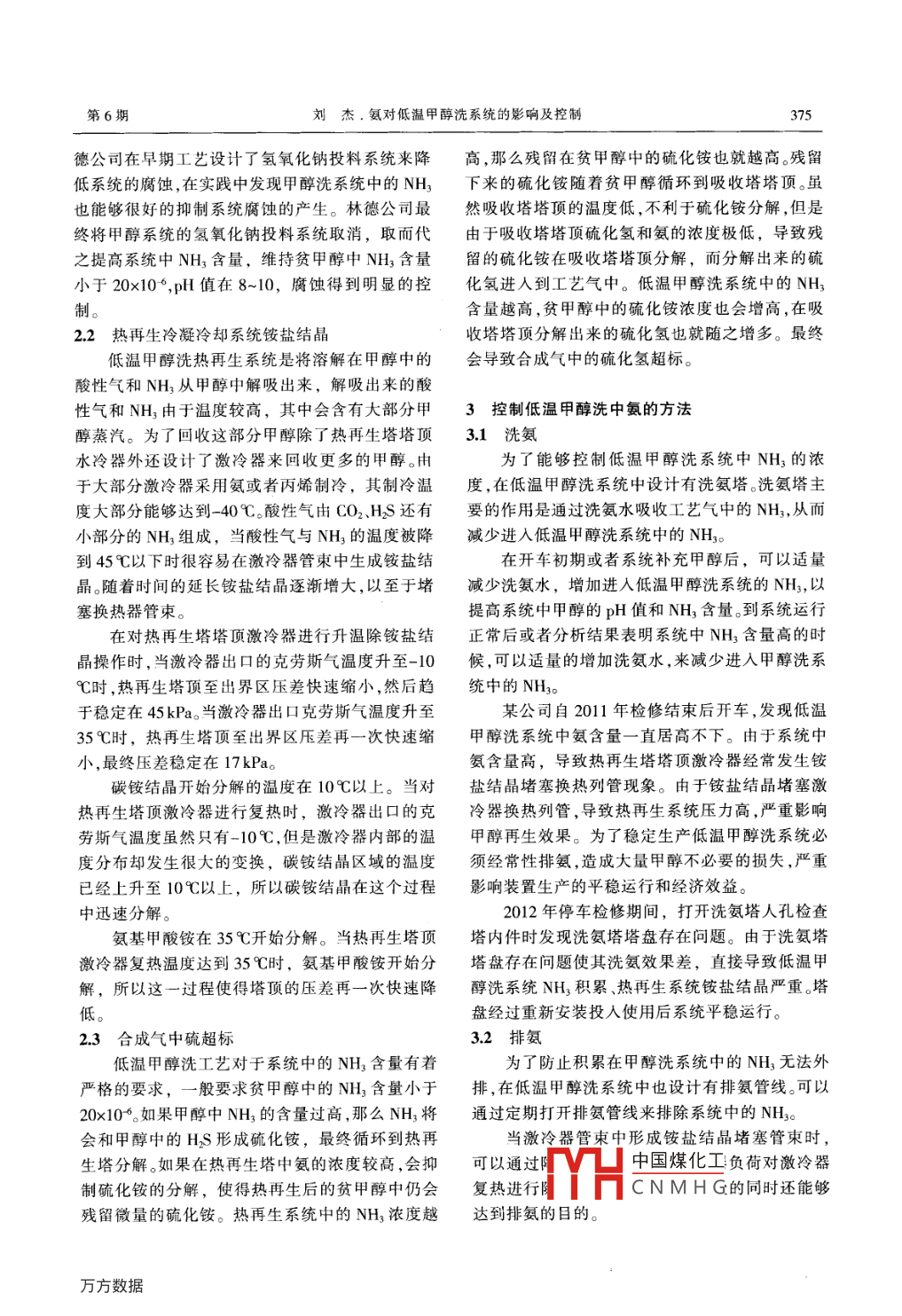 氨對(duì)低溫甲醇洗系統(tǒng)的影響及控制