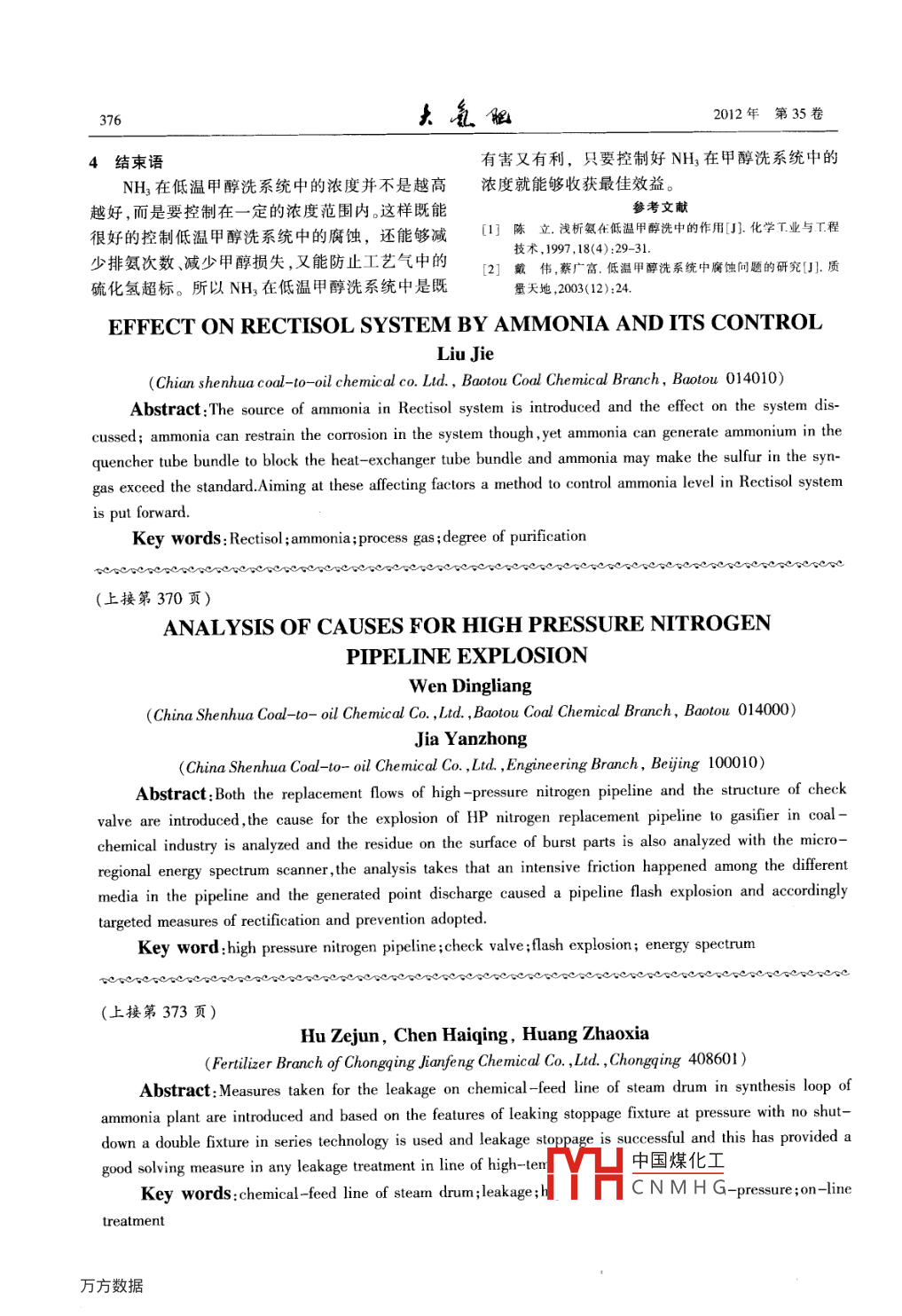 12年12月Dec.2012第35卷第6期Large Scale Nitrogenous Fertilizer IndustryVol 35 No 6氨對(duì)低溫甲醇洗系統(tǒng)的影響及控制劉杰(中國(guó)神華煤制油化工有限公司包頭煤化T分公司,內(nèi)蒙古包頭014010)摘要:介紹低溫甲醇洗系統(tǒng)中氨的來源,探討氨對(duì)低溫甲醇洗系統(tǒng)的影響。氨雖然能夠抑制系統(tǒng)的腐蝕,但氨會(huì)在激冷器管束中生成銨鹽堵塞換熱器管束,氨也會(huì)使合成氣中硫超標(biāo)。針對(duì)影響因素,提出控制低溫甲醇洗系統(tǒng)中氨的方法。關(guān)鍵詞:低溫甲醇洗氨工藝氣凈化度以煤為原料的化工企業(yè)普遍采用低溫甲醇洗在熱再生系統(tǒng)解吸,隨著酸性氣進(jìn)入到熱再生塔脫除工藝氣中CO2和HS等酸性氣體。在甲醇吸塔頂水冷器,由于水冷器將酸性氣降溫,酸性氣中收酸性氣體的同時(shí)還吸收了工藝氣中的NH3,對(duì)低的甲醇被冷凝下來。而此時(shí)會(huì)有一小部分酸性氣溫甲醇洗系統(tǒng)造成一定的影響。低溫下NH3在甲和大部分的NH3再次溶解到這部分甲醇中,隨著醇中的溶解度遠(yuǎn)高于CO2和HS等酸性氣體在甲冷凝下來的甲醇回流到熱再生塔中,剩余的小部醇中的溶解度,很容易在甲醇洗系統(tǒng)中累積。分氨與酸性氣進(jìn)入到激冷器中繼續(xù)冷凝回收甲CO2和HS等酸性氣體溶解到甲醇中后會(huì)使醇。在這個(gè)過程中幾乎所有的氨都溶解到這部分得甲醇的pH值降低,造成低溫甲醇洗系統(tǒng)設(shè)備的甲醇中進(jìn)入到硫化氫濃縮塔,所以大部分NH再腐蝕。為了減少設(shè)備的腐蝕、延長(zhǎng)設(shè)備的使用年限次進(jìn)入到低溫甲醇洗系統(tǒng)積累,只有微量的NH3和運(yùn)行周期,現(xiàn)低溫甲醇洗工藝都會(huì)允許系統(tǒng)中隨著酸性氣帶出界區(qū),造成低溫甲醇洗系統(tǒng)中NH3存在一定含量的NH3。但必須要嚴(yán)格控制NH在含量越來越高。低溫甲醇洗系統(tǒng)中的含量,如果NH3含量低會(huì)造成設(shè)備腐蝕的加劇;NH3含量高則會(huì)造成甲醇熱再2氨對(duì)低溫甲醇洗系統(tǒng)的影響生系統(tǒng)銨鹽結(jié)晶,堵塞熱再生塔頂換熱器;當(dāng)N32.,1防腐含量高到一定程度就會(huì)造成工藝氣中硫含量超低溫甲醇洗系統(tǒng)是利用循環(huán)甲醇來吸收工藝標(biāo)。所以必須要控制好低溫甲醇洗系統(tǒng)中的NH3氣中的CO2和HS等酸性氣體,溶解在循環(huán)甲醇含量。中的酸性氣體會(huì)對(duì)甲醇系統(tǒng)中設(shè)備和管道產(chǎn)生腐蝕。同時(shí)由于循環(huán)甲醇中還含有少量的水,使得腐1低溫甲醇洗系統(tǒng)中氨的來源蝕進(jìn)一步加強(qiáng)。低溫甲醇洗系統(tǒng)中的NH3主要由工藝氣帶入林德公司經(jīng)研究得出結(jié)論:在有機(jī)溶劑中堿系統(tǒng)中,這部分NH3是在氣化爐中形成的。煤炭中性物濃度維持在0005~0.2mol/L可以起到很好的含有的氮元素和氧氣中殘留的氮?dú)庠跉饣癄t中與防腐作用2。為了降低低溫甲醇洗系統(tǒng)的腐蝕,林氫元素反應(yīng)而形成NH3。生成的大部分NH3被水洗脫除,小部分NH3隨著工藝氣進(jìn)入到低溫甲醇收稿日期:2012-06-06;收到修改稿日期:2012-10-23。洗系統(tǒng)中,并在低溫甲醇洗系統(tǒng)中積累。作者簡(jiǎn)介:劉杰,男,1984年出生,助理T程師,科學(xué)歷2008年畢常溫下NH3在甲醇中的溶解度是HS的10中國(guó)煤化工藝令業(yè),現(xiàn)在中國(guó)神華煤制H醇中心從事煤化L.生多倍,是CO2的60多倍含NH3的甲醇最終進(jìn)產(chǎn)操作及CNMHG5332292: E-mail: liu人到熱再生系統(tǒng)中再生,溶解在甲醇中的NH3會(huì)icol06@yahoo.cn第6期劉杰,氨對(duì)低溫甲醇洗系統(tǒng)的影響及控制375德公司在早期工藝設(shè)計(jì)了氫氧化鈉投料系統(tǒng)來降高,那么殘留在貧甲醇中的硫化銨也就越高。殘留低系統(tǒng)的腐蝕,在實(shí)踐中發(fā)現(xiàn)甲醇洗系統(tǒng)中的NH3下來的硫化銨隨著貧甲醇循環(huán)到吸收塔塔頂。雖也能夠很好的抑制系統(tǒng)腐蝕的產(chǎn)生。林德公司最然吸收塔塔頂?shù)臏囟鹊?不利于硫化銨分解,但是終將甲醇系統(tǒng)的氫氧化鈉投料系統(tǒng)取消,取而代由于吸收塔塔頂硫化氫和氨的濃度極低,導(dǎo)致殘之提高系統(tǒng)中NH3含量,維持貧甲醇中NH3含量留的硫化銨在吸收塔塔頂分解,而分解出來的硫小于20×106,pH值在8~10,腐蝕得到明顯的控化氫進(jìn)入到工藝氣中。低溫甲醇洗系統(tǒng)中的NH3制。含量越高,貧甲醇中的硫化銨濃度也會(huì)增高,在吸22熱再生冷凝冷卻系統(tǒng)銨鹽結(jié)晶收塔塔頂分解出來的硫化氫也就隨之增多。最終低溫甲醇洗熱再生系統(tǒng)是將溶解在甲醇中的會(huì)導(dǎo)致合成氣中的硫化氫超標(biāo)。酸性氣和NH3從甲醇中解吸出來,解吸出來的酸性氣和NH3由于溫度較高,其中會(huì)含有大部分甲3控制低溫甲醇洗中氨的方法醇蒸汽。為了回收這部分甲醇除了熱再生塔塔頂3.1洗氨水冷器外還設(shè)計(jì)了激冷器來回收更多的甲醇。由為了能夠控制低溫甲醇洗系統(tǒng)中NH3的濃于大部分激冷器釆用氨或者丙烯制冷,其制冷溫度,在低溫甲醇洗系統(tǒng)中設(shè)計(jì)有洗氨塔。洗氨塔主度大部分能夠達(dá)到-40℃。酸性氣由CO2、H2S還有要的作用是通過洗氨水吸收工藝氣中的NH3,從而小部分的NH3組成,當(dāng)酸性氣與NH3的溫度被降減少進(jìn)入低溫甲醇洗系統(tǒng)中的NH3到45℃以下時(shí)很容易在激