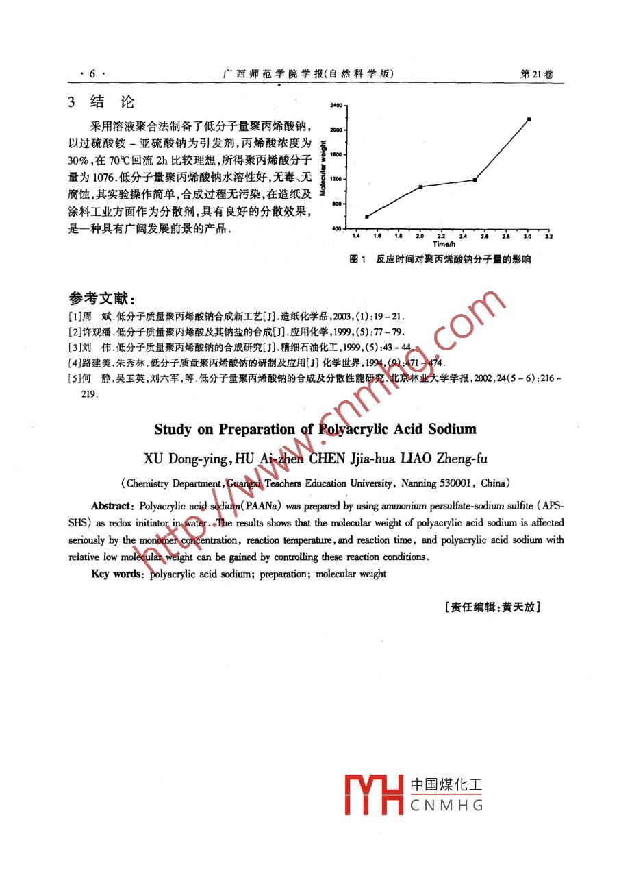 2004年12月廣西師范學(xué)院學(xué)報(bào)(自然科學(xué)版)Dec.2004第21卷第4期Journal of Guang Teachers Education University( Natural Science Edition)Vol 21 No 4文章編號(hào):1002-8743(2004)4-0004-03聚丙烯酸鈉的合成研究許東穎,胡愛珍,陳甲華,廖正福(廣西師范學(xué)院化學(xué)系,廣西南寧530001)摘要:以水為溶劑,過硫酸銨-亞硫酸鈉(APS-SHS)為引發(fā)體系合成了系列聚丙烯酸鈉( PAANa),探討了聚丙烯酸鈉分子量的影響因素結(jié)果表明:通過控制單體濃度反應(yīng)溫度、反應(yīng)時(shí)間等因素,可以得到相對(duì)低分子量的聚丙烯酸鈉關(guān)鍵詞:聚丙烯酸鈉;合成;分子量中圖分類號(hào):063文獻(xiàn)標(biāo)識(shí)碼:A聚丙烯酸鈉( PAANa)是一種新型功能高分子材料,是近年來國內(nèi)外開發(fā)的丙烯酸類精細(xì)化工重要產(chǎn)品之一,其應(yīng)用領(lǐng)域覆蓋日用化學(xué)工業(yè)農(nóng)業(yè)、石油工業(yè)、工業(yè)循環(huán)水系統(tǒng)、礦業(yè)、涂料、造紙、紡織、建筑和醫(yī)藥衛(wèi)生等行業(yè)低分子量 PAANa作為造紙工業(yè)的有機(jī)分散劑,能提高顏料的細(xì)度、增強(qiáng)分散體系的穩(wěn)定性還能提高涂布紙的柔軟性強(qiáng)度、表面光澤、白度保水性等,且具有可溶于水、不易水解、不易燃、無毒、無腐蝕性特點(diǎn)近年來國內(nèi)學(xué)者已發(fā)表了不少有關(guān)低分子量聚丙烯酸鈉合成的文章4,但大多是在比較高的溫度下進(jìn)行合成并且要蒸餾回收大量鏈轉(zhuǎn)移劑操作費(fèi)時(shí)能耗大本文研究溶液法合成聚丙烯酸鈉,旨在為制備低分子量聚丙烯酸鈉提供參考方法和依據(jù)1實(shí)驗(yàn)部分1.1合成方法在三口燒瓶中加入定量的蒸餾水,開動(dòng)攪拌,于一定溫度下,滴加適量的丙烯酸及引發(fā)劑水溶液保溫反應(yīng)至一定時(shí)間,用一定濃度的氫氧化鈉水溶液中和至中性,停止反應(yīng),產(chǎn)物為淺黃色透明粘稠液1.2分子量的測定按參考文獻(xiàn)[5]進(jìn)行聚丙烯酸鈉分子量的測定計(jì)算公式如下式中[n]為特性粘數(shù),[m]為比濃粘度,n為相對(duì)粘度,C為溶液濃度gmL,M為聚丙烯酸鈉的分子量,對(duì)于本試驗(yàn)所采用的溫度-溶劑體系,K,a分別為0.176mL/g、0.62結(jié)果與討論2.1引發(fā)劑種類的選擇在丙烯酸鈉的聚合過程中添加異丙醇、十二烷基硫醇等鏈轉(zhuǎn)移劑,可使生成的聚合物分子量降低但反應(yīng)溫度較高,且要蒸餾回收鏈轉(zhuǎn)移劑本文在溫度較低的反應(yīng)條件下,考察了常見幾種不同引發(fā)劑對(duì)聚丙烯酸鈉分子量的影響,實(shí)驗(yàn)結(jié)果見表1中國煤化工CNMHG收稿日期:2004-09作者簡介:許東穎(1972-),女,海南省人,講師,主要從事分離工程及相關(guān)學(xué)科的研究和教學(xué)工作第4期許東穎,胡愛珍陳甲華,等:聚丙烯酸鈉的合成研究表1引發(fā)劑對(duì)聚丙烯酸鈉分子量的影響引發(fā)劑添加量w%分子量備注過硫酸鉀0.01淺黃色粘稠液亞硫酸鈉-過硫酸銨0.03-0.0011614淺黃色粘稠液過氧化氫一硫酸亞鐵3~0.11342棕黃色粘稠液注反應(yīng)條件:反應(yīng)溫度為70℃丙烯酸單體濃度為30%,反應(yīng)時(shí)間3h實(shí)驗(yàn)結(jié)果表明,以過硫酸銨-亞硫酸鈉作為引發(fā)體系效果最佳,所得聚丙烯酸鈉分子量較低以過氧化氫-硫酸亞鐵作引發(fā)劑,反應(yīng)體系變棕黃色;以過硫酸鉀作為引發(fā)劑,得到聚丙烯酸鈉的分子量較大故選擇過硫酸銨-亞硫酸鈉作為合成聚丙烯酸鈉的引發(fā)劑2.2亞硫酸鈉濃度的影響將不同濃度的亞硫酸鈉溶液滴加到質(zhì)量濃度為30%的丙烯酸溶液中(NH4)2S2O2濃度為01%),于70℃下反應(yīng)時(shí)間3h.實(shí)驗(yàn)結(jié)果表明,隨著亞硫酸鈉濃度的增加,聚丙烯酸鈉分子量增大.亞硫酸鈉濃度為0.7%時(shí),其分子量最低表2亞硫酸鈉用量對(duì)聚丙烯酸鈉分子量的影響亞硫酸鈉(%)分子量1782624312.3過硫酸銨濃度的影響在亞硫酸鈉濃度為07%的反應(yīng)體系中,改變過硫酸銨的濃度,結(jié)果表明,隨著過硫酸銨濃度的增加,所得聚丙烯酸的分子量增大但過硫酸銨的濃度為0.02%時(shí),聚丙烯酸的分子量比較高在本實(shí)驗(yàn)條件中,過硫酸銨的濃度控制在01%左右,可合成較低分子量聚丙烯酸表3過硫酸的濃度對(duì)聚丙烯酸鈉分子量的影響過硫酸銨(%)0.020.1分子量1513195529802.4丙烯酸濃度的影響以不同丙烯酸的濃度進(jìn)行了實(shí)驗(yàn)對(duì)比,結(jié)果發(fā)現(xiàn)隨著單體丙烯酸濃度的減少聚丙烯酸分子量明顯減小,丙烯酸濃度低于25%時(shí),聚合速度慢,反應(yīng)不完全,殘留丙烯酸溶液較多,難以除掉,因此,將丙烯酸濃度控制在25%~30%之間比較合適表4丙烯酸濃度對(duì)聚丙烯酸鈉分子量的影響丙烯酸(%)分子量288119552.5反應(yīng)溫度的影響分別在80℃、75℃、70℃和65℃下進(jìn)行丙烯酸聚合反應(yīng),實(shí)驗(yàn)發(fā)現(xiàn)隨著反應(yīng)溫度的升高,所得聚丙烯酸分子量降低當(dāng)反應(yīng)溫度大于75℃時(shí),由于丙烯酸在反應(yīng)過程中回流過快,致使其損耗較多,故反應(yīng)溫度控制在70~75℃左右較為適宜2.6反應(yīng)時(shí)間的影響M凵中國煤化工反應(yīng)時(shí)間對(duì)聚丙烯酸分子量的影響見圖1實(shí)驗(yàn)結(jié)果表明CNMHG間增加而增大在反應(yīng)初期丙烯酸濃度高反應(yīng)速度快聚丙烯酸分子量增天的趨勢較大反應(yīng)時(shí)間增至2-2