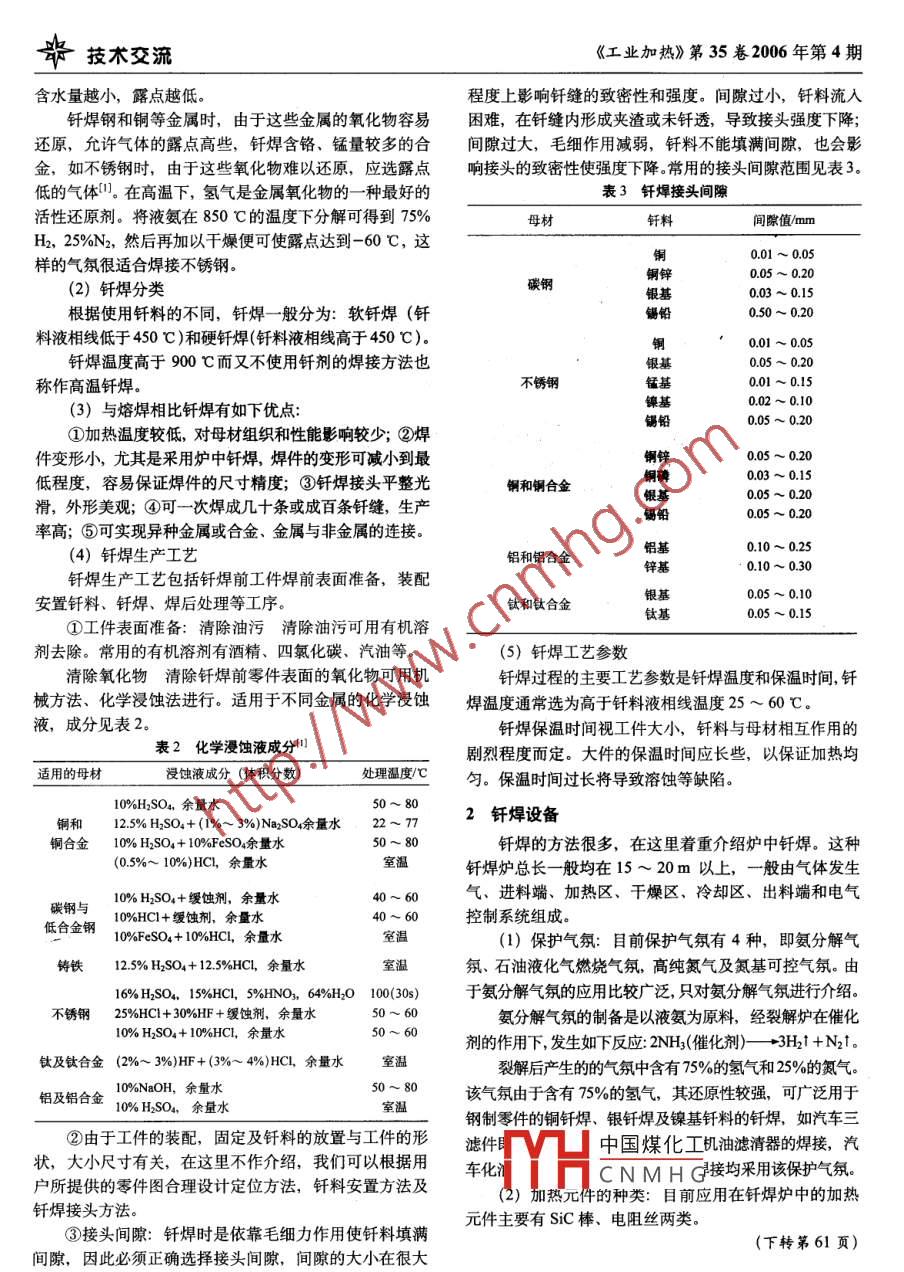 技術(shù)交流《工業(yè)加熱》第35卷2006年第4期釬焊工藝及設(shè)備呂靜茹(西安電爐研究所,陜西西安71001)摘要:爐中釬焊應(yīng)用十分廣泛,具有其它焊接方式不可比擬的優(yōu)點(diǎn)。從釬焊的原理、釬劑的選擇、釬焊溫度、保護(hù)氣氛的種類及釬焊設(shè)備進(jìn)行了較為詳細(xì)的闡述。關(guān)鍵詞:釬焊設(shè)備;保護(hù)氣氛;釬劑中圖分類號(hào):TG439文獻(xiàn)標(biāo)識(shí)碼:B文章編號(hào):1002-16392006040058-02ng-ru在汽車、空調(diào)、電子、航空航天等行業(yè)中,連續(xù)式不熔化,釆用比母材熔化溫度低的釬料,加熱溫度采取低氣體保護(hù)釬焊是一種非常重要且應(yīng)用十分廣泛的方法我于母材固相線而高于釬料液相線的一種連接方法。當(dāng)被連國(guó)自20世紀(jì)80年代以來(lái),從國(guó)外陸續(xù)引進(jìn)了各種類型接的零件和釬料加熱到釬料熔化,利用液態(tài)釬料在母材表的氣體保護(hù)釬焊爐,促進(jìn)了產(chǎn)品質(zhì)量及生產(chǎn)效率的提高。面潤(rùn)濕,鋪展與母材相互熔解和擴(kuò)散實(shí)現(xiàn)零件間的連接自20世紀(jì)90年代以來(lái),我國(guó)的科研單位也相繼開(kāi)發(fā)出釬焊使用氣氛的選擇了用于鋼制及銅制零部件的可控氣氛釬焊爐,促進(jìn)了我母材與釬料不同所選用的控制氣氛也不同,詳細(xì)見(jiàn)國(guó)的發(fā)展,同時(shí)為國(guó)家節(jié)約了大量外匯。表1釬焊原理及工藝氣體的還原能力不但同氫氣和一氧化碳的含量有關(guān)釬焊屬于固相連接,它與熔焊方法不同,釬焊時(shí)母材而且取決于氣體的含水量。氣體的含水量以露點(diǎn)來(lái)表示表1美國(guó)焊接學(xué)會(huì)推薦硬釬焊使用的氣氛氣氛成分近似值(%)類號(hào)氣源真空度|叫(H2)(N)J(co)p(CO)母材燃?xì)?低氫)室溫1-5871-511-12帆黃鉀(脫碳)室溫141570-7191056Cu,Bag").銅2)、黃銅低碳鋼、蒙乃爾合金、RBCuzn. BCuP中碳鋼說(shuō)碳銅2)、黃銅低碳鋼、蒙乃爾合金3燃?xì)飧稍?c1516|7y-x510n(增碳)RBCuZn. BCuP中碳鋼。中和高碳鋼,蒙乃爾合金和鎳合金分解氨-40℃銅2)、黃銅低碳鋼、蒙乃爾合金25RBCuZn2,BCuP中碳鋼)、中和高碳鋼增碳5氣瓶氫氣-54℃197-100BAg, BCuPRBCuz、銅)、黃銅低碳鋼、蒙乃爾合金B(yǎng)Cu. BNi中碳鋼》。中和高碳鋼,蒙乃爾合金和鎳合金,含鉻合金4脫氧而千室銅2)、黃銅低碳鋼、蒙乃爾合金燥的氫氣溫100BCu, BagRBCuzn. BCu脫碳中碳鋼銅2)、黃銅低碳鋼、蒙乃爾合金B(yǎng)Ag, BCuPRBCuZn、中碳鋼)。中和高碳鋼,蒙乃爾合發(fā)性材料BCu, BN金和鎳合金,含鉻合金,鈷、鉻、鎢合金和硬質(zhì)合金純惰性專用于氣氛類號(hào)氣體無(wú)機(jī)蒸汽BAg黃鋼7氣體共同使用銅2)、黃銅低碳鋼、蒙乃爾合金9真空惰性氣體(如BAg, BCuPRBCuZn專用工件清潔氣體氮?dú)宓?BCu, BNi中碳鋼。中和高碳鋼,蒙乃爾合金和鎳合金,含鉻合金,鈦鋯和鉛|提純10真空真空26eaBCuP,BAg中國(guó)煤化工10B真空0133665PaBCu, BAgCNMH真空0.13Pa以下Ni, BAu, BAISi耐熱和耐腐蝕鋼,鋁鈦和難熔合金注:美國(guó)焊接學(xué)會(huì)分類號(hào)6,7和9包括壓力降到260Pa1)當(dāng)采用含有揮發(fā)性元素的合金時(shí),氣氛中應(yīng)加入釬劑;2)銅必須完全脫氧或無(wú)氧;3)加熱時(shí)間要保持最短,以防止有害的脫碳;4)如果鋁、鈦、硅或鈹含量顯著,氣氛中應(yīng)加入釬劑58技術(shù)交流《工業(yè)加熱》第35卷2006年第4期含水量越小,露點(diǎn)越低。程度上影響釬縫的致密性和強(qiáng)度。間隙過(guò)小,釬料流入釬焊鋼和銅等金屬時(shí),由于這些金屬的氧化物容易困難,在釬縫內(nèi)形成夾渣或未釬透,導(dǎo)致接頭強(qiáng)度下降還原,允許氣體的露點(diǎn)高些,釬焊含鉻、錳量較多的合間隙過(guò)大,毛細(xì)作用減弱,釬料不能填滿間隙,也會(huì)影金,如不銹鋼時(shí),由于這些氧化物難以還原,應(yīng)選露點(diǎn)響接頭的致密性使強(qiáng)度下降。常用的接頭間隙范圍見(jiàn)表3。低的氣體們。在高溫下,氫氣是金屬氧化物的一種最好的表3釬焊接頭間隙活性還原劑。將液氨在850℃的溫度下分解可得到75%母材釬料間隙值mmH2,25%N2,然后再加以干燥便可使露點(diǎn)達(dá)到-60℃,這樣的氣氛很適合焊接不銹鋼銅001~0.05005~020(2)釬焊分類碳鋼銅鋅銀基003~0.15根據(jù)使用釬料的不同,釬焊一般分為:軟釬焊(釬0.50~0.20料液相線低于450℃)和硬釬焊(釬料液相線高于450℃)。001~005釬焊溫度高于900℃而又不使用釬劑的焊接方法也銀基稱作高溫釬焊不銹鋼錳基(3)與熔焊相比釬焊有如下優(yōu)點(diǎn)鎳基005~加熱溫度較低,對(duì)母材組織和性能影響較少;②焊件變形小,尤其是釆用爐中釬焊,焊件的變形可減小到最005~0.20低程度,容易保證焊件的尺寸精度;③釬焊接頭平整光銅和銅合滑,外形美觀;④可一次焊成幾十條或成百條釬縫,生產(chǎn)銀基005~0.20錫鉛005~0率高;⑤可實(shí)現(xiàn)異種金屬或合金、金屬與非金屬的連接(4)釬焊生產(chǎn)工藝鋁和鋁合金鋁基0.10030釬焊生產(chǎn)工藝包括釬焊前工件焊前表面準(zhǔn)備,裝配安置釬料、釬焊、焊后處理等工序。鈦和鈦合金銀基鈦基005~0.15①工件表面準(zhǔn)備:清除油污清除油污可用有機(jī)溶劑去除。常用的有機(jī)溶劑有酒精、四氯化碳、汽油等。(5)釬焊工藝參數(shù)清除氧化物清除釬焊前零件表面的氧化物可用機(jī)釬焊過(guò)程的主要工藝參數(shù)是釬焊溫度和保溫時(s