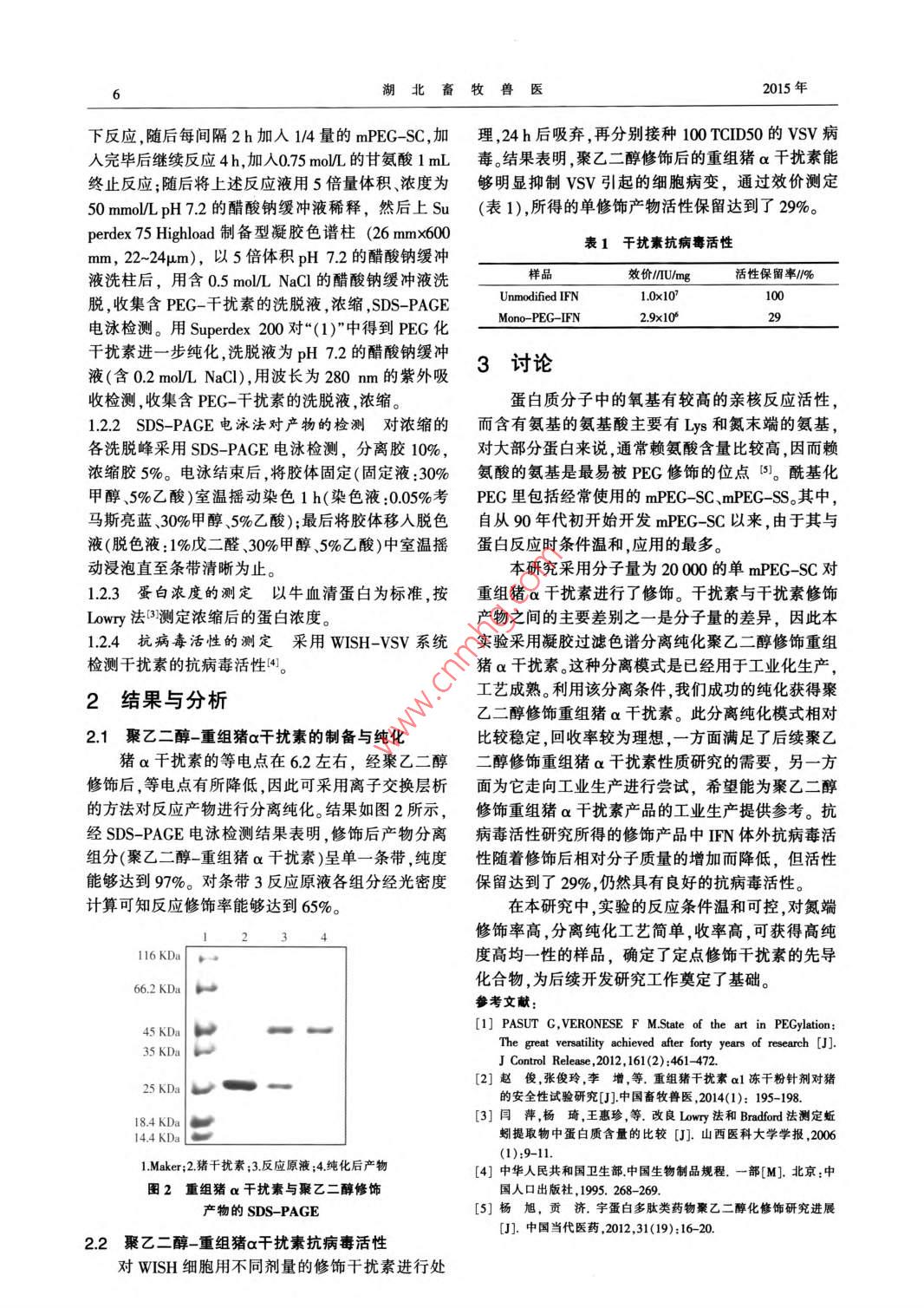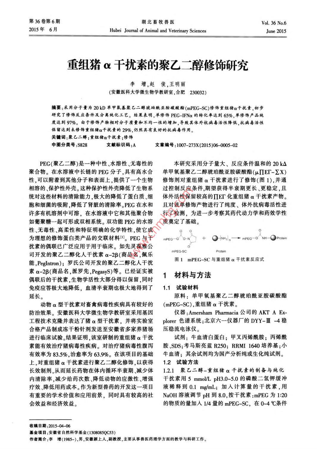 第36卷第6期湖北畜牧獸醫(yī)Vol 36 No, 62015年6月Hubei Journal of Animal and Veterinary SciencesJune 2015重組豬α干擾素的聚乙二醇修飾研究李增,趙俊,王明麗(安徽醫(yī)科大學(xué)微生物學(xué)教研室合肥230032)摘要:采用分子量為20kD單甲氧基聚乙二醇琥珀酰亞胺碳酸酯(mPEG-SC)修飾重組豬a干擾素,初步研究了修飾反應(yīng)條件及分離純化工藝。結(jié)果表明,單修飾PEG-IFNa的轉(zhuǎn)化率達到65%,單修飾產(chǎn)品純度達到97%。由于修飾產(chǎn)物相對分子質(zhì)量和不均一性的增加,導(dǎo)致其體外杭病毒活性降低,抗病毒活性保留達到未修飾重組豬α干擾意的29%,仍然具有良好的抗病毒作用。關(guān)鍵詞:聚乙二醇;重組豬α千擾素;修飾中圖分類號:S828文獻標(biāo)識碼:A文章編號:1007-273X(2015)06-0005-02PEG(聚乙二醇)是一種中性、水溶性、無毒性的本研究采用分子量大、反應(yīng)條件溫和的20k△聚合物。在水溶液中長鏈的PEG分子,具有高水合單甲氧基聚乙二醇琥珀酰亞胺碳酸酯(μⅠIEr-∑X)性,可以附著到其他分子和表面上,提供了一個生物修飾劑對重組豬a干擾素進行了修飾(圖1),并通相溶的、保護性外殼。這種保護性外殼降低了生物系過控制反應(yīng)條件期望獲得半衰期更長、更穩(wěn)定,且統(tǒng)對這些材料的清除能力極大的降低了蛋白質(zhì)細體外活性保留較高的∏Er化重組豬a干擾素產(chǎn)物。胞和細菌的吸附降低了腎臟的清除率。PEG在水和且對該單修飾產(chǎn)物進行了純度、體外抗病毒活性進許多有機溶劑中可溶,在水溶液中它和其他聚合物行了檢測,為進一步考察其藥代動力學(xué)和藥效學(xué)性如葡聚糖一起可形成雙相系統(tǒng)。雙功能PEG的水溶質(zhì)奠定了基礎(chǔ)。性、無毒性、高柔性和特征明確的化學(xué)特性,使它成為理想的修飾蛋白類產(chǎn)品的交聯(lián)材料。PEG與干m-00N+mn一m-0NOPm擾素的偶聯(lián)已廣泛應(yīng)用于用于臨床。如先靈葆雅公Protein司開發(fā)的聚乙二醇化人干擾素α-2B(商品名,佩樂能, PegIntron);羅氏公司開發(fā)的聚乙二醇化人干擾圖1mPEG-SC與重組豬a干擾素反應(yīng)式素α-2B(商品名派羅先, Pegasys)等。已經(jīng)證實被偶聯(lián)后的干擾素生物學(xué)活性大部分得以保留,同時1材料與方法免疫應(yīng)答極大地降低,血清半衰期也極大地得到了1.1試驗材料延長。原料:單甲氧基聚乙二醇琥珀酰亞胺碳酸酯動物a型干擾素對畜禽病毒性疾病具有較好的(mPEG-SC),重組豬α干擾素。防治效果。安徽醫(yī)科大學(xué)微生物學(xué)教研室采用基因儀器: Amersham Pharmacia公司的 AKT A Ex-工程技術(shù)克隆并表達了豬a型干擾素,并將實驗室 poorer色譜系統(tǒng);北京六一儀器廠的DYY-Ⅲ4穩(wěn)合格產(chǎn)品制成凍干粉針劑發(fā)送至安徽省多家養(yǎng)豬場壓穩(wěn)流電泳儀。進行臨床試驗。結(jié)果證明,該室研制的重組豬α干擾試劑:牛血清白蛋白;甲叉丙烯酰胺;丙烯酰素能有效治療豬病毒性疾病。對治療豬病毒性腹瀉胺、SDS;考馬斯亮藍R250;RRMI1640培養(yǎng)基;小有效率為83%,治愈率為639%。在該項目的基礎(chǔ)牛血清;其余試劑均為國產(chǎn)分析純或生化純試劑。上,對重組豬α干擾素進行聚乙二醇化修飾,以獲得12試驗方法長效制劑,從而延長藥物在體內(nèi)循環(huán)半衰期、減少體1.2.1聚乙二醇-重組豬α干擾素的制備與純化內(nèi)清除率減少給藥次數(shù)、降低動物的應(yīng)激性、增強干擾素用5mmo/LpH30-5.0的磷酸二氫鉀緩沖療效、降低用藥成本。作為新型獸藥的開發(fā)這一項目液稀釋到0.1mg/mL;加入計算量的干擾素,用有重要的學(xué)術(shù)價值和應(yīng)用前景,同時具有較高的社NaOH溶液調(diào)節(jié)pH到8.0,按干擾素:mPEG為1:20會效益和經(jīng)濟效益。的物質(zhì)的量加入114量的mPEG-SC,在0-4℃條件收稿日期:2015-0406基金項目:安徽省自然科學(xué)基金(1308085Qc53)作者簡介:李增(1985-),男,安徽穎上人,副教授,主要從事獸醫(yī)藥理學(xué)方面的教學(xué)與科研工作。湖北畜牧獸醫(yī)15年下反應(yīng),隨后每間隔2h加入1/4量的mPEG-SC加理,24h后吸棄,再分別接種100D50的ws病入完畢后繼續(xù)反應(yīng)4h,加入075mo的甘氨酸1mL毒。結(jié)果表明聚乙二醇修飾后的重組豬a干擾素能終止反應(yīng);隨后將上述反應(yīng)液用5倍量體積、濃度為夠明顯抑制vSⅴ引起的細胞病變,通過效價測定50 mmol/L pH72的醋酸鈉緩沖液稀釋,然后上Su(表1),所得的單修飾產(chǎn)物活性保留達到了29%perdex75 Highload制備型凝膠色譜柱(26mm×600表1干擾素抗病毒活性液洗柱后,用含05 I/L NaCl的醋酸鈉緩沖液洗樣品效價/umg活性保留率/%脫,收集含PEG_干擾素的洗脫液,濃縮,SDS-PAGEUnmodified IFN1.0×103電泳檢測。用 Superdex200對“()中得到PEC化_Mm2.9×10干擾素進一步純化,洗脫液為pH7.2的醋酸鈉緩沖液(含02 mol/L NaCl),用波長為280m的紫外吸3討論收檢測,收集含PEG-干擾素的洗脫液,濃縮。蛋白質(zhì)分子中的氧基有較高的親核反應(yīng)活性,12.2SDS-PAGE電泳法對產(chǎn)物的檢測對濃縮的而含有氨基的氨基酸主要有Lys和氮末端的氨基各洗脫峰采用SDS-PAGE電泳檢測,分離膠10%,對大部分蛋白來說,通常賴氨酸含量比較高,因而賴濃縮膠5%。電泳結(jié)束后,將膠體固定(固定液:30%氨酸的氨基是最易被PEG修飾的位點5。?;状?%乙酸)室溫搖動染色1h(染色液:005%考PEG里包括經(jīng)常使用的mPEG-SC、mPEG-SS。其中,馬斯亮
