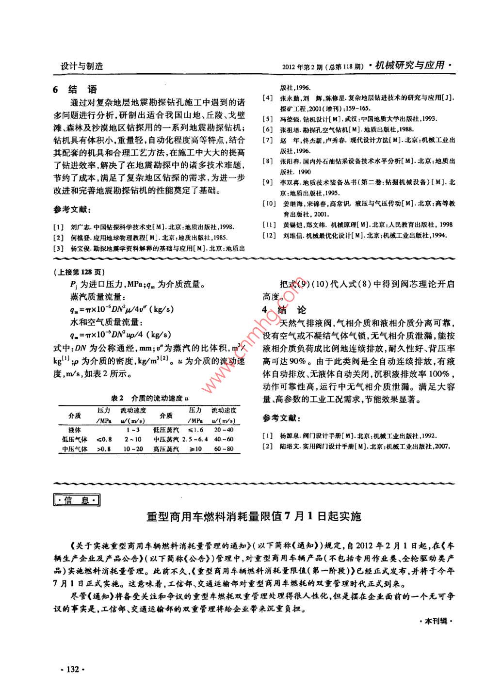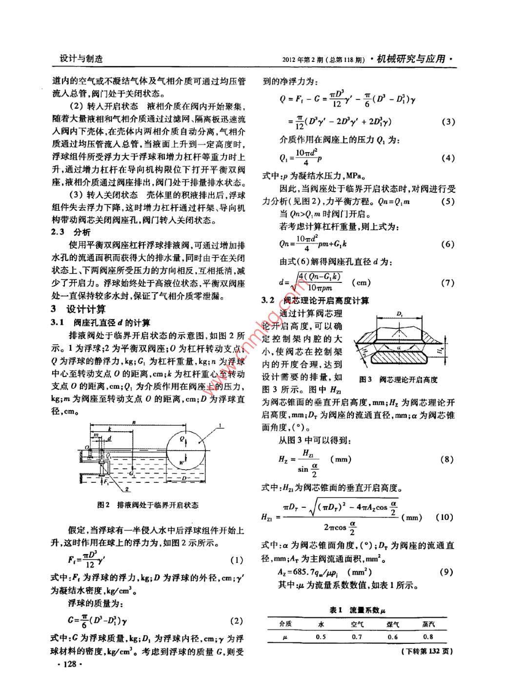 機(jī)械研究與應(yīng)用·2012年第2期(總第118期)設(shè)計(jì)與制造天然氣排液閥的設(shè)計(jì)方瑞紅!,羅展宏!,賈德強(qiáng)2(1.甘肅紅峰機(jī)械有限責(zé)任公司,甘肅平?jīng)?44000;2,甘肅省機(jī)械科學(xué)研究院,甘肅蘭州730030)摘要:針對(duì)石化行業(yè)特殊工況用節(jié)能產(chǎn)品天然氣排液閥的要求,重點(diǎn)介紹了該閾的結(jié)構(gòu)和工作原理,通過分析臨界開啟狀態(tài)下力平衡方程和閥座孔直徑、主閥芯理論開啟高度計(jì)算得到的蛄果,得出天然氣排液閥關(guān)鍵零件閥座孔、控制架內(nèi)腔尺寸,滿足主要技術(shù)參數(shù),神量達(dá)到設(shè)計(jì)要求的結(jié)論。關(guān)鍵調(diào):天然氣排液閥;結(jié)構(gòu);閥座孔直徑;主閥芯理論開啟高度中圖分類號(hào):TH34文獻(xiàn)標(biāo)識(shí)碼:A文拿編號(hào):1007-4414(2012)02-0127-02Design research of natural gas liquid trapFang Rui-hong, Luo Zhan-hong, Jia De-qiang(l. Cansu Hongfeng machinery Co., Ltd, Pingliang Gansu 744000, China2. Gansu academy of mechanical science, Lanzhou Cansu 730030 ChinaAbstract: Based on the application of energy-saving product under special condition of petroleum industry, the constructionperating principle of natural gas liquid trap are mainly introduced in this paper. Through the analysis of the foree equilib-rium equations in critical opening state and the calculation of the diameter of the valve seat hole and theoretical the valve lift ofmain core, the valve seat hole and the dimensions of chamber of holder we got can satisfy the main technical parameters andthe discharge capacity can meet the designing requirement of the calculation.Key words: natural gas liquid trap; structure; valve seat holder diameter; main valve theoretical lift1概述體、平衡雙閥座、均壓管、增力杠桿、浮球組件、桿架、排液閥在石油化工、冶金、紡織等行業(yè)中要求自導(dǎo)向機(jī)構(gòu)過濾網(wǎng)隔離板等組成,如圖1所示。排液動(dòng)分離任何比重差大于0.3的除蒸汽凝結(jié)水之外的閥的浮球通過增力杠桿在導(dǎo)向機(jī)構(gòu)限位下拉動(dòng)平衡氣液兩相介質(zhì)并有利于液相介質(zhì)的回收利用,在天雙閥座,增力杠桿的右端用銷軸與桿架鉸鏈連接,桿然氣與沉積液、石油液化氣與游離水、其它氣體與液架的上端用螺紋連接在浮球組件上。通過浮球組件體等方面得到廣泛的應(yīng)用。排液閥要求及時(shí)排除液上的螺母可調(diào)節(jié)浮球在上殼體內(nèi)的高低位置,使平衡相介質(zhì),無氣相介質(zhì)泄漏的自力式控制類閥門可達(dá)到雙閥座水封液面更高,確保氣相介質(zhì)零泄漏目的。但如果排液閥失效、性能不好或使用不當(dāng),將造成閃蒸罐持續(xù)髙液位,液體會(huì)進(jìn)入火炬,火炬會(huì)像噴泉一樣噴出大量的液體,污染環(huán)境浪費(fèi)資源。目1.下亮體2平雙閥3控制4增力杠桿前常用的排液閥有杠桿浮球式排液閥和雙導(dǎo)向排液5.導(dǎo)向機(jī)構(gòu)6上亮體閥等7浮球組件8過濾網(wǎng)筆者主要討論一種關(guān)閥壓力平衡穩(wěn)定性和可靠.均壓管10.軒架性好體積小排量大高水位、零泄漏的杠桿浮球式平衡雙閥座排液閥的工作原理和主要參數(shù)的計(jì)算天然氣排液閥1天然氣排液閥結(jié)構(gòu)示意圖2.1性能及結(jié)構(gòu)(1)性能天然氣排液閥吸收了杠桿浮球式排2.2工作原理液閥和雙導(dǎo)向排液閥的優(yōu)點(diǎn),使結(jié)構(gòu)更加完善性能()關(guān)閉狀態(tài)開始運(yùn)行時(shí),浮球組件、平衡雙更加優(yōu)良。具有排量大、體積小、工作壓力調(diào)整范圍閥座和增力杠桿等零件的重力繞其杠桿轉(zhuǎn)動(dòng)支點(diǎn)轉(zhuǎn)大且氣相介質(zhì)零泄漏等優(yōu)點(diǎn)。動(dòng),由于浮球組件沒有受到液相介質(zhì)的浮力,浮球組(2)結(jié)構(gòu)天然氣排液閥主要由上殼體、下殼件下沉,關(guān)閉平衡雙閥座切斷液相介質(zhì)排出通道管收稿日期:2012-03-11作者簡(jiǎn)介:方瑞紅(1968-),女,甘肅平?jīng)鋈?工程師,主要從事惻開發(fā)及設(shè)計(jì)研究工作。設(shè)計(jì)與制造2012年第2期(總第118期)·機(jī)械研究與應(yīng)用道內(nèi)的空氣或不凝結(jié)氣體及氣相介質(zhì)可通過均壓管到的凈浮力為流入總管,閥門處于關(guān)閉狀態(tài)。Q=Fr-G=(2)轉(zhuǎn)入開啟狀態(tài)液相介質(zhì)在閥內(nèi)開始聚集T(D-d)y隨著大量液相和氣相介質(zhì)通過過濾網(wǎng)、隔離板迅速流M(D'Y'-2Dy+ 2Dir)(3)入閥內(nèi)下殼體,在殼體內(nèi)兩相介質(zhì)自動(dòng)分離,氣相介質(zhì)通過均壓管流入總管,當(dāng)液面上升到一定高度時(shí),介質(zhì)作用在閥座上的壓力Q1為:浮球組件所受浮力大于浮球和增力杠桿等重力時(shí)上ltD升,通過增力杠桿在導(dǎo)向機(jī)構(gòu)限位下打開平衡雙閥座液相介質(zhì)通過閥座排出閥門處于排量排水狀態(tài)。式中:p為凝結(jié)水壓力,MPao(3)轉(zhuǎn)入關(guān)閉狀態(tài)殼體里的積液排出后,浮球因此,當(dāng)閥座處于臨界開啟狀態(tài)時(shí),對(duì)閥進(jìn)行受組件失去浮力下降,這時(shí)增力杠桿通過桿架、導(dǎo)向機(jī)力分析(見圖2),力平衡方程。Qn=Q1m(5)構(gòu)帶動(dòng)閥芯關(guān)閉閥座孔,閥門轉(zhuǎn)入關(guān)閉狀態(tài)。當(dāng)Qn>Q1m時(shí)閥門開啟。2.3分析若考慮計(jì)算杠桿重量,則上式為:10使用平衡雙閥座杠桿浮球排液閥,可通過增加排4 pm+G,k(6)水孔的流通面