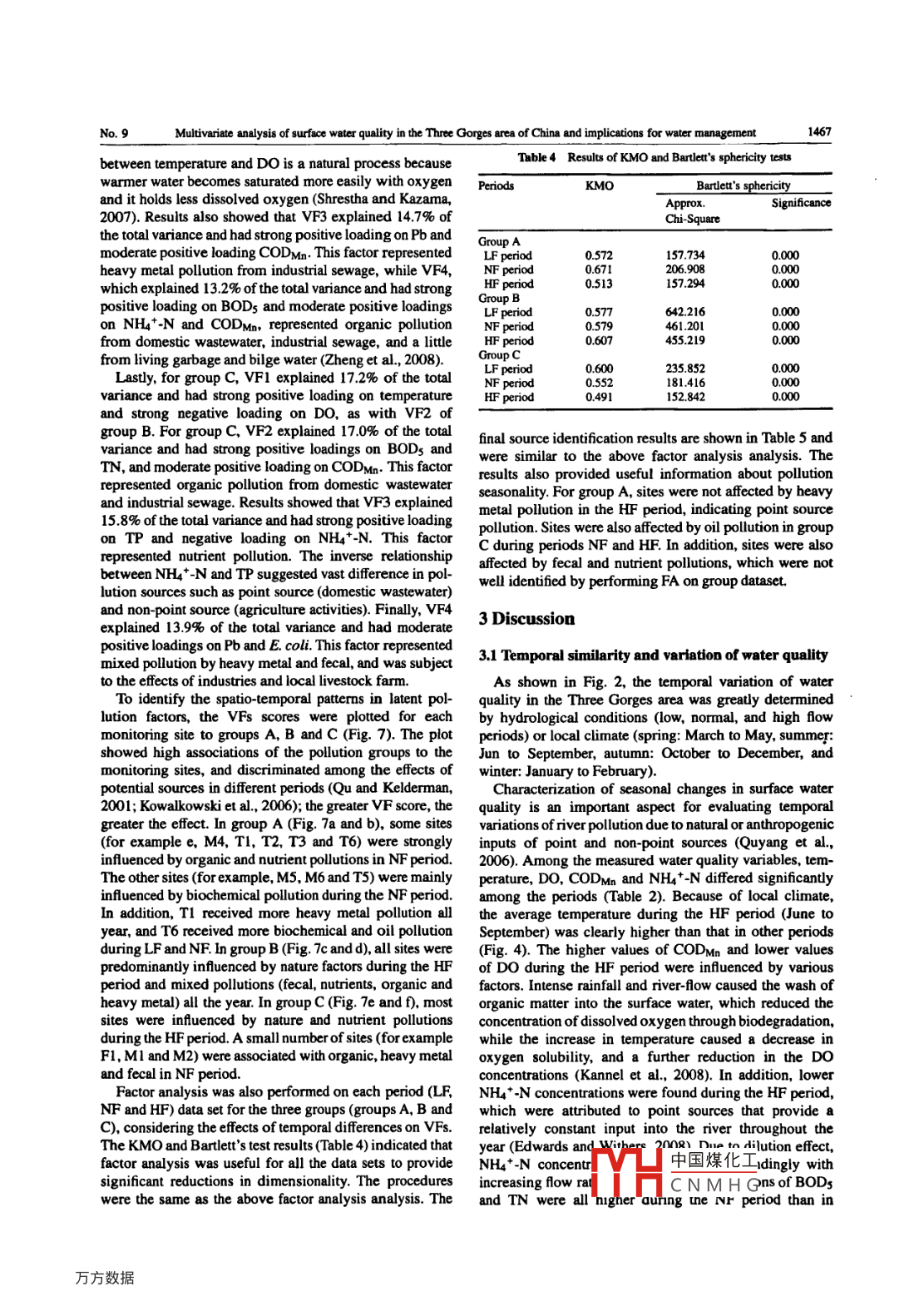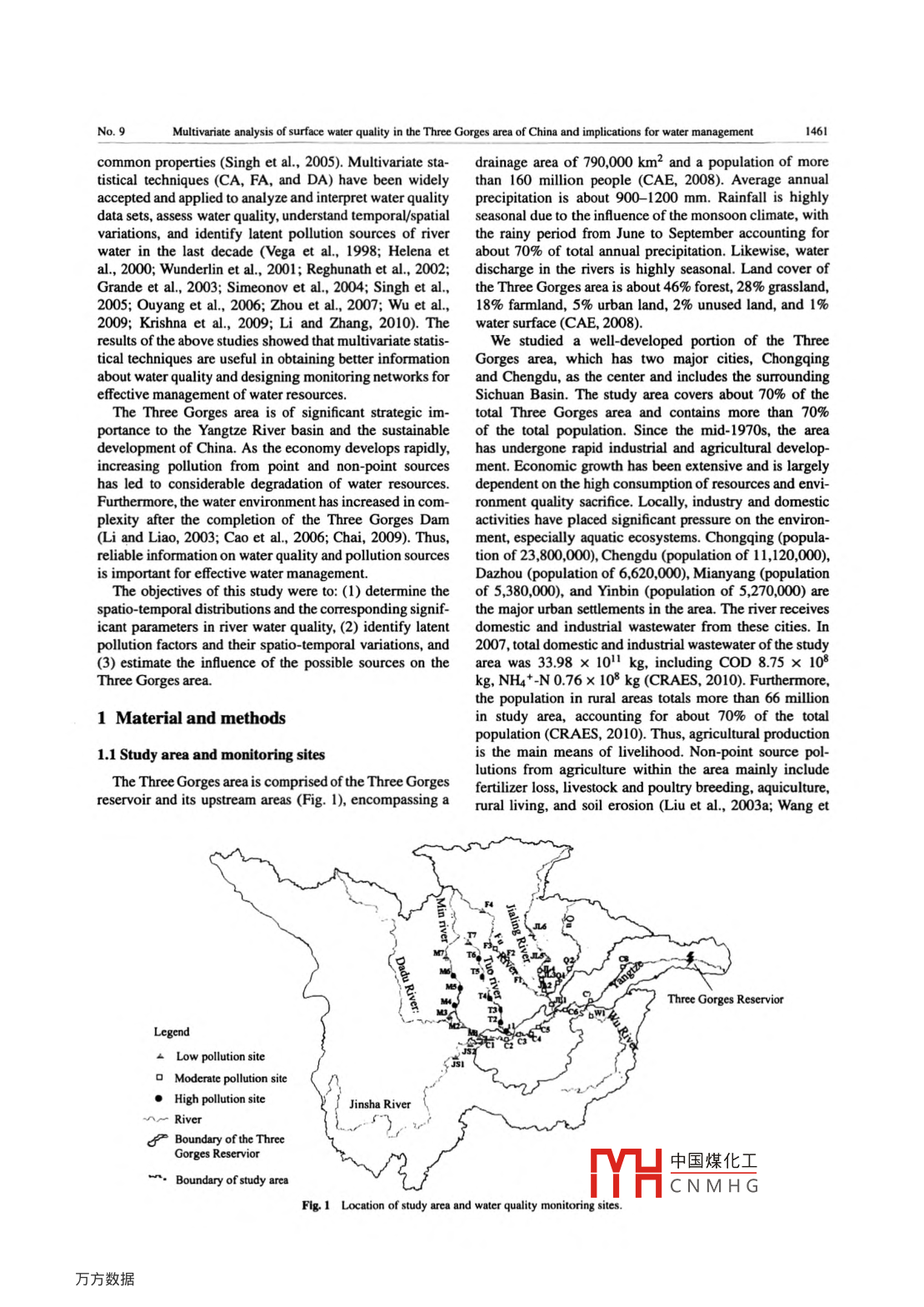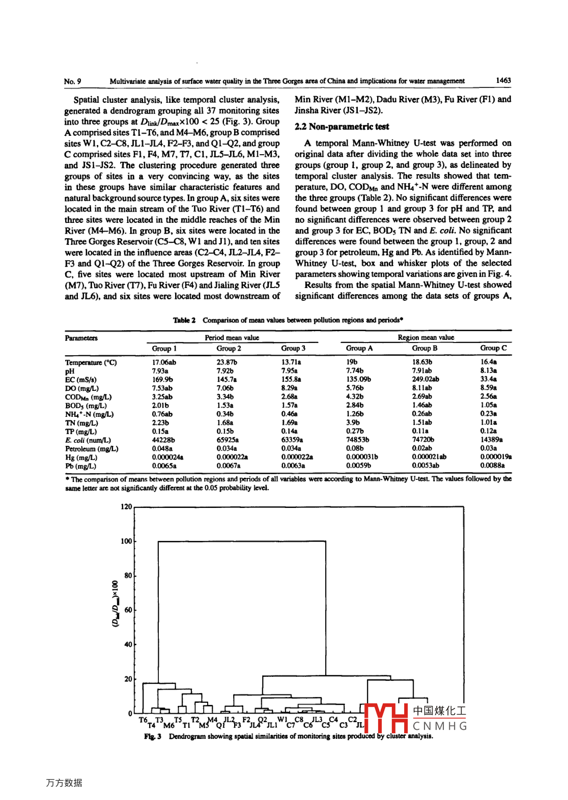 Available online at www.sciencedirect.com、JOURNAL OFENVIRONNENTAL[n],“ScienceDirectSCIENCESISSN 10-07402JESJoumal of Environmental Sciences 2011, 23(9) 1460-1471www.jesc.ac.cnELMultivariate analysis of surface water quality in the Three Gorges area ofChina and implications for water managementJian Zhao, Guo Fu*, Kun Lei, Yanwu LiChinese Research Academy of Emvironmental Sciences, Bejing 100012, China E-mail: zj103823@ 163.comReceived 15 November 2010; revised 01 April 2011; accepted 06 April 2011Abstract .Multivariate statistical techniques, cluster analysis, non-parametric tests, and factor analysis were applied to analyze a water qualitydataset including 13 parameters at 37 sites of the Three Gorges area, China, from 2003- -2008 to investigate spatio-temporal variationsand identify potential pollution sources. Using cluster analysis, the twelve months of the year were classified into three periods of low-flow (LF), normal-Aow (NF), and high-flow (HF); and the 37 monitoring sites were divided into low pollution (LP), moderate pollution(MP), and high pollution (HP). Dissolved oxygen (DO), potassium permanganate index (CODMn), and ammonia-nitrogen (NH4*-N)were identified as significant variables affecting temporal and spatial variations by non-parametric tests. Factor analysis identified thatthe major pollutants in the HP region were organic matters and nutrients during NF, heavy metals during LF, and petroleum during HF.In the MP region, the identified pollutants primarily included organic matter and heavy metals year around, while in the LP region,organic pollution was significant during both NF and HF, and utrient and heavy metal levels were high during both LF and HF. Themain sources of pollution came from domestic wastewater and agricultural activities and runof; however, they contributed diferentlyand LP regions, water pollution was more likely from the combined effects of agriculture, domestic wastewater, and chemical industry.These results provide fundamental information for developing better water pollution control strategies for the Three Gorges area.Key words: water quality; spatial variations; seasonal variations; multivariate statistical techniques; the Three GorgesDOI: 10.1016/S1001-0742(10)60599-2Citation: Zhao J, Fu G, Lei K, Li Y W, 2011. Multivariate analysis of surface water quality in the Three Gorges area of China andimplications for water management. Jourmal of Environmental Sciences, 23(9): 1460-1471Introductionsuch as cluster analysis (CA), principal component anal-ysis (PCA). factor analysis (FA), and discriminant analysisSurface water quality is controlled by complex anthro-(DA) offers superior interpretation of complicated data setspogenic activities and natural factors (Jarvie et al, 1998; .to better understand water quality (Zhang et al.. 2009).Ravichandran, 2003). Seasonal changes in natural process-Clustering analysis is an unsupervised multivariate tech-es, such as temperature, precipitation, and hydrologicalnique used to classify objects into categories or clusterscondition, infuence water quality such that it presentsbased on their nearness or similarity (Vega et al, 1998).different characteristics in different seasons (Vega et al., .Hierarchical clustering is the most common approach in1998; Ouyang et al., 2006). Accurate assessment of thewhich clusters are formed sequentially, by starting with thetype and extension of water pollution is a dificult taskmost similar pair of objects and forming higher clusters(Huang et al,. 2010). Long-term surveys and water qualitystep by step (Singh et al, 2005). Factor analysis providesmonitoring prograrns are an adequate approach to improveinformation regarding the most meaningful parameters,knowledge of river hydrochemistry and pollution, but theywhich describe whole data set rendering for data reductionproduce large data sets that are often dificult to analyzewith minimum loss of original information (Vega et al,and interpret (Shin and Fong, 1999). Applying advanced1998; Wunderlin et a1.. 2001). It is a powerful techniquestatistical methods to these data sets without missingfor patterm recognition and attempts to explain the varianceuseful information is imperative to extract meaningfulof a large set of inter-correlated variables and transform itinformation such as spatial and temporal patterns, signifi-into a smaller set of independent variables (Shrestha andcant parameters and latent pollution sources (Shrestha andKazama, 2007). Discrimirent aplbis id= .statisticalKazama, 2007; Zhang et al.. 2009).classification of sarYH中國煤化工it priorThe application of multivariable statistical techniquesknowledge of membeCNMHGargroupsor clusters. Further, DA helps in grouping samples sharing串Coresponding author. E-mail: Fuguo551225@sina .com1462Joumal of Environmental Sciences 2011, 23(9) 1460 -1471 /Jian Zhao et al.Vol. 23al., 2009). The discharge of TN and TP from livestocktal data standardized through z-scale transformation (theand poultry breeding was 2.3 x 108 and 0.1 x 108 kg, mean and variance were set to zero and one, respective-respectively, and COD was 26.5 X 108 kg in 2009 (Wang ly) to minimize the influence of variable variance andet al, 2009).eliminate the infuence of different units of measurementThirty-seven water quality monitoring sites were de and render the data dimensionless (Singh et al., 2005).signed to cover a wide range of determinants at key sites,All mathematical and statistical computations were madewhich reasonably represent the water quality of the river using Microsoft Office Excel 2003 and STATISTICA 6.0.system in the Three Gorges area (Fig. 1).1.2 Monitored parameters and analytical methods2 ResultsData sets from 37 water quality monitoring sites com- 2.1 Cluster analysisprising 13 water quality parameters monitored monthlyover six years (2003- -2008), were obtained from thedata set with a view to group the periods (temporal) andEnvironmental Monitoring Center of Chongqing Munic-sites