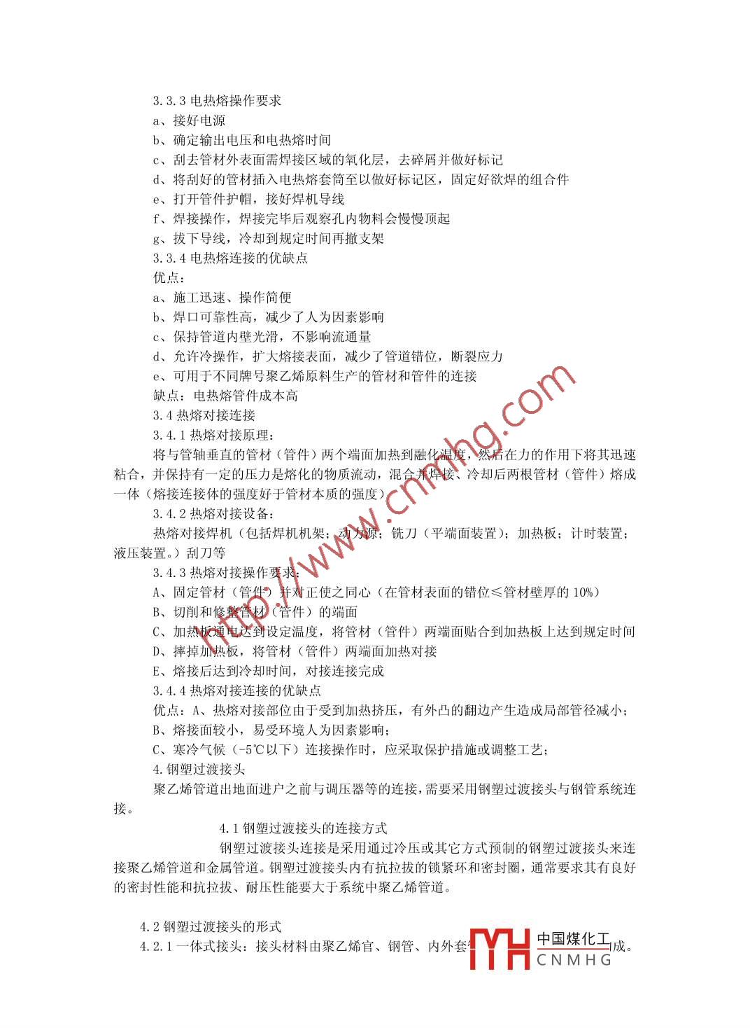 聚乙烯管道在燃?xì)廨斉渖系膽?yīng)用杜曉波齊齊哈爾市港華燃?xì)庥邢薰竞邶埥?齊齊哈爾161000摘要:聚乙烯管道在國(guó)內(nèi)外取得相當(dāng)好的社會(huì)經(jīng)濟(jì)效益,應(yīng)用廣泛。其在燃?xì)廨斉渖系膽?yīng)用技術(shù)以相當(dāng)成熟,本文就聚乙烯管道在燃?xì)廨斉渖系膽?yīng)用問題進(jìn)行了探討。關(guān)鍵詞:聚乙烯管道;燃?xì)廨斉?應(yīng)用Abstract: polyethylene pipes madegood social and economic benefits at homeand abroad, a wide range of applications. In gas transmission and distributiontechnology is quite mature, polyethylene pipeline in gas transmission anddistribution applications.Keywords: polyethylene pipes; gas transmission and distribution; application中圖分類號(hào): TU96. 7文獻(xiàn)標(biāo)識(shí)碼: A文章編號(hào): 2095- -2104 (2012)我國(guó)現(xiàn)行的《燃?xì)庥寐竦鼐垡蚁┕懿摹?GB15558. 1-95)《燃?xì)庥寐竦鼐垡蚁┕芗?(GB15558.2- -95) 國(guó)家標(biāo)準(zhǔn)和《聚乙烯燃?xì)夤艿拦こ碳夹g(shù)規(guī)程》(CJJ63- -95) 行業(yè)標(biāo)準(zhǔn)是針對(duì)目前國(guó)際上較多采用的第二代(PE-80) 聚乙烯燃?xì)夤艿缹S昧现贫ǖ?。目前已有?guó)家采用了第三代(PE-100) 聚乙烯管專用料。1.聚乙烯燃?xì)夤懿牡奶攸c(diǎn)聚乙烯管道用于燃?xì)廨斉?上始于- -九五六年的美國(guó),在此前后淘汰了醋酸一丁 酸纖維素管道、硬聚乙烯管道、環(huán)氧玻璃鋼管道、滌綸管道和尼龍管道,這是因?yàn)?1.1聚乙烯有很好的柔韌性,加工的管材可以盤管成卷,從而能使管網(wǎng)中的接頭數(shù)量減少。1.2聚乙烯可蛇行銷設(shè),可輕易繞過障礙物進(jìn)一步減少接頭數(shù)量。1. 3聚乙烯屬熱朔性所朔料,可多次加工成型、使熱熔和電熔成為可能。1.4聚乙烯有很好的耐腐蝕性,因此聚乙烯管埋地不需要防腐。1.5聚乙烯抗沖擊性能好,具有較高的斷裂伸長(zhǎng)率。1. 6聚乙烯管具有較好的氣密性環(huán)節(jié)之一。由于燃?xì)夤艿奶厥庥猛?,使用普通的聚乙烯材質(zhì)是不能滿足特殊用途的需要,應(yīng)此必須加路一定的添加劑、抗氧劑、紫外線穩(wěn)定劑是為了增強(qiáng)聚乙烯管道抗老性能,使其在五十年中保持良好的特性;加著色劑是為了便與其它管道區(qū)別。隨著石華工業(yè)的發(fā)展,燃?xì)庖蚓垡蚁┰系陌l(fā)展經(jīng)歷了第一一代、第二代、第三代等,聚乙烯燃?xì)夤艿缹S昧系姆诸愊卤?類型長(zhǎng)期靜液壓強(qiáng)度(Mpa)最低要求強(qiáng)度(MRS )(LTH20C 50年97. 5%)(Mpa)PE 63 (第一 -代)6.30~ 7. 996.3PE 80 (第二代)8.00^ 9.998.0PE 100 (第三代)10.0~11.1910.0PE112 (第四代)≥111.211.22.聚乙烯燃?xì)夤懿牡纳a(chǎn)2.1生產(chǎn)設(shè)備:2.1.1單螺桿擠出機(jī)(長(zhǎng)經(jīng)比L/D=28、自動(dòng)計(jì)量上料、溫度自動(dòng)控制、壁后超聲波監(jiān)測(cè))。2. 1.2真空定經(jīng)裝置。中國(guó)煤化工2.1.3噴淋冷卻。MYHCNMH G2. 1.4牽引裝置。2.1.5打印標(biāo)準(zhǔn)裝置。2.1.6計(jì)量卷取切割裝置。2.2工藝流程2.2.1原料準(zhǔn)備(洪干);2. 2.2投料擠出;2.2.3冷卻定型;2.2.4牽引2. 2.5打印標(biāo)記;2. 2.6計(jì)量切割;2.2. 7檢驗(yàn);2.2.8包裝。2. 3聚乙烯燃?xì)夤艿囊?guī)格尺寸(mm):公稱外經(jīng)Dn壁厚e基本尺寸允許偏差SDR11工作壓力《0. 4MPaSDR11工作壓力<0. 2MPa5(+0. 44. 6+0.62.9+0.465.8+0.73.6+0.576.898.2+1.0125+0.6.11.4 .+1.37.1+0.93.聚乙烯燃?xì)夤芗纳a(chǎn)3.1電熱熔管件電熱熔管件是用某種方法將電熱絲布置與管件內(nèi)表面,施工時(shí)將管材與管件配合后,用專用的加熱溶制電源將管件的電熱絲通電加熱,使管材與管件的接觸表面熔化結(jié)合,冷卻后使管材和管件牢固緊密地結(jié)合在一起。由于施工方便快捷,焊接效果好,電熱熔管件是目前世界上聚乙烯管材連接件中最廣泛的一種。 缺點(diǎn)是成本高。電熱熔管件是由注塑生產(chǎn)工藝制造,各廠家都采用專利技術(shù)將電熱絲布置嵌入管件中,在使用時(shí)選擇與之匹配的焊機(jī)才能達(dá)到最佳焊接效果。3. 2熱熔對(duì)接管件熱熔對(duì)接管件是指用于加熱板對(duì)接焊的管件,對(duì)于小口徑的對(duì)接管件(DN110mm以下)-般為注射生產(chǎn),而對(duì)于大口徑管件不宜注塑生產(chǎn),-一般采用焊接方法制造以降低成本。注射管件的生產(chǎn)工藝流程:(1)原料準(zhǔn)備(2)模具準(zhǔn)備(3) 注射機(jī)準(zhǔn)備..... (4)注射成型(5)檢驗(yàn)(6) 包裝入庫(kù)。四、聚乙烯燃?xì)夤艿赖倪B接方式目前聚乙烯燃?xì)夤艿赖倪B接方式主要采用電熱熔連接和熱熔對(duì)接連接。3. 3電熱熔連接3.3.1電熱熔原理電熱熔連接是將所需的連接的管端插入埋有電熱絲的電熱熔管件中,將電阻絲通以電流,電阻絲產(chǎn)生的熱能使管采外表面和管件內(nèi)表面融化成--體,固定直至接口冷卻,從而形成牢固緊密的接頭。3.3.2電熱熔設(shè)備中國(guó)煤化工電熱熔焊機(jī)、刮到和支架等專用工具。MHCNMH G3. 3.3電熱熔操作要求a、接好電源b、確定輸出電壓和電熱熔時(shí)間c、刮去管材外表面需焊接區(qū)域的氧化層,去碎屑并做好標(biāo)記d、將刮好的管材插入電熱熔套筒至以做好標(biāo)記區(qū),固定好欲焊的組合件e、打開管件護(hù)帽,接好焊機(jī)導(dǎo)線f、焊接操作,焊接完畢后觀察孔內(nèi)物料會(huì)慢慢頂起g、拔下導(dǎo)線,冷卻到規(guī)定時(shí)間再撤支架3.3.4電熱熔連接的優(yōu)缺點(di