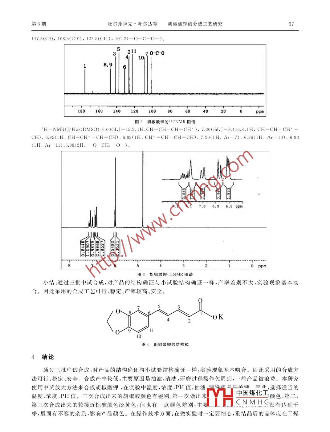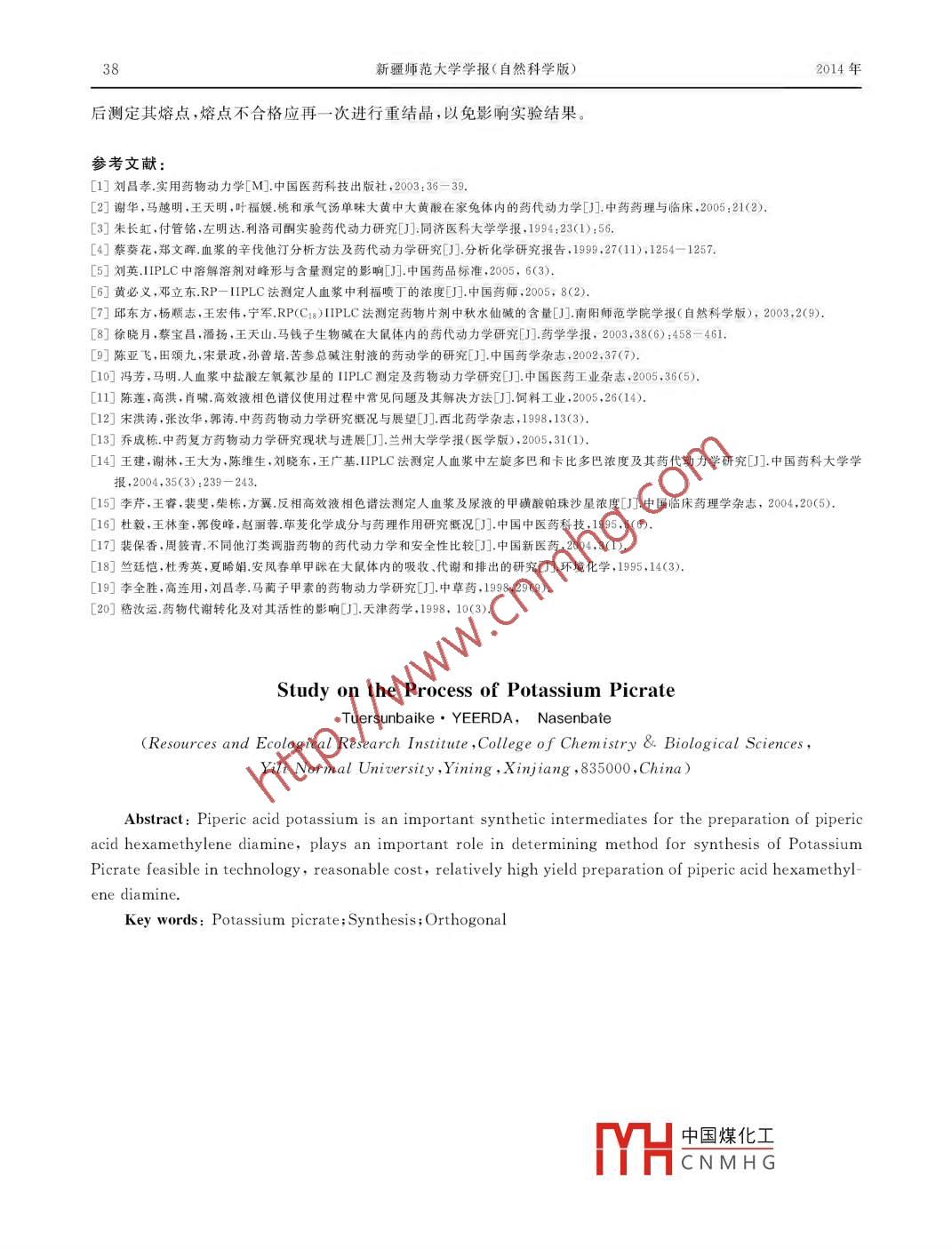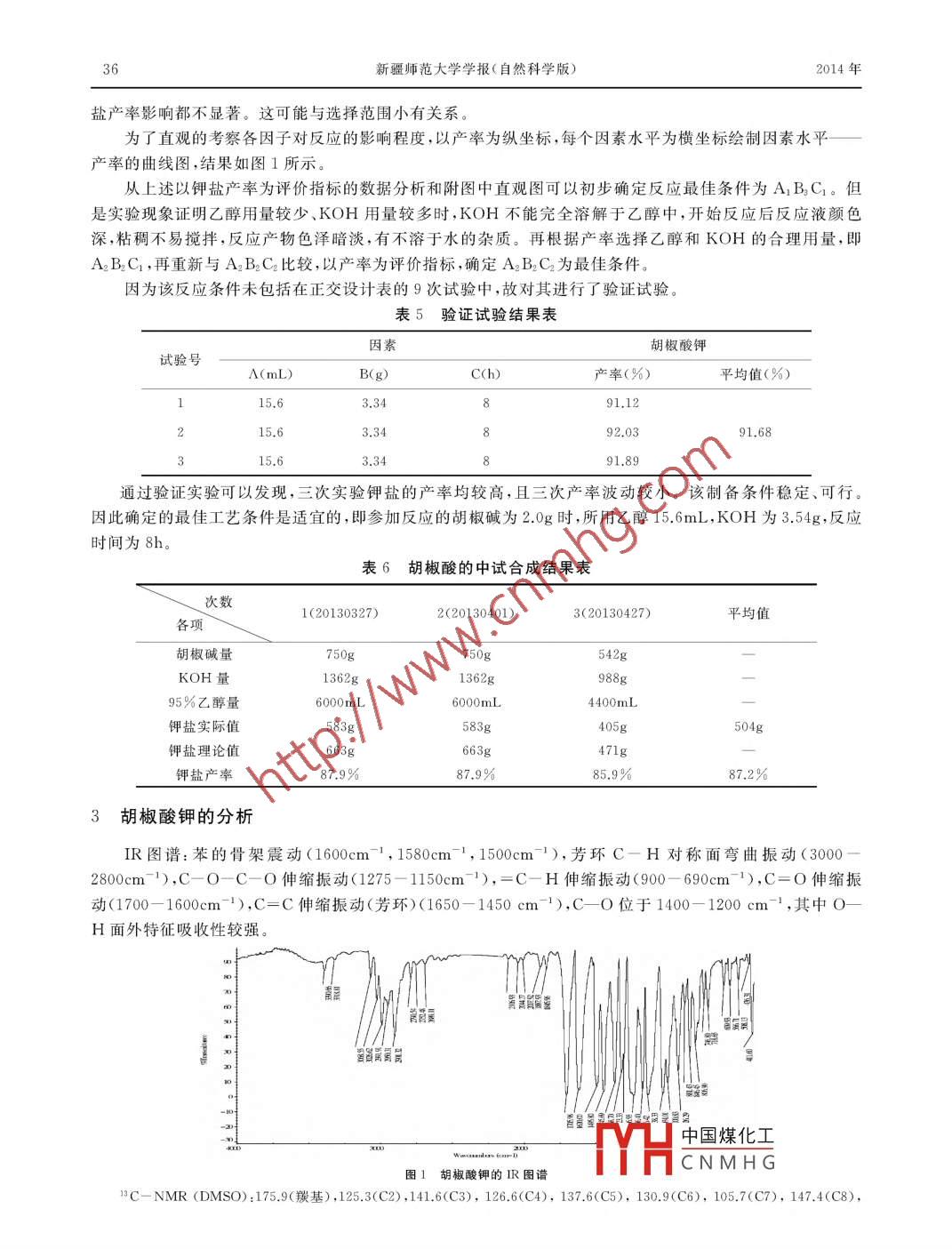 第33卷第3期《新疆師范大學學報》(自然科學版)Vol 33. No2014年9月Journal of Xinjiang Normal UniversitySep.2014(Natural Sciences Edition)胡椒酸鉀的分成工藝研究吐爾孫拜克·葉爾達,納森巴特(伊犁師范學院化學與生物科學學院,新疆伊寧8350000摘要:胡椒酸鉀是制備胡椒酸己二胺的重要合成中間體,確定工藝可行、成本合理、收率相對較高的胡椒酸鉀合成方法對制備胡椒酸己二胺有著重要的意義關鍵詞:胡椒酸鉀;合成;正交中圖分類號:0175,1文獻標識碼:A文章編號:10089659(2014)03003306胡椒酸是一種重要的精細化工原料,也是合成許多具有生物活性化合物的重要中間體。自然界中含胡椒基的化合物很多具有生物活性,如胡椒堿、胡椒酸酯、胡椒丁醚等。近來的研究表明,胡椒堿及其衍生物的有機化合物或胡椒酸酯化合物都有生物活性,胡椒堿具有降血脂作用口。關于胡椒酸己二酰胺的合成方法,文獻報道不多,吳勇等以胡椒酸酯原料合成了胡椒酰胺,文章以胡椒堿原料一步反應得到胡椒酸已二酰胺的中間體胡椒酸鉀,該合成方法溫和,是一條綠色環(huán)保的合成方法,反應路線如下KOH實驗部分1.1儀器和試劑反應釜S212-5L型、上海標和儀器有限公司;恒溫水油浴鍋GYY-5型、上海標和儀器有限公司;低溫冷卻循環(huán)泵DLSD-5/30型、精密鼓風干燥箱BAO-35A型、上海市施都凱儀器設備有限公司;循環(huán)水式多用真空泵SHB-I型、精密增力電動攪拌器J-1型、北京光明醫(yī)療儀器廠、數(shù)字熔點儀WRS-1B型、上海精密科學儀器有限公司;紅外分光光度計 IRRrestige-2型、日本制造、三用紫外分析儀YLN-11型、北京亞力恩科學器材公司。元素分析及紅外光譜由本校分析測試中心測試,HNMR;13CNMR由北京BRUKER公司測試中心測試。試劑:胡椒堿、西安瑞林生物科技有限公司;氫氧化鉀、天津市科盟化工工貿(mào)有限公司、乙醇(95%)、天津市福晨化學試劑有限公司;無水乙醇、天津市福晨化學試劑有限公;乙酸乙酯、天津市福晨化學試劑有限公司;正己烷、天津市福晨化學試劑有限公司、稀鹽酸、烏魯木齊市迪城化工有限公司。1.2實驗過程胡椒酸已二胺合成反應過程中用的催化劑KOH為強堿,反應中用量較多,因此,在其它條件恒定時減少KOH用量,看是否影響實驗結果,在其它條件不變時分別減少KOH用量到原來的1/10,和1/2時,鉀鹽中國煤化工[收稿日期]2014-03-14[基金項目]新疆維吾爾自治區(qū)國家科技合作計劃項目資助(201217152)CNMHG[作者簡介]吐爾孫拜克·葉爾達(1962—),男(蒙古族),新疆伊犁人,副教授,主要從事天然產(chǎn)物化學方面研究34新疆師范大學學報(自然科學版)2014年產(chǎn)率如表1所示。表1KOH的用量對產(chǎn)率的影響序號胡椒堿(g)乙醇用量(mL)KOH用量(g)反應時間(h)反應溫度(℃)鉀鹽產(chǎn)量(g)鉀鹽產(chǎn)率(%)0.76485.05abc1117,80.8858880.53159.130.1770.065胡椒堿99%,(西安瑞林生物科技有限公司),乙醇為95%乙醇,KOH為優(yōu)級純?yōu)榱嗽跍p少KOH的情況下,提高產(chǎn)率,延長了反應時間。首先將反應物以c的比例(即KOH的用量為原來的1/10)進行反應,直到反應48個小時。產(chǎn)率僅為41.98%,并且反應產(chǎn)物中有淡黃色的、不溶于水的雜質(zhì)。以b的比例(即KOH的用量為原來的1/2)重新進行延長時間的反應,在反應進行期間做同步TLC分析。結果顯示,反應10小時后TLC現(xiàn)象基本一致。雖如此,反應13小時產(chǎn)率僅為74.09%。因此,做正交實驗時,應該放棄KOH用量為原來用量的1/2。結果表明減少KOH用量會顯著降低反應產(chǎn)率,因此不可采取,只能考慮盡量回收催化劑。2正交實驗工藝條件篩選涉及的因素(直接影響評價指標的因子)和水平(每個因素所取值的個數(shù))較多。根據(jù)多、快、好、省原則,選擇恰當?shù)膶嶒灧椒?使之能減少試驗次數(shù),提高效率,節(jié)約時間和經(jīng)費,而且能得到準確的結論和最佳工藝條件。目前最常用的篩選方法有三種,即全面實驗法(又稱單因素篩選)、正交試驗法、均勻設計。其中全面實驗法的試驗次數(shù)較多,試驗次數(shù)N=rqs次(s為因素個數(shù),q為水平個數(shù),r為實驗重復次數(shù))。如有3個因素,每個因素有4個水平,實驗次數(shù)最少34=81。這樣多的實驗次數(shù),需要消耗大量的人力、物力、財力及時間,所以因素較多的實驗一般不采取此方法。均勻設計法只考慮試驗點在試驗范圍內(nèi)充分“均勻分散”而忽略“整齊可比”性。它為多因素、多水平的實驗提供了一種試驗次數(shù)比較少的涉及方法。試驗次數(shù)N=rq三因素四水平的試驗,僅作4次實驗即可。正交實驗法是根據(jù)組合理論,按一定規(guī)律構造正交表用來安排多因素試驗的方法。正交實驗所需作的實驗次數(shù),較全面試驗少得多采用正交實驗法應首先根據(jù)試驗本身需篩選的因素、水平,選擇好正交表頭和相對應的正交實驗表4]在多次制備胡椒酸的實驗過程中,發(fā)現(xiàn)影響產(chǎn)率的主要因素為;乙醇用量、KOH用量和反應時間。如表2所示為制備胡椒酸L(34)因素水平表和表頭設計。表2正交試驗的因素水平表水平A:乙醇用量(mL)B:KOH用量(g)C:反應時間(h)12311.23.5422.410以參加反應的胡椒堿2.000g為基礎,乙醇為95%乙醇,KOH為優(yōu)級純,其中各因素的三水平都圍繞著前人確定的最佳條件所設計。表3正交試驗L(34)設計表及結果因素評價指標試驗號A:乙醇用量(mL)B:KOH用量(g)C:反應時間(h鉀鹽產(chǎn)率(%)中國