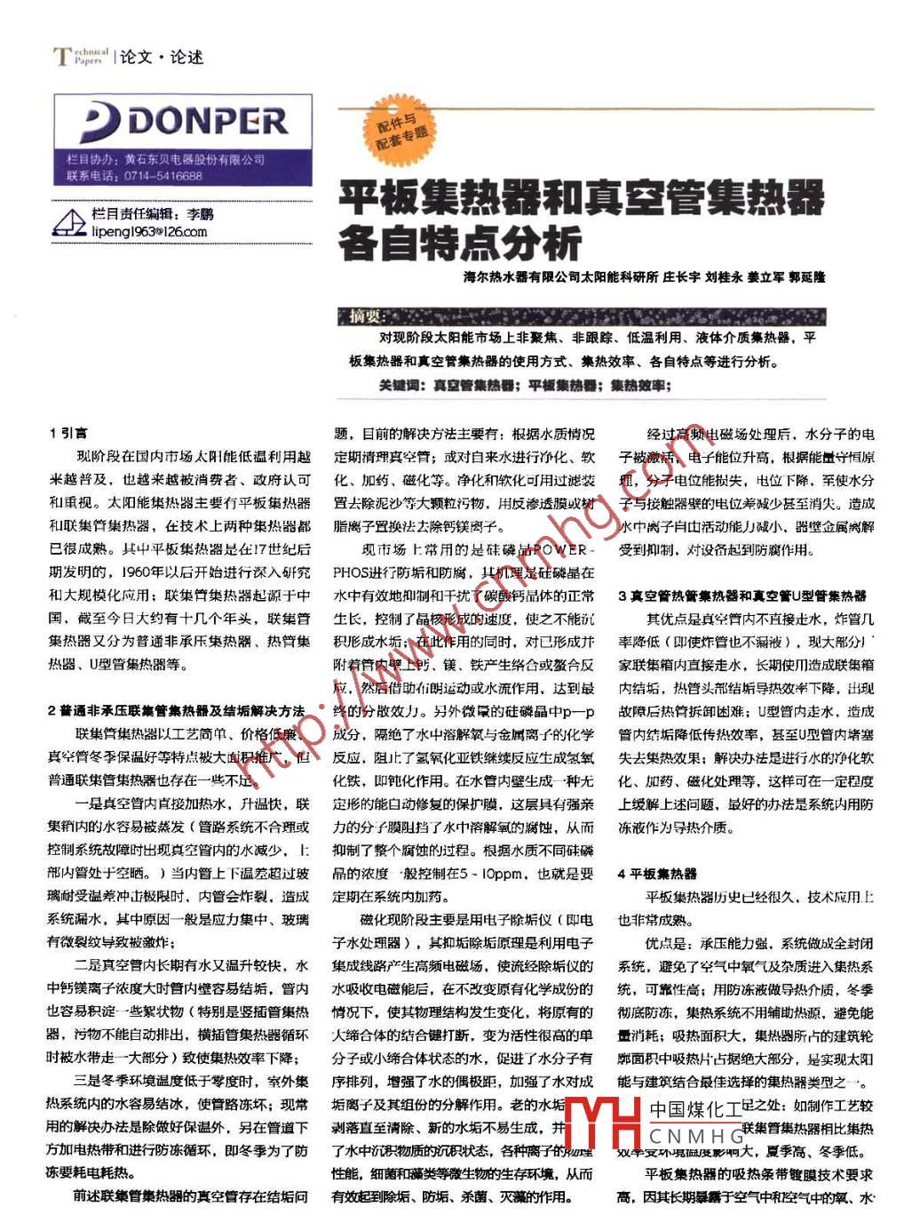 T論文·論述2DONPER件與配套專題配欄目協(xié)辦:黃石東貝電器股份有限公司聯(lián)系電話:0714-541668欄目責(zé)任編輯:李鵬平板集熱器和真管集熱器peng 963 126co備自特點(diǎn)分析海爾熱水器有限公司太陽能科研所莊長(zhǎng)宇劉桂永姜立軍郭延隆對(duì)現(xiàn)階段太陽能市場(chǎng)上非聚焦、非跟蹤、低溫利用、液體介質(zhì)集熱器,平板集熱器和真空管集熱器的使用方式、集熱效率、各自特點(diǎn)等進(jìn)行分析。關(guān)鍵詞:真管集熱器;平板集熱器;集熱效率;1引言題,目前的解決方法主要有:根據(jù)水質(zhì)情況經(jīng)過高頻電磁場(chǎng)處理后,水分子的電現(xiàn)階段在國內(nèi)市場(chǎng)太陽能低溫利用越定期清理真空管;或?qū)ψ詠硭M(jìn)行凈化、軟子被激活,電子能位升高,根據(jù)能量守恒原來越普及,也越來越被消費(fèi)者、政府認(rèn)可化、加約、磁化等。凈化和軟化可用過濾裝理,分子電位能損失,電位下降,至使水分和重視。太陽能集熱器主要冇平板集熱器置去除泥沙等大顆粒污物,用反滲透膜或樹子與接觸器璧的電位斧減少甚至消失。造成和聯(lián)集管集熱器,在技術(shù)上兩種集熱器都脂離子置換法去除鈣鎂閼子。水中離子山活動(dòng)能力減小,器壁金屬閼解已很成熟。其屮平板集熱器是在7世紀(jì)后現(xiàn)市場(chǎng)上常用的是硅磷品 POWER受到抑制,對(duì)設(shè)備起到防腐作用。期發(fā)明的,1960年以后開始進(jìn)行深入硏究PHOS進(jìn)行防垢和防腐,其機(jī)理是砫磷晶在和大規(guī)?;瘧?yīng)用;聯(lián)集管集熱器起源于中水中有效地和制和千擾了碳酸鈣旵體的正常3真空管熱簣集熱器和真空管U型管集熱器國,截至今日大約有十幾個(gè)年頭,聯(lián)集管生長(zhǎng),控制了晶核形成的逑度,使之不能沉其優(yōu)點(diǎn)是真空普內(nèi)不直接走水,炸管幾集熱器又分為普通非承壓集熱器、熱管集積形成水垢;在此作用的同時(shí),對(duì)已形成并率降低(即使炸管也不漏液),現(xiàn)大部分熱器、U型曾集熱器等。附著管內(nèi)壁上鈣、鎂、鐵產(chǎn)生絡(luò)合或螯合反家聯(lián)集箱內(nèi)直接走水,長(zhǎng)期使用造成聯(lián)集箱應(yīng),然后借助布朗運(yùn)動(dòng)或水流作用,達(dá)到最內(nèi)結(jié)垢,熱管頭部結(jié)垢導(dǎo)熱效率下降,出現(xiàn)2蓍通非承壓聯(lián)集管集熱器及緒垢解決方法終的分散效力。另外微的硅磷品中p一p故障后熱管拆卸困難;U型管內(nèi)走水,造成聯(lián)集餼集熱器以工藝簡(jiǎn)單、價(jià)格低廉、成分,隔絕了水屮溶解氧與金屬離f的化學(xué)管內(nèi)結(jié)垢降低傳熱效率,甚至U型管內(nèi)堵塞真空臂冬季保溫好等特點(diǎn)被大面積推廣,但反應(yīng),阻止了氫氧化亞鐵繼續(xù)反應(yīng)生成氫氧失去集熱效果;解決辦法是進(jìn)行水的凈化軟普通聯(lián)集管集熱器也存在一些不足化鐵,即鈍化作用。在水管內(nèi)壁生成種無化、加藥、磁化處理等,這樣可在一定程度是真空管內(nèi)直接加熱水,升溫快,聯(lián)定形的能自動(dòng)修復(fù)的保擴(kuò)膜,這層具有強(qiáng)親上級(jí)解上述問題,最好的辦法是系統(tǒng)內(nèi)用防集粕內(nèi)的水容易被蒸發(fā)(管路系統(tǒng)不合理或力的分f膜阻擋了水中溶解氧的腐蝕,從而凍液作為導(dǎo)熱介質(zhì)??刂葡到y(tǒng)故障時(shí)出現(xiàn)真空管內(nèi)的水減少,上抑制了整個(gè)腐蝕的過程。根據(jù)水質(zhì)不同硅磷部?jī)?nèi)管處于空曬。)當(dāng)內(nèi)眢上下溫差超過玻品的濃度般控制在5-ppm,也就是要4平板集熱器璃耐受溫差沖山極限時(shí),內(nèi)管會(huì)炸裂,造成定期在系統(tǒng)內(nèi)加藥。平板集熱器歷史已經(jīng)很久,技術(shù)應(yīng)用上系統(tǒng)漏水,其中原因一般是應(yīng)力集中、玻璃磁化現(xiàn)階段主要是用電子除垢儀(即電也非常成熟。有微裂紋導(dǎo)致被激炸;子水處理器),其抑垢除垢原理是利用電子優(yōu)點(diǎn)是:承壓能力強(qiáng),系統(tǒng)做成全封閉是真空管內(nèi)長(zhǎng)期有水又溫升較快,水集成線路產(chǎn)生高頻電磁場(chǎng),使流經(jīng)除垢儀的系統(tǒng),避免了空氣中氧氣及雜質(zhì)進(jìn)入集熱系中鈣鎂離子濃度大時(shí)管內(nèi)壁容易結(jié)垢,曾內(nèi)水吸收電磁能后,在不改變?cè)谢瘜W(xué)成份的統(tǒng),可靠性高;用防凍液做導(dǎo)熱介質(zhì),冬季也容易積淀一些絮狀物(特別是豎插管集熱情況下,使其物理結(jié)構(gòu)發(fā)生變化,將原有的徹底防凍,集熱系統(tǒng)不用輔助熱源,避免能器,污物不能自動(dòng)排出,橫插管集熱器循環(huán)大締合體的結(jié)合鍵打斷,變?yōu)榛钚院芨叩膯瘟肯?吸熱面積大,集熱器所占的建筑輪時(shí)被水帶走一大部分)致使集熱效率下降;分子或小締合體狀態(tài)的水,促進(jìn)了水分子有廓面積中吸熱片占據(jù)絕大部分,是實(shí)現(xiàn)太陽三是冬季環(huán)境溫度低于零度時(shí),室外集序排列,增強(qiáng)了水的偶極距,加強(qiáng)了水對(duì)成能與建筑結(jié)合最佳選擇的集熱器類型之一。熱系統(tǒng)內(nèi)的水容易結(jié)冰,使管路凍壞;現(xiàn)特垢離子及其組份的分解作用。老的水垢V凵中國煤化工足之處:如制作工藝較用的解決辦法是除做好保溫外,另在管道下剝落直至清除、新的水垢不易生成,并CNMHG聯(lián)集管集熱器相比集
