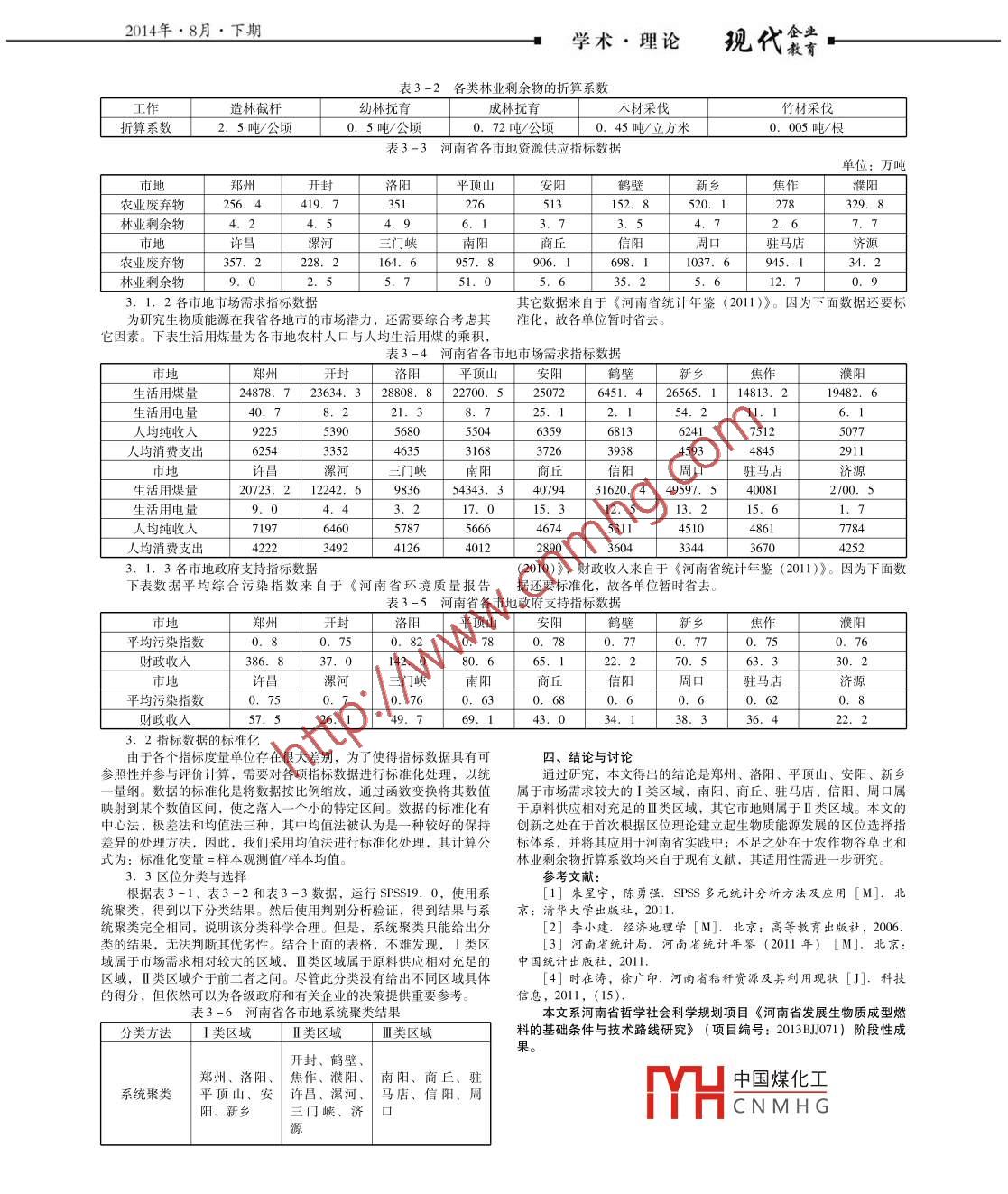 .經(jīng)濟(jì)與法一河南省發(fā)展生物質(zhì)能源產(chǎn)業(yè)的區(qū)位選擇研究史建軍(安陽工學(xué)院 河南安陽455000)摘要: 河南省作為我國一個(gè)農(nóng)業(yè)大省,農(nóng)林資源豐富,發(fā)展生物質(zhì)能源前景廣闊。本文根據(jù)區(qū)位理論建立了生物質(zhì)能源發(fā)展的區(qū)位選擇指標(biāo)體系,進(jìn)而對河南省實(shí)踐進(jìn)行研究。聚類分析的結(jié)果是鄭州、洛陽、平頂山、安陽、新鄉(xiāng)屬于市場需求較大的I類區(qū)域,南陽、商丘、駐馬店、信陽、周口屬于原料供應(yīng)相對充足的I類區(qū)域,其它市地則屬于II類區(qū)域。關(guān)鍵詞:區(qū)位理論河南省生物質(zhì)能源河南省作為我國一-個(gè)農(nóng)業(yè)大省,農(nóng)林資源豐富。同時(shí),我省陸地經(jīng)濟(jì)現(xiàn) 象之間的相互作用,因此將社會系統(tǒng)和社會結(jié)構(gòu)因素也加入到面積廣闊,地形地勢復(fù)雜多樣,導(dǎo)致其十八個(gè)地市農(nóng)林生產(chǎn)條件和結(jié)區(qū) 位因索范圍。構(gòu)差異較大。研究其所屬地市的區(qū)位優(yōu)勢,對于我省發(fā)展生物質(zhì)能源二、生物質(zhì)能源產(chǎn)業(yè)發(fā)展區(qū)位選擇的指標(biāo)體系構(gòu)建從現(xiàn)有文獻(xiàn)來看,包括原料收集成本和銷售成本在內(nèi)的成本是制一、區(qū)位理論簡述約生物質(zhì)能源行業(yè)持續(xù)發(fā)展的重要因素,因此,當(dāng)?shù)厣a(chǎn)、當(dāng)?shù)劁N售區(qū)位理論是區(qū)域經(jīng)濟(jì)理論起源的基石,是區(qū)域經(jīng)濟(jì)學(xué)的核心基礎(chǔ)就成為諸多生物質(zhì)能源企業(yè)的不二-選擇。根據(jù)市場營銷理論,需求和理論之一,區(qū)位理論是關(guān)于人類活動所占有場所的理論,經(jīng)濟(jì)活動的供給 是- - 個(gè)市場得以形成的兩個(gè)方面,所以,對于該行業(yè)來講,當(dāng)?shù)貐^(qū)位理論則構(gòu)成經(jīng)濟(jì)區(qū)位理論。區(qū)位理論根據(jù)產(chǎn)生與發(fā)展的先后,可充分的市場需求和原料供給是區(qū)位選擇時(shí)至關(guān)重要的兩個(gè)指標(biāo)。眾所以分為古典區(qū)位理論、新古典區(qū)位理論和現(xiàn)代區(qū)位理論。周知,該行業(yè)又是- -個(gè)效益不佳的行業(yè)且具有較強(qiáng)的正外部性,政府1. 1古典區(qū)位理論的大力支持是其得以順利成長的保證。很顯然,政府支持就成為區(qū)位古典區(qū)位理論認(rèn)為決定企業(yè)工業(yè)布局和經(jīng)濟(jì)活動的目標(biāo)函數(shù)是生選擇時(shí)的另一個(gè)指標(biāo)。綜上,生物質(zhì)能源發(fā)展區(qū)位選擇的指標(biāo)體系包產(chǎn)成本極小化。這一學(xué)派的代表人物有杜能、 龍哈特、韋伯等。杜能括原料供給 、市場需求和政府支持三個(gè)方面的指標(biāo)。認(rèn)為,城市周圍土地的利用類型及農(nóng)業(yè)集約化程度都是隨其與城市距2. 1原料供給方面的指標(biāo)離的遠(yuǎn)近而呈帶狀變化的由內(nèi)向外的一系列同心圓 ,這些同心圓被稱生物質(zhì)能源產(chǎn)業(yè)以農(nóng)林作物及其附屬物為原料,但為了避開爭糧為“ 杜能圈”,每個(gè)圈都有自己的主要產(chǎn)品和自己的耕作制度。杜能和毀林等議題, 一般的研究僅限于附屬物。所以,原料供給方面的指引人了運(yùn)輸成本作為農(nóng)業(yè)區(qū)位選擇的重要因子。龍哈特的主要貢獻(xiàn)是標(biāo)主要有兩個(gè),分別是農(nóng)業(yè)廢棄物供應(yīng)量和林業(yè)剩余物供應(yīng)量。農(nóng)業(yè)提出了運(yùn)輸成本極小化為特征的區(qū)位三角形,為工業(yè)區(qū)位理論奠定了廢 棄物是指主要農(nóng)作物的副產(chǎn)品,包括秸稈、棒芯和果樹樹枝等。此基礎(chǔ)。韋伯第-一個(gè)完整地提出了工業(yè)區(qū)位理論,并提出了區(qū)位因子及中農(nóng)作物僅限于制造生物質(zhì)能源常用原料來源,包括稻谷、小麥、3其體系的概念。這個(gè)體系包括三大因子,即運(yùn)輸成本、勞動力成本和米、 其它谷類、大豆、綠豆、花生、油菜籽、芝麻、棉花、麻類、煙聚集因子。韋伯那個(gè)時(shí)代,他列舉出的比較重要的區(qū)位因子有:運(yùn)葉和果樹等。林業(yè)剩余物是指造林、撫育和采伐過程中剪枝而產(chǎn)生的輸費(fèi)用、工資、土地費(fèi)用、原材料及燃料費(fèi)用、建筑物及其設(shè)備、利剩余物。率等。2.2.2市場雷需求方面的指標(biāo)1.2新古典區(qū)位理論因?yàn)槭钱?dāng)?shù)厣a(chǎn)、當(dāng)?shù)劁N售,所以我們僅考慮農(nóng)民生活需求,即新古典區(qū)位理論認(rèn)為決定企業(yè)工業(yè)布局和經(jīng)濟(jì)活動的目標(biāo)函數(shù)是用以代替生活用煤 和生活用電情況,不考慮工業(yè)鍋爐的使用。市場需最大限度地服務(wù)目標(biāo)市場。隨著社會的進(jìn)步,運(yùn)輸成本已不再是決定求由需求量、購買能力和購買動機(jī)所構(gòu)成,因此,市場需求方面的指企業(yè)選址的主要因素,產(chǎn)品的銷售成了企業(yè)思考的中心問題。德國經(jīng)標(biāo)就包括生活用煤量、生活用電量、人均純收人和人均消費(fèi)支出等指濟(jì)學(xué)家克里斯泰勒發(fā)現(xiàn)某一服務(wù)點(diǎn)的最優(yōu)服務(wù)面是圓形,它的半徑可標(biāo)。前兩個(gè)指標(biāo)是對需求量的反映,后兩個(gè)指標(biāo)則是對