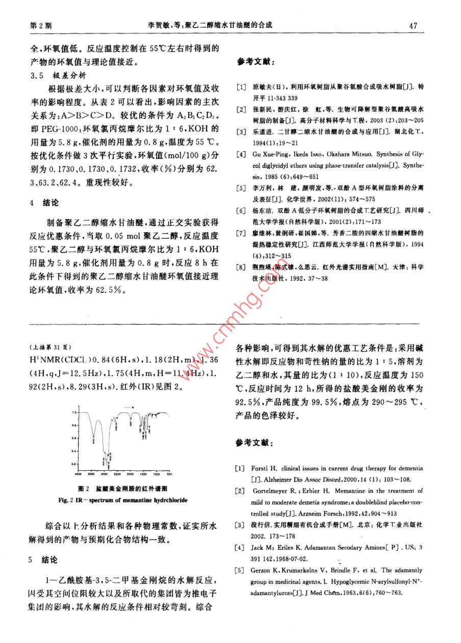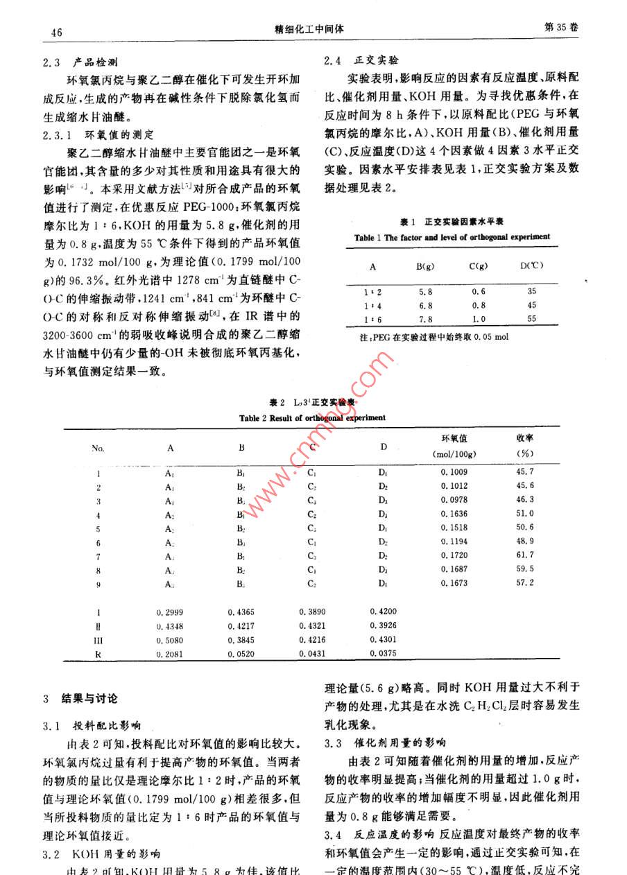 第35卷第2期精細化工中間體 Vol. 35 No.22005年4月 FINE CHEMICAL INTERMEDIATES April 2005聚乙二醇縮水甘油醚的合成李賀敏,金華朱紅軍(南京工業(yè)大學理學院應用化學系,江蘇南京210009)摘要:以聚乙二醇(PEG-1000)、環(huán)氧氯丙烷和KOH為原料,四丁基澆化銨( Bu NBr)為催化劑制得聚乙二醇縮水甘油醚。通過正交試驗研究了聚乙二醇縮水甘油醚制備過程中反應溫度、原料配比、催化劑用量、KOH用量對產(chǎn)物收率及環(huán)氧值的影響。實驗結(jié)果表明當取0.05 5 mol PEG--1000,0.3mol環(huán)氧丙烷和5.8gkoH時,在0.8 Bu NBr催化作用下,于55℃反應8h得到的產(chǎn)物具有校為理想的收率和環(huán)氧值。并用傅立葉紅外光譜及環(huán)氧值對產(chǎn)物進行了表征。關(guān)鍵詞:聚乙二醇縮水甘油醚;合成;環(huán)氧值;正交實驗中圖分類號:TQ223.2文獻標識碼:A文章編號:1009-9212(2005)02-0045-03 Synthesis of Polyethylene Glycol Bisglycidyl Ether LI He-min, JIN Hua, ZHU Hong-jun (College of Science, Nanjing University of Technology, Nanjing 210009, China) Abstract: Polyethylene glycol bisglycidyl ether was synthesized by the reaction of polyethylene glycol (average mol weight 1000, PEG-1000) with epichlorohydrin and KOH, under the catalysis of tetrabutylam- monium bromide( Bu, NBr). The conditions of the reaction, such as the temperature of reaction, reaction time, the mol ratio of the raw materials and amount of catalyst were studied. The results showed the opti- mal yield and epoxy value could be obtained when 0.05 molPEG-1000, 0. 3 mol epichlorohydrin reacted with 5.8 g KOH for 8h, under 55 C, 0.8 g Bu: NBr. Its structure was characterized by IR and epoxy val- ue. Key words: Polyethylene glycol bisglycidyl ether;synthesis; epoxy value;orthogonal experiment聚乙二醇1000(PEG1000)(CA),環(huán)氧氯丙烷,1前言四丁基溴化銨,KOH,CH2Cl2均為分析純。傅立葉聚乙二醇縮水甘油醚是一種脂肪族雙環(huán)氧基樹紅外光譜儀,HH-4數(shù)顯恒溫水浴鍋循環(huán)水式多用脂,是一種良好的交聯(lián)劑。近年來,合成低分子真空泵JJ1精密增力電動攪拌器量、收率高的縮水甘油醚的較多,而合成高分子量,2.2實驗收率較高,環(huán)氧值接近理論環(huán)氧值的聚乙二醇縮水首先將0.05mol分子量是1000的聚乙二醇、甘油醚的較少。為了得到收率高,環(huán)氧值接近一定量的環(huán)氧氯丙烷、KOH、四丁基溴化銨和CH2理論環(huán)氧值的聚乙二醇縮水甘油醚,筆者對聚乙二Cl2加入裝有電動攪拌、回流冷凝管和溫度計的250醇縮水甘油醚的合成工藝進行了研究,其中包括聚ml三口燒瓶中攪拌并在30min內(nèi)加熱升溫至所乙二醇與環(huán)氧氯丙烷的配比,KOH用量,催化劑用定的反應溫度,在此溫度下繼續(xù)攪拌反應8h過濾量反應溫度等因素的影響,從而制備出粘合性、反除去生成的無機鹽,CH2Cl2層水洗三次,再用無水應性及耐熱性良好的聚乙二醇縮水甘油醚。硫酸鈉干燥后,常壓蒸餾除去溶劑CH2Cl2,得到產(chǎn)物聚乙二醇縮水甘油醚。采用傅立葉紅外光譜儀測2實驗部分定聚乙二醇1000縮水甘油醚的紅外光譜圖。滴定2.1化學試劑和儀器法測得環(huán)氧值作者簡介:李賀(1978-)女吉林吉林人,碩士研究生,主要從事有機合和應用化學方面的研究E-m46精細化工中間體第35卷2.3產(chǎn)品檢測2.4正交實驗環(huán)氧氯丙烷與聚乙二醇在催化下可發(fā)生開環(huán)加實驗表明,影響反應的因素有反應溫度、原料配成反應生成的產(chǎn)物再在堿性條件下脫除氯化氫而比、催化劑用量、KOH用量。為尋找優(yōu)惠條件,在生成縮水甘油醚。反應時間為8h條件下,以原料配比(PEG與環(huán)氧2.3.1環(huán)氧值的測定氯丙烷的摩爾比,A)、KOH用量(B)、催化劑用量聚乙二醇縮水甘油醚中主要官能團之一是環(huán)氧(C)、反應溫度(D)這4個因素做4因素3水平正交官能團,其含量的多少對其性質(zhì)和用途具有很大的實驗。因素水平安排表見表1,正交實驗方案及數(shù)影響小本采用文獻方法對所合成產(chǎn)品的環(huán)氧據(jù)處理見表2值進行了測定,在優(yōu)惠反應PEG1000:環(huán)氧氯丙烷摩爾比為1:6,KOH的用量為5.8g,催化劑的用表1正交實驗因素水平表量為0.8g,溫度為55℃條件下得到的產(chǎn)品環(huán)氧值 Table 1 The factor and level of orthogonal experiment為0.1732mol/100g,為理論值(0.1799mol/100AB(g)C(g)D(℃)g)的96.3%。紅外光譜中1278cm為直鏈醚中CC的伸縮振動帶,1241cm,841cm為環(huán)醚中C1:25.80.6351:46.80.8450-C的對稱和反對稱伸縮振動,在IR譜中的1:67.81.0553200-3600cm的弱吸收峰說明合成的聚乙二醇縮注:PEG在實驗過程中始終取0.05mol水甘油醚中仍有少量的OH未被徹底環(huán)氧丙基化,與環(huán)氧值測定結(jié)果一致。表2L3正交實驗表 Table 2 Result of orthogonal experiment環(huán)氧值收率 NoD(mol/100g)(%12345678AAAAAAAAAABBBBBBBBCcccD0.100945.7 D20.101245.6D0.097846.3D0.163651.0C0.151850.6 B.D0.119448.9ccD0.172061.7D0.168759.59 B. C:D0.167357.20.29990.43650.38900.42001‖0.43480.42170.43210.39260.50800.38450.42160.43010.20810.05200.04310.0375理論量(5.6g)略高。同時KOH用量過大不利于3結(jié)果與討論產(chǎn)物的處理,尤其是在水洗CH2Cl層時容易發(fā)生3.1投料配比影響乳化現(xiàn)象。由表2可知,投料配比對環(huán)氧值的影響比較大3.3催化劑用量的影響環(huán)氧氯丙烷過量有利于提高產(chǎn)物的環(huán)氧值。當兩者由表2可知隨著催化劑的用量的增加,反應產(chǎn)的物質(zhì)的量比僅是理論摩爾比1:2時,產(chǎn)品的環(huán)氧物的收率明顯提高;當