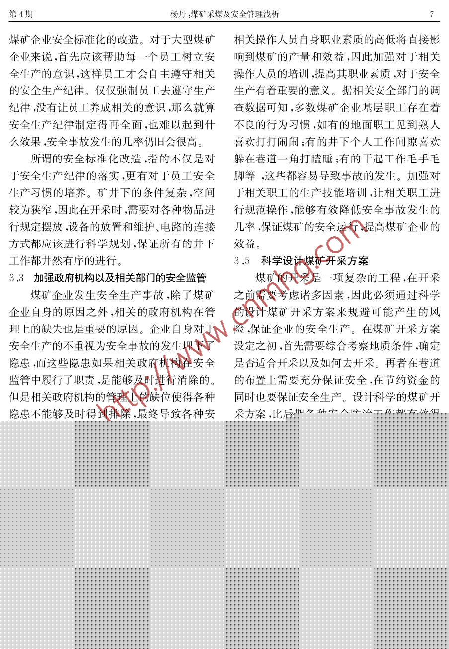 2015年第4期淮南職業(yè)技術(shù)學院學報NO .4 ,2015第15卷(總第64期)JOURNAL OF HUINAN VOCATIONAL & TECHNICAL COLLEGEVOL.15 ,Serial No .64煤礦采煤及安全管理淺析楊丹(大同煤炭職業(yè)技術(shù)學院,山西大同037003 )[摘要]煤炭資源是我國電力資源的主要供給之一 ,煤礦的安全生產(chǎn)對于保證電力的充分供應有著重要的意義;近年來我國的煤礦頻發(fā)安全事故,造成了重大人員傷亡和經(jīng)濟損失,在這樣的環(huán)境背景下,加強對煤礦安全生產(chǎn)的研究,能夠保障人民群眾的生命財產(chǎn)安全,體現(xiàn)了廣大人民群眾的根本利益,反映了先進生產(chǎn)力的發(fā)展要求和先進文化的前進方向;簡要闡述煤礦技術(shù)與安全管理之間的協(xié)調(diào)關系,對煤礦采煤技術(shù)與安全管理存在的問題與不足進行探究,提出加強煤礦采煤技術(shù)與安全管理的措施,希望對煤礦行業(yè)的發(fā)展有所裨益。[關鍵詞]煤炭資源;煤礦開采;安全管理;措施[中圖分類號]TD823[ 文獻標識碼]B[ 文章編號]1671一4733 (2015 )04 - 0005 03DOI :10.3969/j .issn.1671一4733.2015 .04.002中國作為世界上第二大經(jīng)濟體,經(jīng)濟發(fā)國煤炭行業(yè)的發(fā)展 具有重要的意義。展在近幾十年來取得了舉世矚目的成就,而.煤礦的安全生產(chǎn)管理工作對于煤礦采煤在中國經(jīng)濟迅速增長的背后,是源源不斷的技術(shù)的要求比較高,傳統(tǒng)的采煤技術(shù)存在諸電能作為支持的,而我國的電能主要來源于多的弊端,在煤礦的通風巷道和作業(yè)巷道的煤炭資源,因此可以說煤炭資源是我國重要的布 置存在不合理的地方,因此極易引起安全經(jīng)濟命脈。從各種新能源的開發(fā)情況來看,在事故的 發(fā)生。而這些隱患在一- 些小型煤礦仍未來相當長的一段時間內(nèi) ,煤炭資源仍舊是我舊存在,對于大型煤礦來說,大型煤礦主要缺國的主要能源供應,因此提高現(xiàn)有的煤礦開采乏 的是技術(shù)管理以及安全管理措施,在生產(chǎn)效率,健全煤礦開采安全機制,具有重要的現(xiàn)施工時過于追求利益,從而導致煤礦事故的實意義。頻繁發(fā)生。1煤礦技術(shù)與安全 管理之間的協(xié)調(diào)關系加強對于煤礦開采技術(shù)的更新,提高安我國原煤產(chǎn)量占到世界產(chǎn)量的35% ,但全管 理措施,既能夠提高煤礦的生產(chǎn)效率,提是我國每年煤礦工人死亡人數(shù)卻占到了世界高產(chǎn)量,也能夠很好地避免安全事故的發(fā)生,煤礦工人死亡人數(shù)的80%,可以說我國煤礦減少安全事故所造成的人員傷亡和經(jīng)濟損逐年增產(chǎn)的背后是安全事故的頻發(fā),因此優(yōu)失。對于傳統(tǒng)煤礦開采技術(shù)的更新,使得井化煤礦采煤技術(shù),,增強安全管理措施,對于我下中國煤化工,保障了井下施工人TYHCNMHG[收稿日期]2015-08 - -14[作者簡介]楊丹(1983- ),女 ,山西大同人,助理講師,碩士研究方向為礦井通風與風塵治理,電話18223776淮南職業(yè)技術(shù)學院學報第15卷員的生命財產(chǎn)安全。而加強安全管理措施,企業(yè)運行的最終目的是為了創(chuàng)造經(jīng)濟利.則可以進一步降低安全事故發(fā)生的風險,將益,無論在哪個國家的企業(yè)都是如此,但是很企業(yè)可能經(jīng)受的風險降到最低,從而切實提多煤礦企業(yè)為了爭取更大的經(jīng)濟利益,忽視高企業(yè)的生產(chǎn)效益。了對員工的安全教育培養(yǎng),從而使得很多員2煤礦采煤技術(shù)與安全管理存在的問題工沒有建立應有的安全防護意識,不僅容易2.1 相關資金投入不夠?qū)е赂鞣N事故的發(fā)生,而且通常會造成巨大隨著我國市場經(jīng)濟體制的改革,很多煤的經(jīng)濟損失。 相較于安全事故發(fā)生之后的重礦因為脫離了國有制的約束,使得自身的收大經(jīng)濟損失,在對員工進行安全教育培養(yǎng)上益出現(xiàn)了一定的下滑,在這樣的環(huán)境背景下,的花費就可以忽略不計了 。企業(yè)對于安全教相關煤炭企業(yè)難以下定決心將資金投入到對育培訓的忽 視,會讓員工認為企業(yè)不重視自于技術(shù)的革新之中,自然也就難以降低生產(chǎn)己,從而難以對企業(yè)產(chǎn)生認同感,這會大大降成本。相關資金投人的缺乏不僅使得煤礦企低員工的責任心,影響企業(yè)的長遠發(fā)展。業(yè)的開采成本高于其他企業(yè),也不利于在激3加強煤礦采煤技術(shù)與安全管理的策略烈的市場競爭中取得優(yōu)勢。3.1提高機械化水平2.2 安全生產(chǎn)紀律執(zhí)行力低,地下煤礦開采的條件復雜,受到各種環(huán)縱觀我國的煤礦企業(yè)生產(chǎn),很多煤礦企境影響,井下相關開采機械的運行以及人員業(yè)中都有明確的安全生產(chǎn)紀律,但是對于安的操作都受到限制,因而容易為各種安全事全生產(chǎn)紀律的執(zhí)行力卻很低,因而很容易發(fā)故的發(fā)生埋下隱患。 為了解決這一問題,相現(xiàn)各種違規(guī)生產(chǎn)的情況,甚至企業(yè)的領導也關煤礦企業(yè)可以提高自身的機械化水平,利用不去重視對于安全生產(chǎn)紀律的執(zhí)行,使得安機械來取代人 力進行操作,不僅可以提高生產(chǎn)全事故發(fā)生的幾率成倍增加。例如:有的員效率 ,而且能夠適應各種復雜環(huán)境的作業(yè)。工不遵守安全生產(chǎn)紀律,在井下進行各種違對于煤礦企業(yè)來說,在追求經(jīng)濟效益最規(guī)操作,而對于