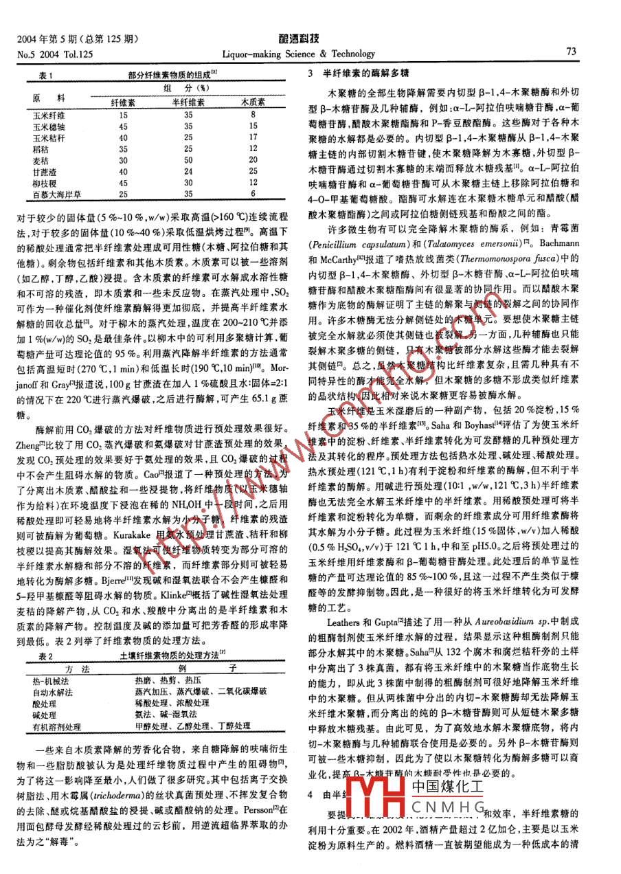 酒科技2004年第5期(總第125期)Liquor-making Science TechnologyNo.52004Tol125半纖維素發(fā)酵生產燃料乙醇的研究進展張宇昊,王頡,張偉,李長文,馬良,周威(河北農業(yè)大學食品科技學院河北保定071001)摘要:將半纖維素轉化成燃料酒精時,必須先轉化成小分子的半纖維素糖,之后發(fā)酵成酒精。預處理是關健工藝酶解前用CO3爆破法對纖維物質進行預處理效果很好;酶解前用稀酸預處理可將半纖維素和淀粉轉化為單糖,而剩余的纖維素成分可用纖維素酶將其水解為小分子糖,該法是一種很好的將玉米纖維轉化為可發(fā)酵糖的工藝。應用代謝工程作為工具選育一些藺株,可有效而經濟地將半纖維素水解液中的各類糖類轉變?yōu)橛杏玫漠a物。(陶然)關鍵詞:燃料乙醇;半纖維素;預處理;半纖維素水解糖中圖分類號:Ts2622;TS2614文獻標識碼:B文章編號:0019286(20405-002203Research Progress of Hemicellulose Fermentation to Produce Fuel AlcoholZHANG Yu-hao, WANG Jie and ZHANG Wei et al.(Food Science Technology College of Hebei Agriculture University, Baoding, Hebei 071001, China)Abstract: Before the conversion of hemicellulose into fuel alcohol, hemicellulose must firstly be converted into micromolecule hemicellu-lose sugar and then into alcohol through fermentation. During the conversion, pretreatment was a key technique. CO, blasting methodapplied in pretreatment before enzymolysis could achieve satisfactory effects. Diluted acid pretreatment before enzymolysis could converthemicellulose and amylum into monose, and the residual cellulose components could be hydrolyzed into micromolecule sugar by cellelase. It proved a good technique for the conversion of corn cellulose into fermentable sugar. And some strains developed by the meanof metaboly work could effectively and economically convert varieties of sugar in hemicellulose digest into useful product. (Tran. byYUE Yang)Key words: fuel alcohol; hemicellulose; pretreatment; hemicellulose hydrolyzed sugar在自然界中普遍存在的木質纖維素( lignocellulosic materi-醛酸叩。米糠中性木聚糖包括46%的木糖,4.9%的阿拉伯糖6.als),主要由纖維素、半纖維素和木質素組成,這些物質是陸生植%的半乳糖,19%的葡萄糖和11%的脫水糖醛酸。小麥阿拉伯木物細胞璧的主要組分。半纖維素較集中于初級和次級細胞壁中,與聚糖包括658%的木糖,335%的阿拉伯糖,0.1%的甘露糖0.1木質素和纖維素結合在一起,以增強細胞壁的強度"。%的半乳糖和03%的葡萄糖。玉米纖維木聚糖是一種包含B-1近年來,半纖維素由于其在工農業(yè)的實際應用而受到重視,其4鍵合木糖殘基的復雜異質木聚糖,包括48%-54%的木糖,33%中半纖維素物質因其可高效地轉化成燃料酒精而備受關注。在半35%的阿拉伯糖,5%-11%的半乳糖和3%-6%的葡萄糖醛酸纖維素轉化成燃料酒精時,其必須先轉化成小分子的半纖維素糖,四。之后再發(fā)酵成酒精。本文對半纖維素的結構及其糖化發(fā)酵的方法2半纖維素的預處理做一介紹。纖維物質包括不同的農業(yè)廢棄物(秸稈殼、莖、桿)、落葉和松1半纖維素的結構木、城市廢物及工廠的紙漿廢物、草本農作物。這些物質的組成不半纖維素是戊糖(木糖、阿拉伯糖)、己糖(甘露糖、葡萄糖、半同,主要組分是纖維素(20%-35%),其次是半纖維素(20%-35乳糖)和糖酸所組成的不均一聚糖,為異質多糖,結構與纖維素不%)和木質素(10%-25%)。蛋白質、油脂和灰分是土壤纖維物質同硬木半纖維素中含有較多的木聚糖,但軟木半纖維素中則含有的其他組成成分叫。表1列出了部分纖維物質的主要組成。這些物較多的葡甘露聚糖凹。質的結構非常復雜,而且本身的組成對酶解具有一定的抗性。在一木聚糖是含量最多的一類半纖維素叫。木聚糖被分為線性同般纖維物質的結構模式中,纖維素纖維被鑲嵌在一個木質多糖的型木聚糖、阿拉伯糖基木聚糖、葡萄糖醛木聚糖和葡萄糖醛阿拉伯矩陣中。木聚糖在以共價鍵和非共價鍵聯結的完整細胞壁中起著糖基木聚糖十分重要的作用大約80%的木聚糖主鏈含有側鏈,阿拉伯糖和葡萄糖醛酸的纖維素物質的預處理是酶解的關鍵。預處理主要包括粉碎、溶單體側鏈及包含阿拉伯糖、木糖及半乳糖殘基的寡聚側鏈分別鍵解、水解和分離纖維素、半纖維素和木質素組分。這些方法包括濃合于主鏈D-木糖殘基的C-3和C-2位置上。不同源的木聚糖,酸、稀dYH中國煤化工爆破、潮濕-氧化、石灰處如草、谷類、軟木和硬木其組成上都有所不同。樺樹木木聚糖包括理、熱在每種處理中,原物質893%的木糖,1%的阿拉伯糖,14%的葡萄糖和83%的脫水糖的體CNMHG稀酸預處理有兩種方法收稿日期:2003-12-22;修回日期:2004-05-28作者簡介:張宇吳(1978-),男,在讀碩士研究生004年第5期(總第125期)釀酒技No.52004To.125r-making Science Technology部分纖維素物質的組成3半纖維索的酶解多糖組分(%)木聚糖的全部生物降解需要內切型β-1,4-木聚糖酶和外切纖維素半纖維素米纖維型β-木糖苷酶及幾種輔酶,例如:a-L-阿拉伯呋喃糖苷酶,a-葡米穗軸玉米秸稈550500535萄糖苷酶醋酸木聚糖酯酶和P-香豆酸酯酶。這些酶對于各種木572052聚糖的水解都是必要的。內切型β-1,4-木聚糖酶從β-1,4-木聚25糖主鏈的內部切割木糖苷鍵,使木聚糖降解為木寡糖,外切型β-木糖苷酶通過切割木寡糖的末端而釋放木糖殘基。α-L阿拉伯柳枝稷呋喃糖苷酶和α-葡萄糖苷酶可從木聚糖主鏈上移除阿拉伯糖和百慕大海岸草4-0-甲基葡萄糖酸。酯酶可水解連在木聚糖木糖單元和醋酸(醋對于較少