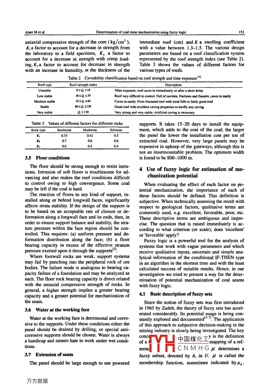bleonlineatwww.sciencedirectconMININGScienceDirectSCIENCE ANDTECHNOLOGYining Science and Technology 19(2009)0149-0154Determination of coal mine mechanization using fuzzy logicAtaei M, Khalokakaei R, Hossieni MFaculty of Mining, Petroleum and Geophysics Engineering, Shahrood University of Technology, Semnan 3619995161, iranAbstract: Two of the most important tasks in coal mines are to improve efficiency and to increase production besides keepingsafety constantly in mind. In order to obtain these goals, mine mechanization is required. Mine mechanization needs high levels ofnvestment and should therefore be studied carefully before final decisions about mechanization are made. When analysizing thepotential for mechanization the following, rather imprecise, factors should be considered: seam inclination and thickness, geological disturbances, seam floor conditions, roof conditions, water at the working face and the extension of seams. In our study wehave used fuzzy logic, membership functions and created fuzzy rule- based methods and to considered the ultimate objectivemechanization of mining. As a case study, the mechanization of the Takht coal seams in Iran was investigated. The results show ahigh potential for mechanization in most of the Takht coal seams.Keywords: fuzzy set; mechanization; coal seams: productivity; safety1 Introductiontions: these may be split broadly into longwall andpillar methods of workingThe fundamental task of mining engineers is toThe longwall coal mining method is widely perproduce more coal at a given level of labour input ceived to be a twentieth century development; howand material costs, optimum quality and maximum ever, the concept is actually believed to have beenefficiency. To achieve these goals, it is necessary to developed more than 200 years ago. Its main advanceautomate and mechanize mining operations. Mecha- is that earlier operations were, in principle, manual,nization is an objective that can result in significant while since the 1950s, the level of mechanization hascost reductions and higher levels of profitability for increased to the stage that today longwall faces areunderground mines. For these reasons mining engi- highly productive units which can be operated by aneers are continuously looking for different ways to very small work crew. This method has a simple sys-mechanize mining procedures, especially the mecha- tem layout and provides for continuous productionnization of underground coal mines that provide a and full potential for mechanization, which can fur-large potential for reduced costs, increased safety and ther improve productivity, personnel health andimproved profitability. Mechanization and automa- safety. Mechanized longwall rather than other coaltion are changing the way in which ore deposits are mining methods are more expensive to equip andbeing mined. The industry needs more energy-effi- operate, but are in general more productivecient methods, systems and approachesIn this study we have reviewed some of the factorsFor many years, machines have been used to ex- affecting the development of mine mechanization,ascavate soft minerals in underground mines on a con- well as some other factors that will be required fortinuous basis. In some cases, this includes soft or successful mechanization in the future. As a caseweak rocks, surrounding the valuable minerals which study, we present the mechanization of the Takht coalare being extracted. Coal is probably the most com- seams in Iranmon exarThe methods of working coal seams have gradu- 2 Objectives of mechanizationprogressively improvemodified as knowledge and experience are gainedThe most important objectives of mechanizationand power machines become available. Over the are followced costs; faster development; fasteryears,a very large number of coal mining methods mini中國煤化工 ng production athave been developed to suit seams and local condi- fewerproduction ratesCNMHGReceived 04 May 2008: accepted 16 September 2008Corresponding author. Tel: +98-273-3335509: E-mail address: ataei@shahroodutac irMining Science and Technologyvol 19 No. 2per shift; mining with smaller underground crews; placement index (I), a parameter, to quantify geomaller capital expenditure per extracted ton of coallogical disturbances as followswork under protectively supported roofs; develop-ment of more productive crews3 Factors affecting the development of and m is the thickness of the seam(m). table I cm)where t is the displacement of a seam by faultsmechanizationthe level of seam uniformity with respect to the indexof displacement. In this classification, seam uniform-In order to take advantage of mine mechanization, ity ranges from 0 to 1, where seams with an indexeither in an entire mine or at least a section of a mine, 1, =0 are completely uniform and seams with a dis-some factors must be considered. Seam gradient andthickness, geological disturbances, seam floor condiplacement index of more than 3, are considered to benon-uniformtions and roof formation are some of the most im-portant factors that affect the potential of coal seamsTable 1 Proposed, classification for determinationSeam uniformity3.1 Seam inclinationUniform06-1.000.5Most longwall mining activities occur in flat oreSemi uniform0.2-0605-15deposits or nearly flat seams. In general, seams with00.215-3.0low a dip(zero or near-zero dip angles) are moreamenable for mechanization With increased sear3. 4 Roof conditionsgradients, the application of mechanization becomesmore difficult. Although the best operational condi-Roofs should cave. If a roof does not cave ortions are on level seams, in rare cases seams with up hangs, it is not suitable for longwall miningto 80 degrees of inclination have been worked, alit may fall unexpectedly. Thus, some stowing systemthough more usually seams up to 35 degree of inclishould be used. The most suitable roofs cave in as thenation can be mechanized by power support.support advances. However, when a 